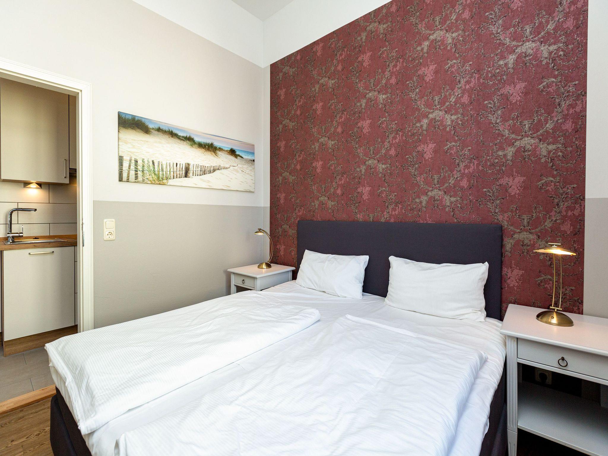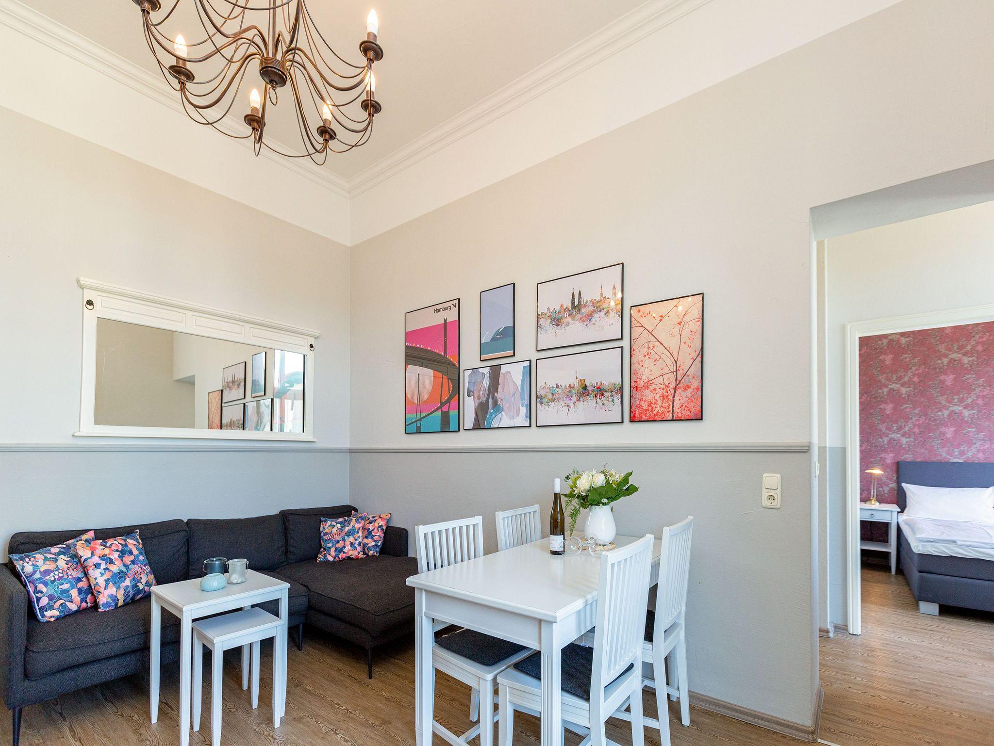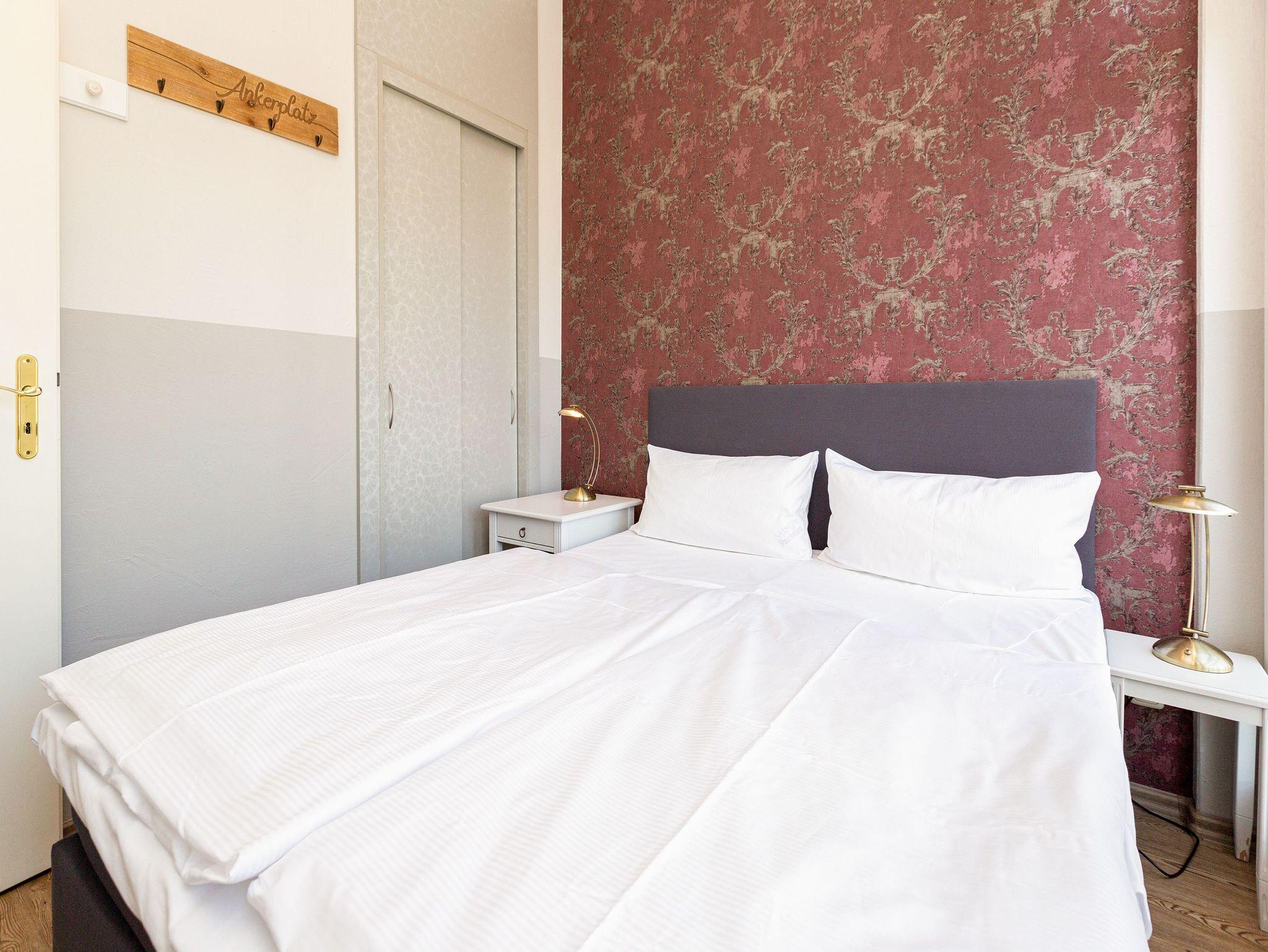 Hohe, luftige Räume, Stuck an der Decke, Zierleisten an den Wänden, ausgewählte und erlesene Möbel ? was so eine richtige Bädervilla ist, kann damit seine Besucher in eine elegante und mondäne Welt entführen. So auch das Appartement Nummer 6 in der wunderschön sanierten alten Villa Amelia im 1. Obergeschoss. Kaiserzeitliches Flair durchzieht die drei Räume, in denen bis zu 3 Erwachsene [&] 1 Kind bis 15 Jahre eine wahrhaft exklusive Auszeit nehmen können. Edles Weiß und Möbel im Vintage-Stil bestimmen die Einrichtung. Viel Platz haben Sie auf der gemütlichen Sitzgruppe. Ein Flat-TV gehört zum Home-Entertainment dazu. Außerdem lädt ein schöner Essplatz zum Dinieren und Zusammensitzen ein. Treten Sie hinaus auf den Balkon und atmen Sie die frische Salzluft der nur ein paar Meter entfernten Ostsee tief ein. Sie ist nicht nur gesundheitsfördernd, sondern pustet so manches Mal den Kopf gehörig durch, befreit die Gedanken vom Stress des Alltags. Erholsame Träume kommen in den beiden gemütlichen Schlafzimmern ? ausgestattet mit komfortablen Boxspringdoppelbetten und großen Schränken ? nach einem Tag am Strand von ganz allein. Kommt der Appetit, können Sie sich in der offenen Küche nach Herzenslust bekochen. Sie ist voll ausgestattet. Geschirr finden Sie in den Schränken. Auch das Badezimmer lässt Sie in Ihrem exklusiven Anspruch nicht im Stich. Feiner Marmor, eine Dusche, Waschtisch und WC gehören zur Ausstattung. Entspannen Sie ohne Sorgen. Denn Handtücher liegen bei der Anreise bereit und die Betten sind bezogen. Das WLAN Netz im Haus kann kostenfrei genutzt werden.