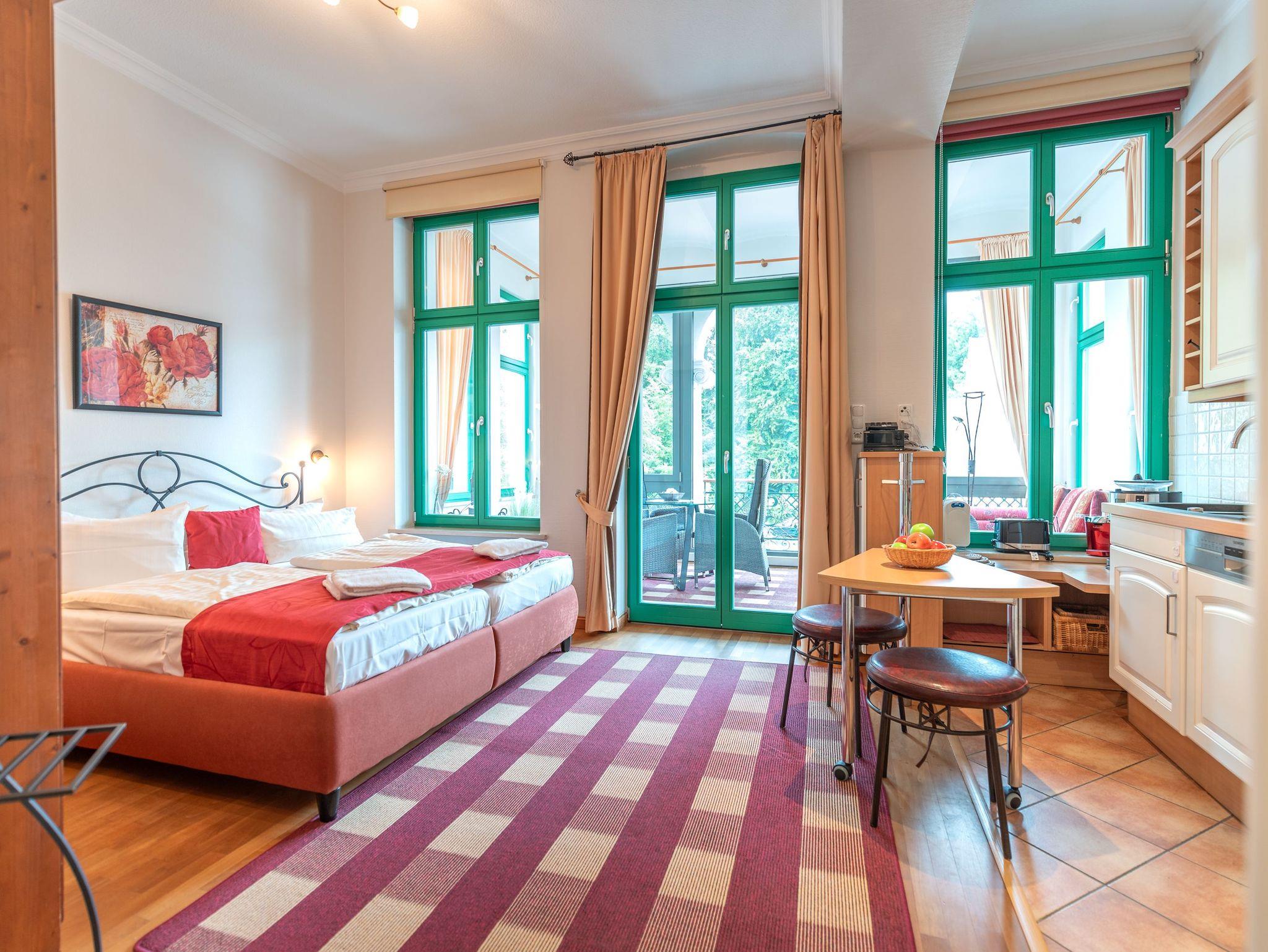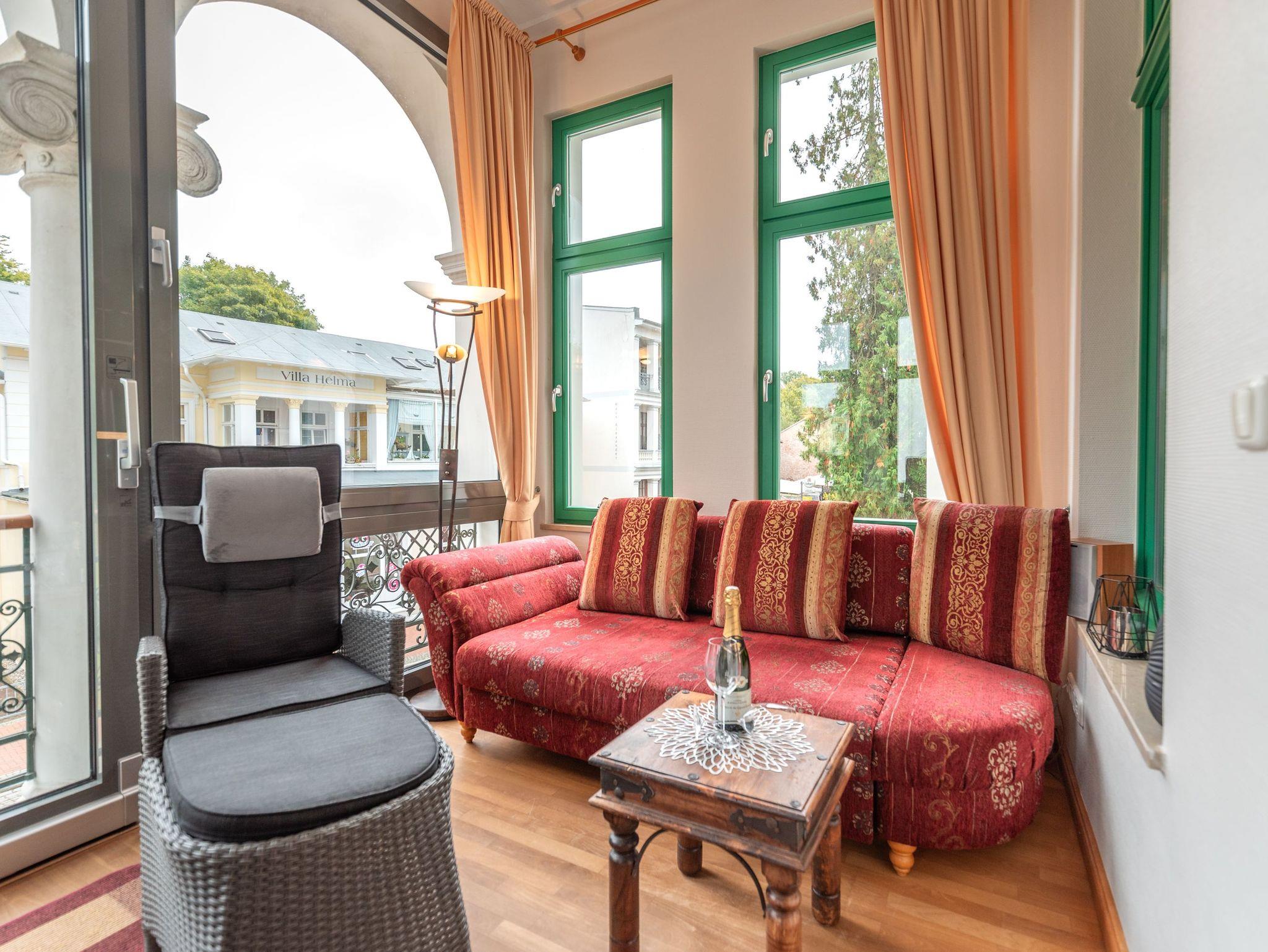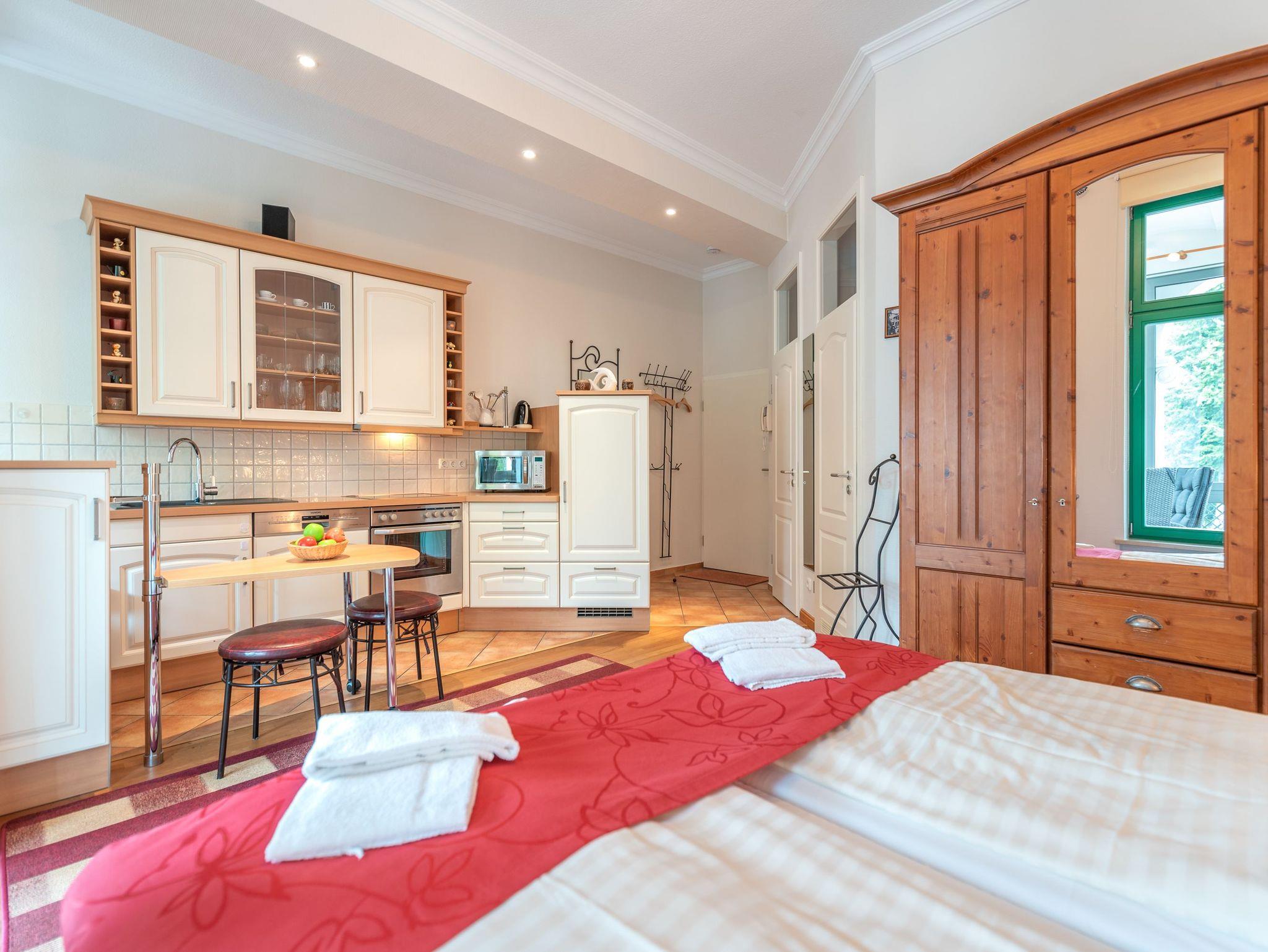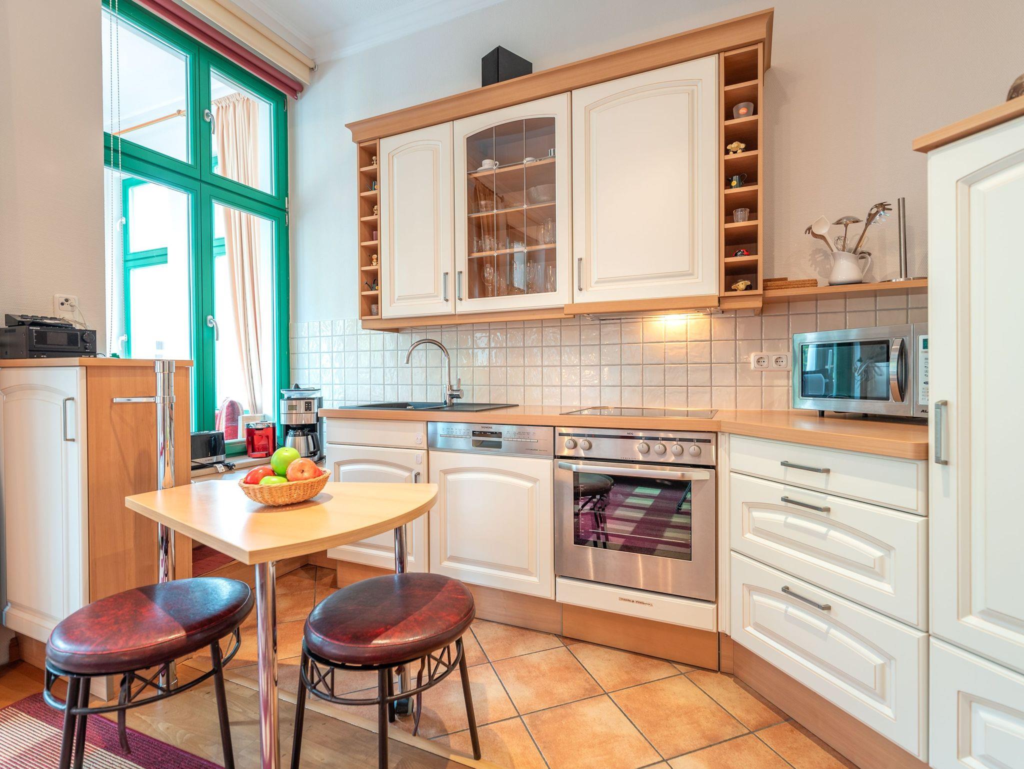 Das Herzstück der Wohnung ist die großzügige Veranda mit gemütlicher Sitzecke. Von hier genießen Sie den Blick auf die umliegende Bäderarchitektur und das bunte Treiben der Friedensstraße. Die Sitzecke kann bei Bedarf in eine Schlafgelegenheit für einen Erwachsenen oder zwei Kinder umgewandelt werden. Ein Esstisch und ein moderner Flachbild-TV runden den Wohnbereich ab. Die angrenzende voll ausgestattete Einbauküche, optisch durch einen Tresen getrennt, sorgt für kurze Wege und ermöglicht sogar, den ersten Kaffee des Tages direkt ans Bett zu bringen.