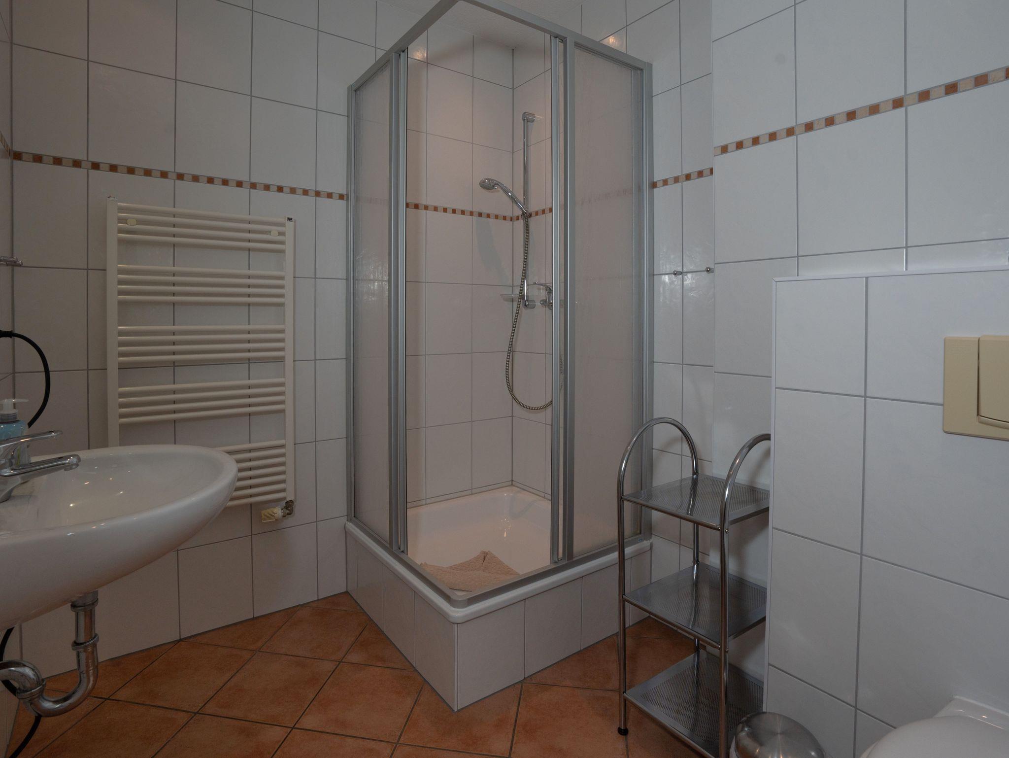 Ceranfeld und Mikrowelle. Bad mit Dusche und WC.