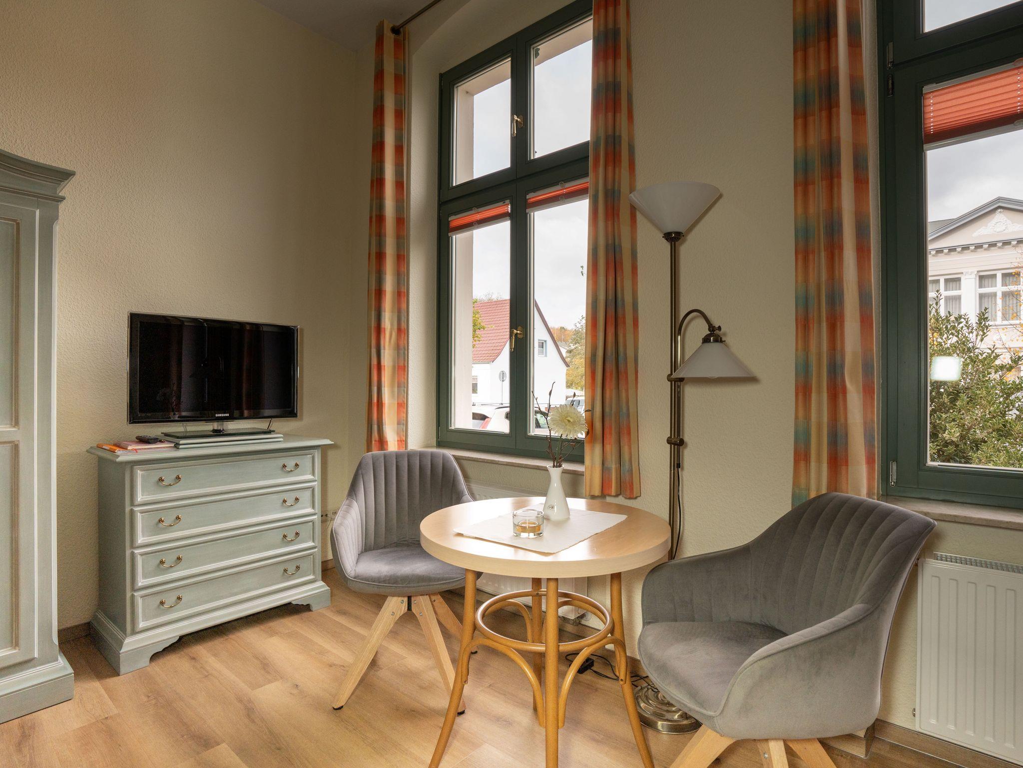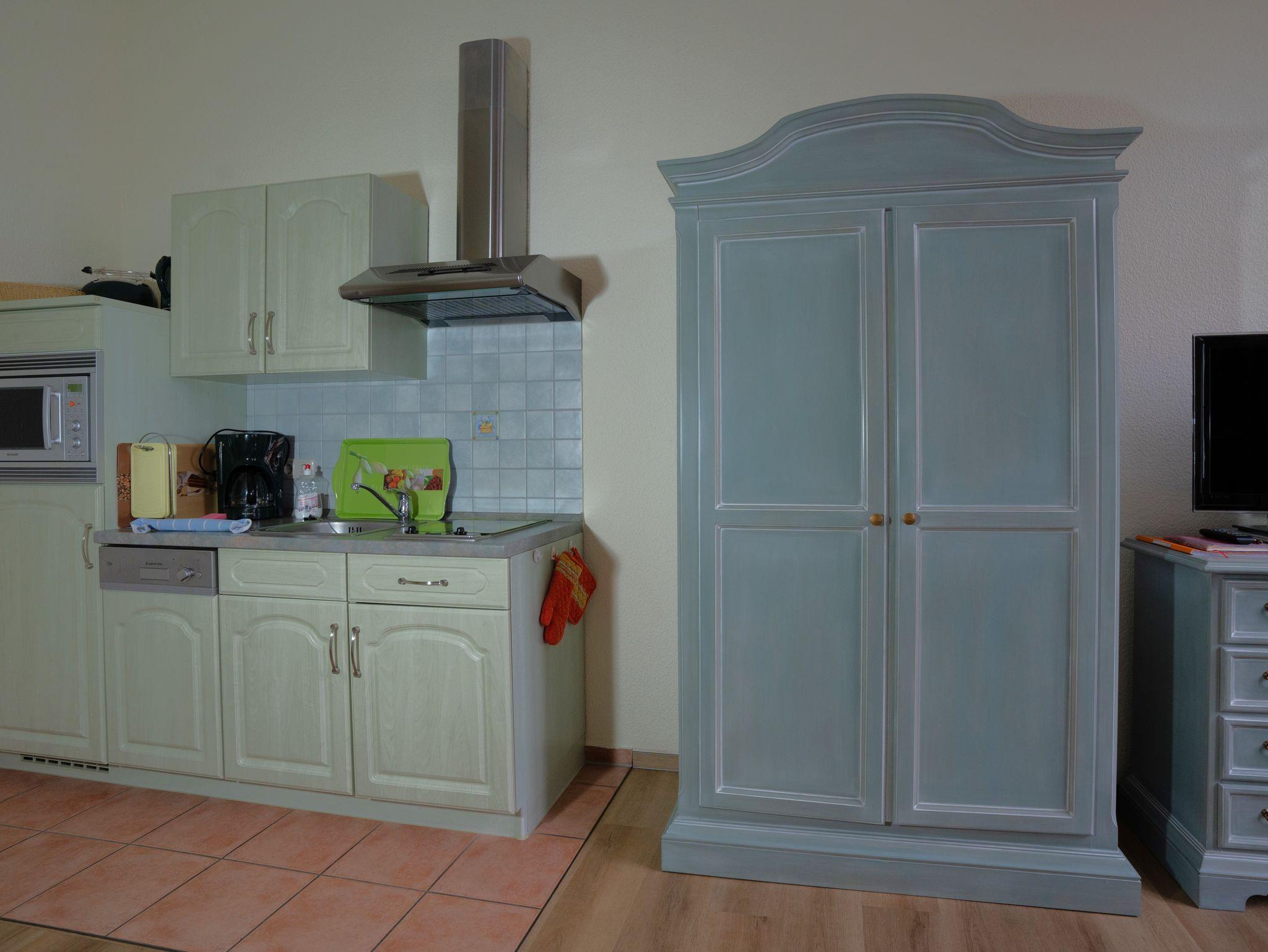 Das 28 qm große Einraumappartement im Hochparterre verfügt über ein Doppelbett, Sitzgelegenheit, TV und Radio sowie eine Küchenzeile mit Geschirrspüler,