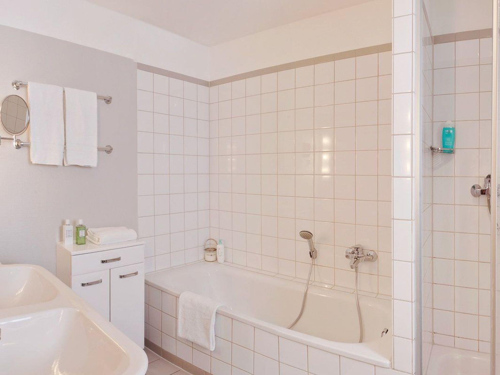 Damit Sie Ihre wohlverdiente Urlaubszeit bereits am Anreisetag in vollen Zügen genießen können, haben wir das Bett für Sie und das für Ihre lieben Mitreisenden bereits bezogen und ein Duschtuch sowie ein kleines Handtuch bereitgelegt. Das Badzimmer ist mit Badewanne, Dusche, WC und einem Haartrockner ausgestattet.