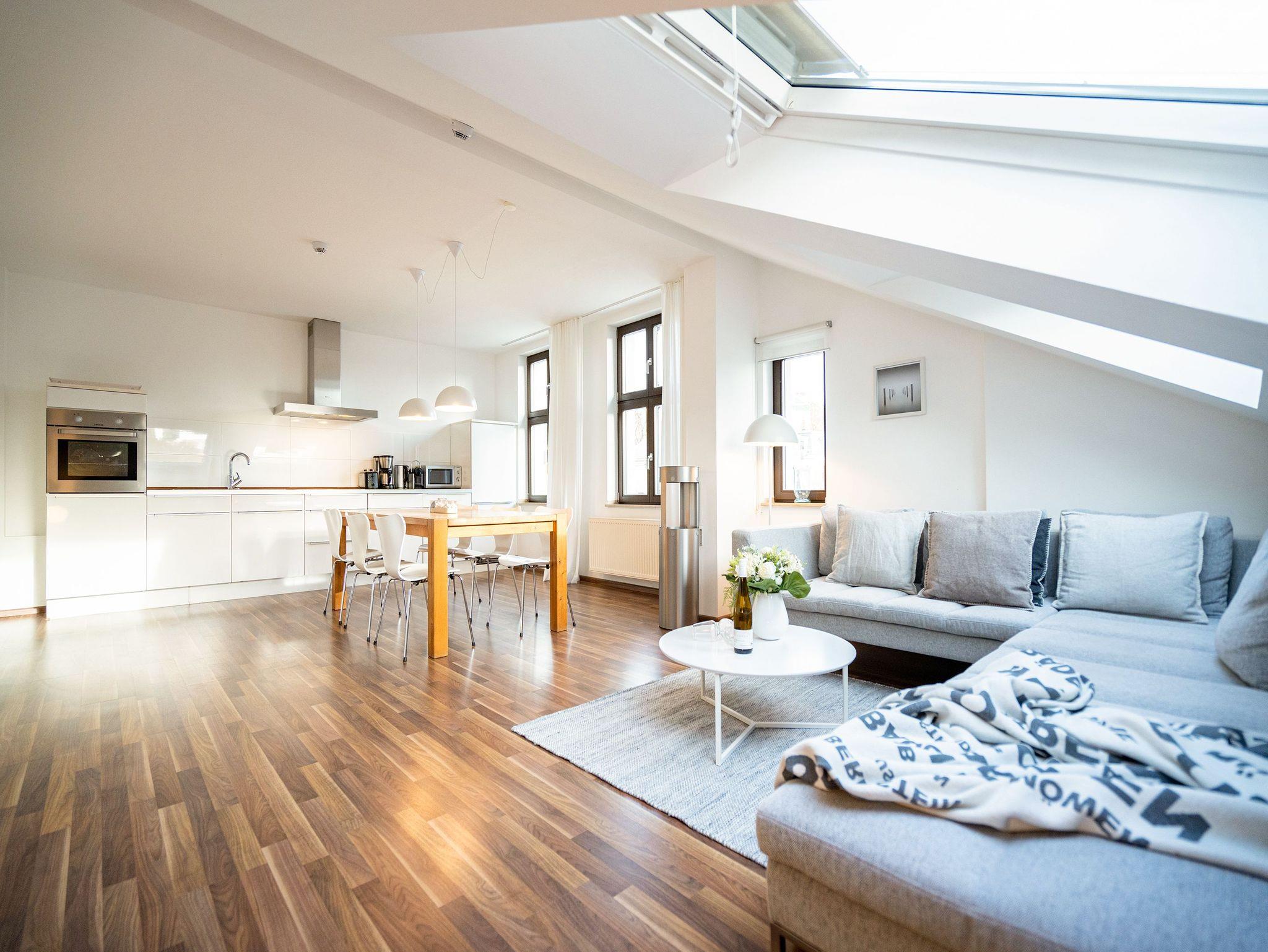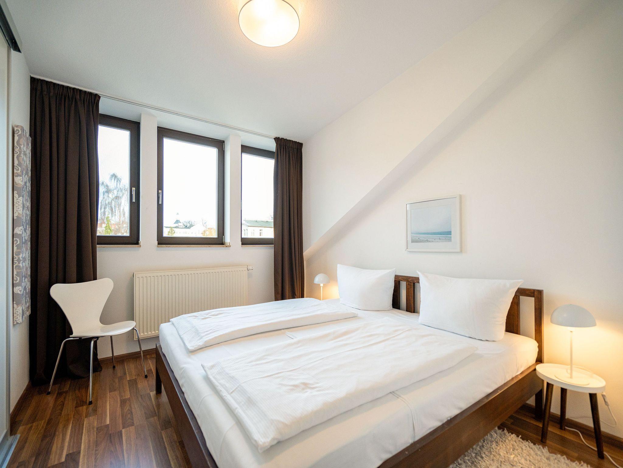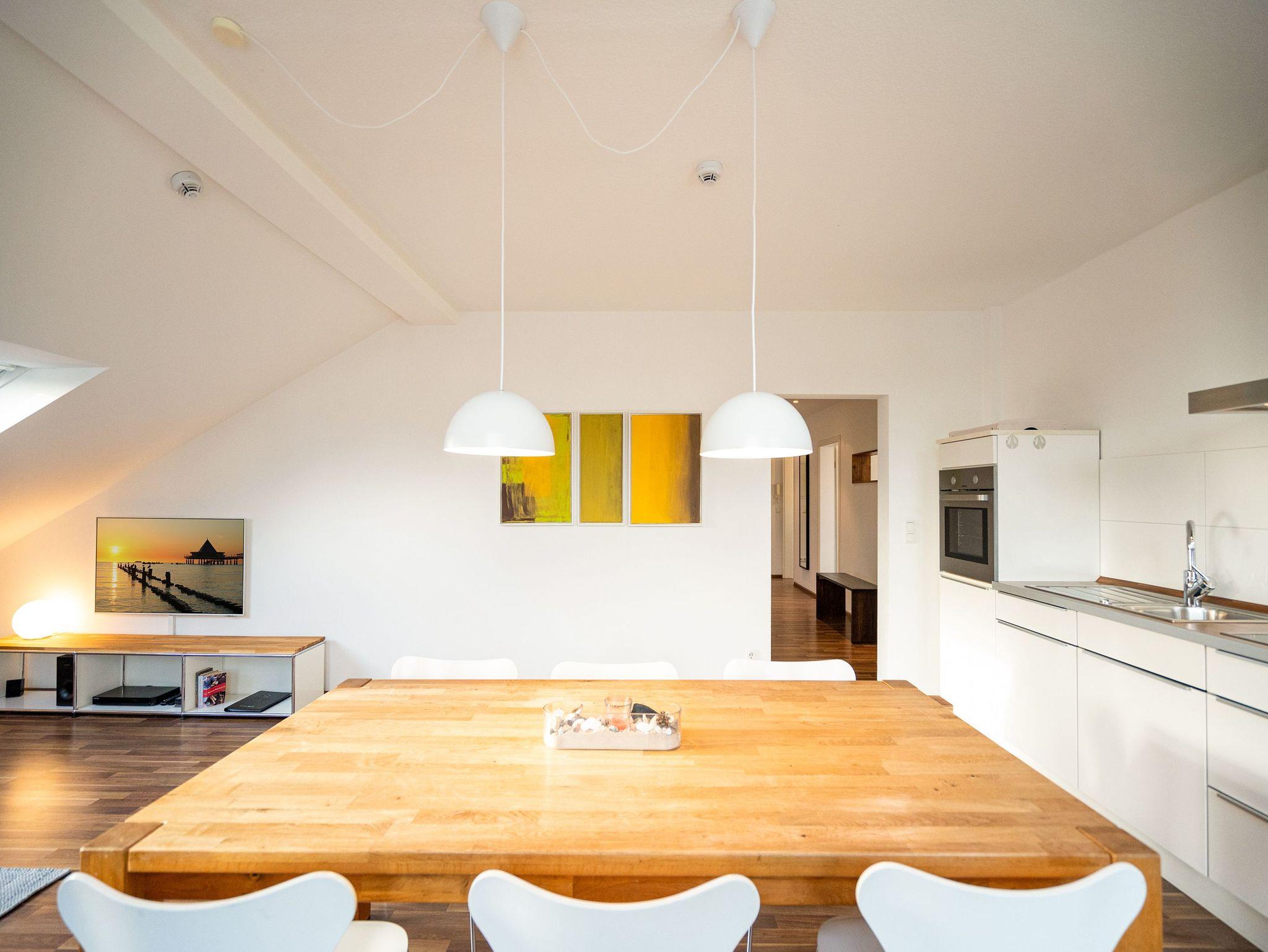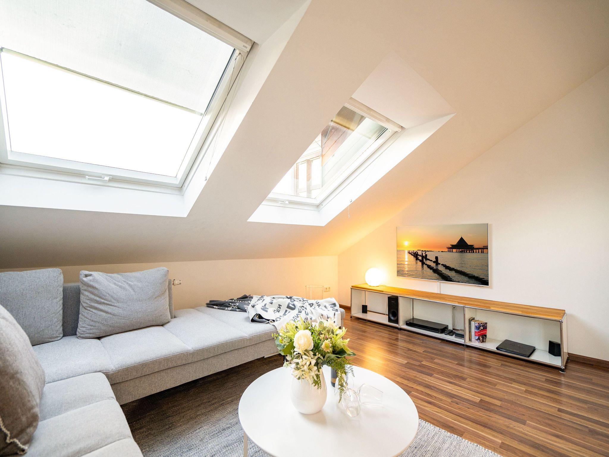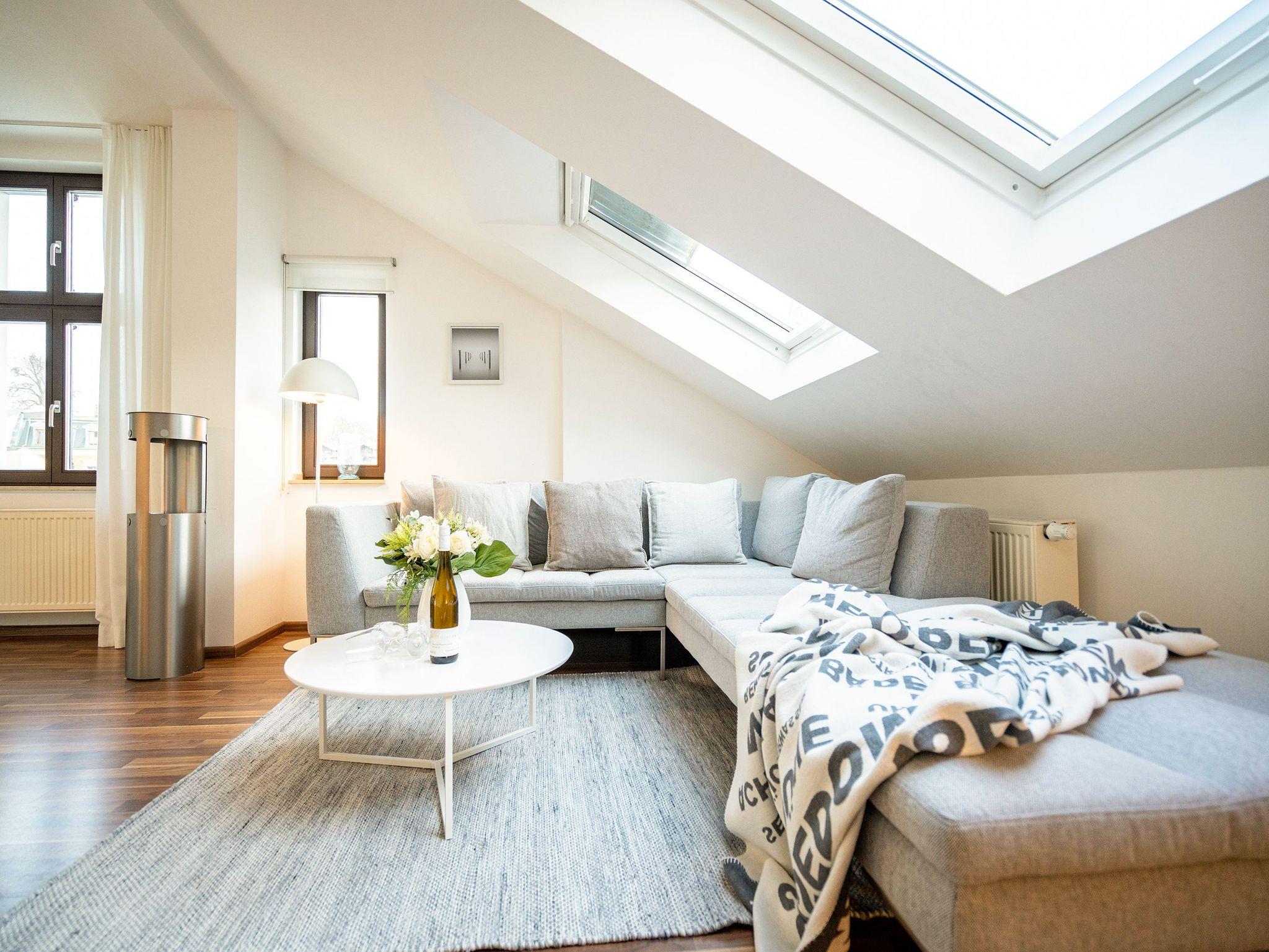 Stylisch wohnen unter dem Dach der Villa Sanssouci. Auf 82 qm Wohnfläche empfängt Sie hier eine moderne, geschmackvoll designte Ferienwohnung mit 2 Schlafzimmern (1x Doppelbett / 1x getrennte Betten), schönem, großzügigem Wohnbereich mit Flat-TV, eine offene, komplett ausgestattete Küche mit angrenzendem Essplatz und einem Bad mit Duschbadewanne und WC. Ideal für 4 Personen und ein Kleinkind (bis 3 Jahre). Am Haus kann ein kleiner Gartenanteil mit Terrasse und Strandkorb genutzt werden. Für den Tag am Meer steht Ihnen als besonderes Bonbon von Mitte Mai bis Ende September (je nach Witterung) ein Strandkorb am Strand kostenlos zur Verfügung.