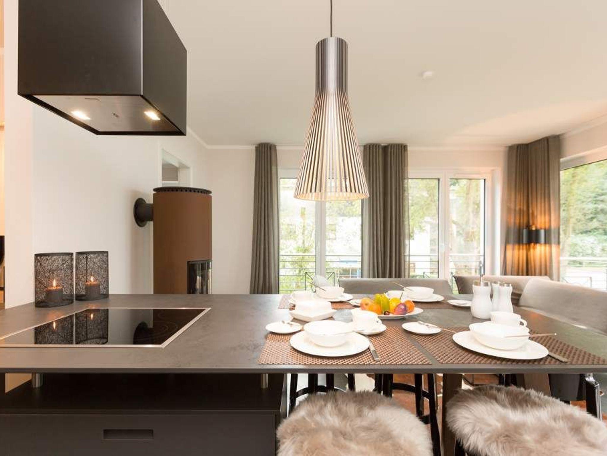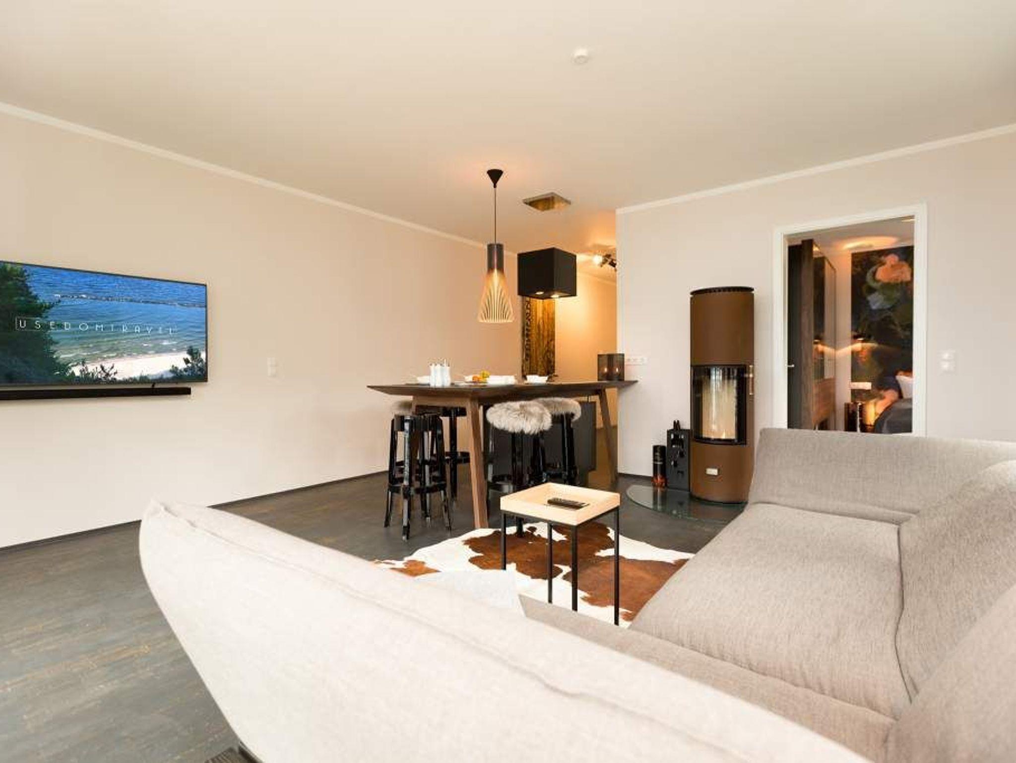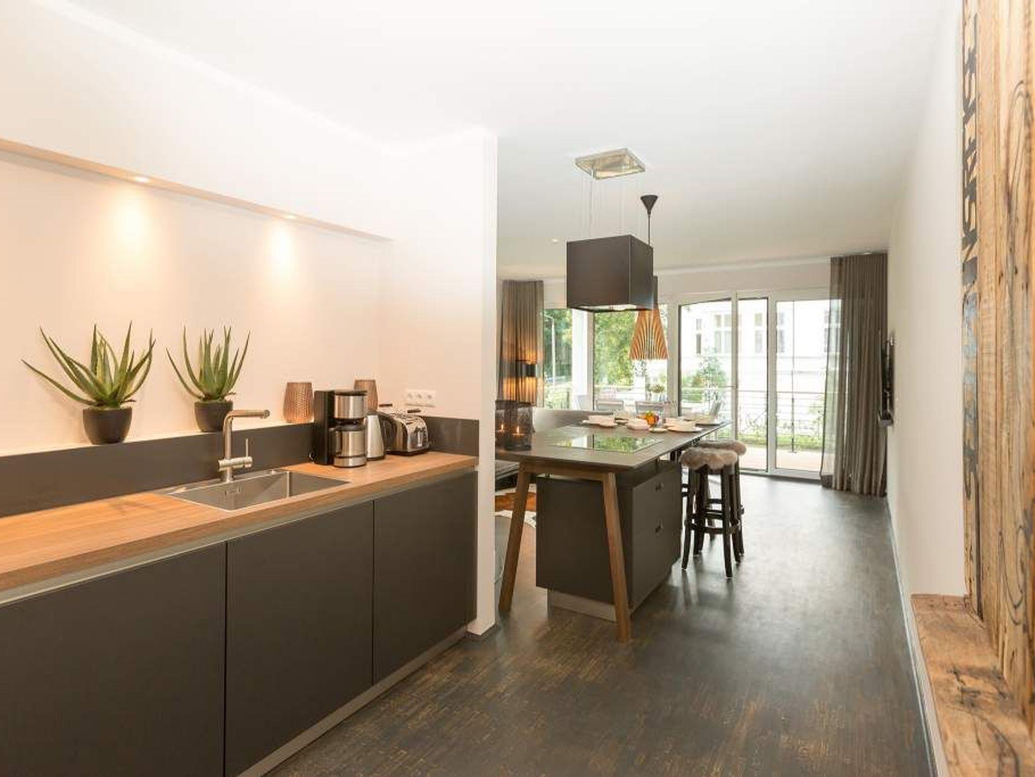 Eine Wohnung mit Stil, extravagant und exklusiv, ist die Ferienwohnung 06 im ersten Obergeschoss der Villa Strandgrün. Nur einen Steinwurf von der Ostsee entfernt laden ihre drei hellen und komfortabel ausgestattete Zimmer zum Wohlfühlen und entspannten Urlauben ein. In den 87 Quadratmetern finden vier Personen und ein Kleinkind (bis zwei Jahre im Kinderreisebett) bequem Platz. Ein Highlight des Wohnzimmers ist der offene Essbereich mit Tresen, Barhockern und einer stylischen Kochinsel. Die Küche ist übrigens voll ausgestattet. Ein zweites Highlight ist der Kamin, der abends oder an Schietwetter-Tagen für eine behagliche Atmosphäre sorgt. Ebenso wie die kuscheligen Schaf- und Kuhfelle auf den Hockern oder dem beheizbaren Fußboden. Auf der Design-Wohnlandschaft lässt es sich herrlich relaxen. Alltagsstress? Schon nach kurzer Zeit in diesem Appartement wird Ihnen dieses Wort, wie ein Fremdwort vorkommen. Genießen Sie die Sonne, die fast den ganzen Tag auf den großen, überdachten Südbalkon mit Blick in den Garten scheint. Ein zweiter, kleinerer Balkon ist über eines der beiden Schlafzimmer zugänglich. In beiden lichtdurchfluteten Schlafzimmern warten hochwertige Doppelboxspringbetten (1,80 m x 2,00 m) nur darauf, Ihnen wunderschöne Träume zu verschaffen. Ausgestattet sind beide Schlafzimmer und auch das Wohnzimmer mit Flat-TVs. Der Fernseher im Wohnzimmer enthält einen Blue-Ray-Player. Sie lieben Sauna? In der Wohnung Nummer 6 können Sie, so oft Sie wollen, in ihre ganz eigene kuschelige Wohlfühlzone abtauchen. Denn in eines der beiden Bäder ist eine finnische Sauna eingebaut. Ansonsten sind beide Bäder geräumig, verfügen über Waschtisch, Dusche und WC. Auch eine Waschmaschine und ein Safe gehören zur Ausstattung der Wohnung. Das WLAN ist kostenfrei. In der Tiefgarage ist für Sie ein Pkw-Stellplatz reserviert. In einem separaten Abstellraum in der Garage können Fahrräder verwahrt werden. Im Urlaub sollte nichts das Entspannen stören. Darum sind die Betten bereits bezogen und Handtücher liegen für Sie bereit.
