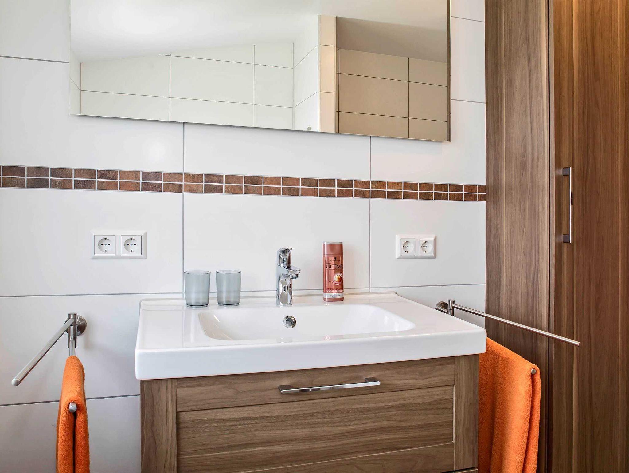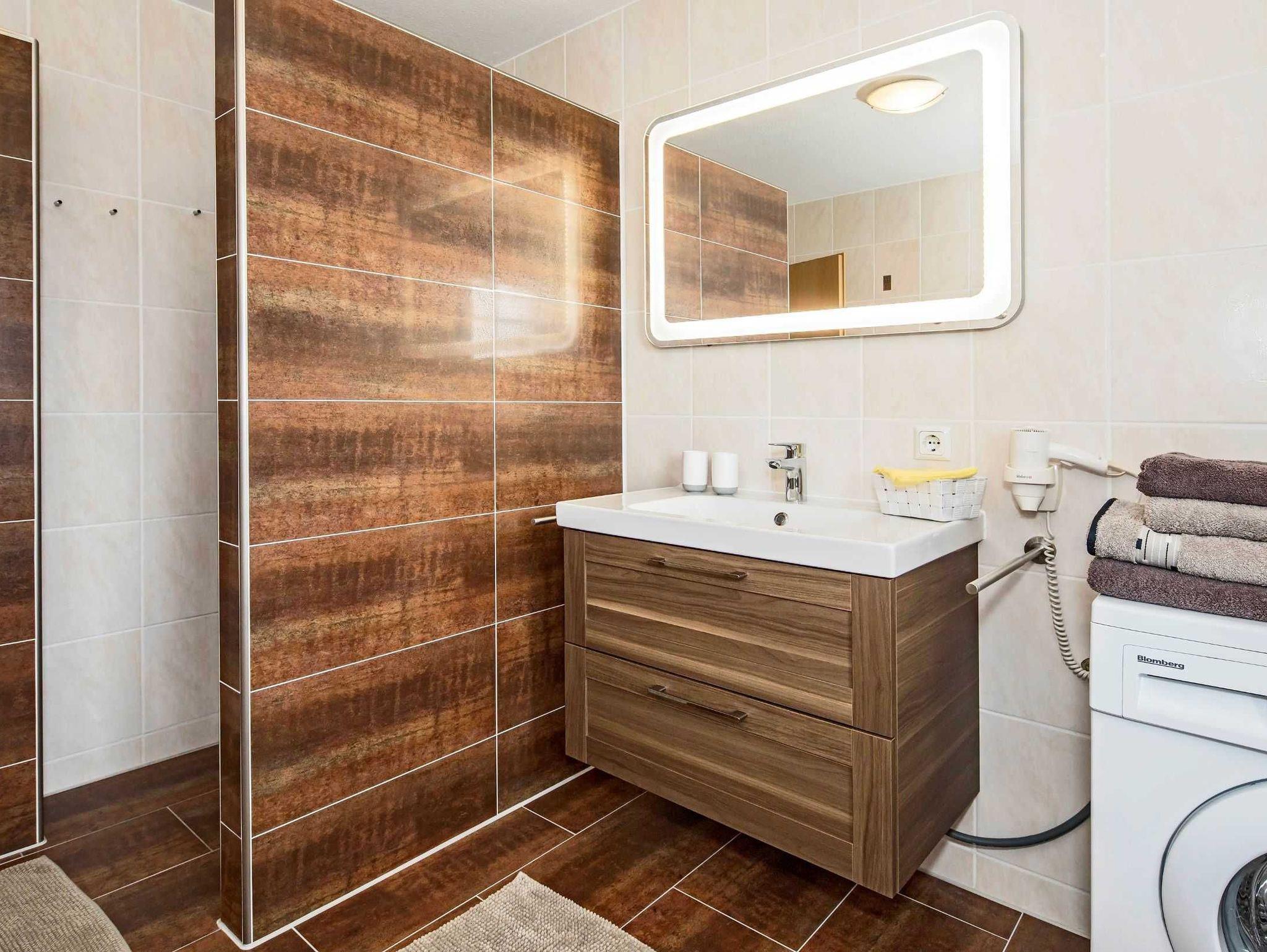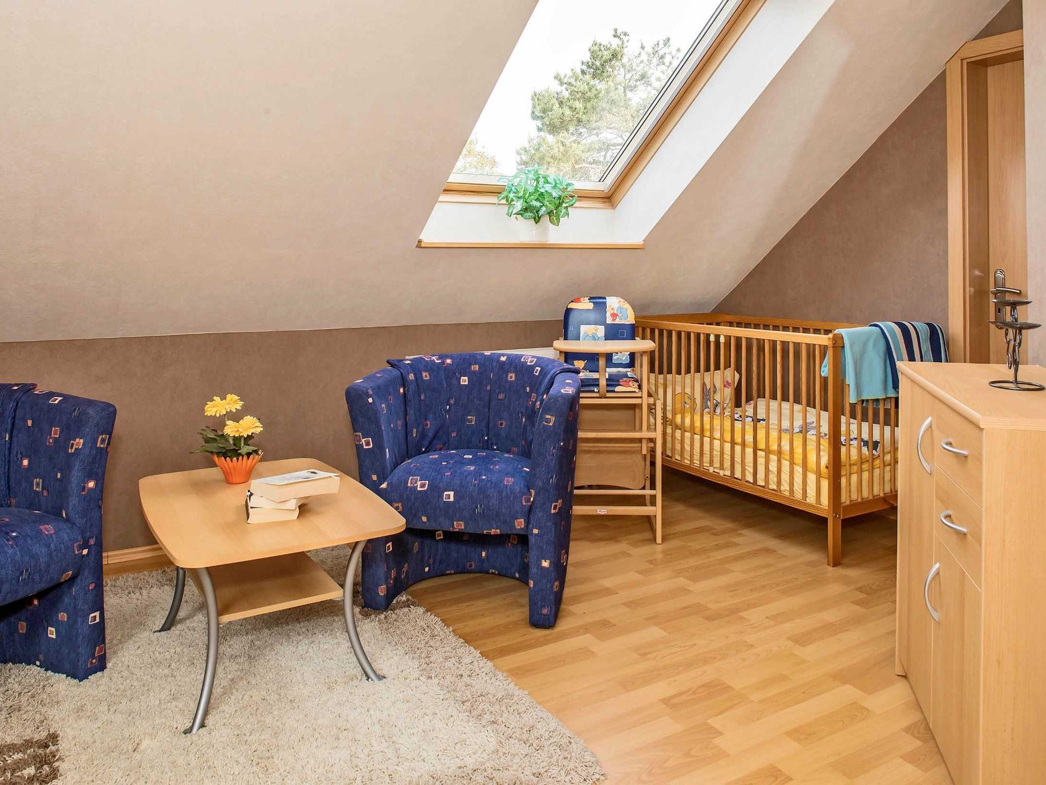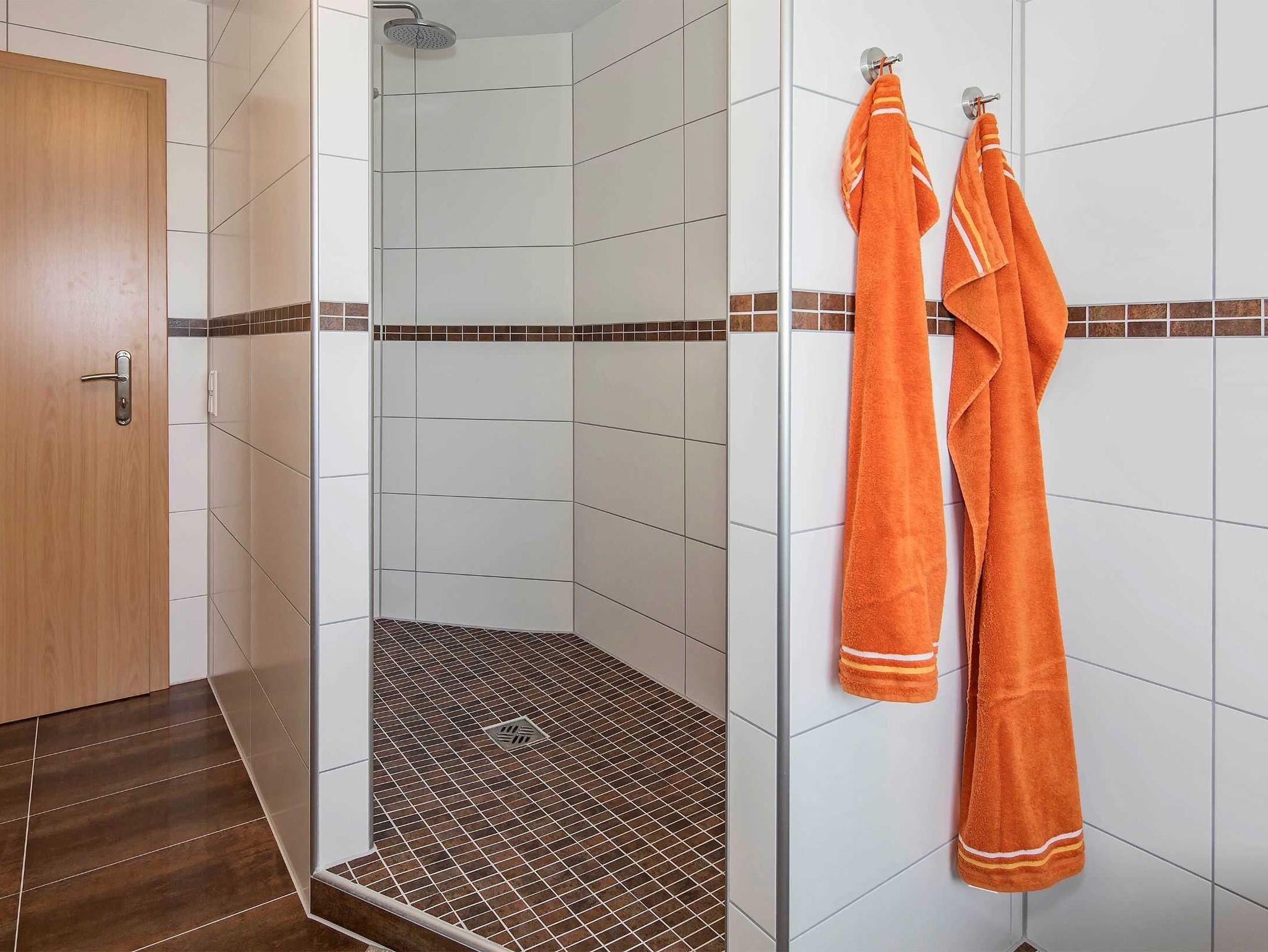 Im Obergeschoss befindet sich ein neu errichtetes modernes Bad mit bodentiefer Dusche, WC und Haartrockner. Zu den kostenlosen Extras gehören z. B. zwei Babyhochstühle, ein Kinderbett, ein Kinderreisebett (jeweils mit Bettwäsche) und ein Bollerwagen. Somit verfügt das Haus über insgesamt 3 Schlafzimmer und 2 Bäder.