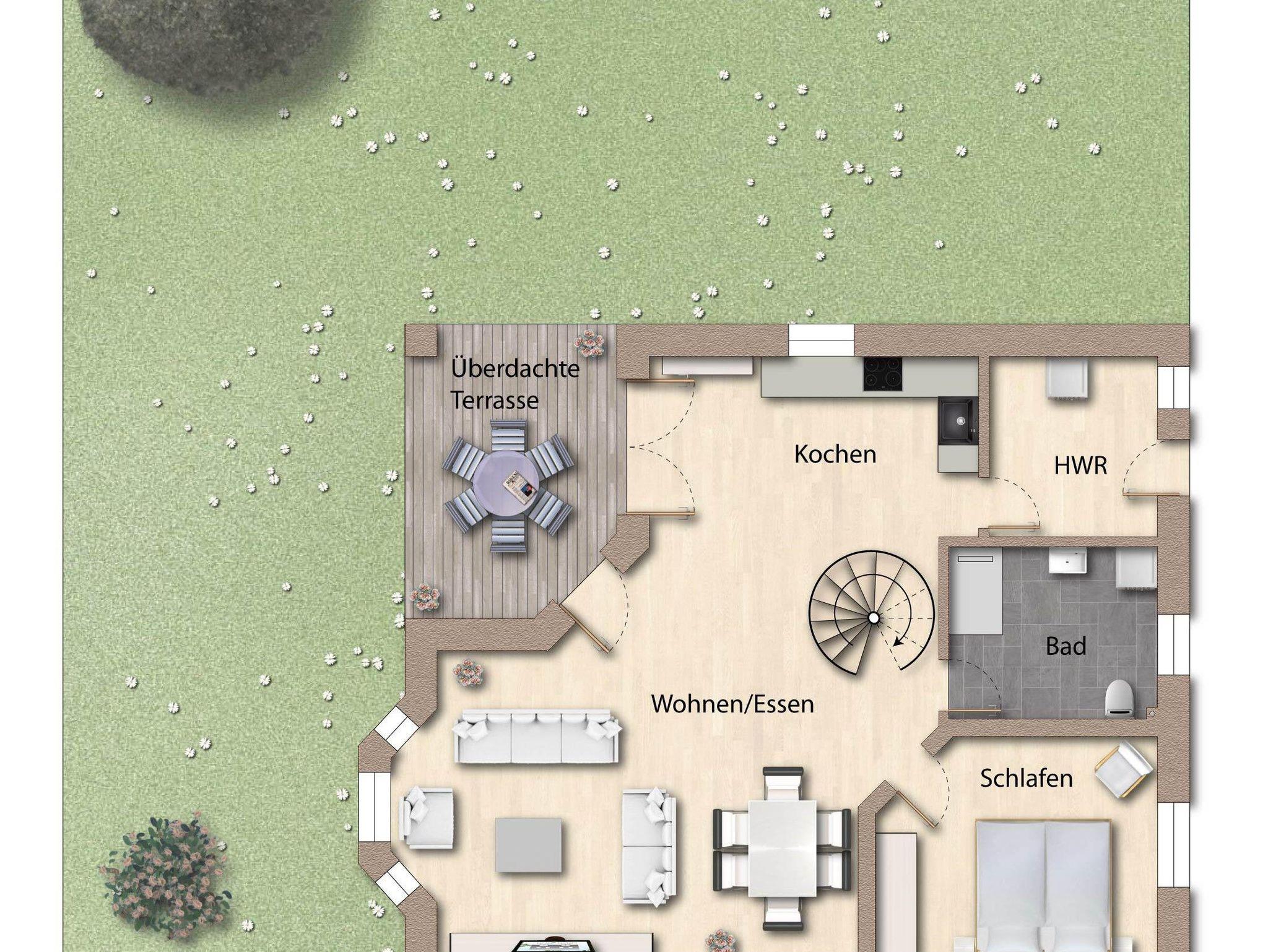 Im Erdgeschoß befinden sich ein großzügiger Wohn-/ Essbereich mit offener Küche (4-Platten-Ceranherd mit Backofen, Geschirrspüler, Mikrowelle, Kühlschrank mit Tiefkühlfach, Kaffeemaschine, Wasserkocher, Toaster etc.), Couch, Sessel, Couchtisch, Esstisch mit 6 Stühlen, Sat-TV, Radio mit CD-Player, ein Schlafzimmer mit Doppelbett und Kleiderschrank mit Spiegel sowie das Bad mit bodentiefer Dusche, WC, Haarföhn, Fußbodenheizung, Handtuchtrockner und Münzwaschmaschine .