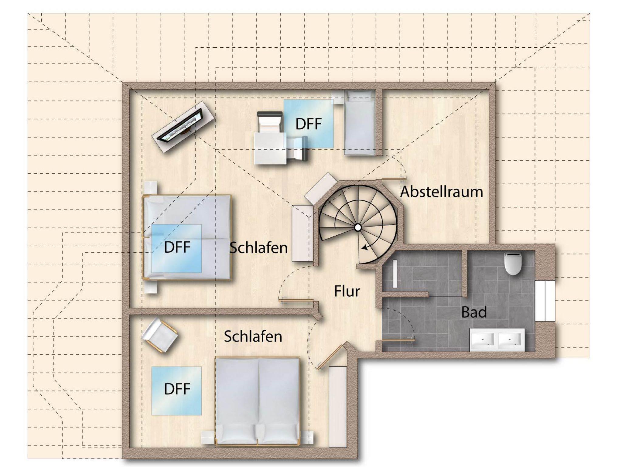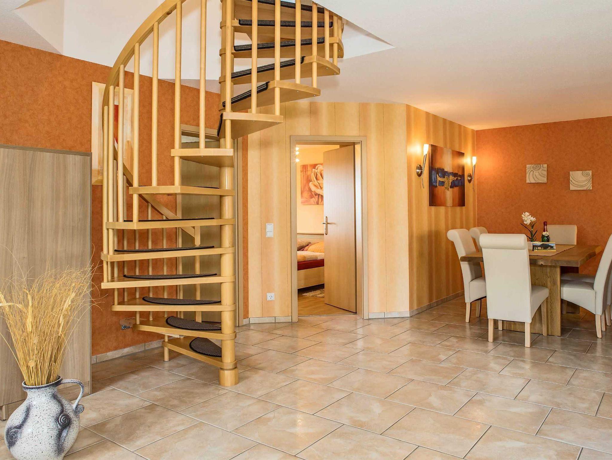 Über eine Wendeltreppe erreichen Sie im Obergeschoß/ Dachgeschoß einen kombinierten Wohn- und Schlafraum mit Doppelbett, einen Kleiderschrank und Spiegel, sowie eine Sitzgruppe und ebenfalls Sat-TV, Radio mit CD-Player.