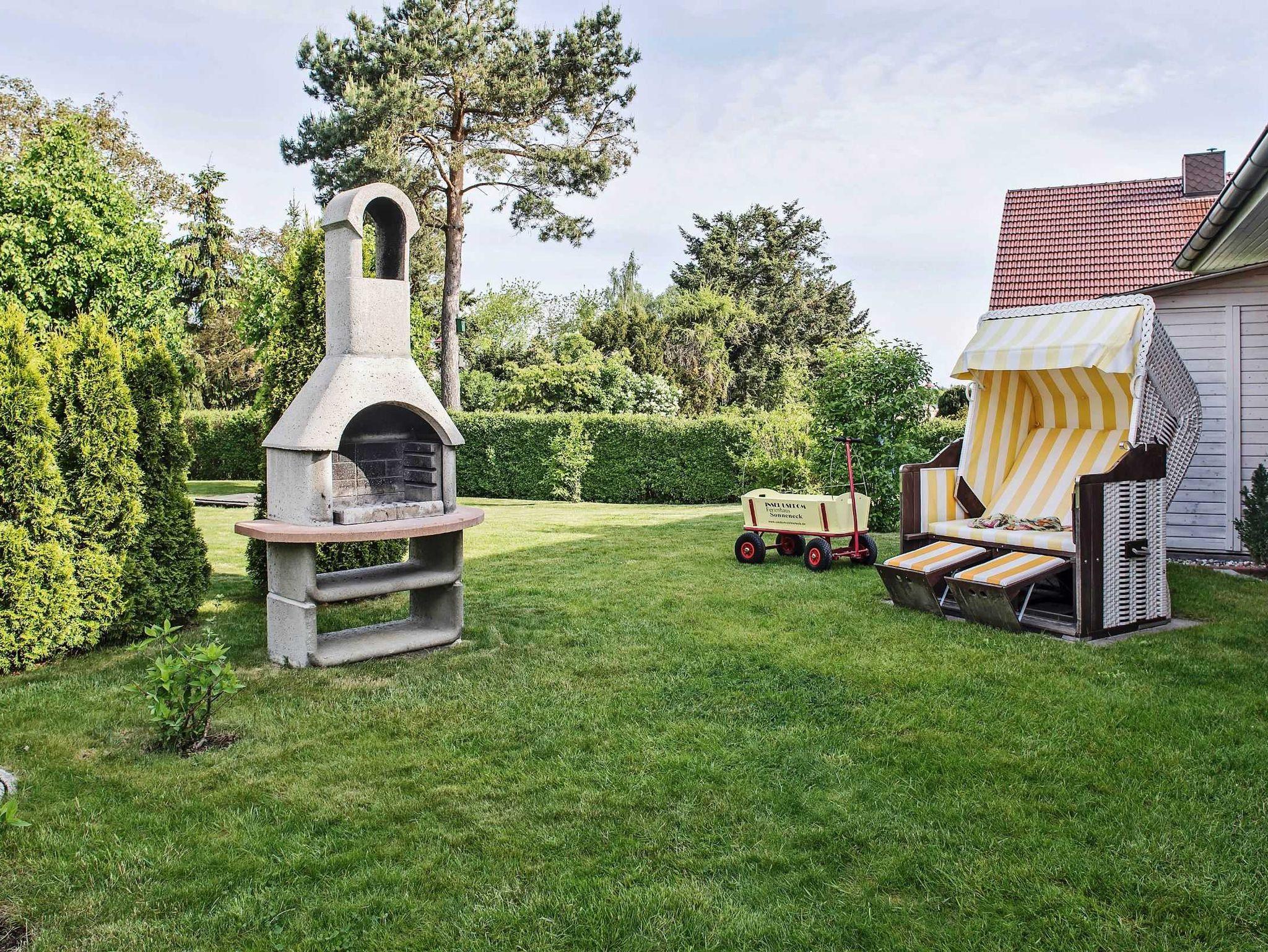 Moderne 4-Raum-Maisonette-Ferienwohnung über zwei Etagen mit überdachter, möblierter Terrasse und Strandkorb, sowie Grillkamin und Sandkasten im großen Garten.