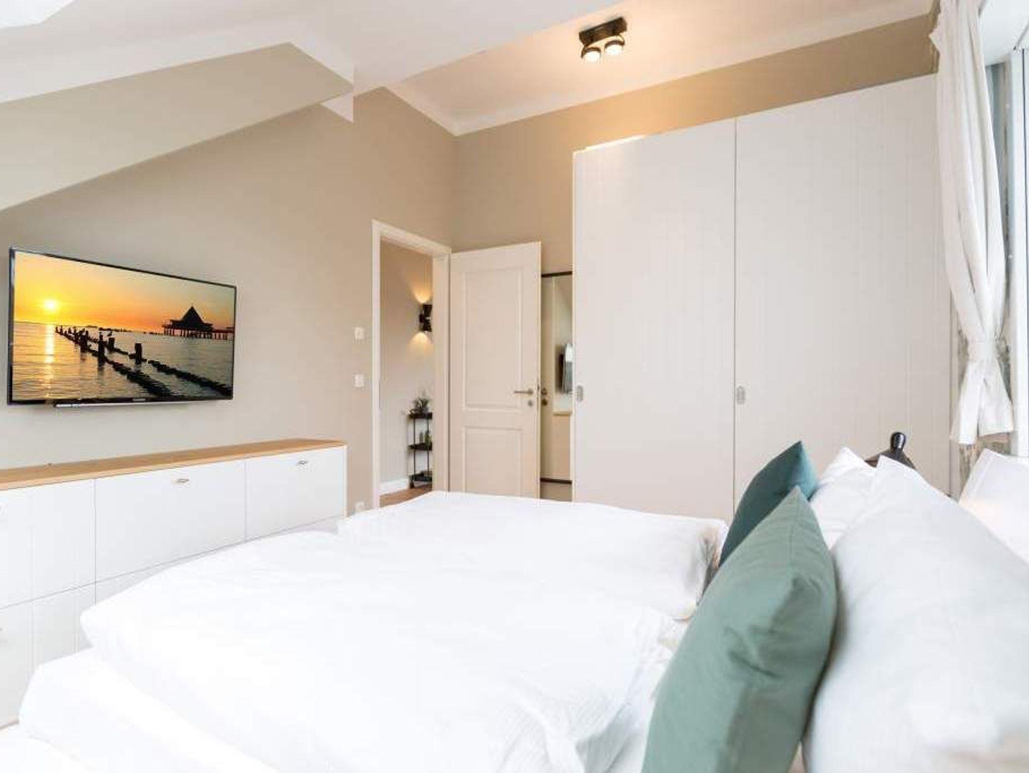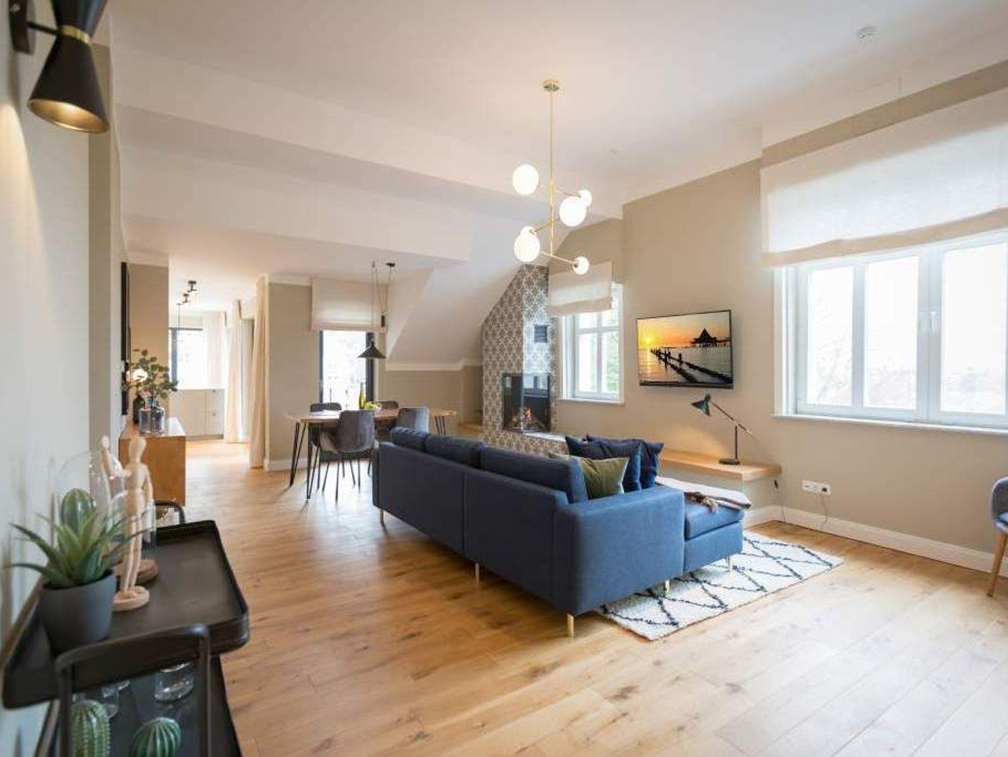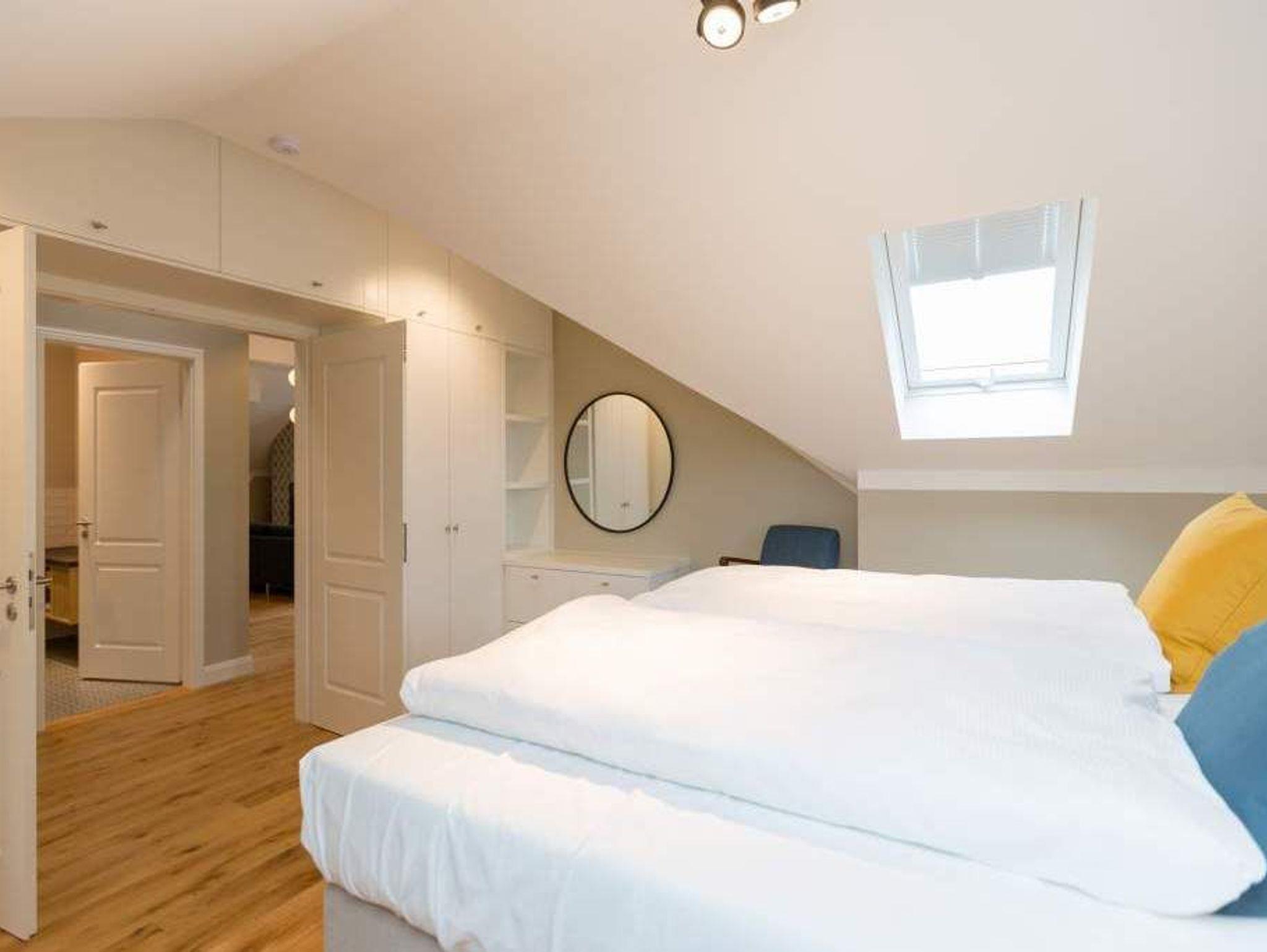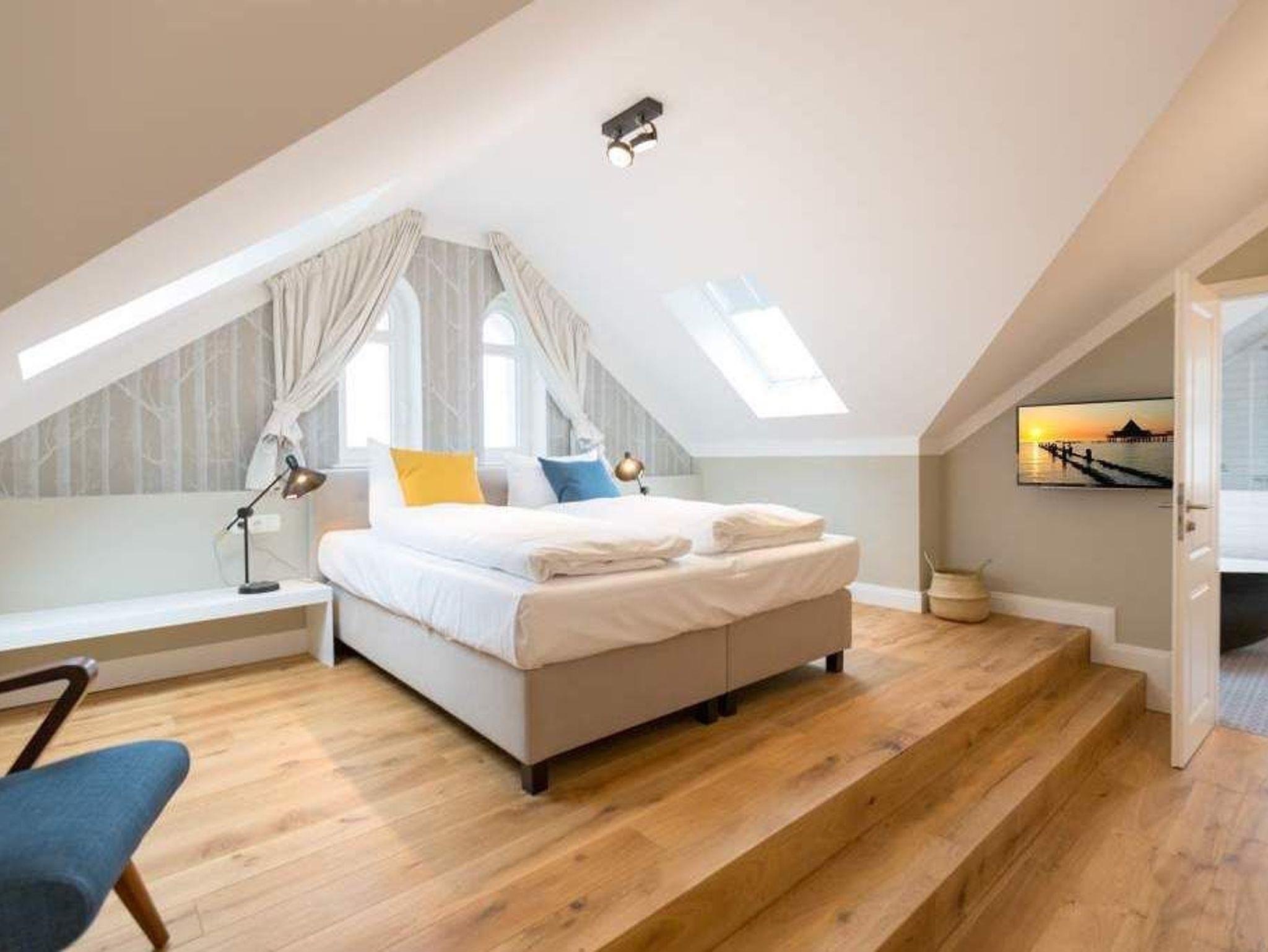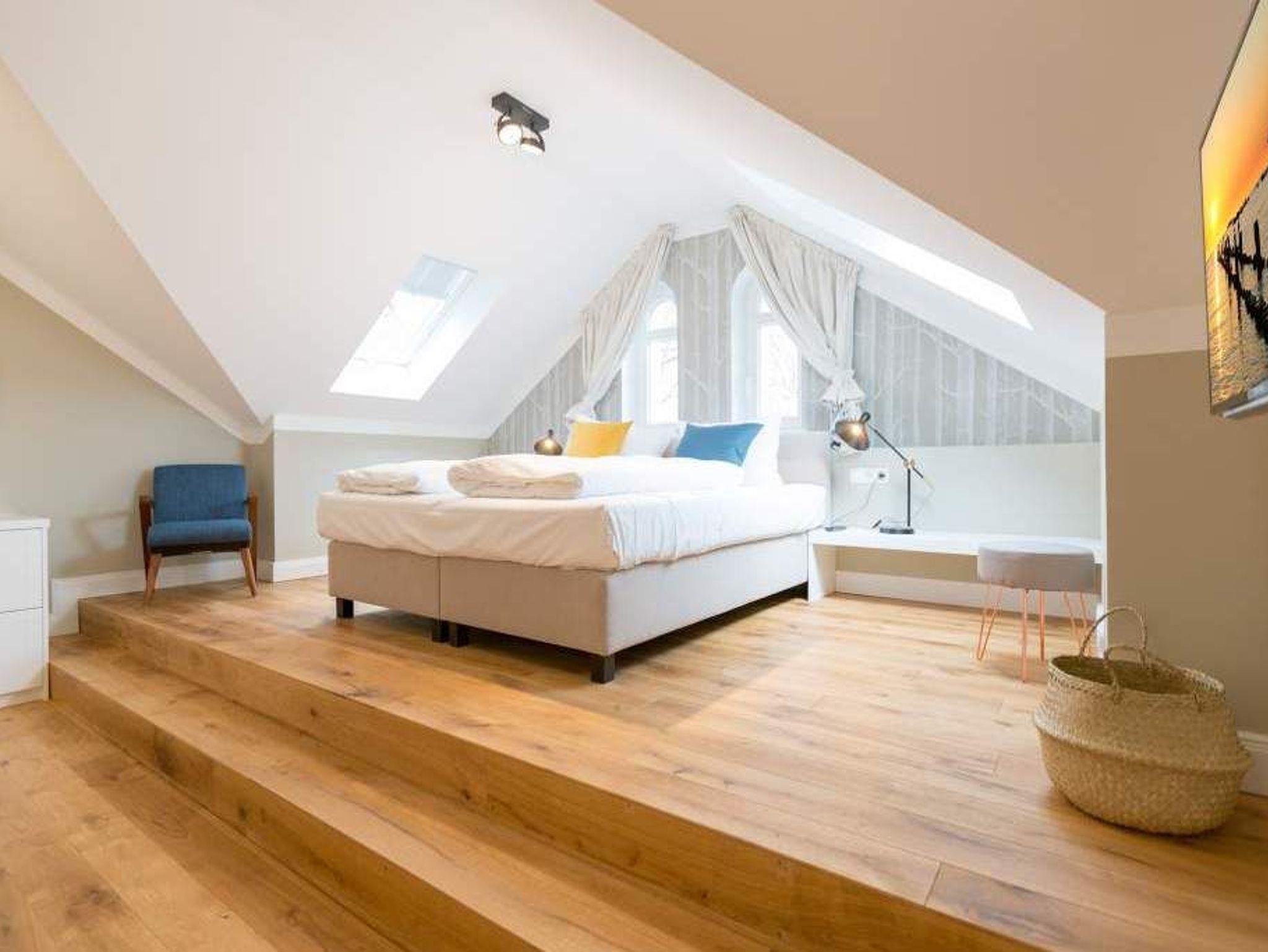 Sie wünschen sich mit Ihrer Familie oder Ihren Freunden eine wirklich exklusive Auszeit mitten im Herzen des Kaiserbades Heringsdorf? Ein Urlaubsdomizil der Extra-Klasse ist die Wohnung 7 im Dachgeschoss der aufwendig sanierten Bädervilla Bellevue. Hier werden Ferienträume wahr! Denn dieser stilvoll eingerichtete Wohntraum bietet auf seinen großzügigen 153 Quadratmetern Raum für vier Erwachsene und zwei Kinder bis drei Jahre (im Kinderreisebett). Jetzt müssen Sie sich nur noch einig werden, wer wo schläft. Denn das Drei-Raum-Appartement wartet mit zwei wunderschönen Schlafzimmern auf. Durch zwei große Flügeltüren gelangt man in das erste Schlafreich. Ein wenig erhöht, auf einem Podest wartet ein komfortables Boxspringdoppelbett (1,80 m x 2,00 m) darauf, Ihnen erholsames Schlafvergnügen zu bereiten. Wie ein Himmel öffnet sich über dem Bett der Giebel bis ins Dach hinein. Von diesem Zimmer aus haben Sie Zugang zum luxuriösen Masterbad. Die wunderschöne Vintagefliesen-Optik, eine frei stehende Badewanne in extravagantem Ei-Design, eine äußerst geräumige Dusche und die Panorama-Sauna definieren den Begriff Wellness neu. Auch das zweite Schlafzimmer ist elegant und exquisit eingerichtet. In dem schicken und bequemen Designer-Doppelbett (1,60 m x 2,00 m) macht nicht nur das Schlafen Spaß. Eine edle Tapete und die hellen Möbel verleihen dem Zimmer ein elegantes Flair. Ein zweites Bad ? ebenfalls mit Dusche, Waschtisch und WC ausgestattet ? sorgt für ein entspanntes Frischmachen. Der Wohnbereich ist eine Oase für Entspannungshungrige und Auszeitfreunde. Offen, hell und geschmackvoll designt ? hier stimmt alles. Angefangen von der großen Sofalandschaft, über die Mid-Century-Design-Klassiker, den schönen, großen Echtholztisch und den von Vintagefliesen eingerahmten Gas-Kamin bis hin zur stylischen und modernen Küche. Hochwertige Geräte und feinstes ASA-Geschirr machen das Kochen und gemeinsame Essen zu einem Erlebnis. In lockerer Atmosphäre können Sie sich am frei stehenden Küchentresen mit Barhockern unterhalten. Entertainment bietet zudem der 42-Zoll-Flat-TV. An das Wohnzimmer angeschlossen ist ein sonnenüberfluteter West-Balkon. Doch wenn Sie richtig Sonne tanken wollen, dann steigen Sie bitte aufs Dach. Über dem Appartement erstreckt sich eine 56 Quadratmeter große Dachterrasse. Hier oben, mit einem grandiosen Blick über die Dächer der schönen Bädervillen des Kulmbergs, vergessen Sie in Windeseile jede Hektik, jeden Stress. Sonnenbaden oder Dinieren ? beides ist hier möglich. Zur Wohnung gehören außerdem 2 Pkw-Stellplätze dazu. Das WLAN ist kostenfrei nutzbar. Und damit Sie sich wirklich um nichts zu kümmern brauchen, sind die Betten bei der Anreise bezogen und Handtücher liegen bereit.