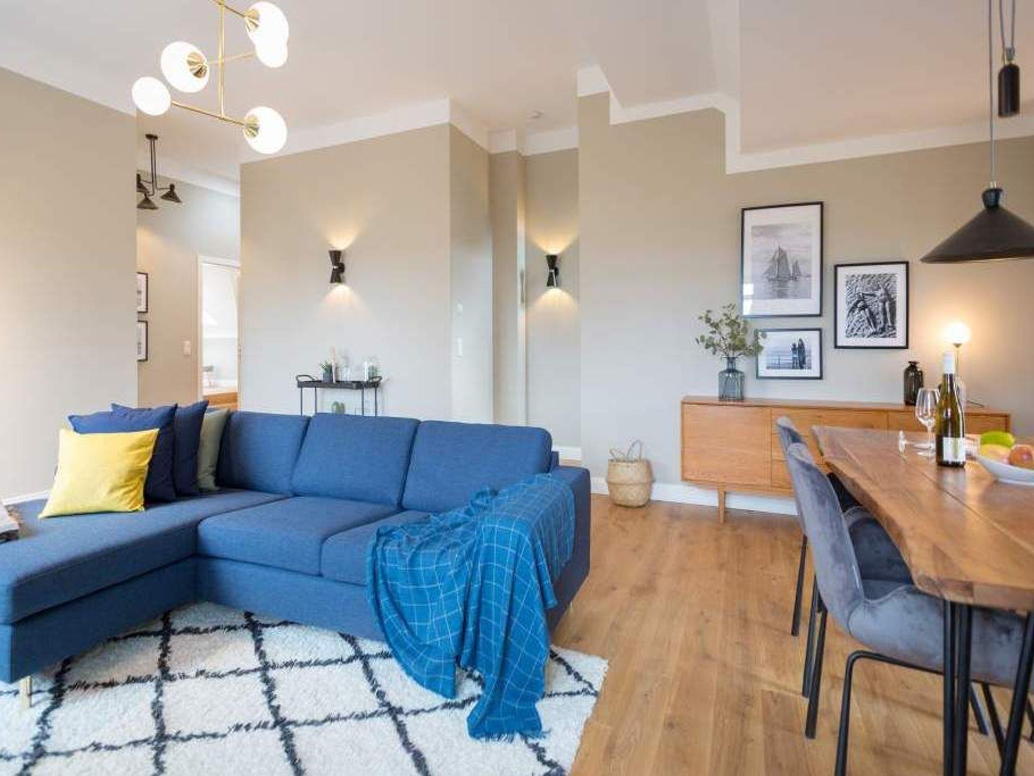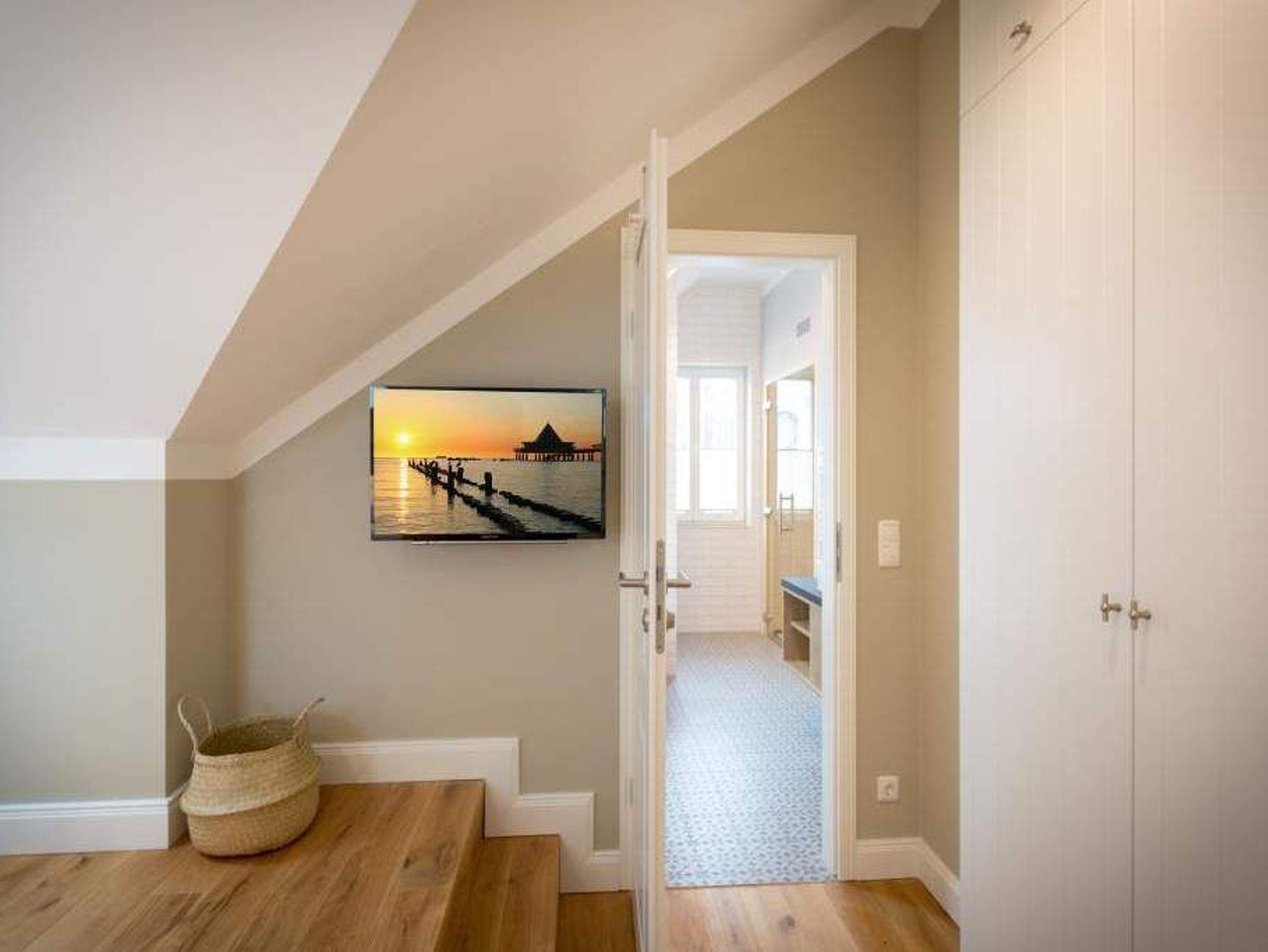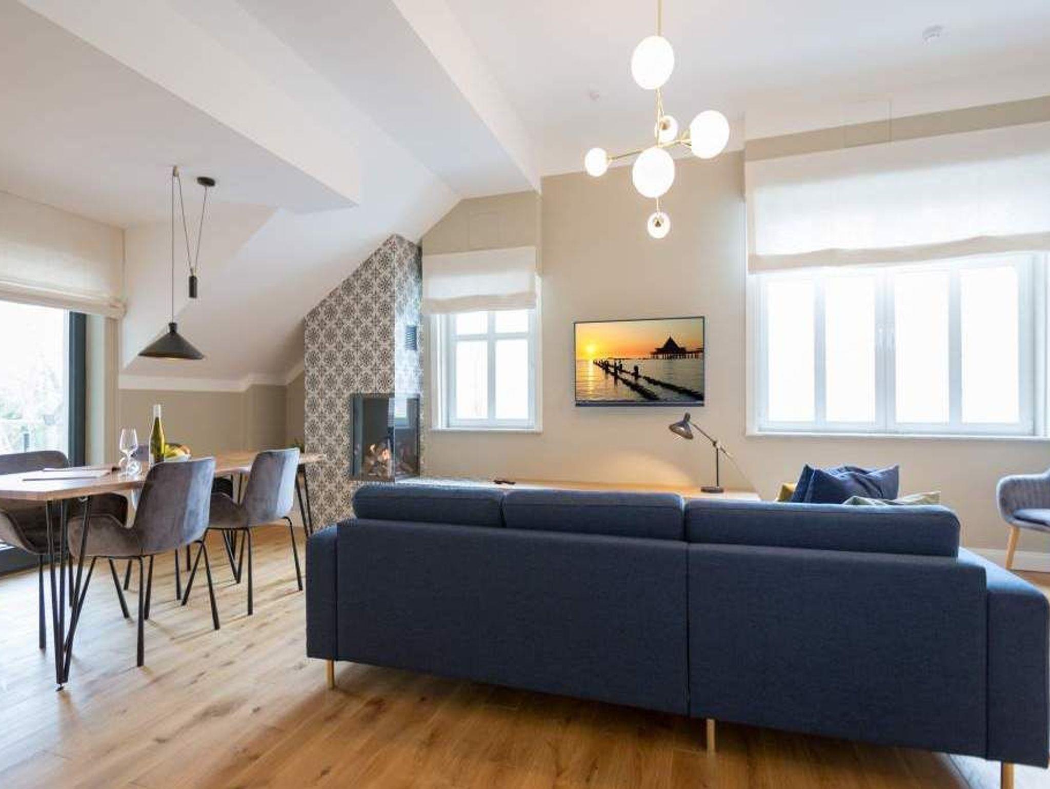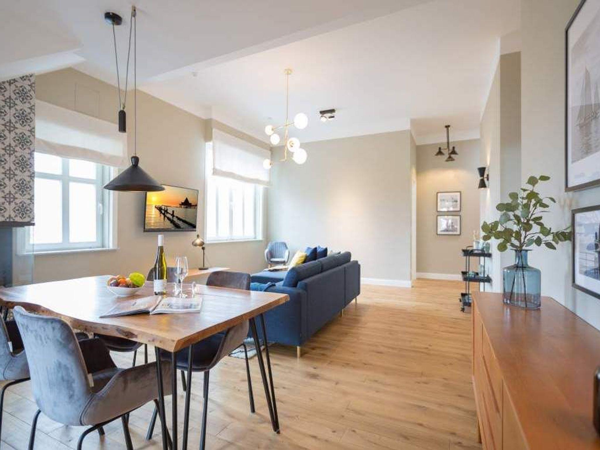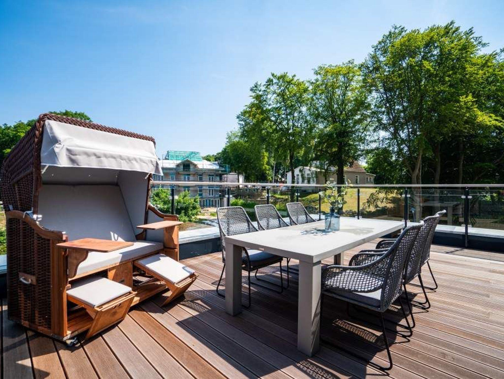 Sie wünschen sich mit Ihrer Familie oder Ihren Freunden eine wirklich exklusive Auszeit mitten im Herzen des Kaiserbades Heringsdorf? Ein Urlaubsdomizil der Extra-Klasse ist die Wohnung 7 im Dachgeschoss der aufwendig sanierten Bädervilla Bellevue. Hier werden Ferienträume wahr! Denn dieser stilvoll eingerichtete Wohntraum bietet auf seinen großzügigen 153 Quadratmetern Raum für vier Erwachsene und zwei Kinder bis drei Jahre (im Kinderreisebett). Jetzt müssen Sie sich nur noch einig werden, wer wo schläft. Denn das Drei-Raum-Appartement wartet mit zwei wunderschönen Schlafzimmern auf. Durch zwei große Flügeltüren gelangt man in das erste Schlafreich. Ein wenig erhöht, auf einem Podest wartet ein komfortables Boxspringdoppelbett (1,80 m x 2,00 m) darauf, Ihnen erholsames Schlafvergnügen zu bereiten. Wie ein Himmel öffnet sich über dem Bett der Giebel bis ins Dach hinein. Von diesem Zimmer aus haben Sie Zugang zum luxuriösen Masterbad. Die wunderschöne Vintagefliesen-Optik, eine frei stehende Badewanne in extravagantem Ei-Design, eine äußerst geräumige Dusche und die Panorama-Sauna definieren den Begriff Wellness neu. Auch das zweite Schlafzimmer ist elegant und exquisit eingerichtet. In dem schicken und bequemen Designer-Doppelbett (1,60 m x 2,00 m) macht nicht nur das Schlafen Spaß. Eine edle Tapete und die hellen Möbel verleihen dem Zimmer ein elegantes Flair. Ein zweites Bad ? ebenfalls mit Dusche, Waschtisch und WC ausgestattet ? sorgt für ein entspanntes Frischmachen. Der Wohnbereich ist eine Oase für Entspannungshungrige und Auszeitfreunde. Offen, hell und geschmackvoll designt ? hier stimmt alles. Angefangen von der großen Sofalandschaft, über die Mid-Century-Design-Klassiker, den schönen, großen Echtholztisch und den von Vintagefliesen eingerahmten Gas-Kamin bis hin zur stylischen und modernen Küche. Hochwertige Geräte und feinstes ASA-Geschirr machen das Kochen und gemeinsame Essen zu einem Erlebnis. In lockerer Atmosphäre können Sie sich am frei stehenden Küchentresen mit Barhockern unterhalten. Entertainment bietet zudem der 42-Zoll-Flat-TV. An das Wohnzimmer angeschlossen ist ein sonnenüberfluteter West-Balkon. Doch wenn Sie richtig Sonne tanken wollen, dann steigen Sie bitte aufs Dach. Über dem Appartement erstreckt sich eine 56 Quadratmeter große Dachterrasse. Hier oben, mit einem grandiosen Blick über die Dächer der schönen Bädervillen des Kulmbergs, vergessen Sie in Windeseile jede Hektik, jeden Stress. Sonnenbaden oder Dinieren ? beides ist hier möglich. Zur Wohnung gehören außerdem 2 Pkw-Stellplätze dazu. Das WLAN ist kostenfrei nutzbar. Und damit Sie sich wirklich um nichts zu kümmern brauchen, sind die Betten bei der Anreise bezogen und Handtücher liegen bereit.