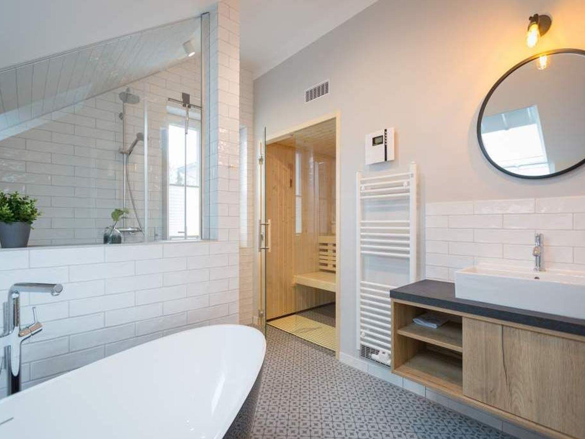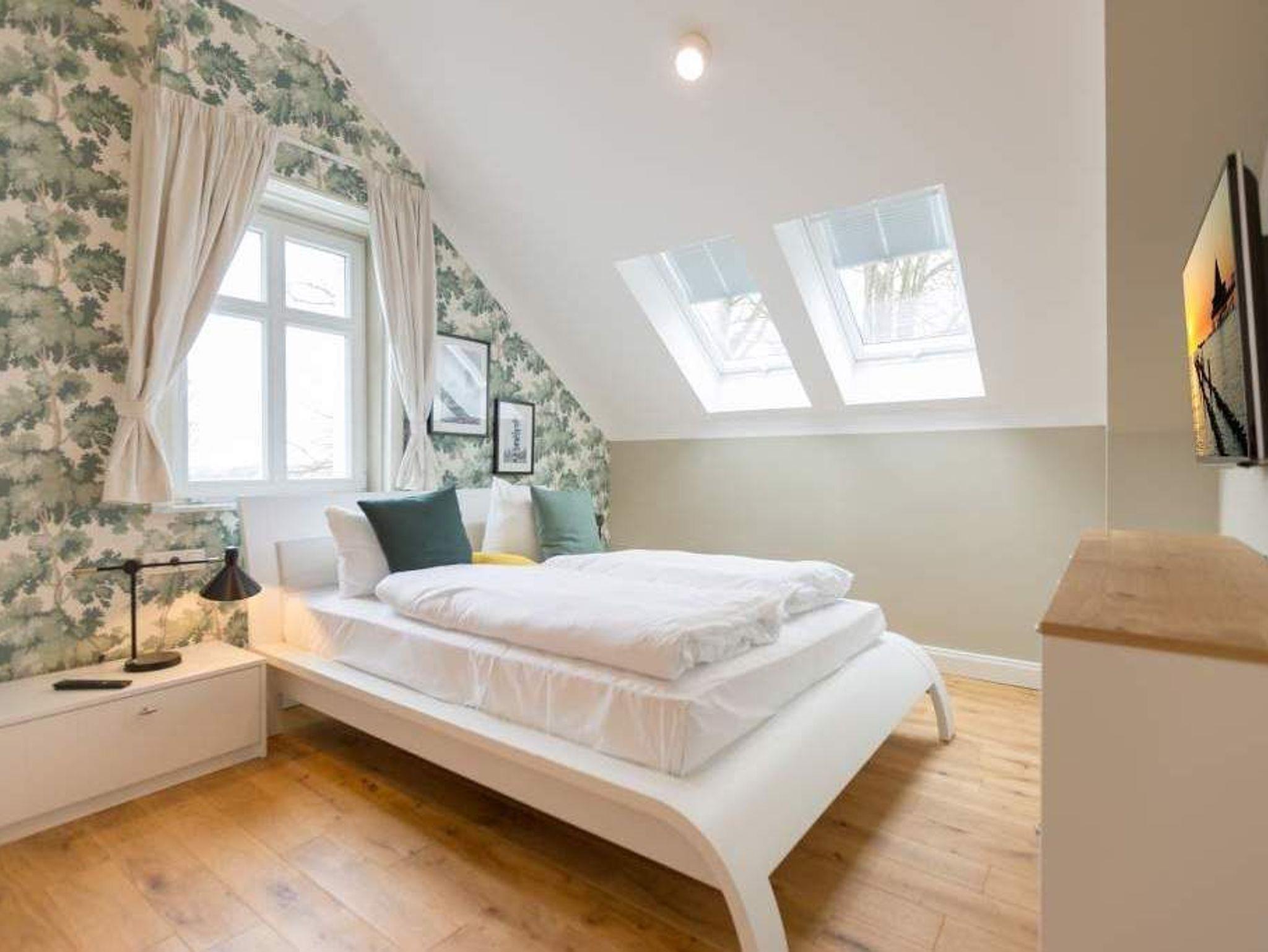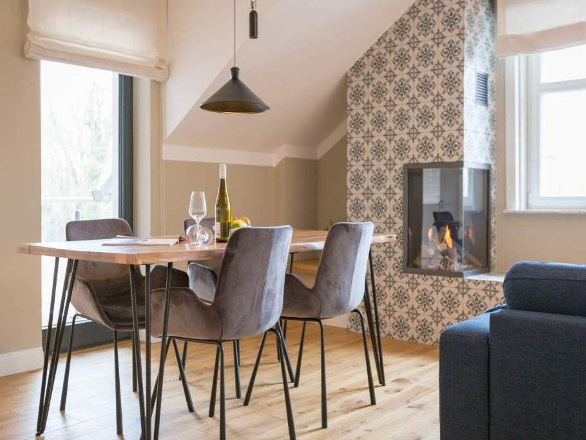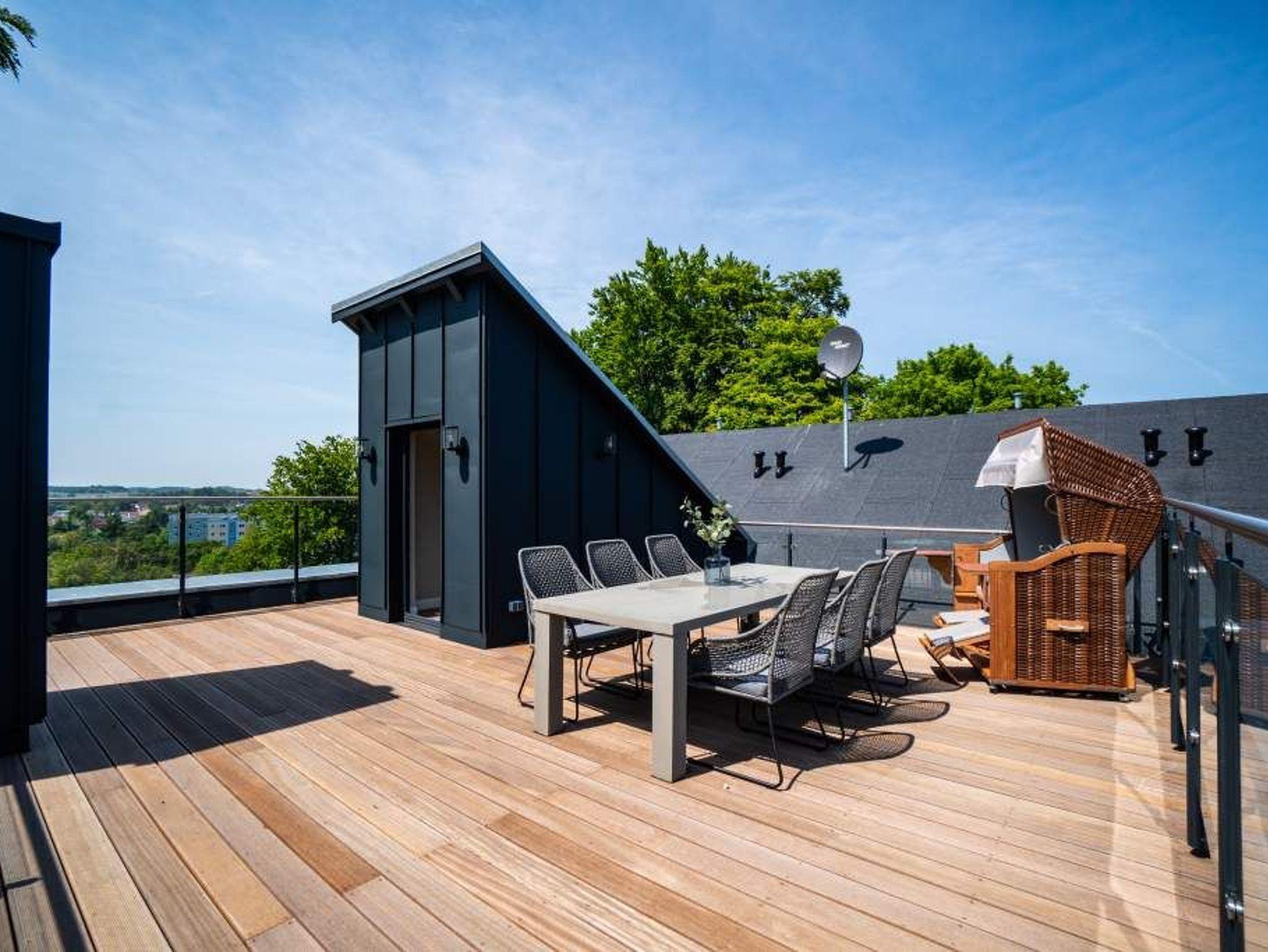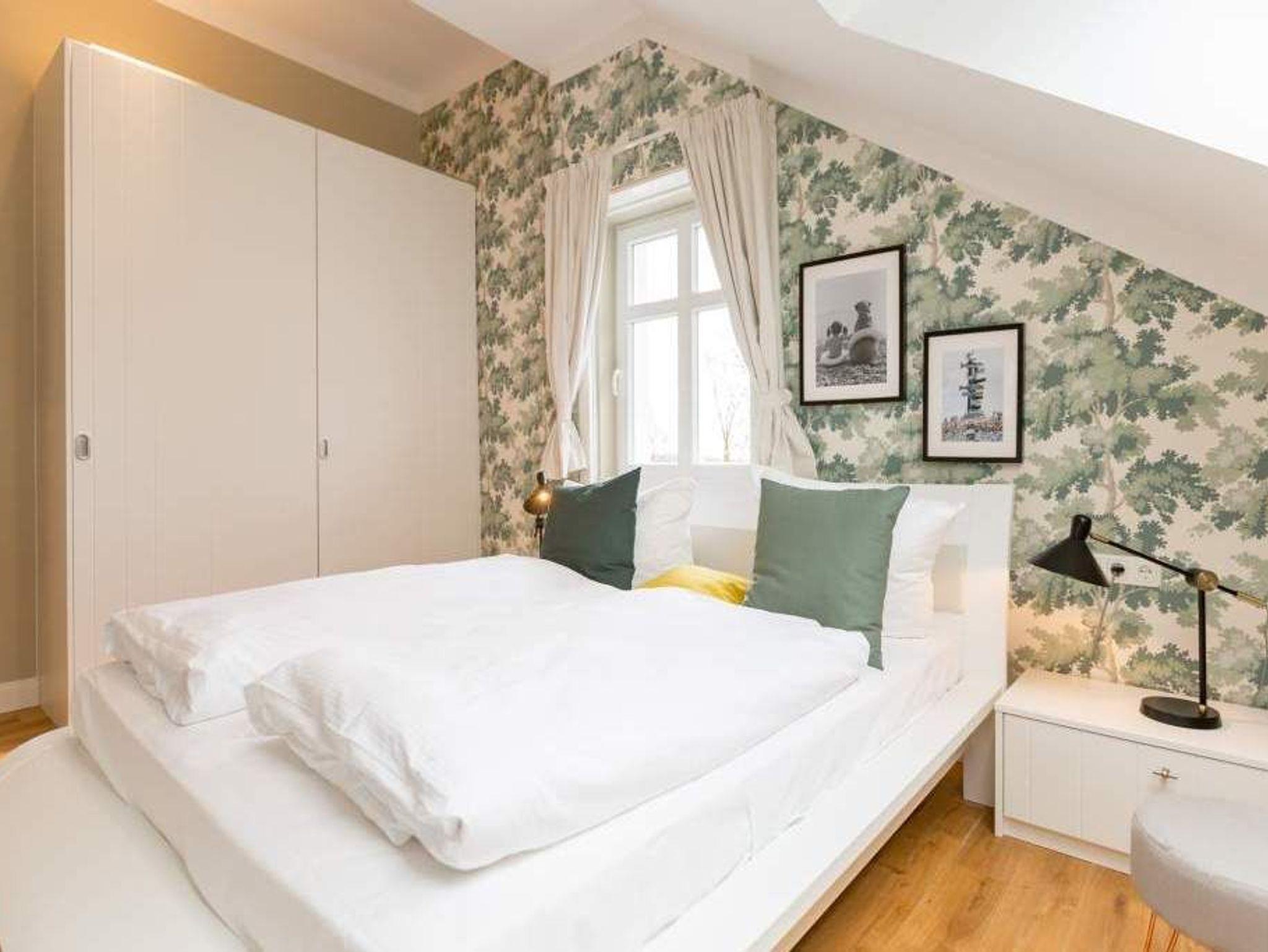 Sie wünschen sich mit Ihrer Familie oder Ihren Freunden eine wirklich exklusive Auszeit mitten im Herzen des Kaiserbades Heringsdorf? Ein Urlaubsdomizil der Extra-Klasse ist die Wohnung 7 im Dachgeschoss der aufwendig sanierten Bädervilla Bellevue. Hier werden Ferienträume wahr! Denn dieser stilvoll eingerichtete Wohntraum bietet auf seinen großzügigen 153 Quadratmetern Raum für vier Erwachsene und zwei Kinder bis drei Jahre (im Kinderreisebett). Jetzt müssen Sie sich nur noch einig werden, wer wo schläft. Denn das Drei-Raum-Appartement wartet mit zwei wunderschönen Schlafzimmern auf. Durch zwei große Flügeltüren gelangt man in das erste Schlafreich. Ein wenig erhöht, auf einem Podest wartet ein komfortables Boxspringdoppelbett (1,80 m x 2,00 m) darauf, Ihnen erholsames Schlafvergnügen zu bereiten. Wie ein Himmel öffnet sich über dem Bett der Giebel bis ins Dach hinein. Von diesem Zimmer aus haben Sie Zugang zum luxuriösen Masterbad. Die wunderschöne Vintagefliesen-Optik, eine frei stehende Badewanne in extravagantem Ei-Design, eine äußerst geräumige Dusche und die Panorama-Sauna definieren den Begriff Wellness neu. Auch das zweite Schlafzimmer ist elegant und exquisit eingerichtet. In dem schicken und bequemen Designer-Doppelbett (1,60 m x 2,00 m) macht nicht nur das Schlafen Spaß. Eine edle Tapete und die hellen Möbel verleihen dem Zimmer ein elegantes Flair. Ein zweites Bad ? ebenfalls mit Dusche, Waschtisch und WC ausgestattet ? sorgt für ein entspanntes Frischmachen. Der Wohnbereich ist eine Oase für Entspannungshungrige und Auszeitfreunde. Offen, hell und geschmackvoll designt ? hier stimmt alles. Angefangen von der großen Sofalandschaft, über die Mid-Century-Design-Klassiker, den schönen, großen Echtholztisch und den von Vintagefliesen eingerahmten Gas-Kamin bis hin zur stylischen und modernen Küche. Hochwertige Geräte und feinstes ASA-Geschirr machen das Kochen und gemeinsame Essen zu einem Erlebnis. In lockerer Atmosphäre können Sie sich am frei stehenden Küchentresen mit Barhockern unterhalten. Entertainment bietet zudem der 42-Zoll-Flat-TV. An das Wohnzimmer angeschlossen ist ein sonnenüberfluteter West-Balkon. Doch wenn Sie richtig Sonne tanken wollen, dann steigen Sie bitte aufs Dach. Über dem Appartement erstreckt sich eine 56 Quadratmeter große Dachterrasse. Hier oben, mit einem grandiosen Blick über die Dächer der schönen Bädervillen des Kulmbergs, vergessen Sie in Windeseile jede Hektik, jeden Stress. Sonnenbaden oder Dinieren ? beides ist hier möglich. Zur Wohnung gehören außerdem 2 Pkw-Stellplätze dazu. Das WLAN ist kostenfrei nutzbar. Und damit Sie sich wirklich um nichts zu kümmern brauchen, sind die Betten bei der Anreise bezogen und Handtücher liegen bereit.