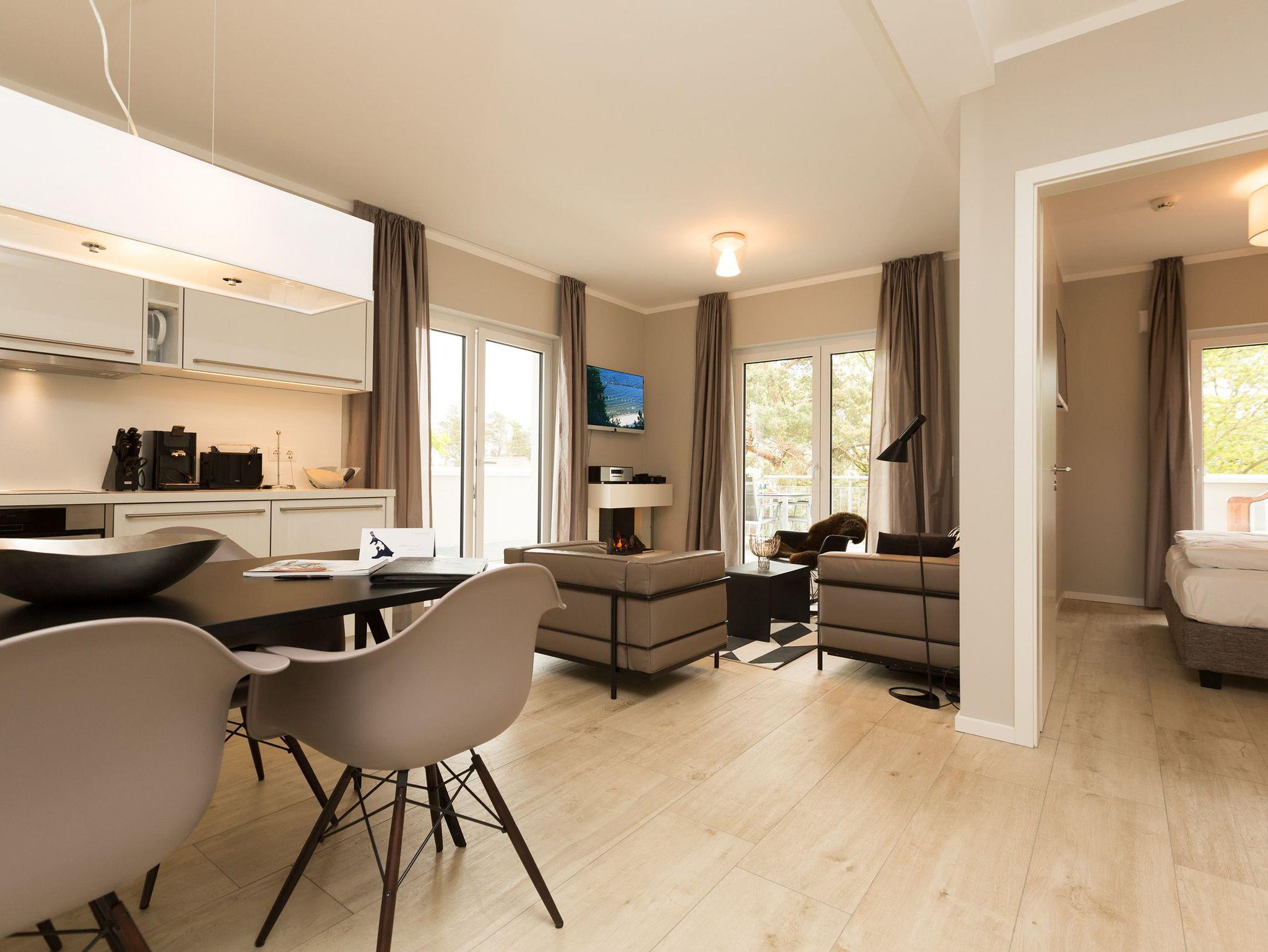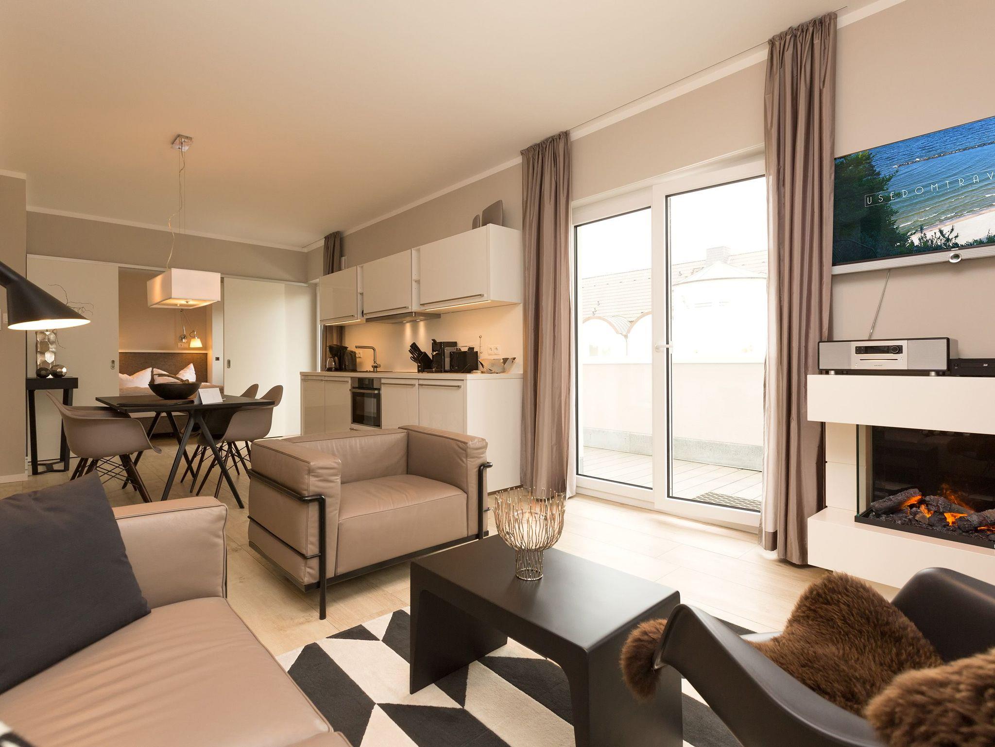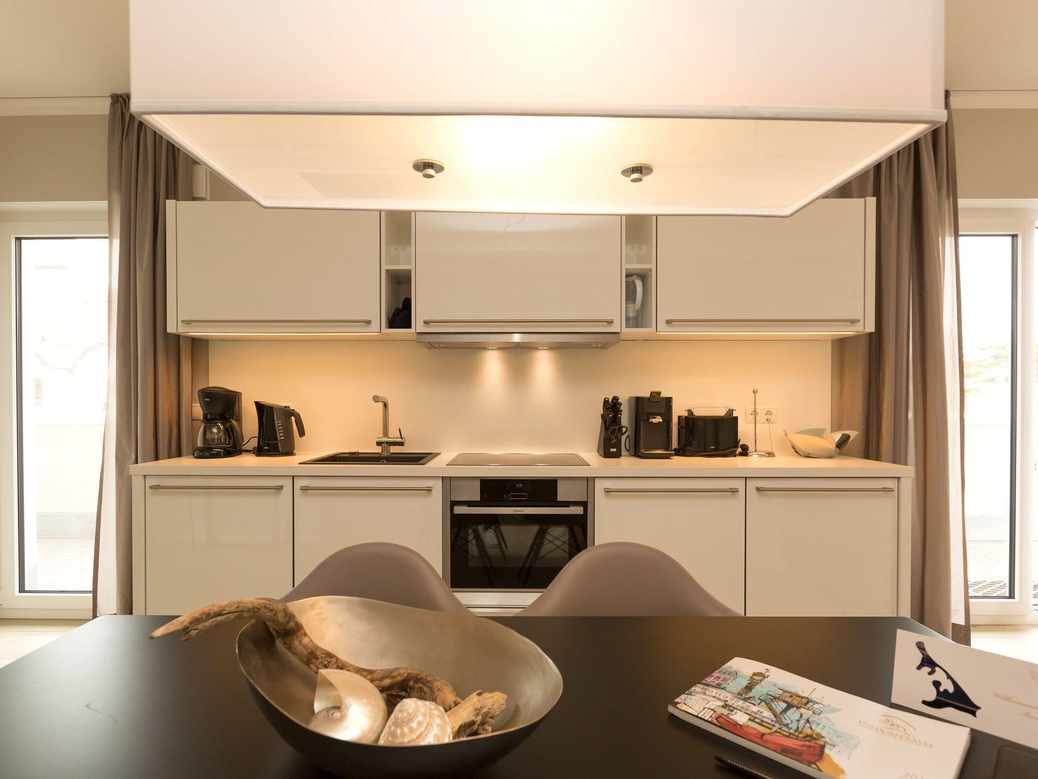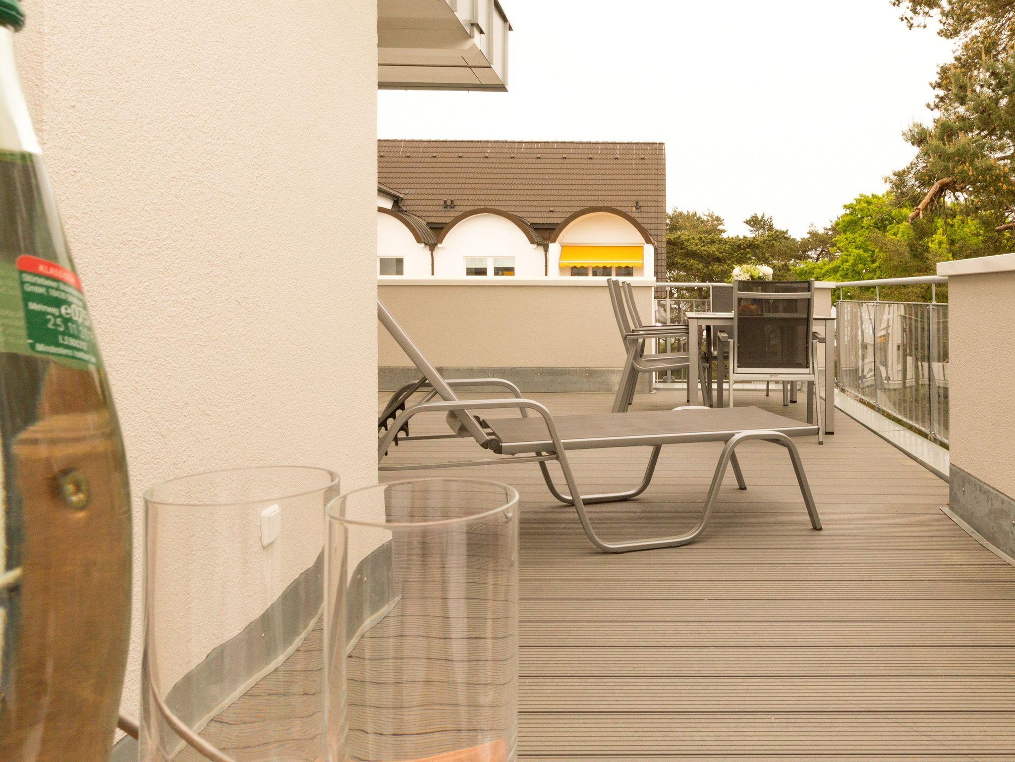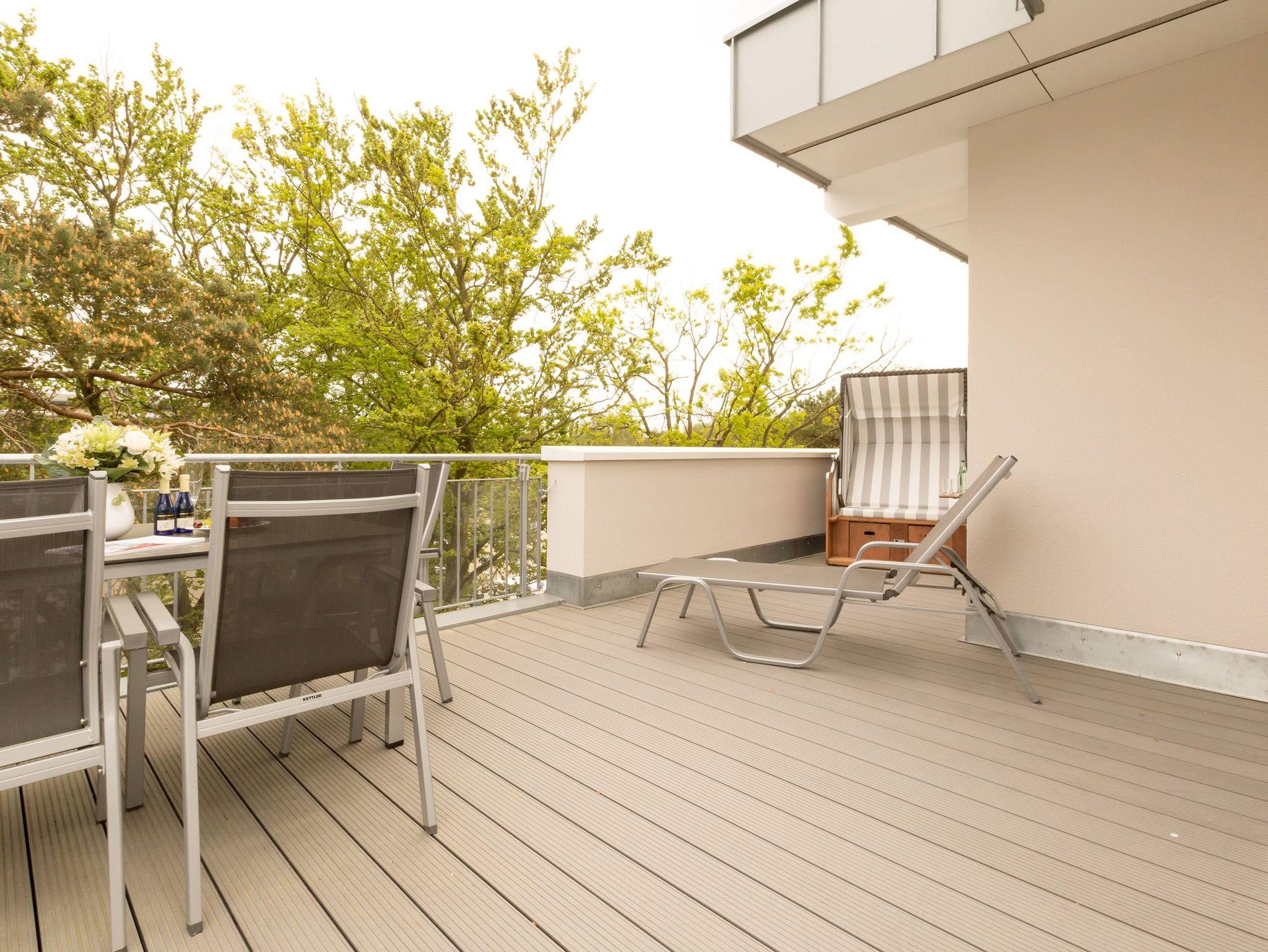 Stil. Extravaganz. Beste Lage mit Meerblick von der Dachterrasse! Edle sandfarbene Töne schaffen für Sie einen Ort der Ruhe. Nie aufdringlich, sondern leise und dezent, edel und geschmackvoll. Eine wunderschöne 3-Raum-Ferienwohnung (72 qm) für 4 Personen und ein Kleinkind (bis 3 Jahre im Babyreisebett). Der zentrale Essplatz mit komplett ausgestatteter Küchenzeile ist der Mittelpunkt des Appartements und ein idealer Platz für gemütliches Beisammensein. Hier lässt es sich entspannt frühstücken und dinieren. Ihr äußerst geschmackvoll designter Wohnbereich empfängt Sie lichtdurchflutet, mit Zugang zur großzügigen Dachterrasse. Die stylische Sitzgruppe von Cassina wird ergänzt durch den Flat-TV, Blue-Ray-Player und eine Hifi-Anlage mit ipod-Dock. Perfekte Rahmenbedingungen für einen kuscheligen Abend schafft der moderne Elektrokamin ganz einfach per Knopfdruck. Das erste Schlafzimmer ist mit einem exklusiven Treca interiors Paris Doppelboxspringbett (1,80m x 2,00m), Einbauschrank und Flat-TV ausgestattet. Das zweite, kleinere Schlafzimmer verfügt ebenfalls über ein Treca interiors Paris Doppelboxspringbett (1,60m x 2,00m), wertige Einbauten, über einen eigenen Flat-TV und ist mit einer Schiebetür vom Wohnbereich getrennt. Auf der Nord-Ost Dachterrasse darf ein Strandkorb ebenso wenig fehlen, wie das Gartenmobiliar. Durch die Kiefern auf der Düne zeigt sich das Meer - von hier nur einen Steinwurf entfernt, Meeresrauschen [&] Sonnenaufgang inklusive. Für Ihren Komfort sind die Betten bei der Anreise bezogen und Handtücher liegen bereit. Für kleine Gäste kann ein Kinderreisebett und ein Kinderhochstuhl (gegen Gebühr) bestellt werden. Ein Pkw-Stellplatz befindet sich in der Tiefgarage (max. Einfahrtshöhe 1,93 m).