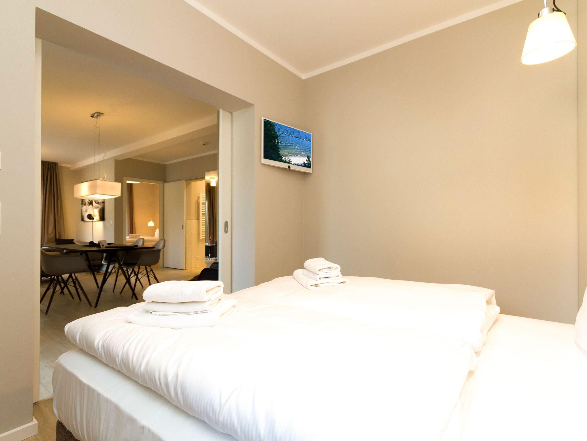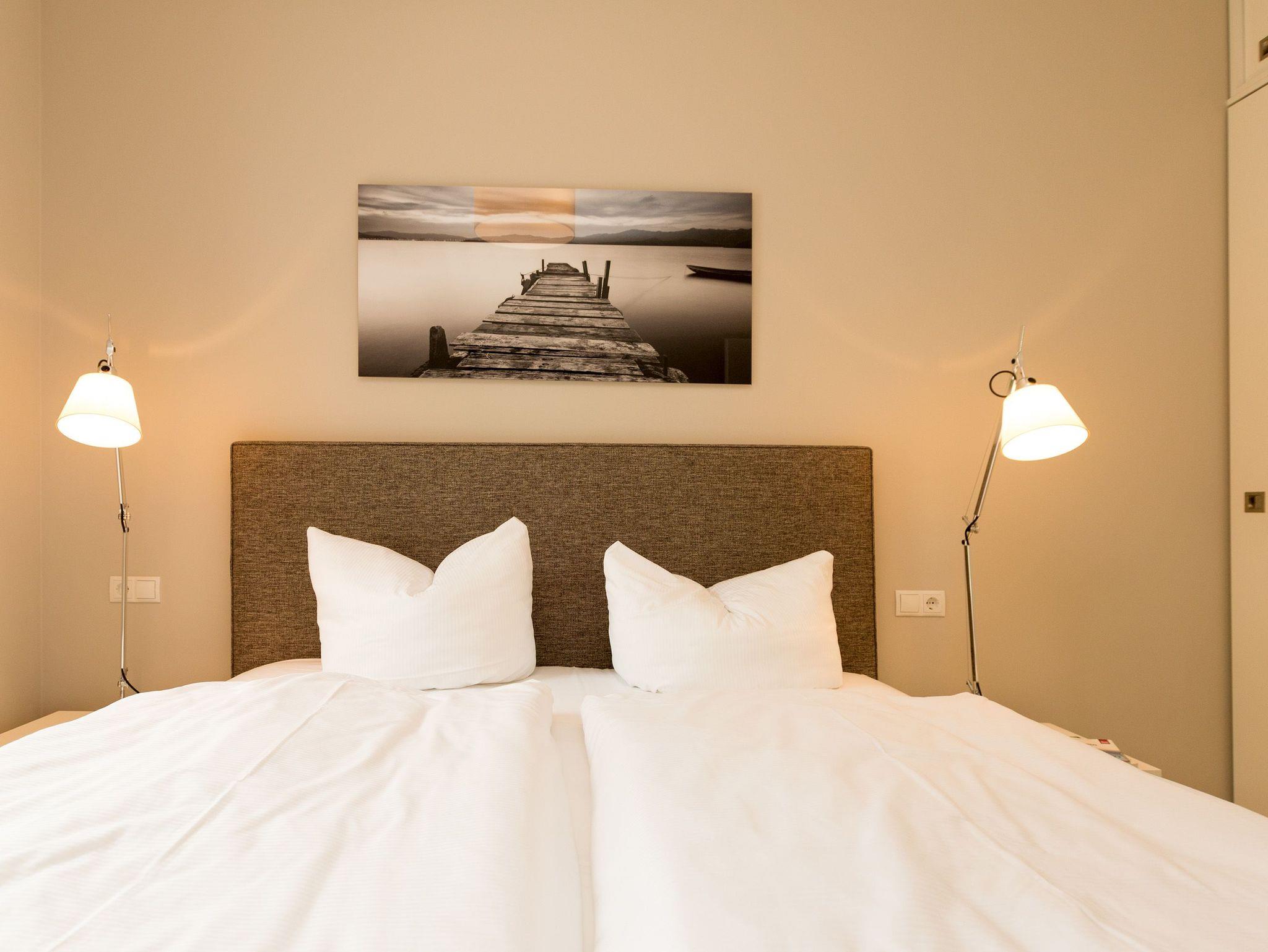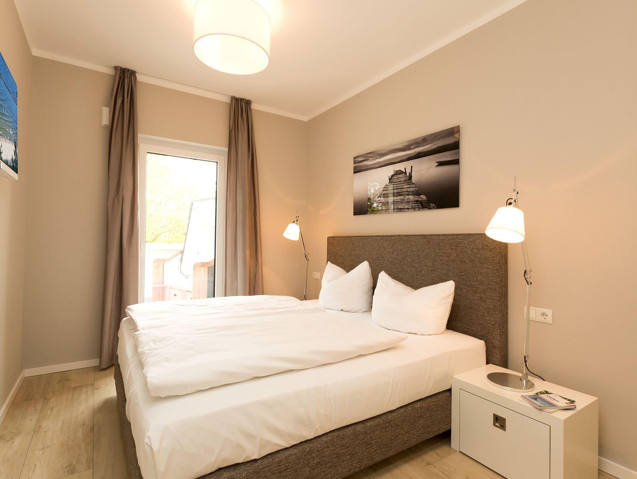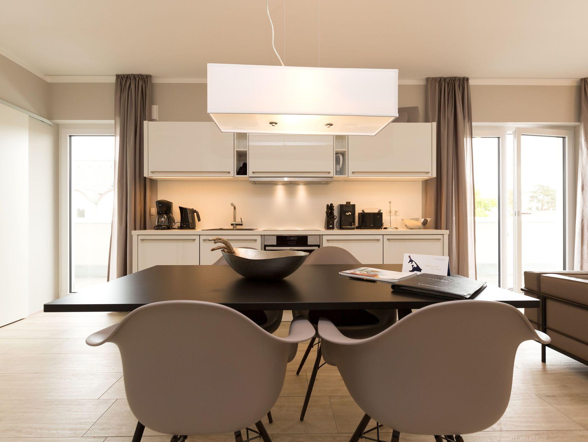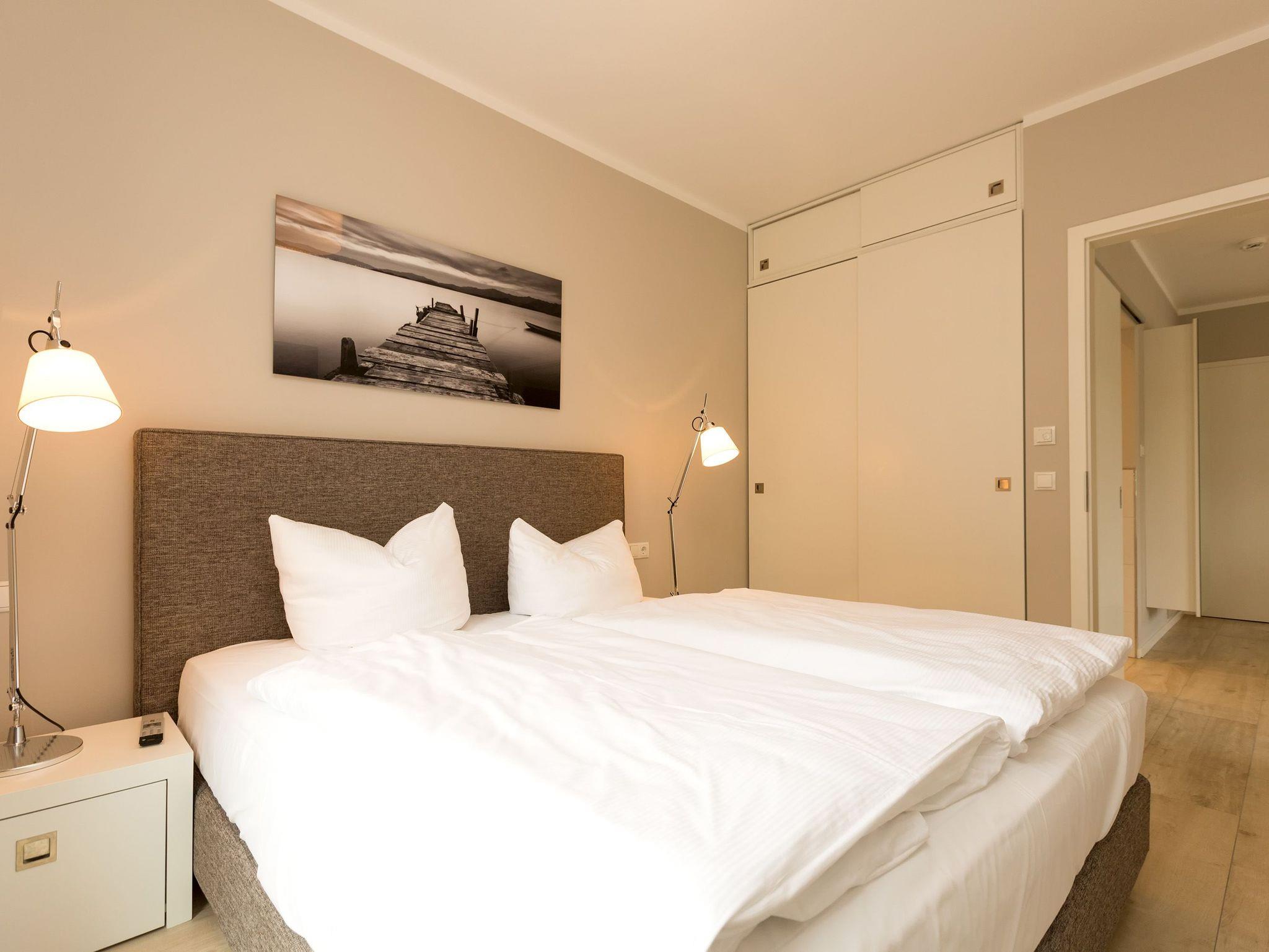 Stil. Extravaganz. Beste Lage mit Meerblick von der Dachterrasse! Edle sandfarbene Töne schaffen für Sie einen Ort der Ruhe. Nie aufdringlich, sondern leise und dezent, edel und geschmackvoll. Eine wunderschöne 3-Raum-Ferienwohnung (72 qm) für 4 Personen und ein Kleinkind (bis 3 Jahre im Babyreisebett). Der zentrale Essplatz mit komplett ausgestatteter Küchenzeile ist der Mittelpunkt des Appartements und ein idealer Platz für gemütliches Beisammensein. Hier lässt es sich entspannt frühstücken und dinieren. Ihr äußerst geschmackvoll designter Wohnbereich empfängt Sie lichtdurchflutet, mit Zugang zur großzügigen Dachterrasse. Die stylische Sitzgruppe von Cassina wird ergänzt durch den Flat-TV, Blue-Ray-Player und eine Hifi-Anlage mit ipod-Dock. Perfekte Rahmenbedingungen für einen kuscheligen Abend schafft der moderne Elektrokamin ganz einfach per Knopfdruck. Das erste Schlafzimmer ist mit einem exklusiven Treca interiors Paris Doppelboxspringbett (1,80m x 2,00m), Einbauschrank und Flat-TV ausgestattet. Das zweite, kleinere Schlafzimmer verfügt ebenfalls über ein Treca interiors Paris Doppelboxspringbett (1,60m x 2,00m), wertige Einbauten, über einen eigenen Flat-TV und ist mit einer Schiebetür vom Wohnbereich getrennt. Auf der Nord-Ost Dachterrasse darf ein Strandkorb ebenso wenig fehlen, wie das Gartenmobiliar. Durch die Kiefern auf der Düne zeigt sich das Meer - von hier nur einen Steinwurf entfernt, Meeresrauschen [&] Sonnenaufgang inklusive. Für Ihren Komfort sind die Betten bei der Anreise bezogen und Handtücher liegen bereit. Für kleine Gäste kann ein Kinderreisebett und ein Kinderhochstuhl (gegen Gebühr) bestellt werden. Ein Pkw-Stellplatz befindet sich in der Tiefgarage (max. Einfahrtshöhe 1,93 m).