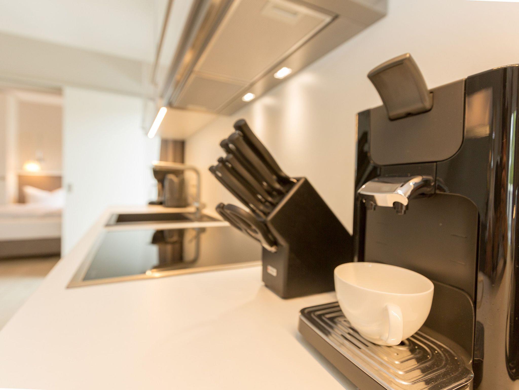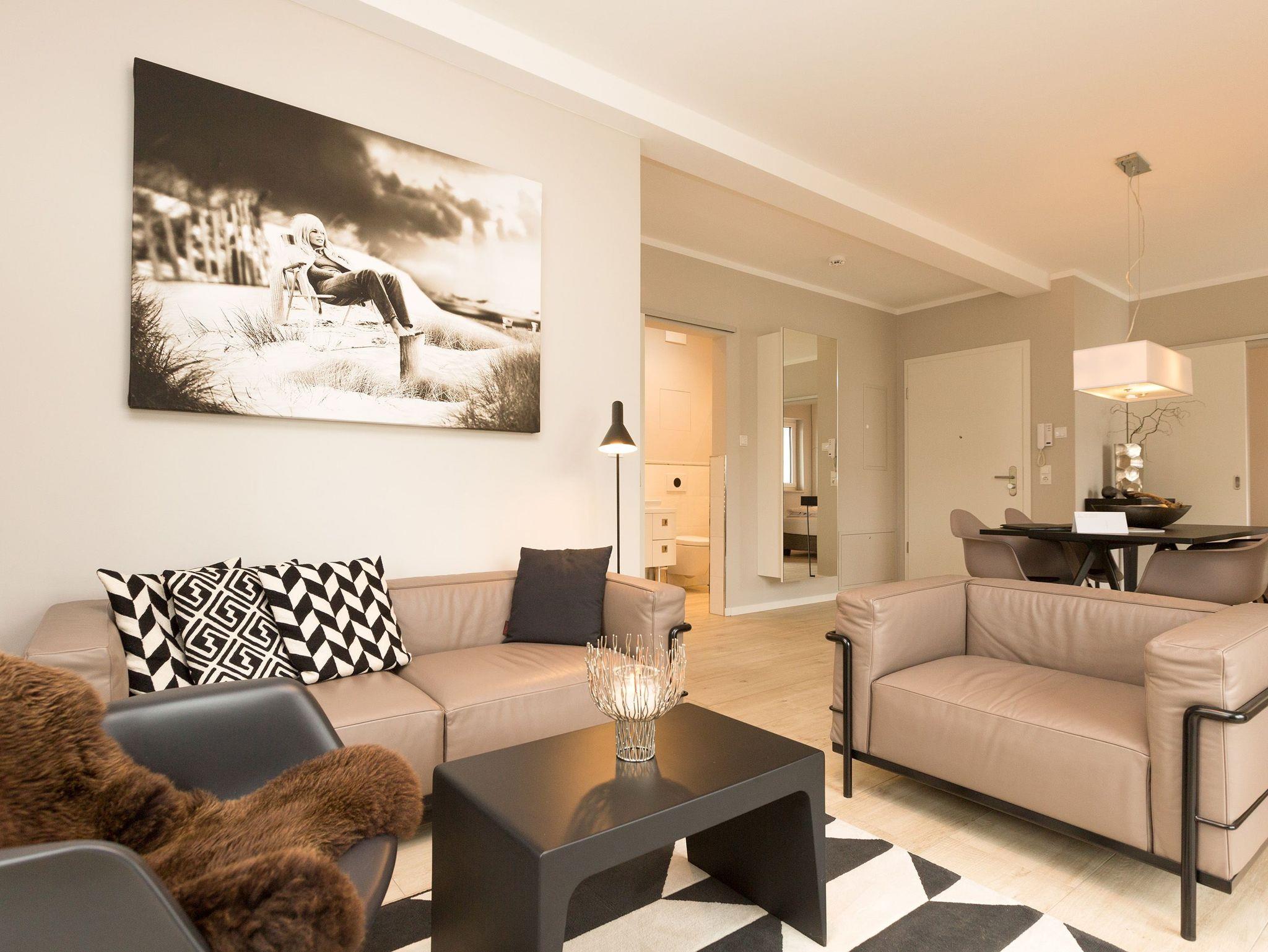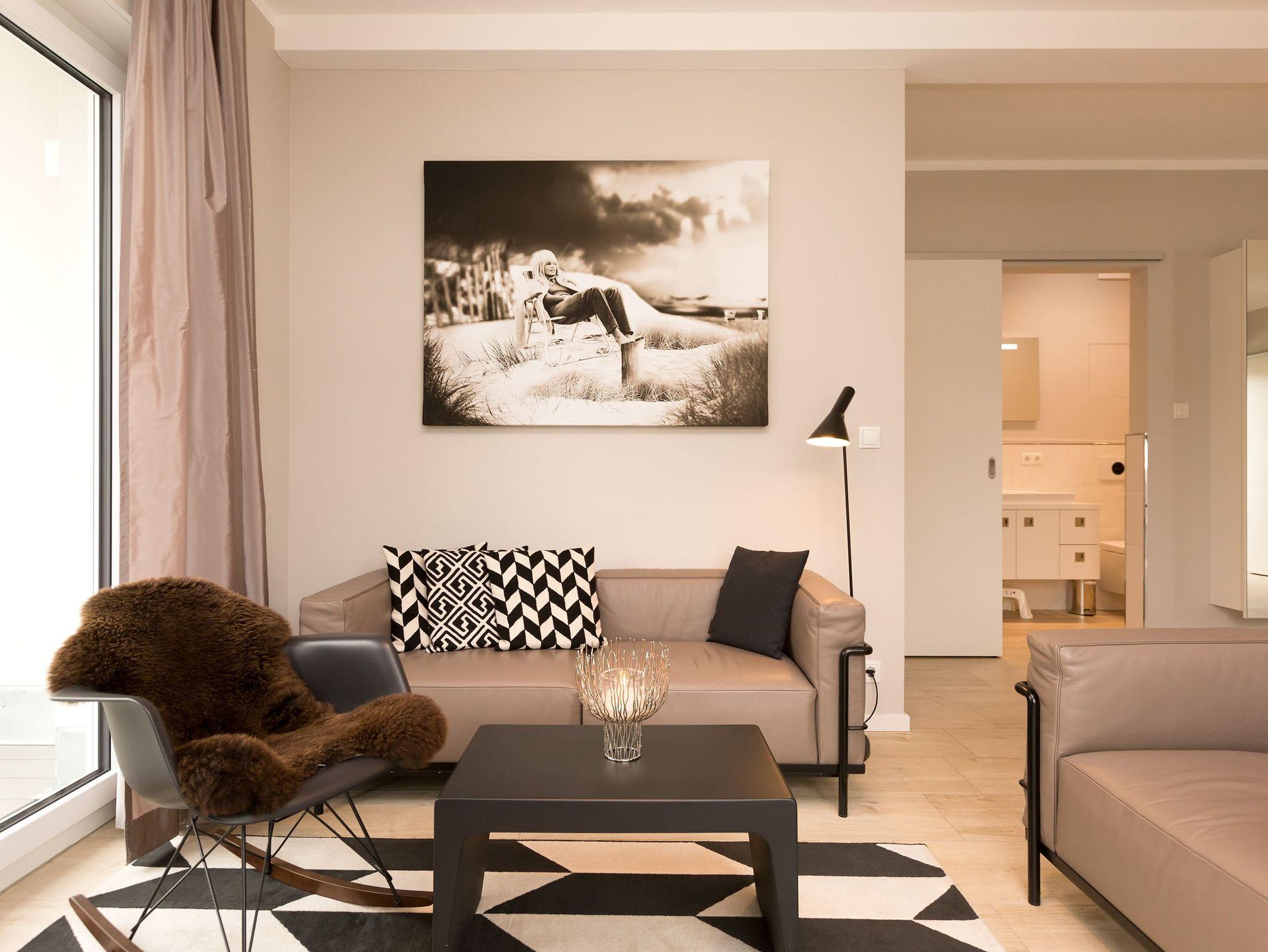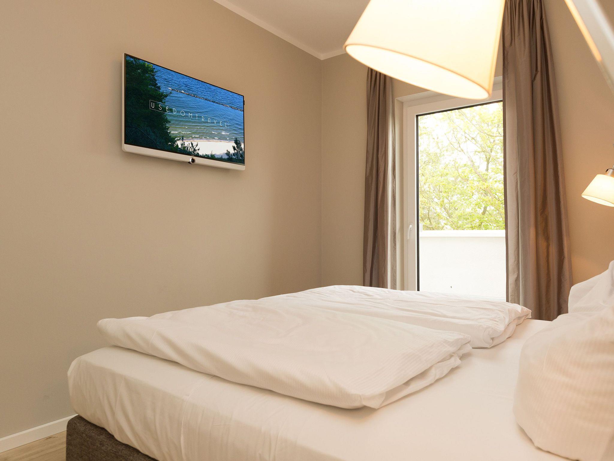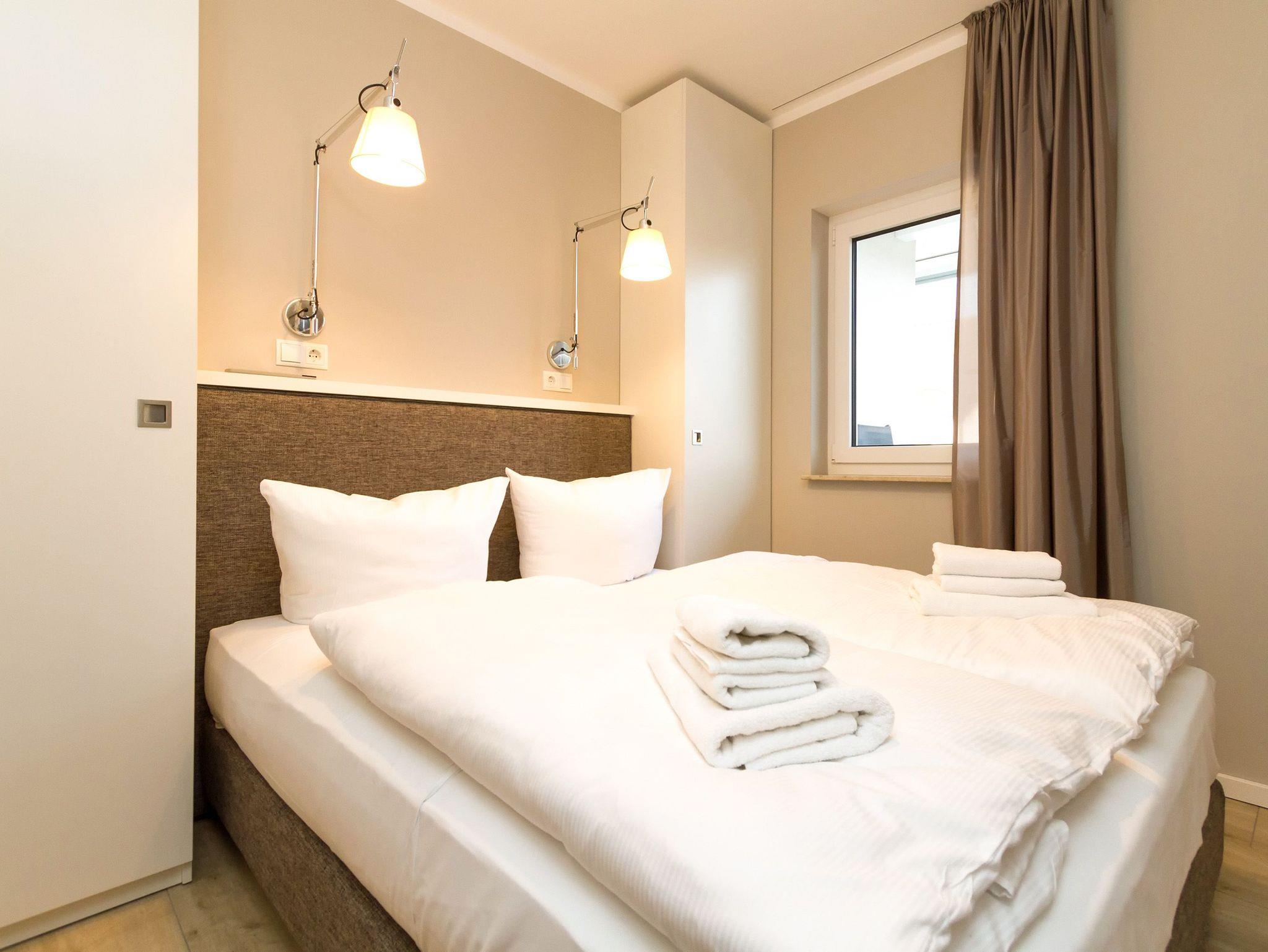Stil. Extravaganz. Beste Lage mit Meerblick von der Dachterrasse! Edle sandfarbene Töne schaffen für Sie einen Ort der Ruhe. Nie aufdringlich, sondern leise und dezent, edel und geschmackvoll. Eine wunderschöne 3-Raum-Ferienwohnung (72 qm) für 4 Personen und ein Kleinkind (bis 3 Jahre im Babyreisebett). Der zentrale Essplatz mit komplett ausgestatteter Küchenzeile ist der Mittelpunkt des Appartements und ein idealer Platz für gemütliches Beisammensein. Hier lässt es sich entspannt frühstücken und dinieren. Ihr äußerst geschmackvoll designter Wohnbereich empfängt Sie lichtdurchflutet, mit Zugang zur großzügigen Dachterrasse. Die stylische Sitzgruppe von Cassina wird ergänzt durch den Flat-TV, Blue-Ray-Player und eine Hifi-Anlage mit ipod-Dock. Perfekte Rahmenbedingungen für einen kuscheligen Abend schafft der moderne Elektrokamin ganz einfach per Knopfdruck. Das erste Schlafzimmer ist mit einem exklusiven Treca interiors Paris Doppelboxspringbett (1,80m x 2,00m), Einbauschrank und Flat-TV ausgestattet. Das zweite, kleinere Schlafzimmer verfügt ebenfalls über ein Treca interiors Paris Doppelboxspringbett (1,60m x 2,00m), wertige Einbauten, über einen eigenen Flat-TV und ist mit einer Schiebetür vom Wohnbereich getrennt. Auf der Nord-Ost Dachterrasse darf ein Strandkorb ebenso wenig fehlen, wie das Gartenmobiliar. Durch die Kiefern auf der Düne zeigt sich das Meer - von hier nur einen Steinwurf entfernt, Meeresrauschen [&] Sonnenaufgang inklusive. Für Ihren Komfort sind die Betten bei der Anreise bezogen und Handtücher liegen bereit. Für kleine Gäste kann ein Kinderreisebett und ein Kinderhochstuhl (gegen Gebühr) bestellt werden. Ein Pkw-Stellplatz befindet sich in der Tiefgarage (max. Einfahrtshöhe 1,93 m).
