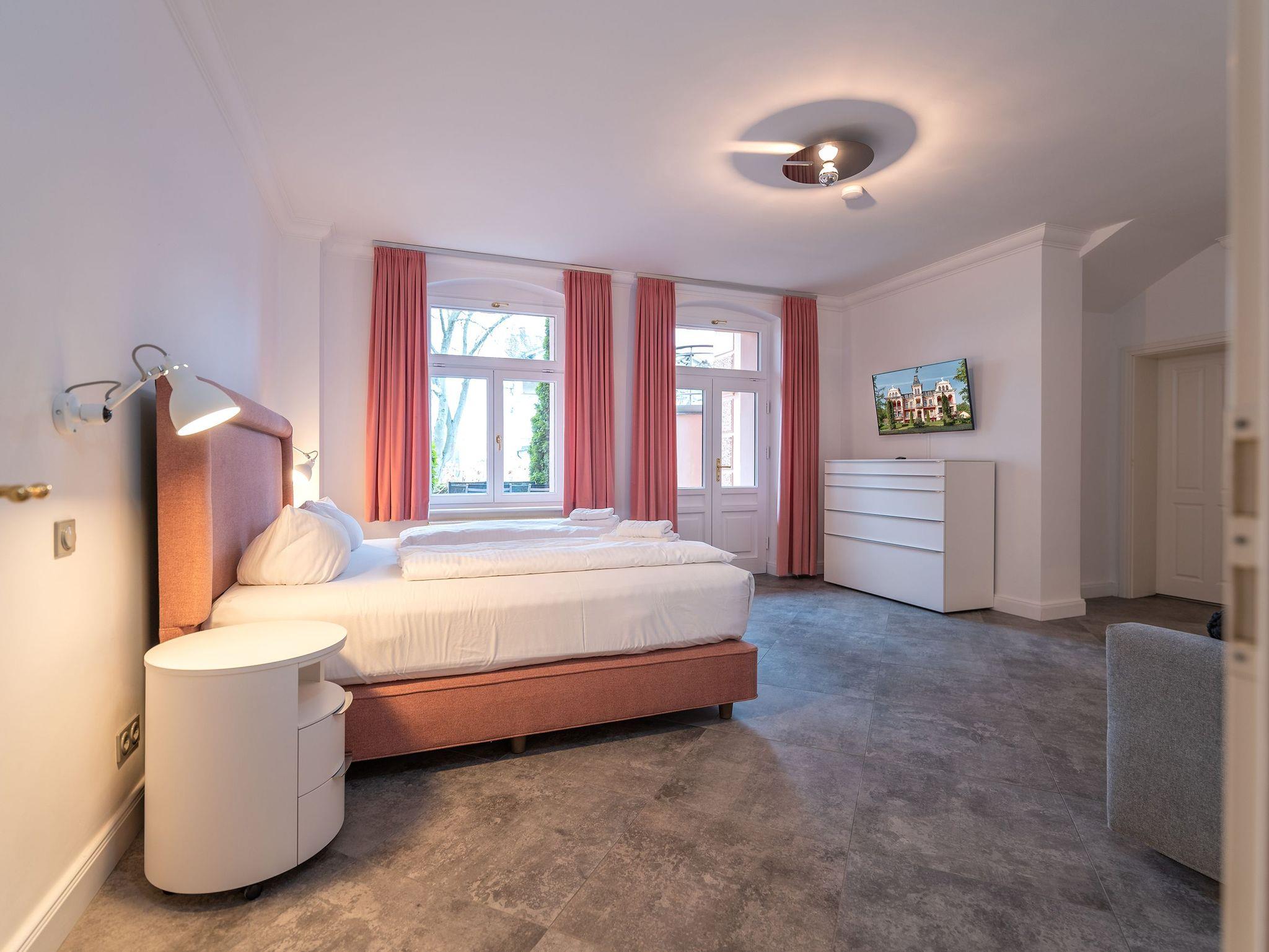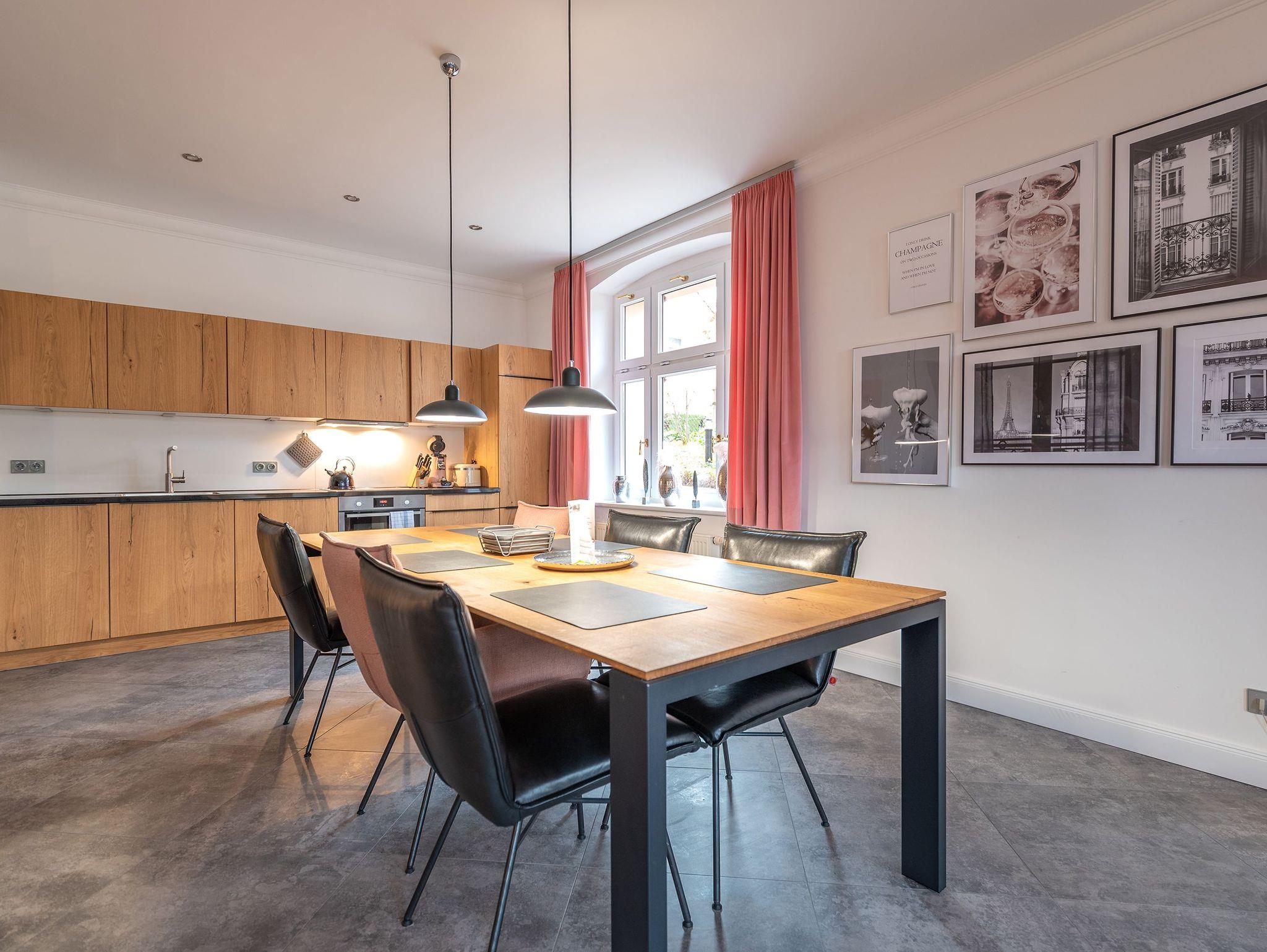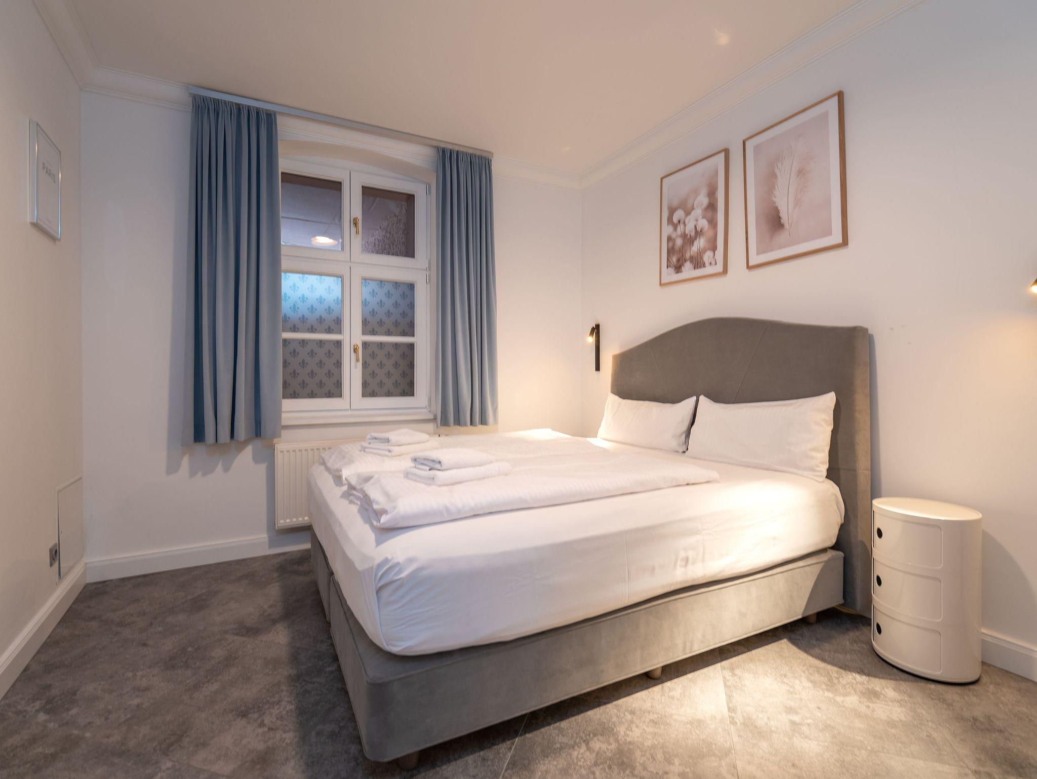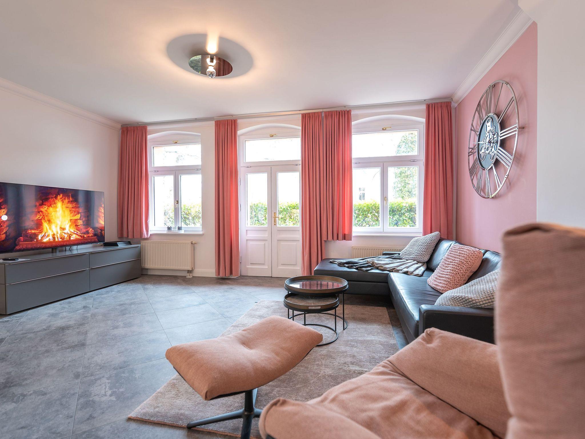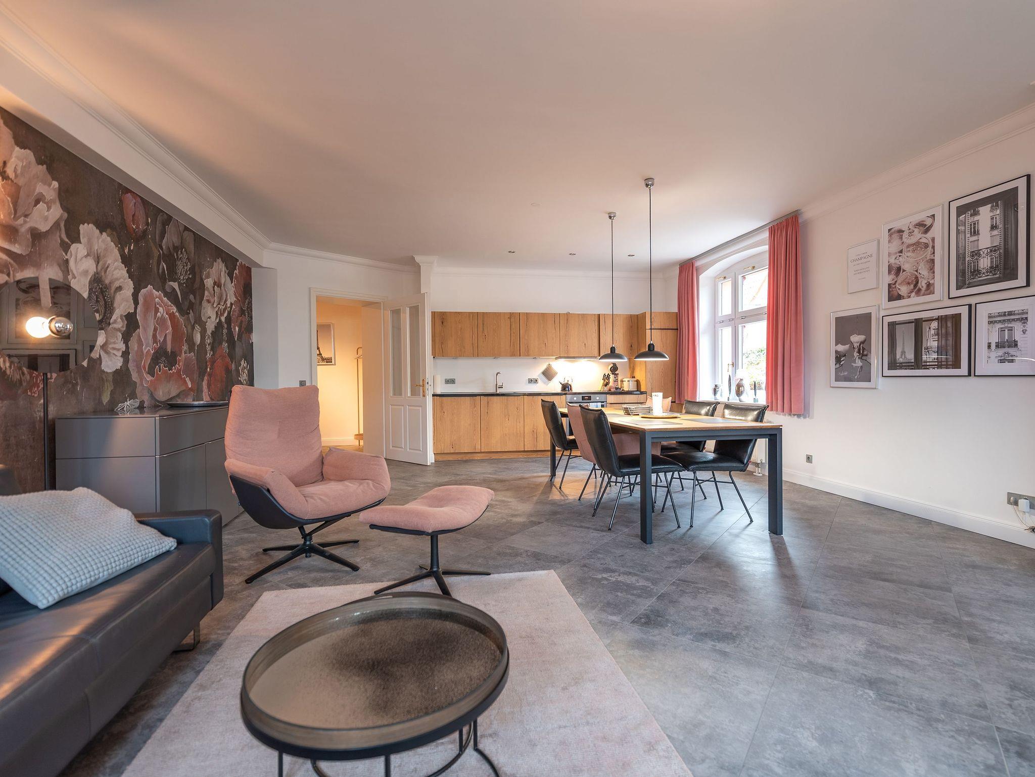Das Appartement ?Sommerresidenz? im Erdgeschoss bietet mit 118 Quadratmetern großzügig gestalteten Wohnraum für einen unvergleichlichen Urlaub. Sie profitieren von zwei Schlafzimmern, ausgestattet mit handgefertigten englischen Boxspringbetten, einem modernen Wohnbereich mit komfortabler Couch, Fernsehsessel und einem großen Smart-TV inklusive PlayStation 4. Der großzügige Essbereich lädt mit Platz für bis zu sechs Personen zu gemeinsamen Mahlzeiten ein, während die offene Küche keine kulinarischen Wünsche offenlässt.