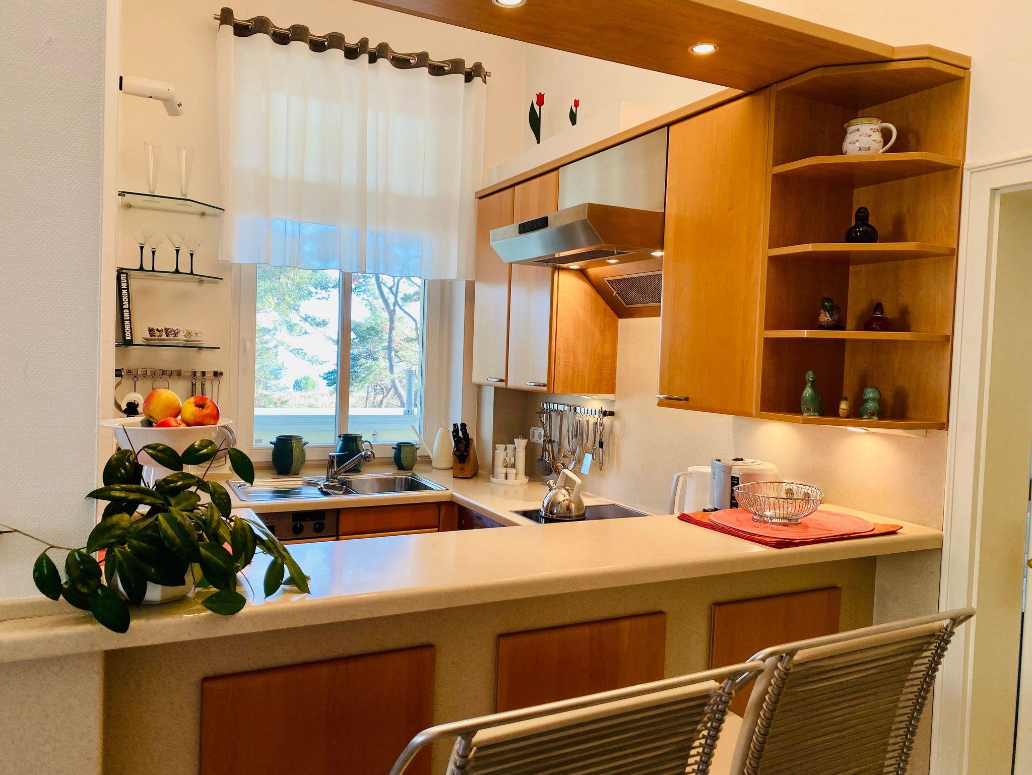 Die schöne Zweiraumwohnung befindet sich im 2. OG der Villa und ist über das historische Treppenhaus zu erreichen. Sie bietet den Gästen (Nichtraucher) viel Komfort und Platz: im romantischen Wohnzimmer mit tollem Kamin, in der offenen Komplettküche mit Tresen und Waschmaschine, im Schlafzimmer mit gemütlichem Doppelbett und im Bad mit Badewanne. Vom Wohnraum gelangt man auf einen großen überdachten Balkon mit Seeblick. Genießen Sie hier Ihre Mahlzeiten oder nur den Blick auf die bewaldete Düne und aufs Meer. Stellplatz am Haus.