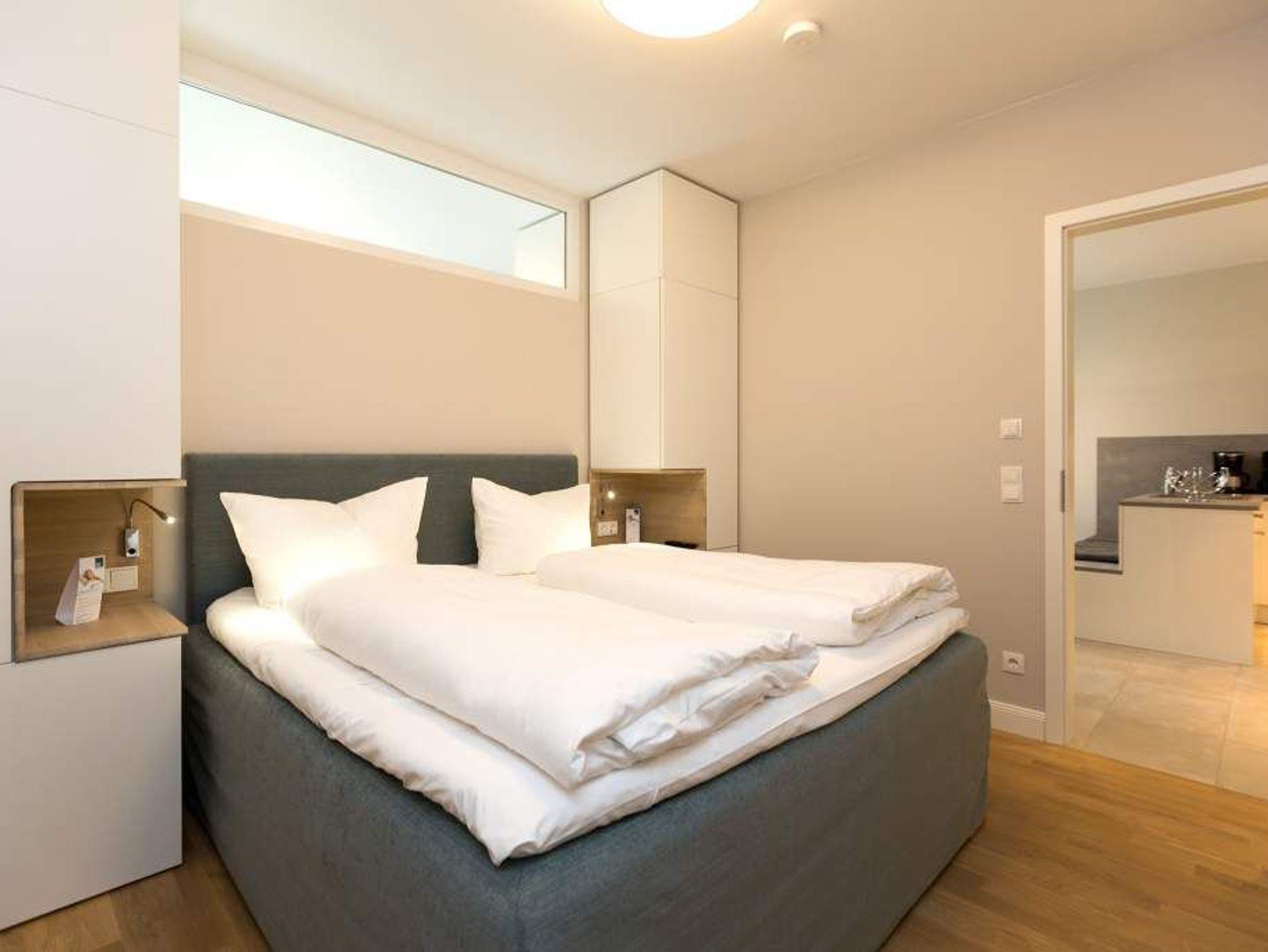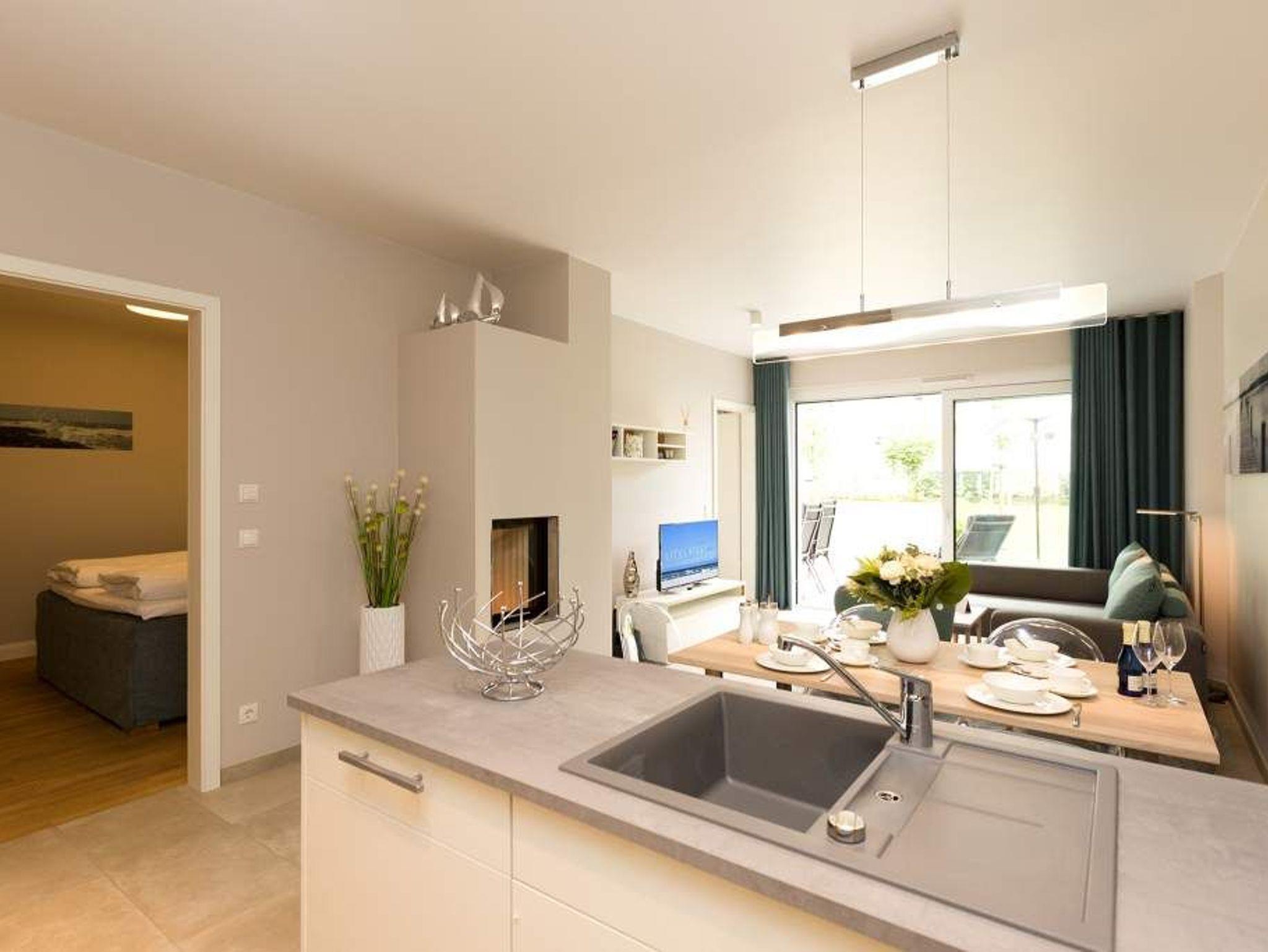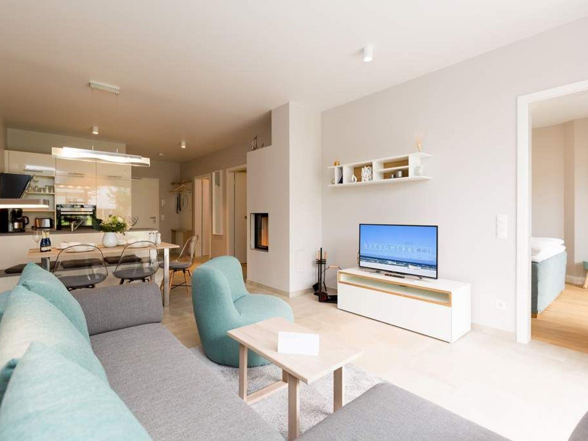 Ein Ferien-Appartement der Extraklasse erwartet sie im Erdgeschoss der Villa Strandgrün. Drei Räume ? außergewöhnlich, stylisch und absolut hochwertig eingerichtet ? machen Ihren Ostseeurlaub zu einem besonderen Erlebnis. Das knapp 68 Quadratmeter große Appartement ist für 4 Personen und 1 Kleinkind (bis zu 3 Jahre) im Kinderreisebett zusätzlich untergebracht werden. Helle und harmonisch aufeinander abgestimmte Farben verleihen der Wohnung in Kombination mit der Betonoptik der Bodenfliesen und den skandinavischen Designmöbeln ein modernes und exklusives Flair. Eine offene Wohnküche sorgt für eine kommunikative Atmosphäre. Der Wohnbereich besticht durch den Echtholztisch mit den Retro-Schalenstühlen aus Acryl. Entspannen Sie auf der chilligen Wohnlandschaft beim Blick auf den Echtholzkamin oder den 40 Zoll Flat-TV. Vom Wohnzimmer aus gelangt man auf die 30 Quadratmeter große Sonnenterrasse mit Süd-West-Ausrichtung. Zwei Schlafzimmer mit Boxspringdoppelbetten (1,80 m x 2,00 m), hochwertigen Einbauschränken und Flat-TV bieten komfortable Rückzugsmöglichkeiten. Die beiden Schlafzimmer sind über ein feststehendes Oberlicht-Fenster miteinander verbunden. Ein Schlafzimmer verfügt zusätzlich über einen direkten Zugang zur Terrasse. Das zweite Schlafzimmer hat kein zu öffnendes Fenster; die Lüftung erfolgt ausschließlich über die Tür zum Wohnbereich. Im geräumigen Wellnessbad befindet sich eine Panorama-Sauna, eine Tropendusche und ein Doppelwaschtisch. Die Ferienwohnung verfügt zusätzlich über ein Gäste-WC. In der Tiefgarage sind für Sie zwei Pkw-Stellplätze reserviert. Für Ihren Komfort sind die Betten bereits bezogen und Handtücher liegen bereit. Von Mai bis Anfang Oktober (je nach Wetterlage) kann der wohnungseigene Strandkorb am Strand genutzt werden.