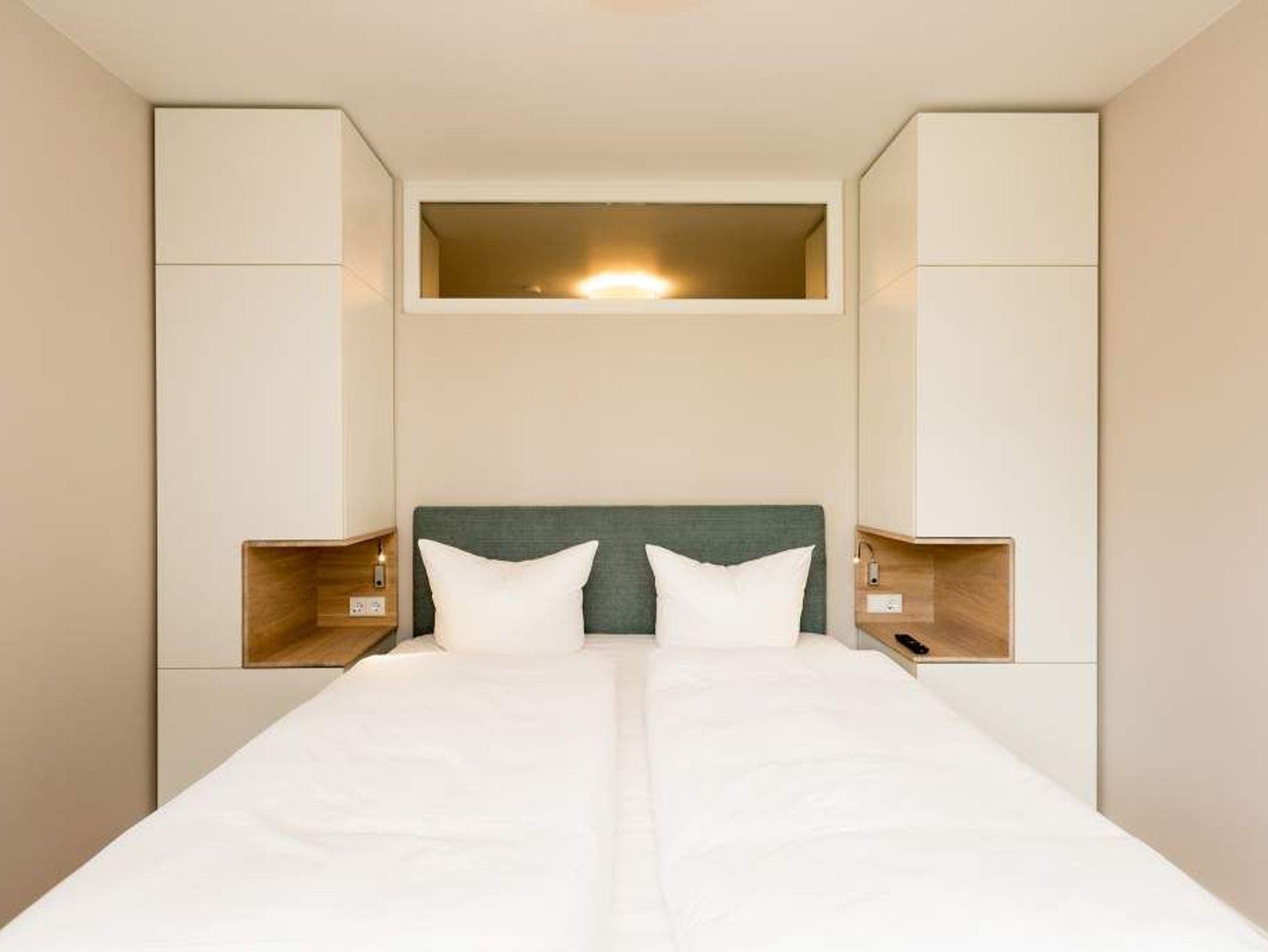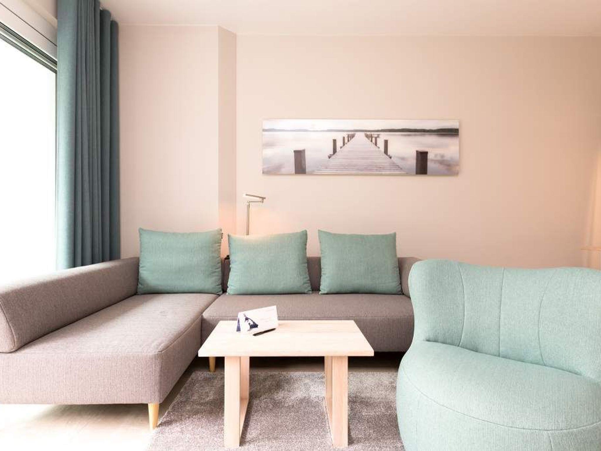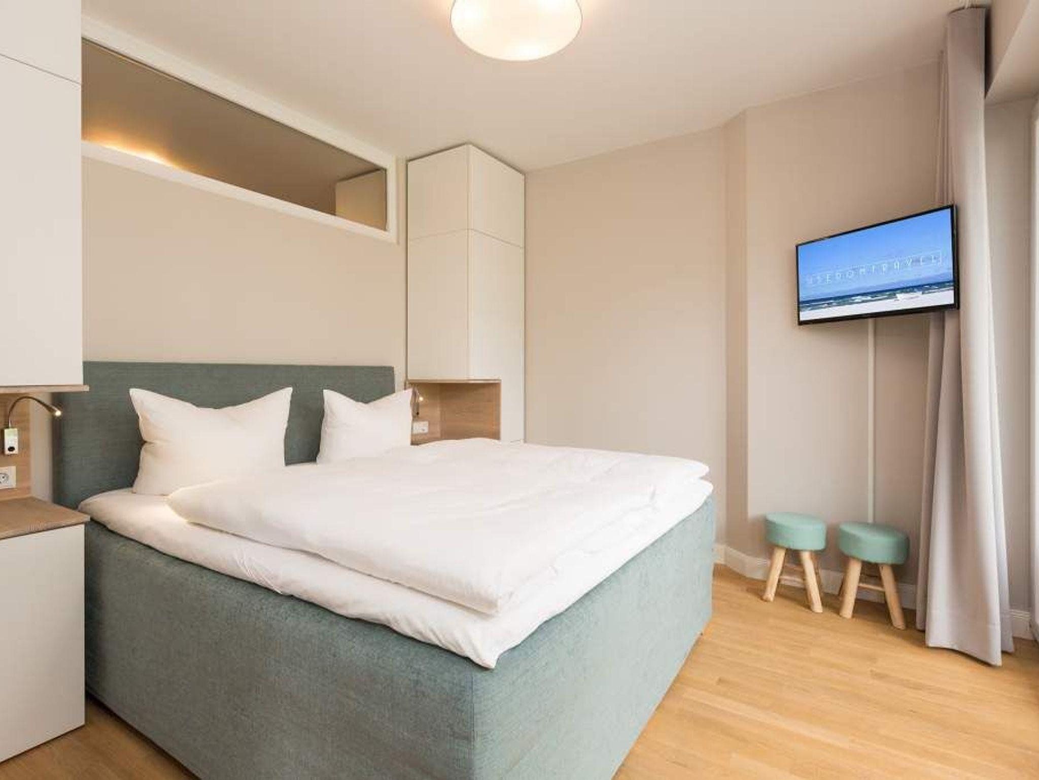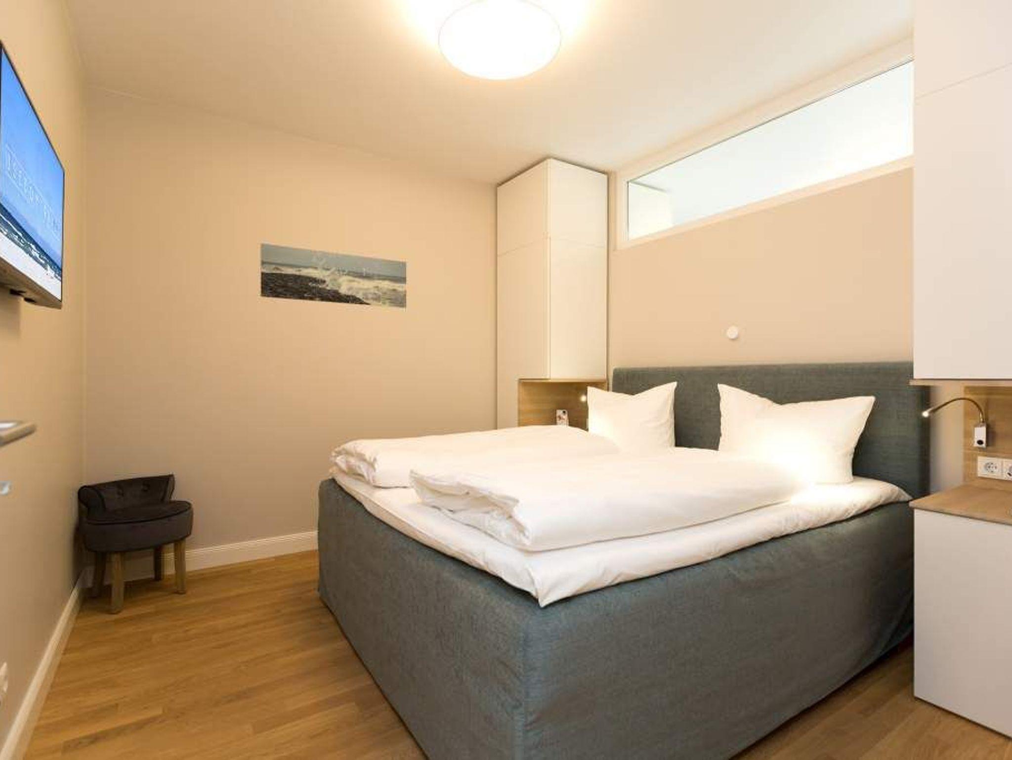 Ein Ferien-Appartement der Extraklasse erwartet sie im Erdgeschoss der Villa Strandgrün. Drei Räume ? außergewöhnlich, stylisch und absolut hochwertig eingerichtet ? machen Ihren Ostseeurlaub zu einem besonderen Erlebnis. Das knapp 68 Quadratmeter große Appartement ist für 4 Personen und 1 Kleinkind (bis zu 3 Jahre) im Kinderreisebett zusätzlich untergebracht werden. Helle und harmonisch aufeinander abgestimmte Farben verleihen der Wohnung in Kombination mit der Betonoptik der Bodenfliesen und den skandinavischen Designmöbeln ein modernes und exklusives Flair. Eine offene Wohnküche sorgt für eine kommunikative Atmosphäre. Der Wohnbereich besticht durch den Echtholztisch mit den Retro-Schalenstühlen aus Acryl. Entspannen Sie auf der chilligen Wohnlandschaft beim Blick auf den Echtholzkamin oder den 40 Zoll Flat-TV. Vom Wohnzimmer aus gelangt man auf die 30 Quadratmeter große Sonnenterrasse mit Süd-West-Ausrichtung. Zwei Schlafzimmer mit Boxspringdoppelbetten (1,80 m x 2,00 m), hochwertigen Einbauschränken und Flat-TV bieten komfortable Rückzugsmöglichkeiten. Die beiden Schlafzimmer sind über ein feststehendes Oberlicht-Fenster miteinander verbunden. Ein Schlafzimmer verfügt zusätzlich über einen direkten Zugang zur Terrasse. Das zweite Schlafzimmer hat kein zu öffnendes Fenster; die Lüftung erfolgt ausschließlich über die Tür zum Wohnbereich. Im geräumigen Wellnessbad befindet sich eine Panorama-Sauna, eine Tropendusche und ein Doppelwaschtisch. Die Ferienwohnung verfügt zusätzlich über ein Gäste-WC. In der Tiefgarage sind für Sie zwei Pkw-Stellplätze reserviert. Für Ihren Komfort sind die Betten bereits bezogen und Handtücher liegen bereit. Von Mai bis Anfang Oktober (je nach Wetterlage) kann der wohnungseigene Strandkorb am Strand genutzt werden.