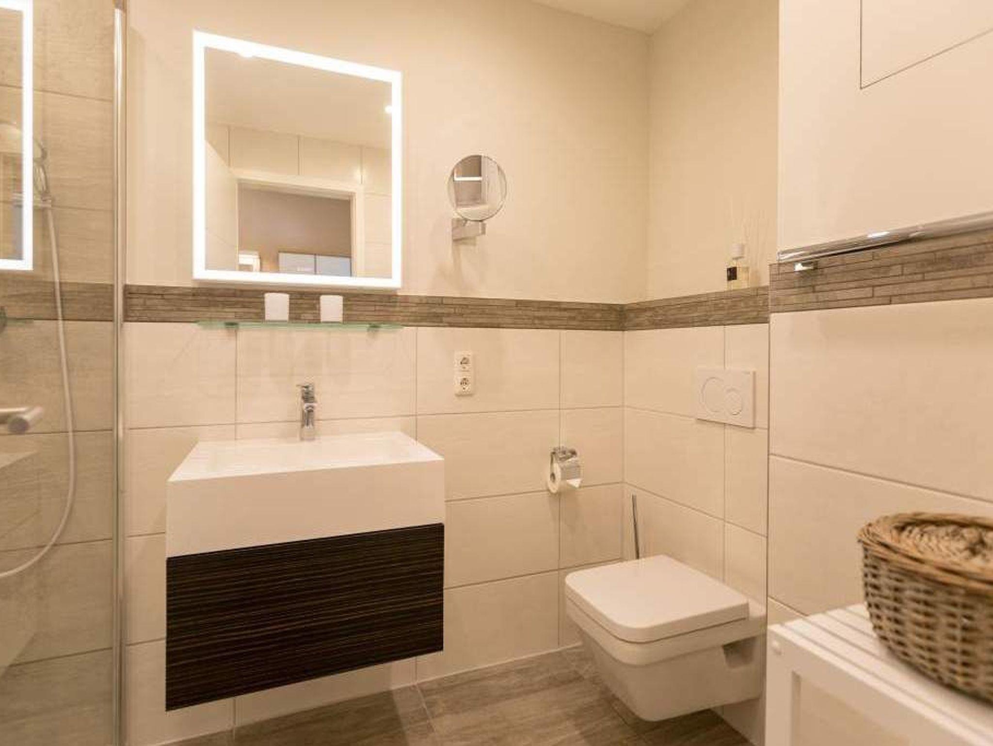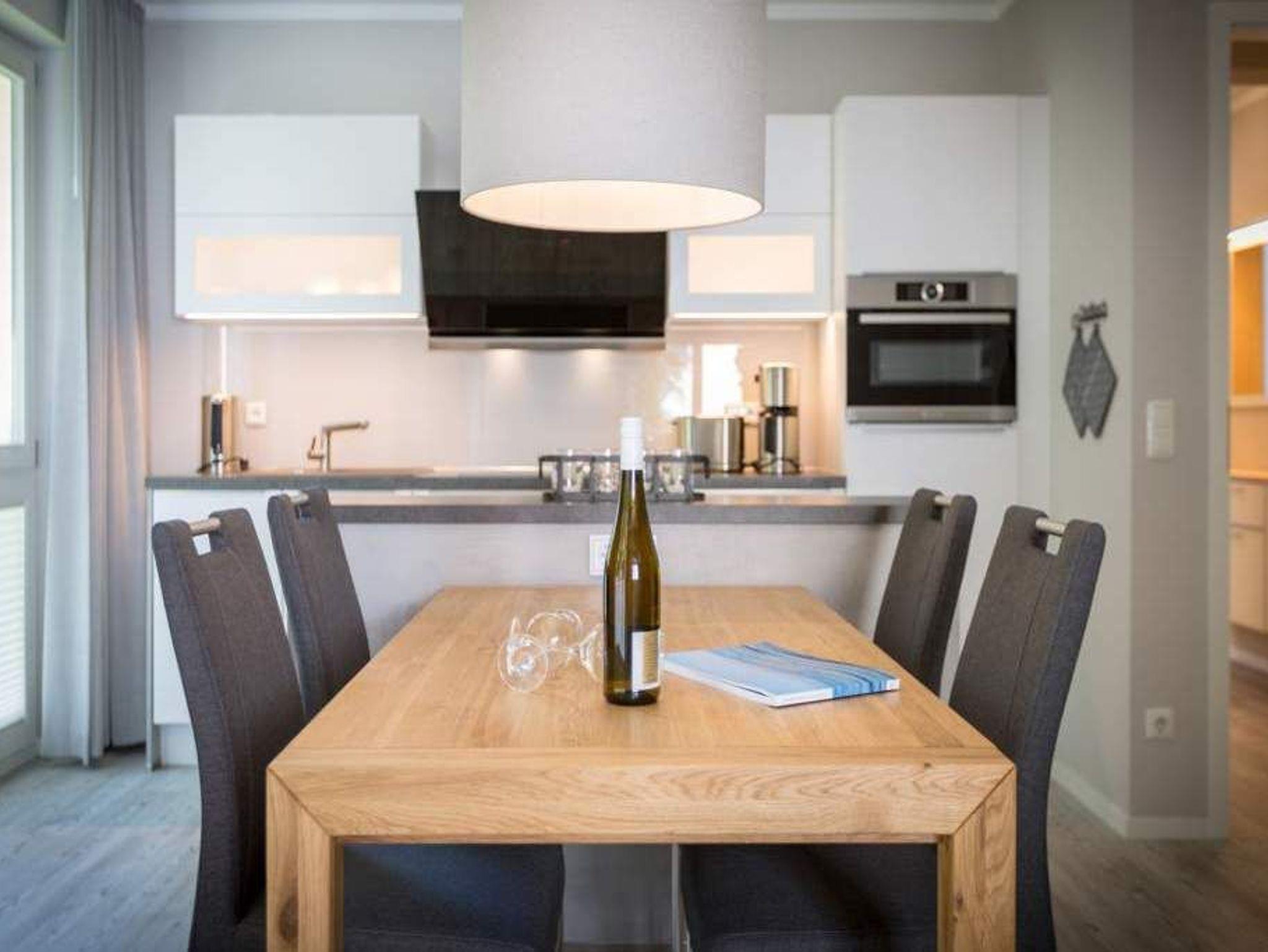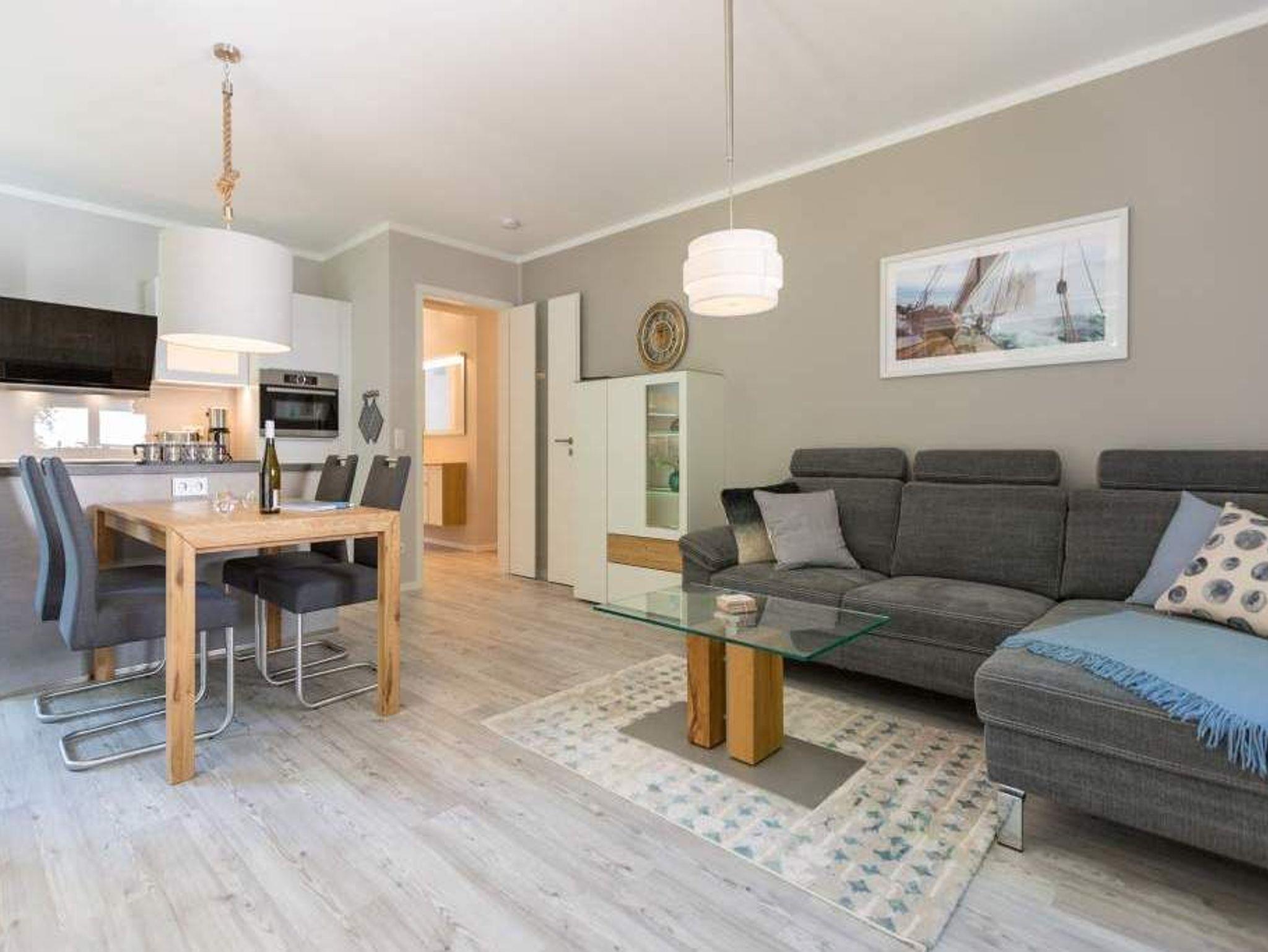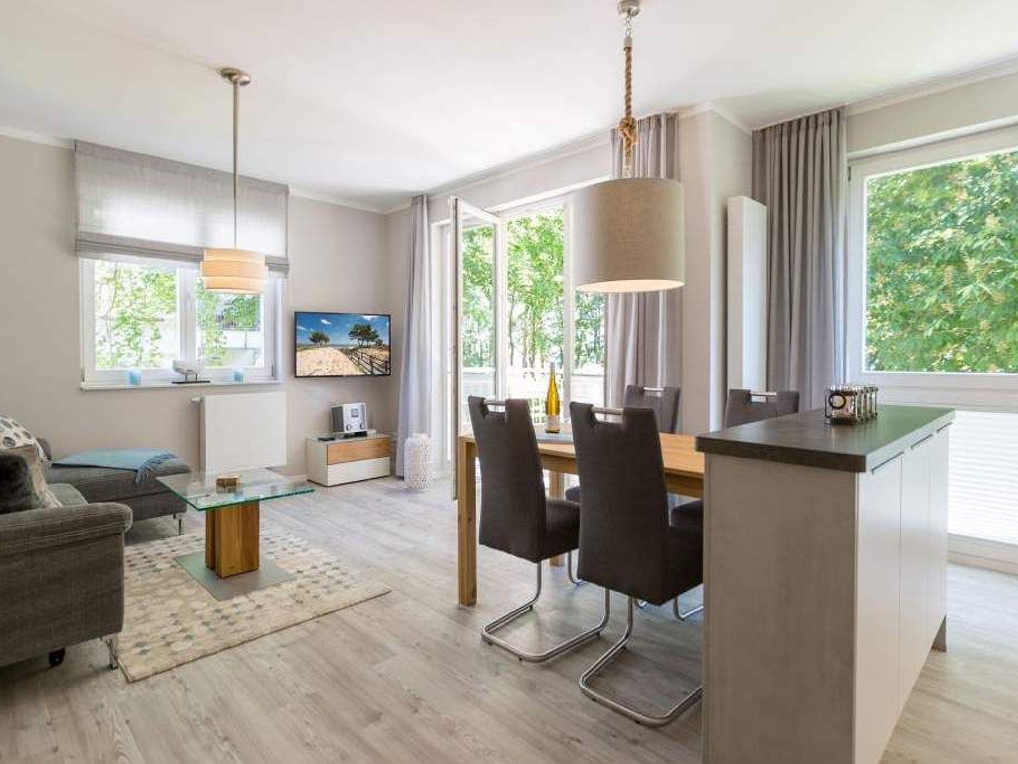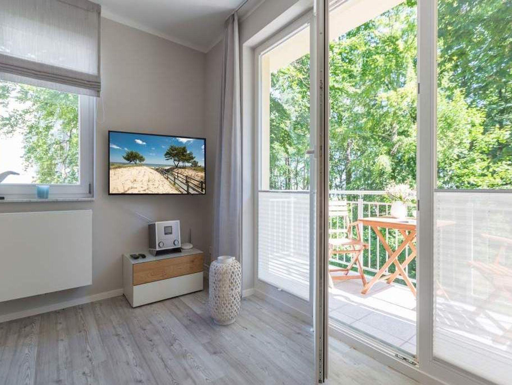 Durch das satte Grün der Bäume schimmert glitzernd blau die Ostsee hindurch. Morgens bei Sonnenschein auf dem Balkon zu sitzen, den Vögeln und dem Meeresrauschen zu lauschen, ist ein perfekter Start in den Urlaubstag. Ob allein oder zweit in diesem exklusiven und modernen Ferienappartement wird Ihre Erholung zum entspannten Genuss. Denn viel Platz, Leichtigkeit und Stil prägen die schick eingerichtete, 66 Quadratmeter große Wohnung. Hier gibt es nicht nur ein Highlight, das Ihre Ostseeauszeit zu etwas ganz Besonderem macht. Neben den beiden Balkonen vom Wohnzimmer aus und vom Schlafzimmer aus begehbar erwartet Sie hier eine kleine Wohlfühloase, die das ganze Jahr über ihre Reize hat. Gerade auch im Winter bietet dieses Urlaubsdomizil die Möglichkeit zur Entspannung. Wenn die Bäume kahl und starr vom kalten Nordost klirren und den Blick auf die schier endlose, in manchen Jahren sogar zugefrorene Ostsee frei geben, können Sie sich diese Landschaft aus dem Wohn- und dem Schlafzimmer, aber auch aus der kuschelig warmen Panorama-Sauna heraus anschauen. Denn auch die mit einem LED-Farblichtsystem versehene Sauna ( für finnischen Saunabetrieb und BIO-Betrieb mit Verdampfer) gehört zu der Wohnung Nummer 7 im 2. Obergeschoss der Villa Barbara dazu. Die unterschiedlichen Lichtstimmungen sorgen zusätzlich für Entspannung pur. Ruhe und Erholung finden Sie zudem in dem geräumigen Wohn-Esszimmer. Eine gemütliche Sofalandschaft lädt zum Relaxen vor dem großen Flat-TV ein. Eine Media-Anlage offeriert Internet Radio und Bluetooth Streaming. Das WLAN ist kostenfrei. Die offene Küche ist mit hochwertigen Geräten und Geschirr voll ausgestattet. Essen können Sie am schönen Echtholztisch. Die große, bodentiefe Fensterfront lässt viel Licht hinein. Echtes Schlafvergnügen gewährleistet im ebenso schönen Schlafzimmer ein komfortables Boxspringdoppelbett (1,60 m x 2,00 m). Viel Ablage bietet der große Kleiderschrank. Auch in diesem Zimmer befindet sich ein Flat-TV. Von hier aus haben Sie Zugang zu einem zweiten Balkon. Genießen Sie hier auf den Sonnenliegen den Sommer. Im Badezimmer steht Ihnen neben dem Zugang zur Sauna eine ebenerdige und sehr geräumige Regendusche, ein Waschtisch und ein WC zur Verfügung. Bei Ihrer Anreise liegen die Handtücher für Sie bereit und das Bett ist bezogen. Ein Pkw-Stellplatz befindet sich am Haus. Für den Tag am Strand steht Ihnen in den Sommermonaten ein Strandkorb (je nach Witterung) zur Verfügung.