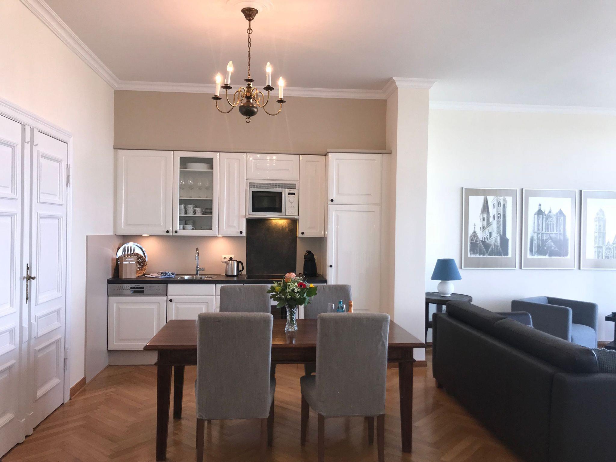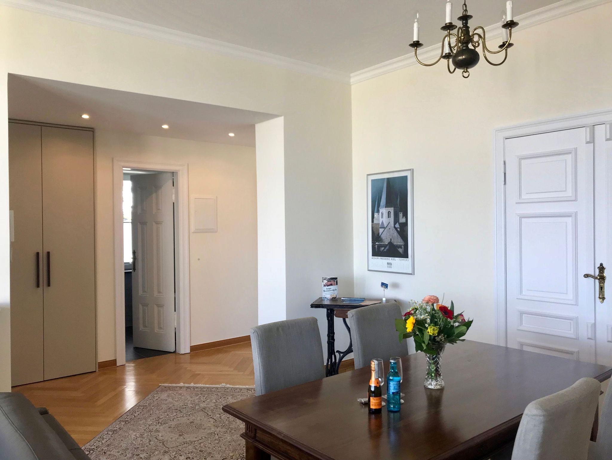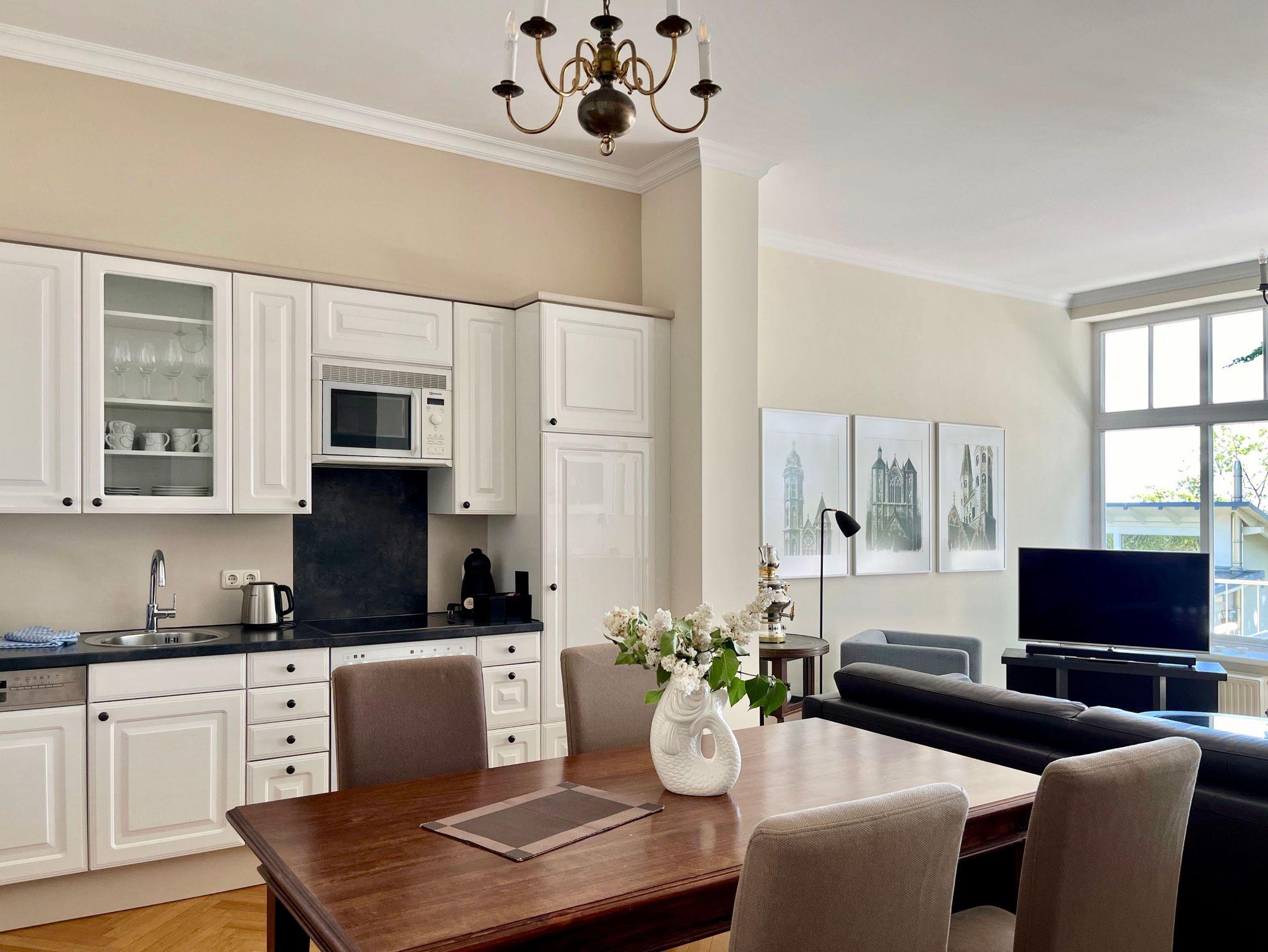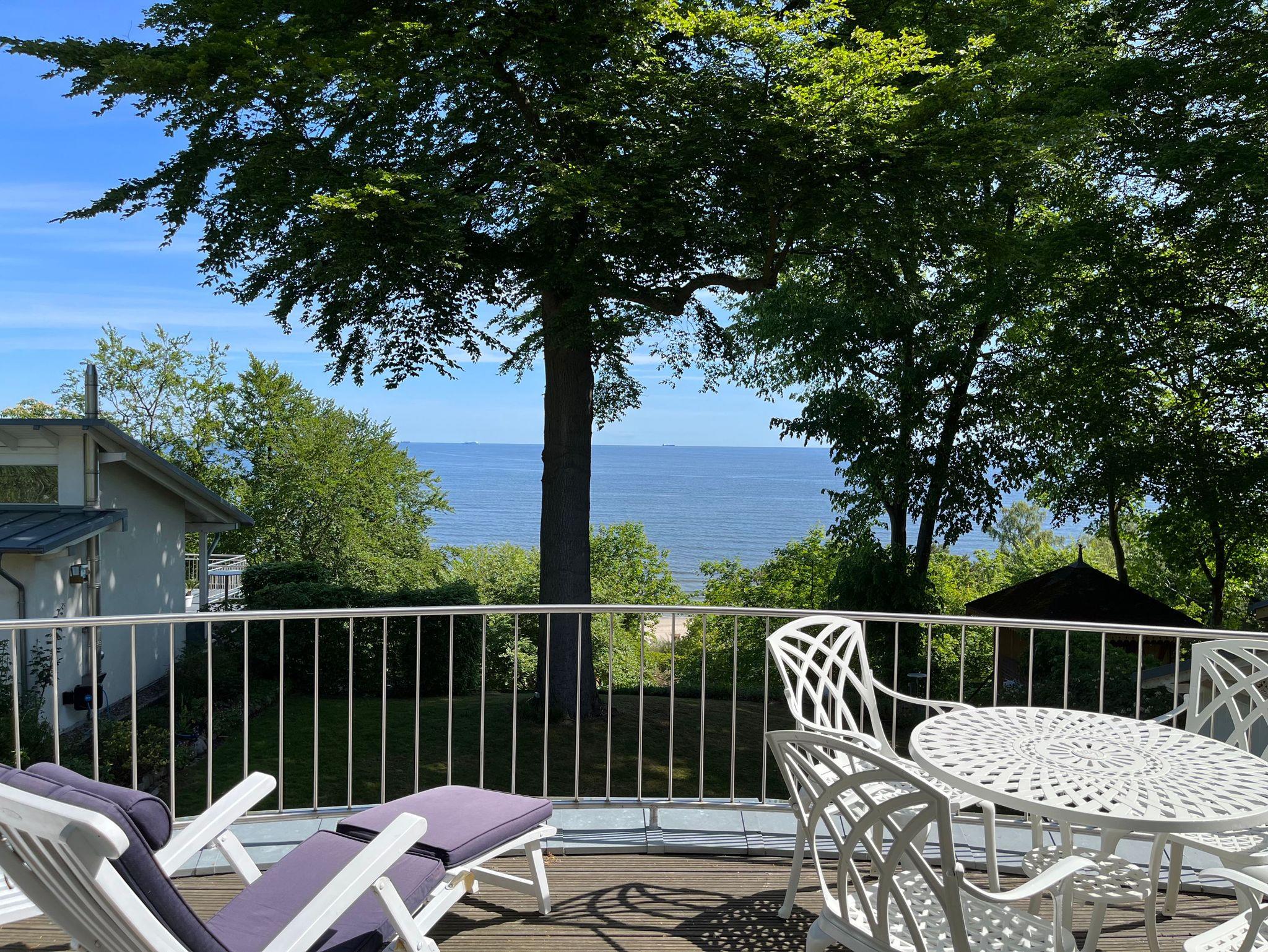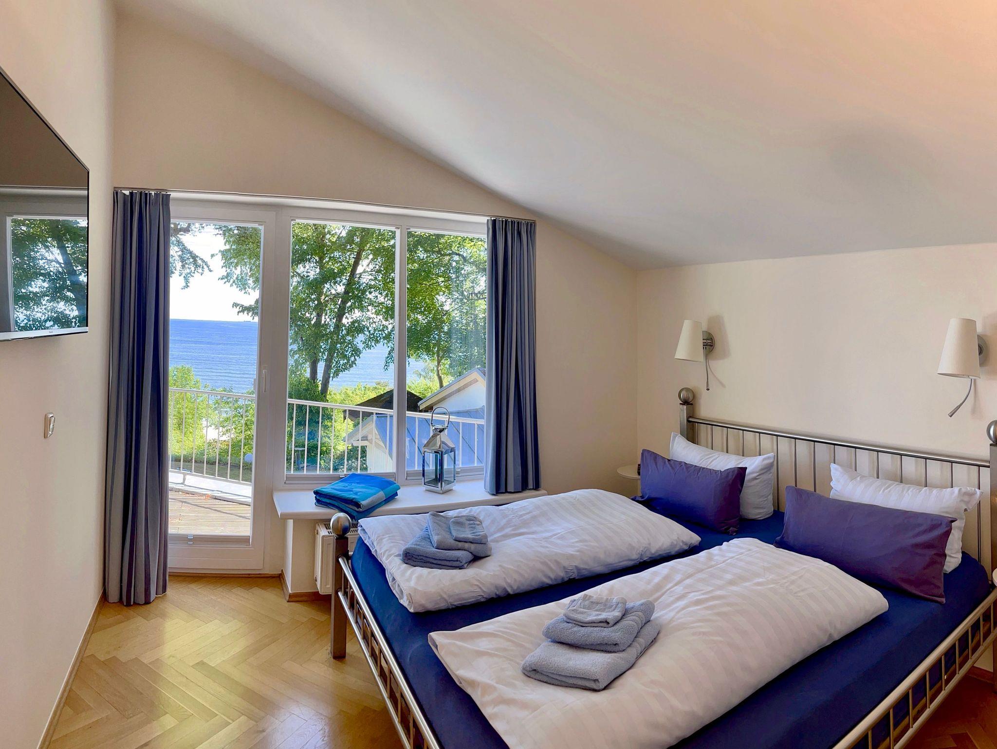 Komfortable Ferienwohnung mit Meerblick aus dem Wohn- und Schlafzimmer. Von der großzügigen Terrasse mit Liegestühlen und Essplatz genießen Sie einen herrlichen Blick auf die Ostsee. All unsere Wohnungen sind geschmackvoll und individuell eingerichtet. Das Schlafzimmer ist mit einem manufakturgefertigten Edelstahlbett, Einbauschrank incl. Safe, Flachbild-TV und Verdunklung ausgestattet, die Terrassentür ist mit Insektenschutz versehen. Ausgesuchte Möbelstücke und Bilder des Braunschweiger Künstlers Achim Kiel, Echtholz-Parkett - teils mit hochwertigen Teppichen belegt ? prägen den Stil des Hauses. Als zusätzliche Schlafgelegenheit befindet sich im Wohnbereich eine komfortable ausklappbare Ledercouch. Zur Ausstattung gehört ein Smart-TV mit Soundbar - zur einfachen Verbindung mit Ihrem Smartphone, iPad oder anderen bluetoothfähigen Geräten - sowie ein DVD-Player. In den Wohn-/Essbereich integriert ist ein Tisch für vier Personen und eine komplett ausgestattete Küchenzeile (Kühlschrank mit Gefrierfach, Backofen, Cerankochfeld, Dunstabzug, Mikrowelle, Toaster, Wasserkocher, Filter-Kaffeemaschine u. Nespresso-Kapselmaschine, Rührgerät etc.). Das Badezimmer ist ein Tageslicht-Bad mit Dusche.