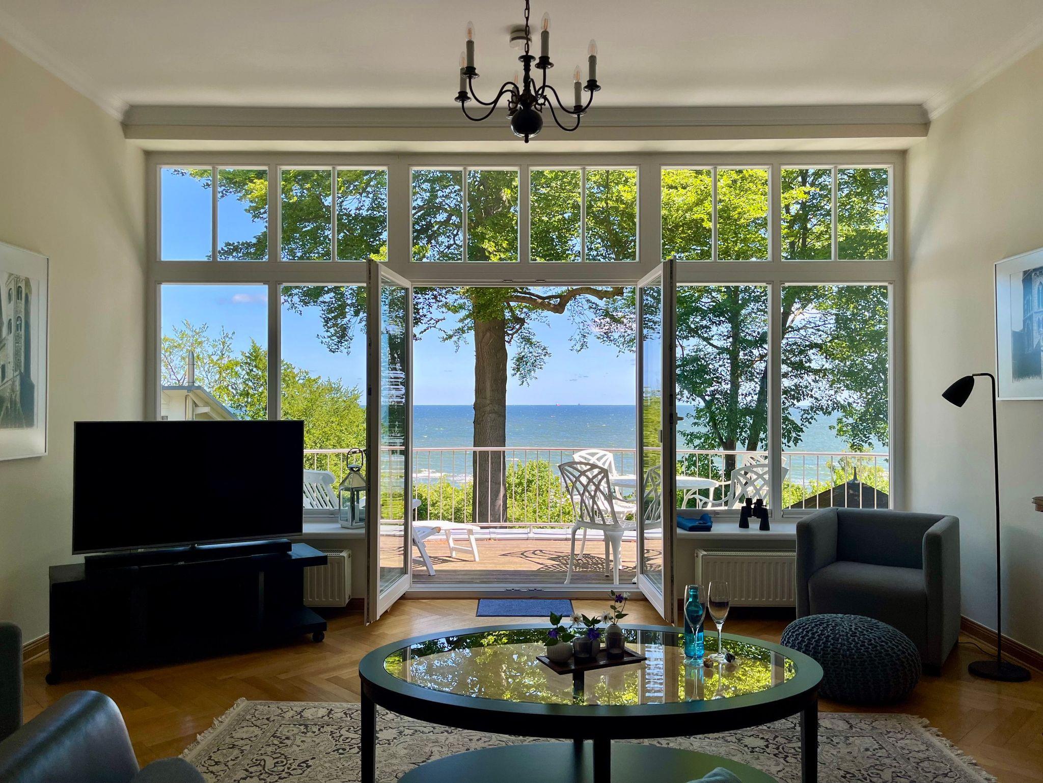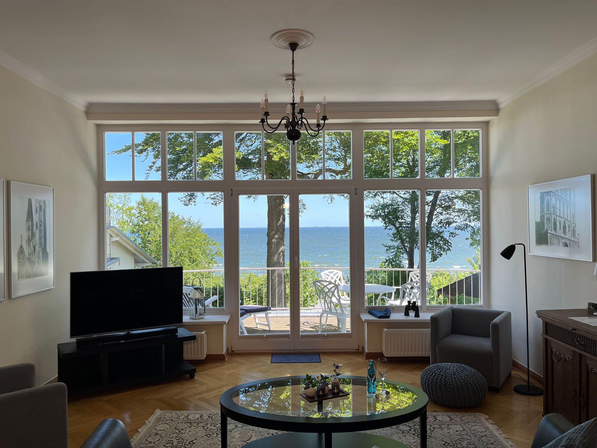 Diese ca. 65 qm große Wohnung ist ein wahrer Logenplatz am Meer. Durch die großen Fensterfassaden ist die Ostsee immer präsent. Dieser Blick auf die Ostsee ist zu jeder Jahreszeit beeindruckend. Im Sommer das satte Grün der Bäume und das herrliche Blau des Meeres, mit Schiffen am Horizont, mit Möwengeschrei und dem vom Strand herauf wehenden Lachen der Badenden. Und bei all dem ist man ganz für sich und kann erholsam die Seele baumeln lassen.