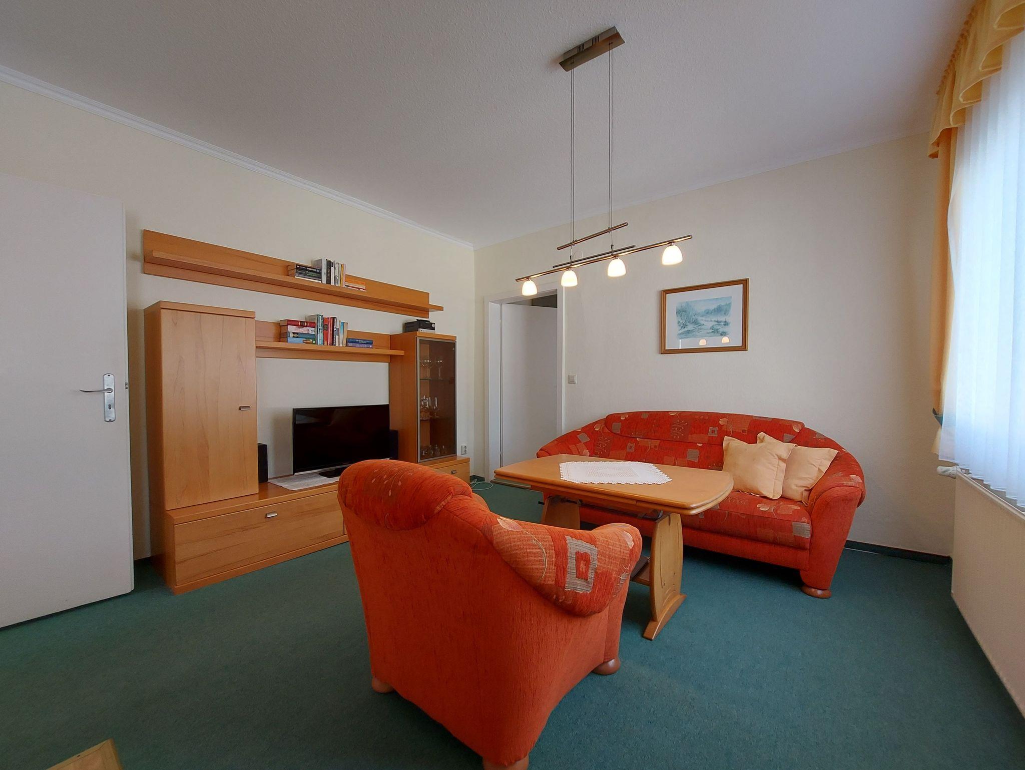 Die Ferienwohnung 2 befindet sich im Erdgeschoss des Hauses im Anbau. Die Wohnung ist jedoch nicht stufenlos erreichbar. Sie teilt sich auf in ein Wohnzimmer mit offener Pantry-Küche und Sitzbereich. Im Wohnzimmer befindet sich eine gemütliche Couch, ein Sessel und ein Flachbildfernseher. Der Sitzbereich dient auch als Essbereich mit einem höhenverstellbaren Tisch. Die Pantry-Küche ist ausgestattet mit 2-Platten-Herd, Kühlschrank mit Gefriermöglichkeit, Mikrowelle, Kaffeemaschine, Wasserkocher und Toaster.