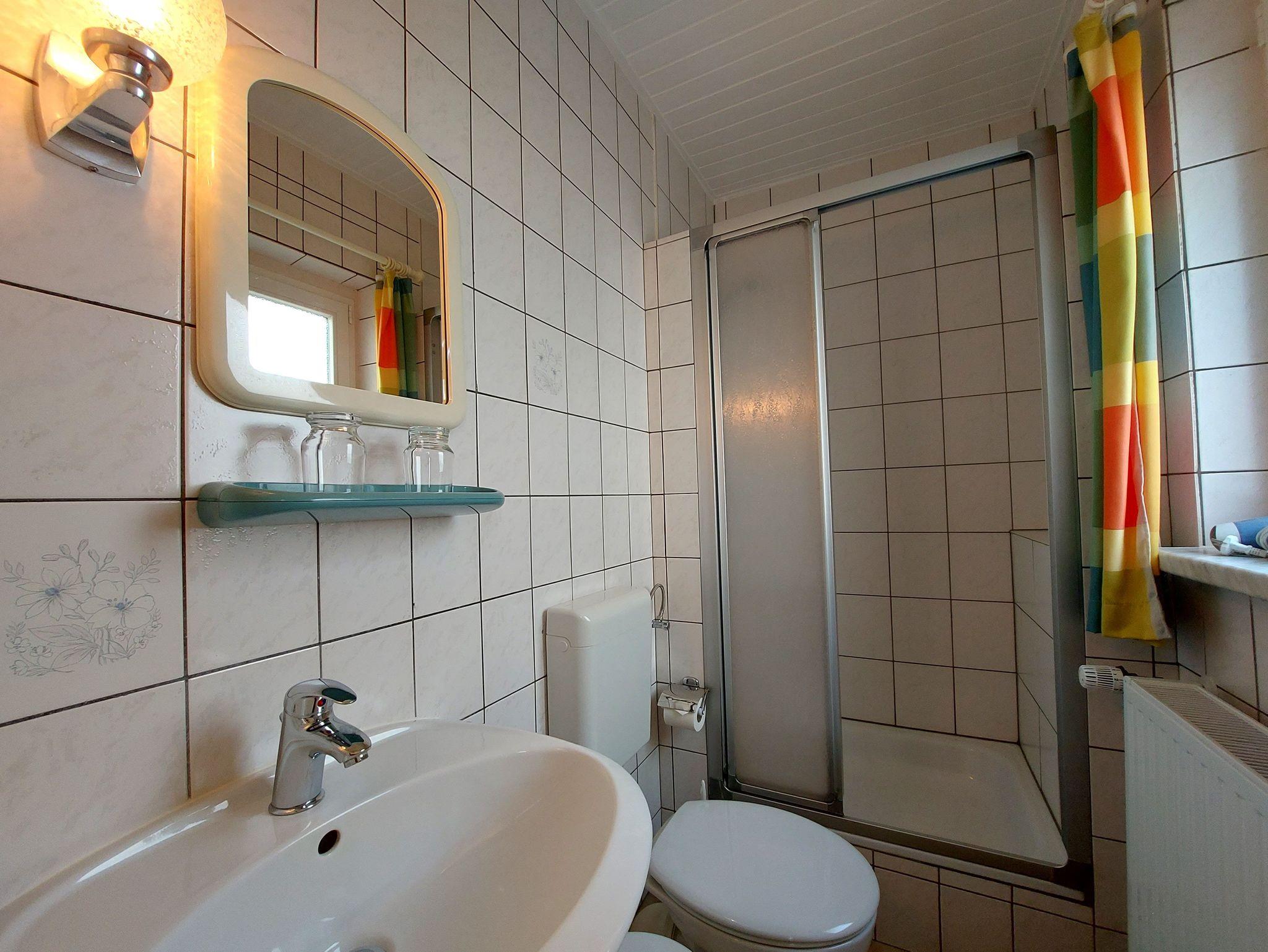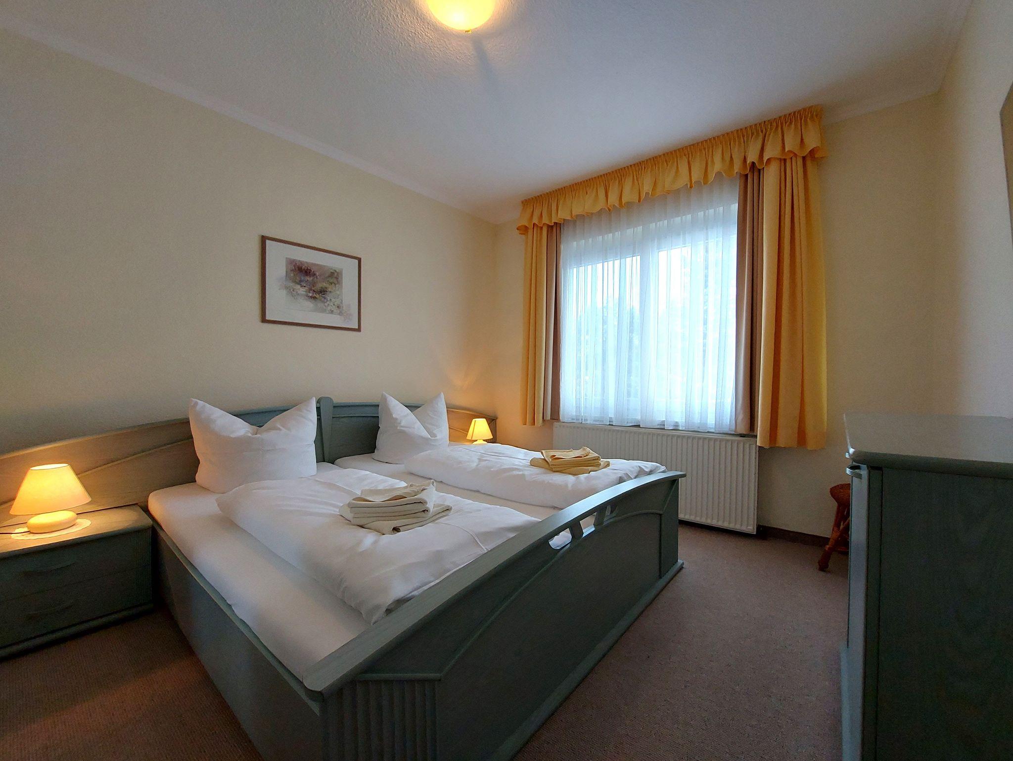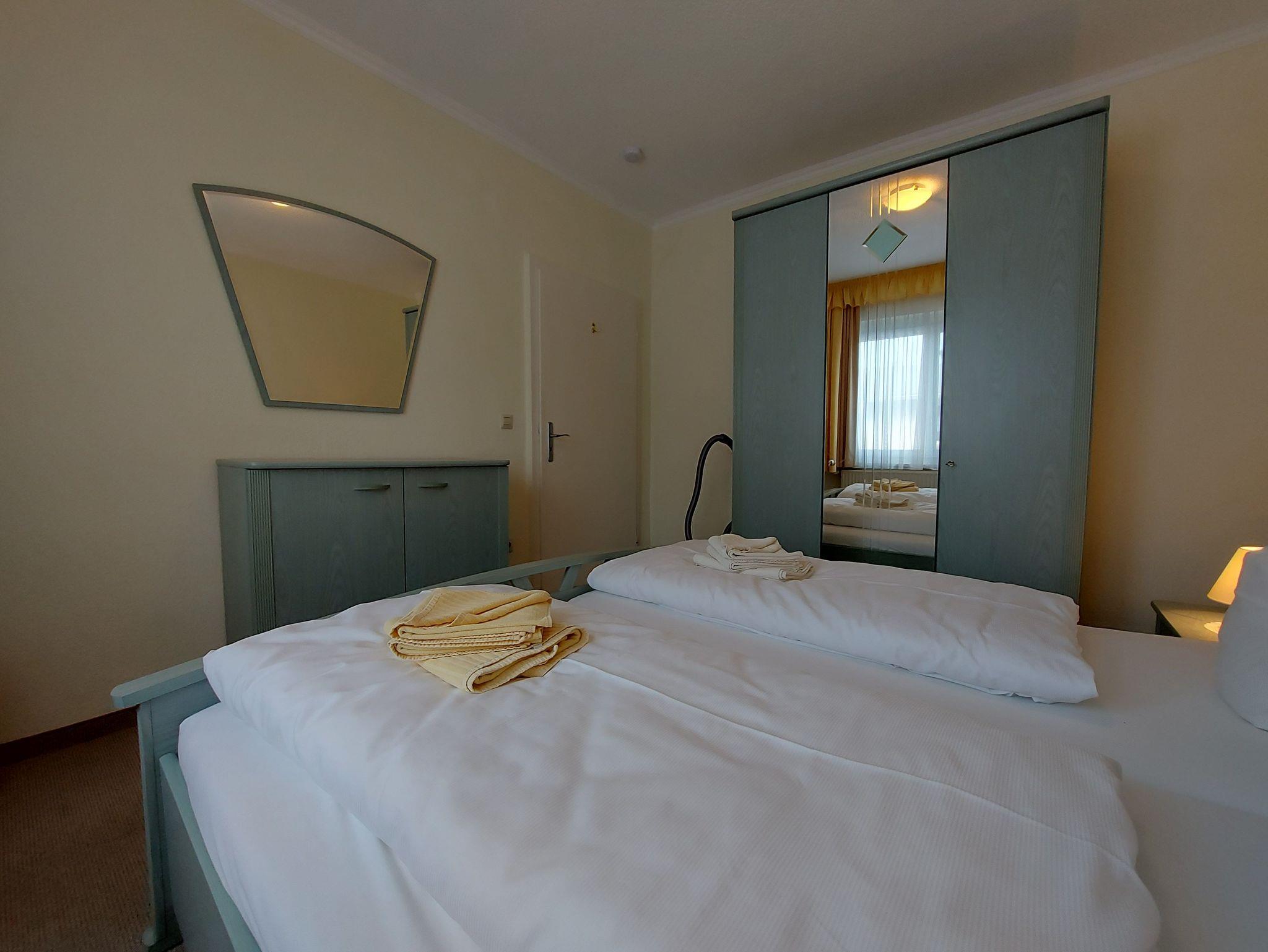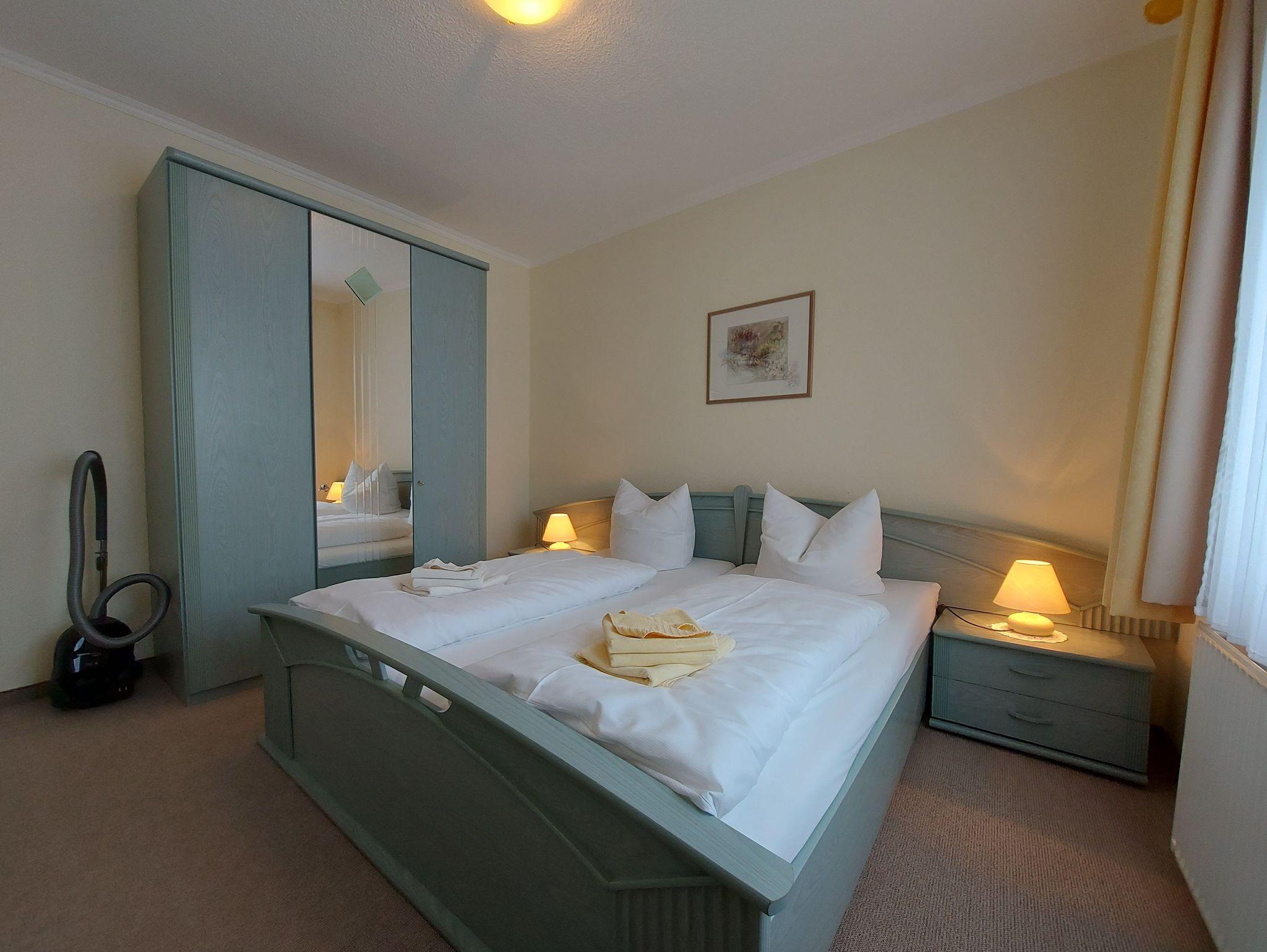 Das separate Schlafzimmer ist mit einem gemütlichen Doppelbett, Kleiderschrank und Kommode ausgestattet. Das Badezimmer verfügt über eine Dusche.