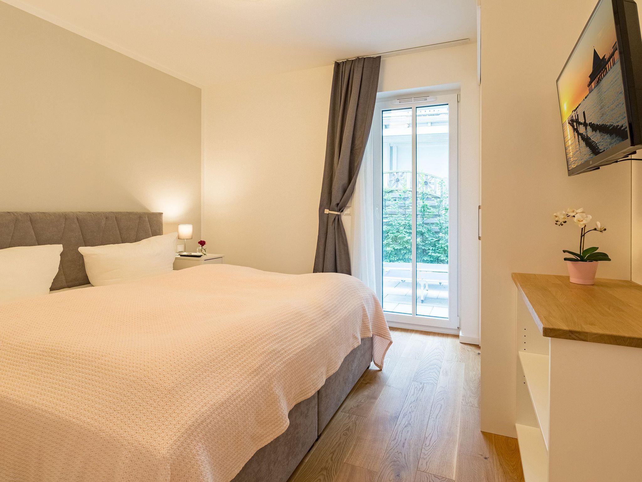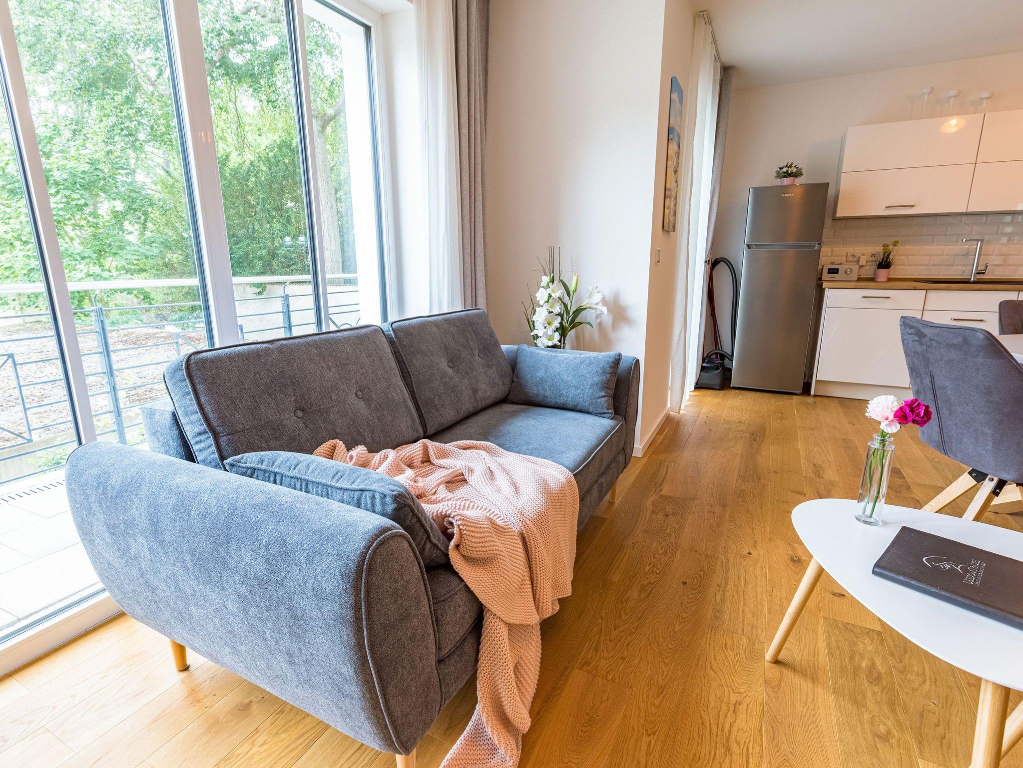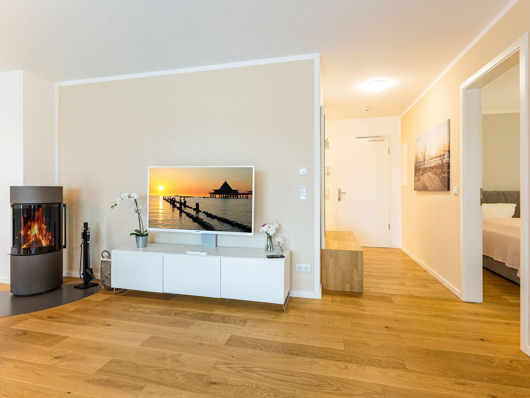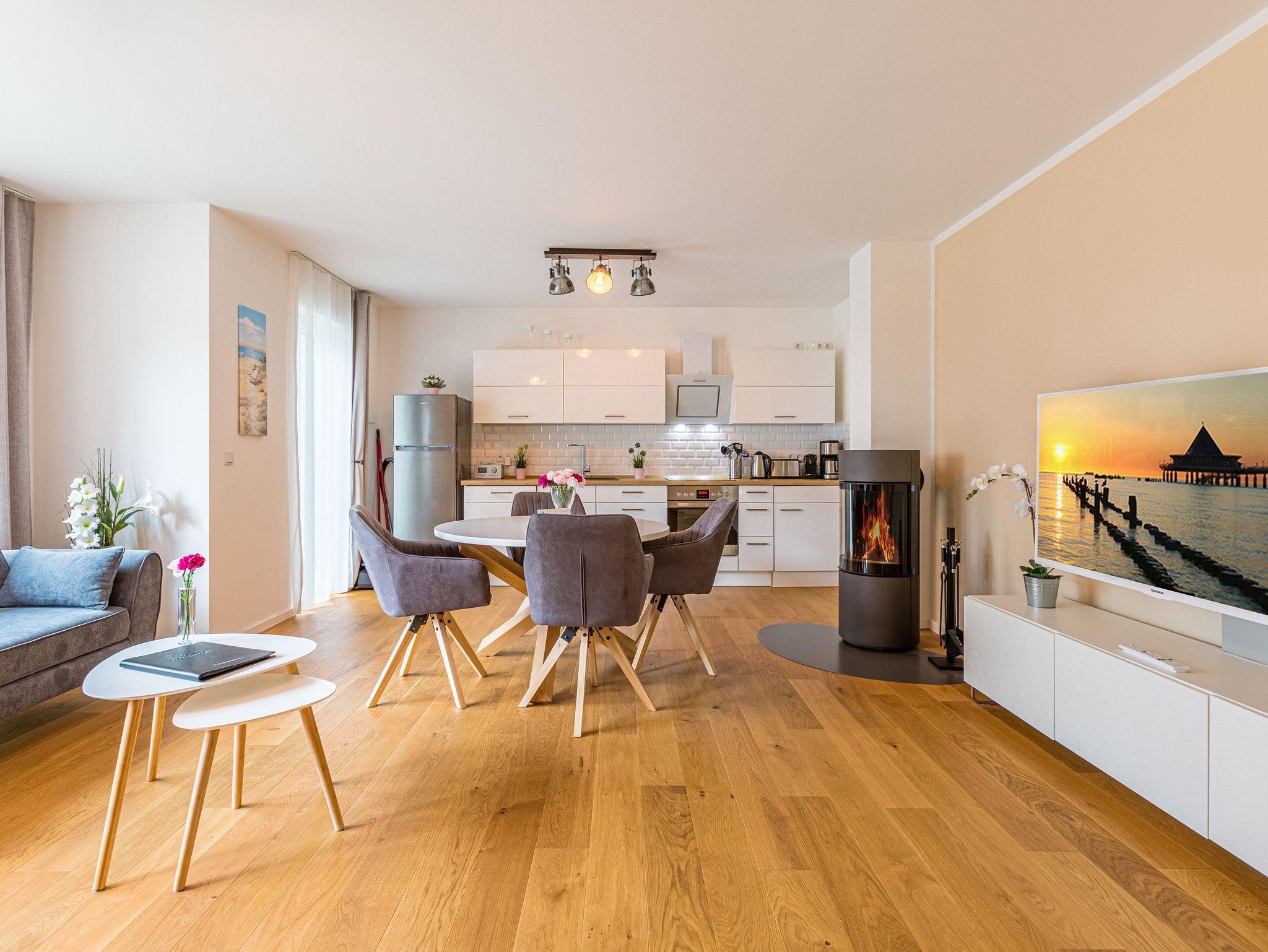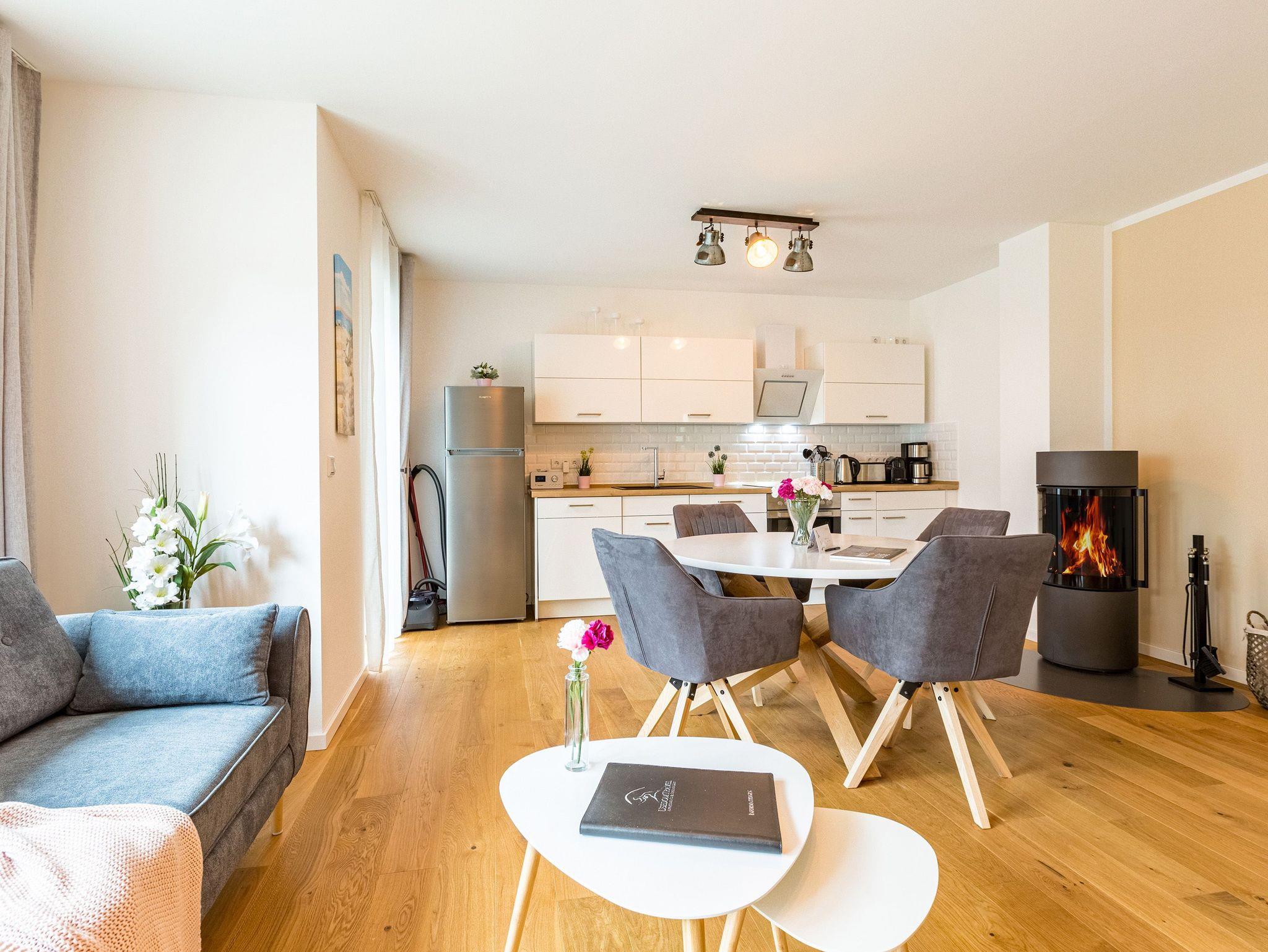Großzügig, licht und elegant ist dieser Drei-Zimmer-Ferientraum im Erdgeschoss. Das Appartement 1 bietet auf seinen 83 Quadratmetern viel Platz für vier Personen und ein Kleinkind bis zwei Jahre (im Kinderreisebett). Die Einrichtung ist modern, stylisch und ausgewählt. Helle, lichtdurchflutete Räume sorgen für eine harmonische Atmosphäre, in der sich jeder Moment leicht anfühlt. Geben Sie Ihrer Seele und Ihrem Körper einmal wieder Raum und tanken Sie neue Energie auf den komfortablen Nordic Design-Sofas in maritimem Blau, beim Entspannen vor dem großen Flat-TV, einem gemeinsamen Essen in den bequemen Sesseln am schönen Esstisch, beim Blick auf das Flammenspiel des Kamins oder draußen in der Sonne auf einer der beiden Terrassen (5 Quadratmeter und 6 Quadratmeter groß). Die offene Küche ist mit hochwertigen Geräten voll ausgestattet. Im amerikanischen Kühlschrank lässt sich so manche Leckerei unterbringen. Platzprobleme brauchen sie hier wie im gesamten Appartement nicht zu fürchten. Passend zum eleganten Interieur finden Sie in den Küchenschränken stilvolles Geschirr. Hier stimmt einfach alles. Auch in den beiden Schlafzimmern. Schlafvergnügen der Extra-Klasse versprechen die großen Boxspringdoppelbetten (1,80 m x 2,00 m). Flat-TV und ein geräumiger Einbauschrank fehlen natürlich in keinem der beiden Zimmer. Der Wohn- und Schlafbereich ist mit Parkettboden ausgestattet. Für eine entspannte Auszeit stehen zwei Bäder zur Verfügung. Beide haben eine Dusche, ein Waschbecken und ein WC. Eine Waschmaschine gibt es auch. Das Masterbad hält zudem noch ein ganz besonderes Highlight für Sie bereit: eine Finnische Sauna. Graue und triste Tage an der Ostsee gehören damit der Vergangenheit an. Denn was gibt es schöneres, als sich nach einem langen Strandspaziergang im Winter in die wohlige Wärme einer Sauna zu kuscheln. Handtücher liegen bereit und die Betten sind bei Anreise bezogen. Für den Tag am Meer steht Ihnen als besonderes Bonbon von Mitte Mai bis Ende September (je nach Witterung) ein Strandkorb am Strand kostenlos zur Verfügung. Sie brauchen also nur noch Ihr Auto in der Tiefgarage abstellen und loslassen.