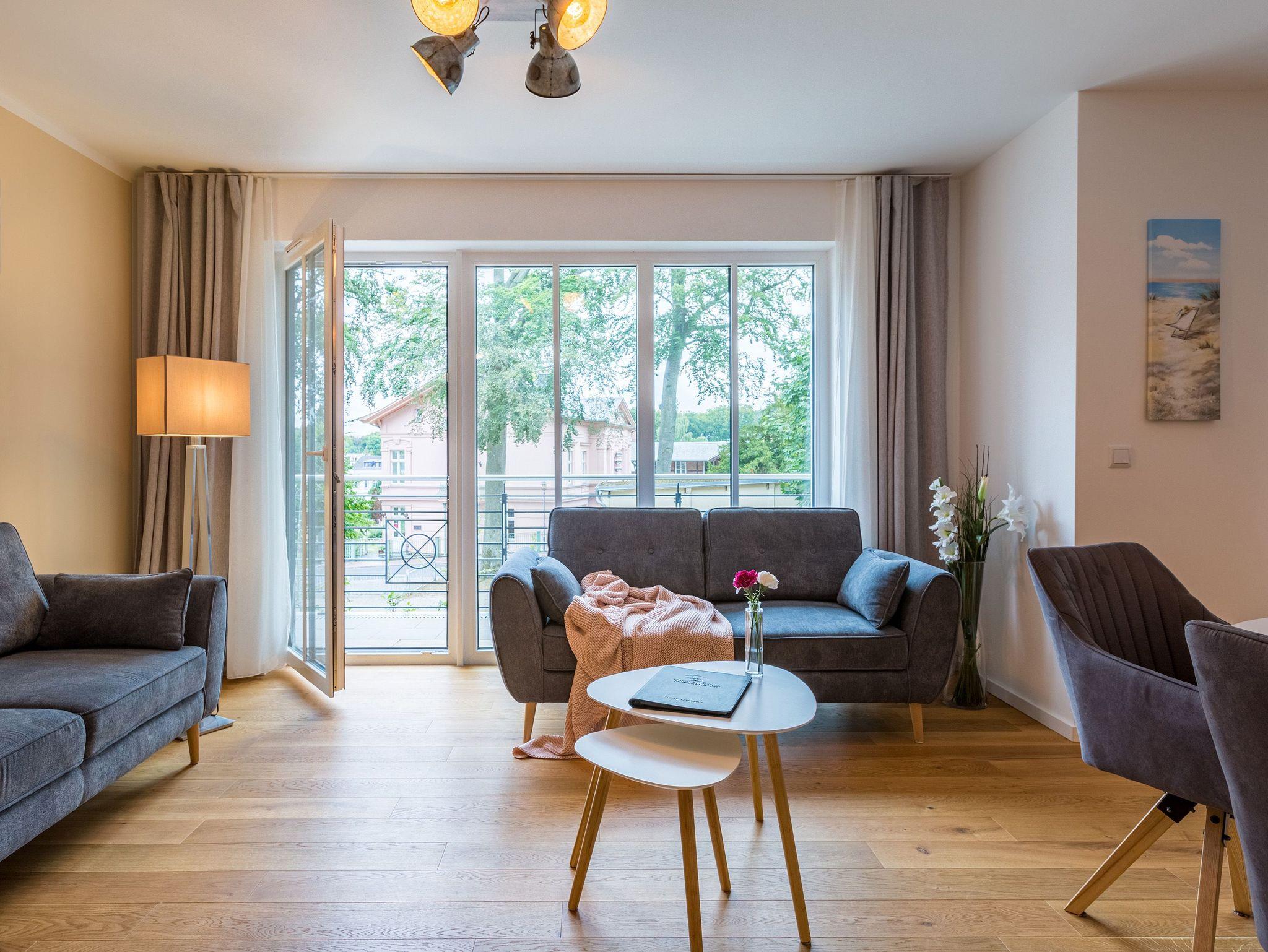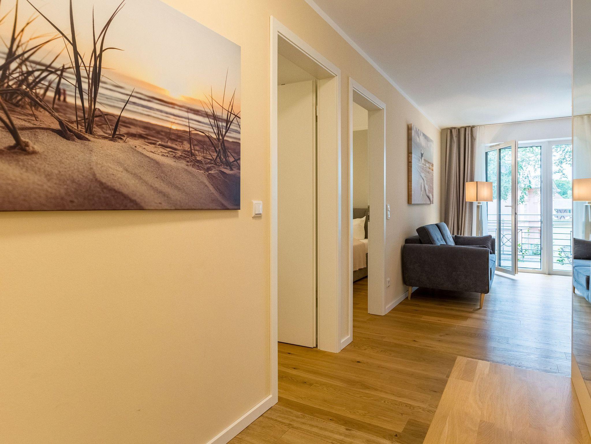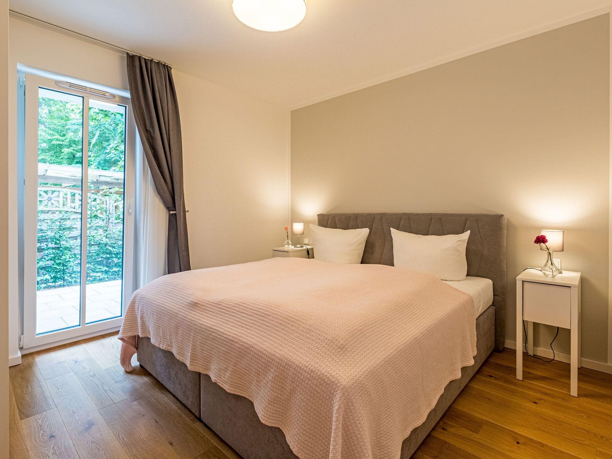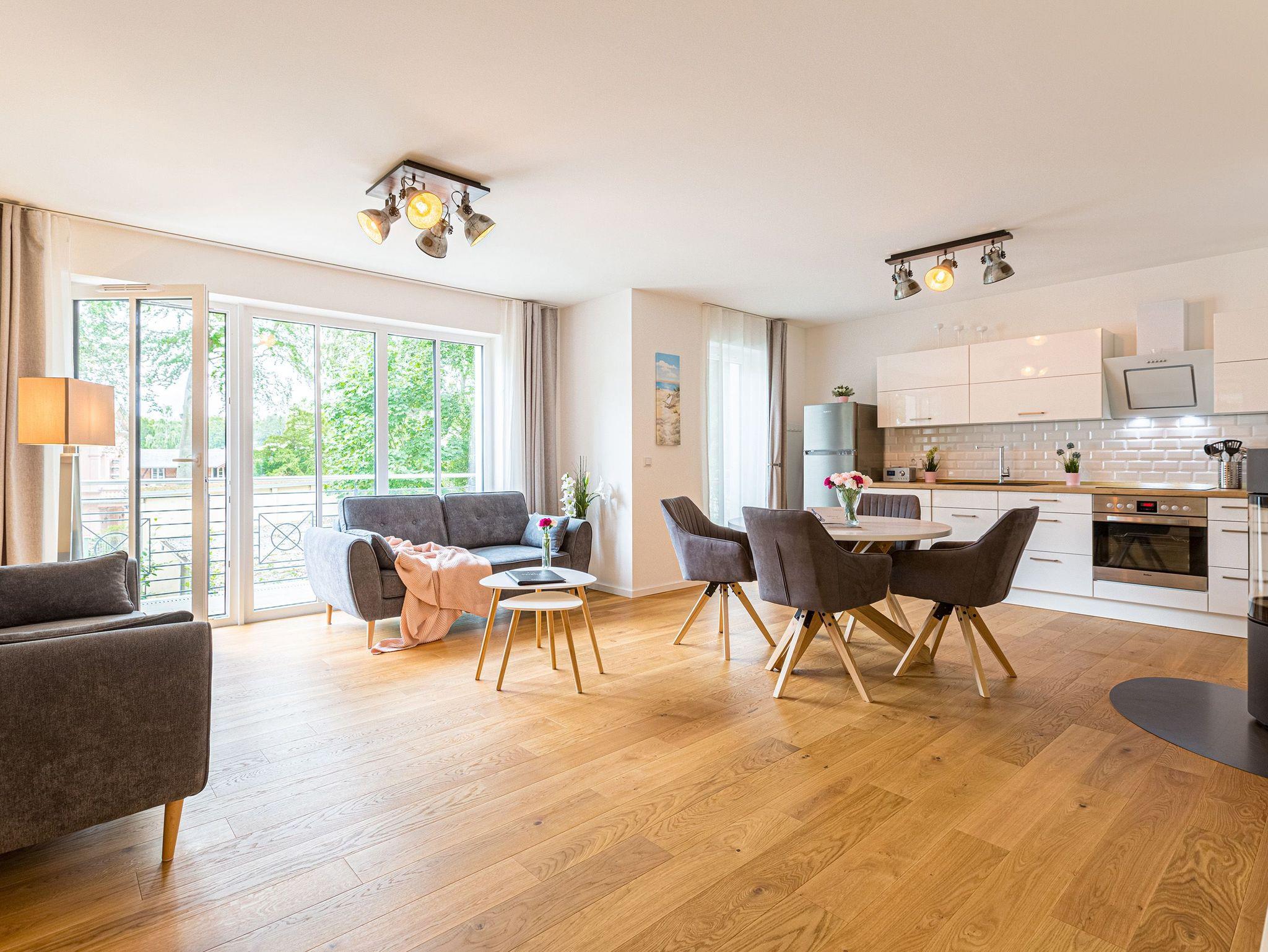 Großzügig, licht und elegant ist dieser Drei-Zimmer-Ferientraum im Erdgeschoss. Das Appartement 1 bietet auf seinen 83 Quadratmetern viel Platz für vier Personen und ein Kleinkind bis zwei Jahre (im Kinderreisebett). Die Einrichtung ist modern, stylisch und ausgewählt. Helle, lichtdurchflutete Räume sorgen für eine harmonische Atmosphäre, in der sich jeder Moment leicht anfühlt. Geben Sie Ihrer Seele und Ihrem Körper einmal wieder Raum und tanken Sie neue Energie auf den komfortablen Nordic Design-Sofas in maritimem Blau, beim Entspannen vor dem großen Flat-TV, einem gemeinsamen Essen in den bequemen Sesseln am schönen Esstisch, beim Blick auf das Flammenspiel des Kamins oder draußen in der Sonne auf einer der beiden Terrassen (5 Quadratmeter und 6 Quadratmeter groß). Die offene Küche ist mit hochwertigen Geräten voll ausgestattet. Im amerikanischen Kühlschrank lässt sich so manche Leckerei unterbringen. Platzprobleme brauchen sie hier wie im gesamten Appartement nicht zu fürchten. Passend zum eleganten Interieur finden Sie in den Küchenschränken stilvolles Geschirr. Hier stimmt einfach alles. Auch in den beiden Schlafzimmern. Schlafvergnügen der Extra-Klasse versprechen die großen Boxspringdoppelbetten (1,80 m x 2,00 m). Flat-TV und ein geräumiger Einbauschrank fehlen natürlich in keinem der beiden Zimmer. Der Wohn- und Schlafbereich ist mit Parkettboden ausgestattet. Für eine entspannte Auszeit stehen zwei Bäder zur Verfügung. Beide haben eine Dusche, ein Waschbecken und ein WC. Eine Waschmaschine gibt es auch. Das Masterbad hält zudem noch ein ganz besonderes Highlight für Sie bereit: eine Finnische Sauna. Graue und triste Tage an der Ostsee gehören damit der Vergangenheit an. Denn was gibt es schöneres, als sich nach einem langen Strandspaziergang im Winter in die wohlige Wärme einer Sauna zu kuscheln. Handtücher liegen bereit und die Betten sind bei Anreise bezogen. Für den Tag am Meer steht Ihnen als besonderes Bonbon von Mitte Mai bis Ende September (je nach Witterung) ein Strandkorb am Strand kostenlos zur Verfügung. Sie brauchen also nur noch Ihr Auto in der Tiefgarage abstellen und loslassen.