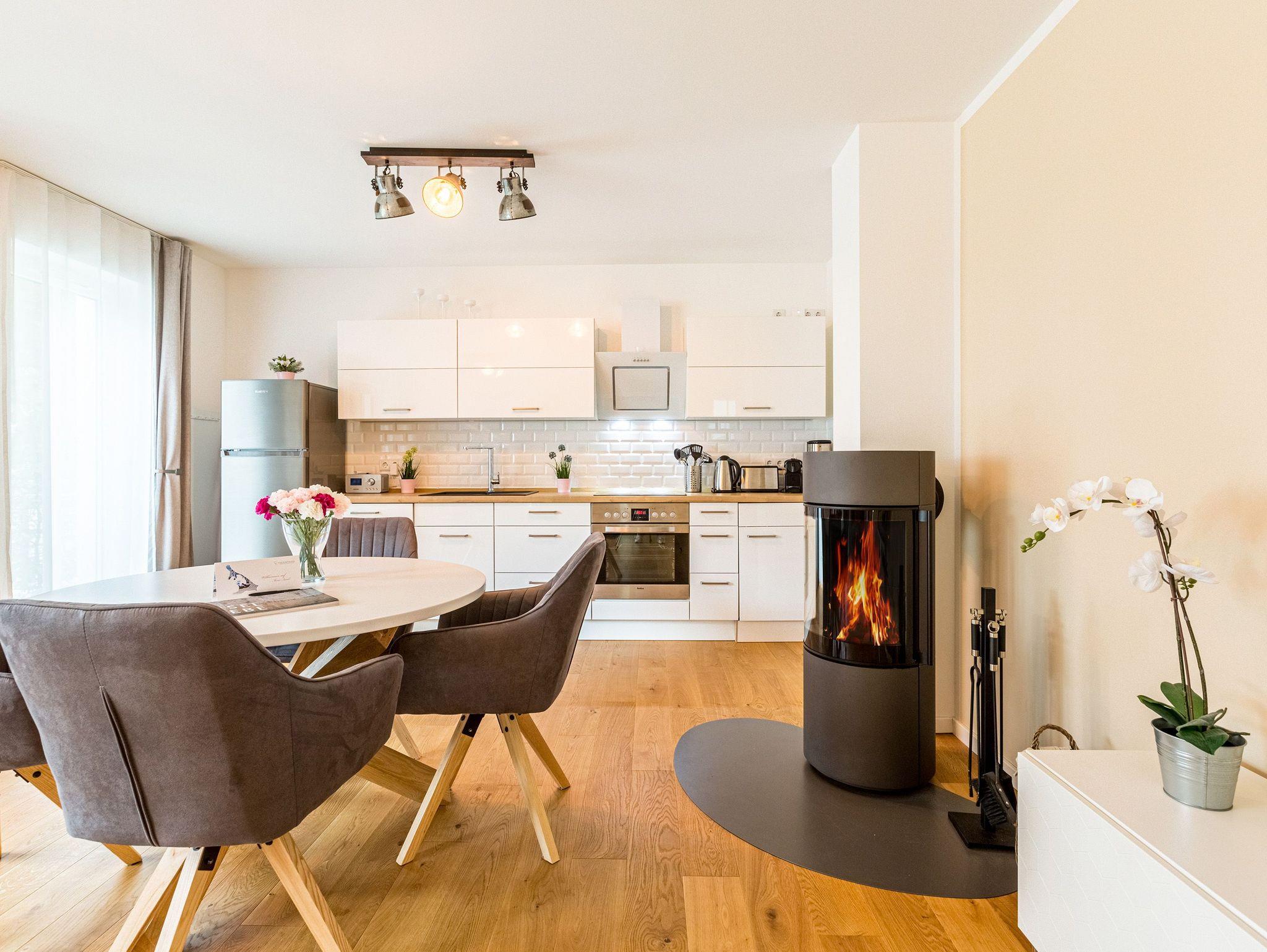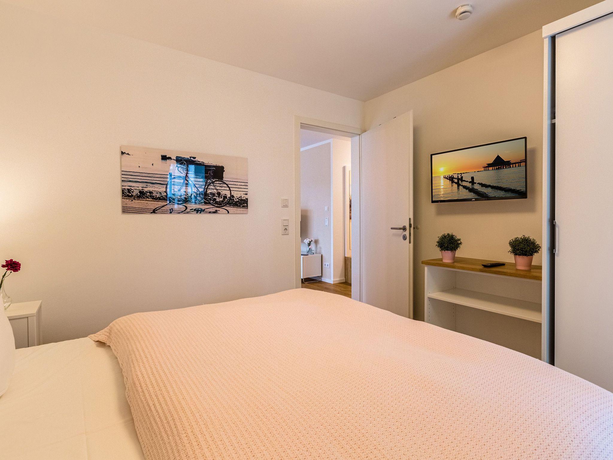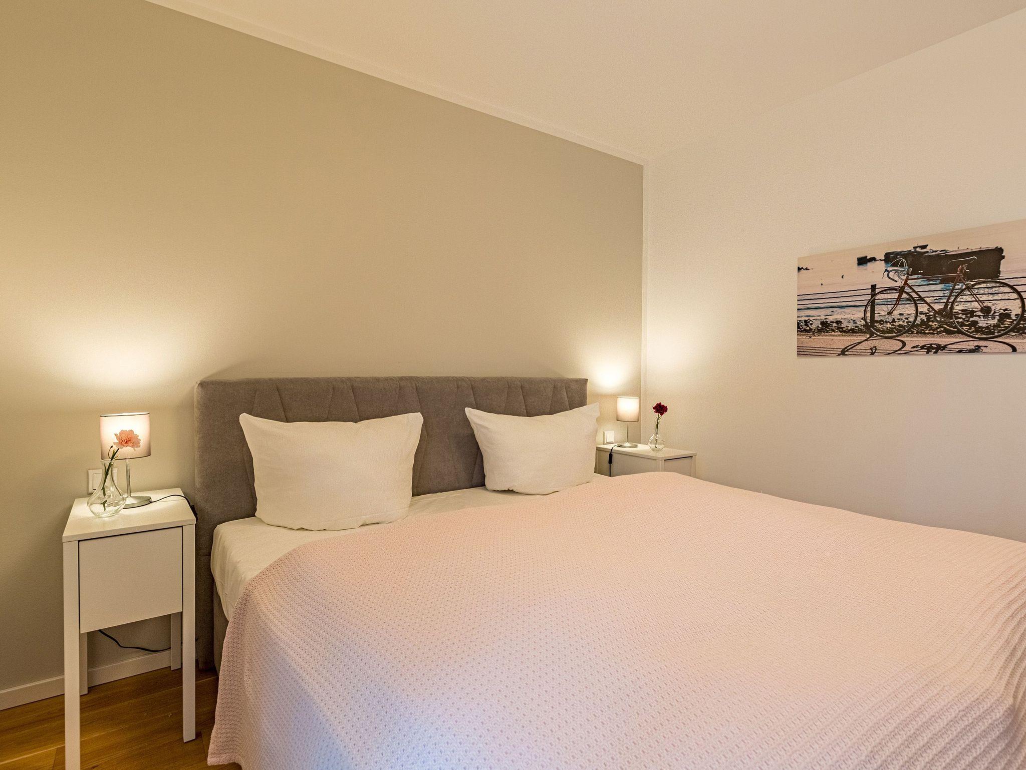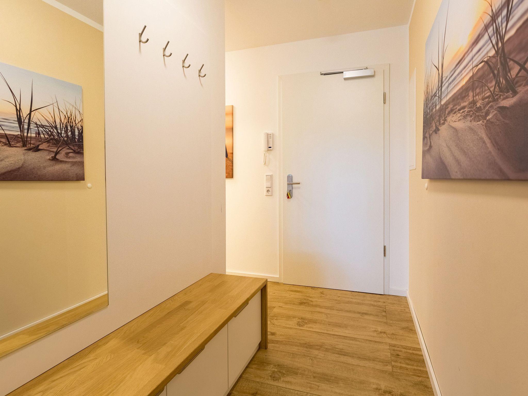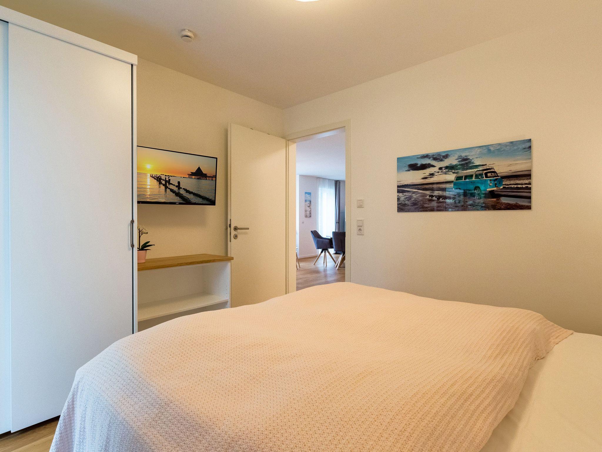 Großzügig, licht und elegant ist dieser Drei-Zimmer-Ferientraum im Erdgeschoss. Das Appartement 1 bietet auf seinen 83 Quadratmetern viel Platz für vier Personen und ein Kleinkind bis zwei Jahre (im Kinderreisebett). Die Einrichtung ist modern, stylisch und ausgewählt. Helle, lichtdurchflutete Räume sorgen für eine harmonische Atmosphäre, in der sich jeder Moment leicht anfühlt. Geben Sie Ihrer Seele und Ihrem Körper einmal wieder Raum und tanken Sie neue Energie auf den komfortablen Nordic Design-Sofas in maritimem Blau, beim Entspannen vor dem großen Flat-TV, einem gemeinsamen Essen in den bequemen Sesseln am schönen Esstisch, beim Blick auf das Flammenspiel des Kamins oder draußen in der Sonne auf einer der beiden Terrassen (5 Quadratmeter und 6 Quadratmeter groß). Die offene Küche ist mit hochwertigen Geräten voll ausgestattet. Im amerikanischen Kühlschrank lässt sich so manche Leckerei unterbringen. Platzprobleme brauchen sie hier wie im gesamten Appartement nicht zu fürchten. Passend zum eleganten Interieur finden Sie in den Küchenschränken stilvolles Geschirr. Hier stimmt einfach alles. Auch in den beiden Schlafzimmern. Schlafvergnügen der Extra-Klasse versprechen die großen Boxspringdoppelbetten (1,80 m x 2,00 m). Flat-TV und ein geräumiger Einbauschrank fehlen natürlich in keinem der beiden Zimmer. Der Wohn- und Schlafbereich ist mit Parkettboden ausgestattet. Für eine entspannte Auszeit stehen zwei Bäder zur Verfügung. Beide haben eine Dusche, ein Waschbecken und ein WC. Eine Waschmaschine gibt es auch. Das Masterbad hält zudem noch ein ganz besonderes Highlight für Sie bereit: eine Finnische Sauna. Graue und triste Tage an der Ostsee gehören damit der Vergangenheit an. Denn was gibt es schöneres, als sich nach einem langen Strandspaziergang im Winter in die wohlige Wärme einer Sauna zu kuscheln. Handtücher liegen bereit und die Betten sind bei Anreise bezogen. Für den Tag am Meer steht Ihnen als besonderes Bonbon von Mitte Mai bis Ende September (je nach Witterung) ein Strandkorb am Strand kostenlos zur Verfügung. Sie brauchen also nur noch Ihr Auto in der Tiefgarage abstellen und loslassen.