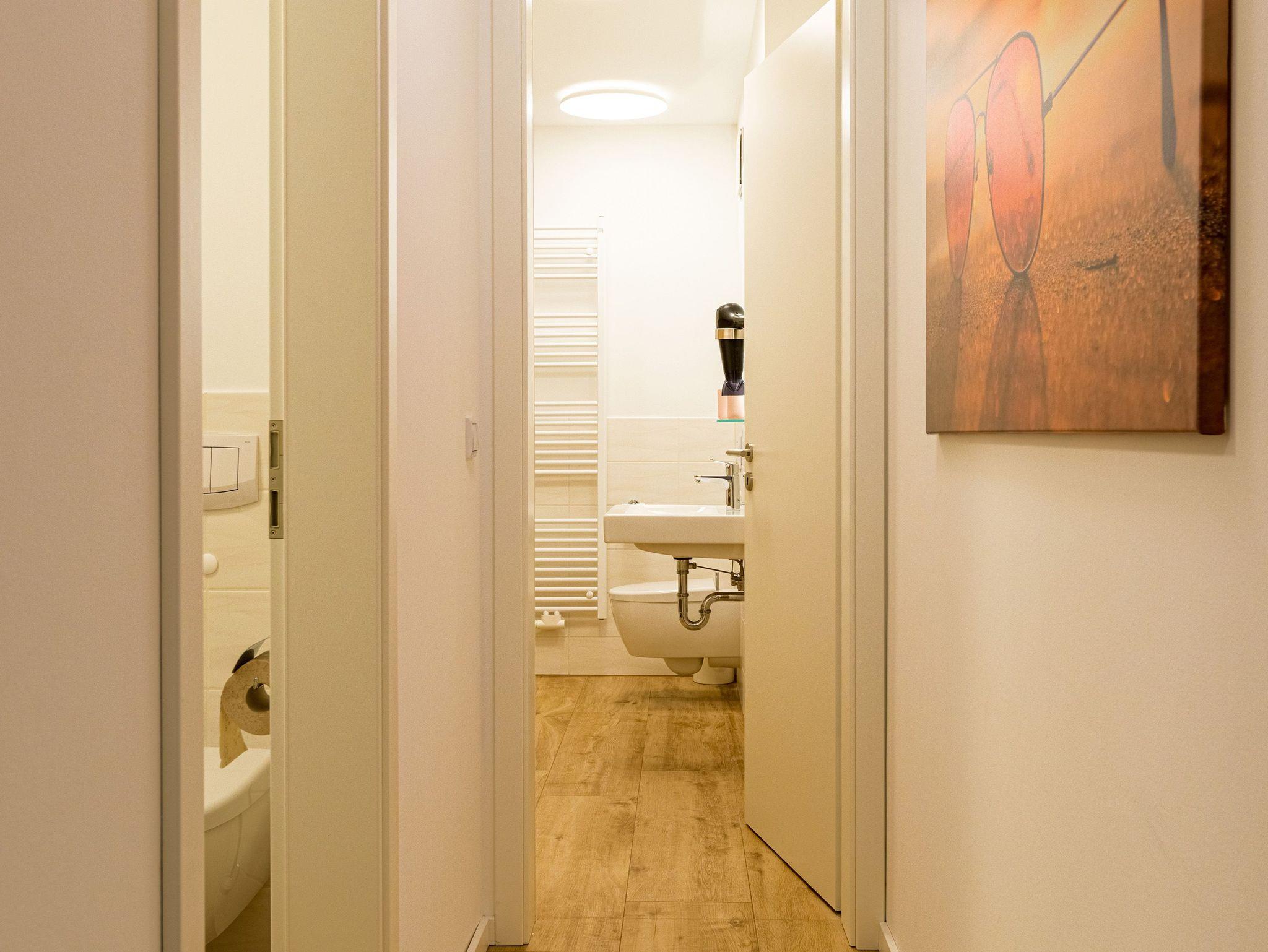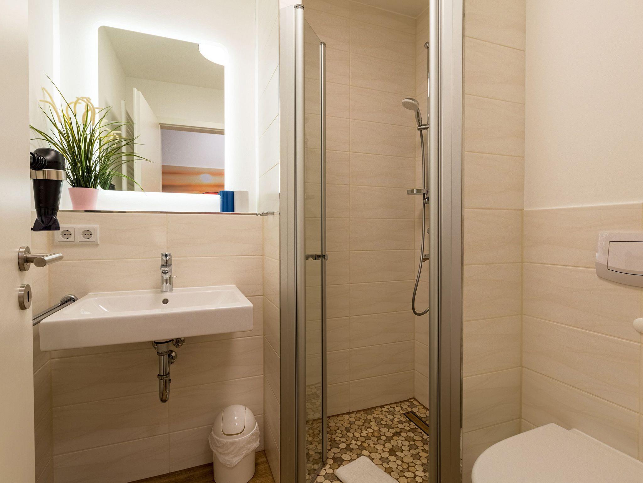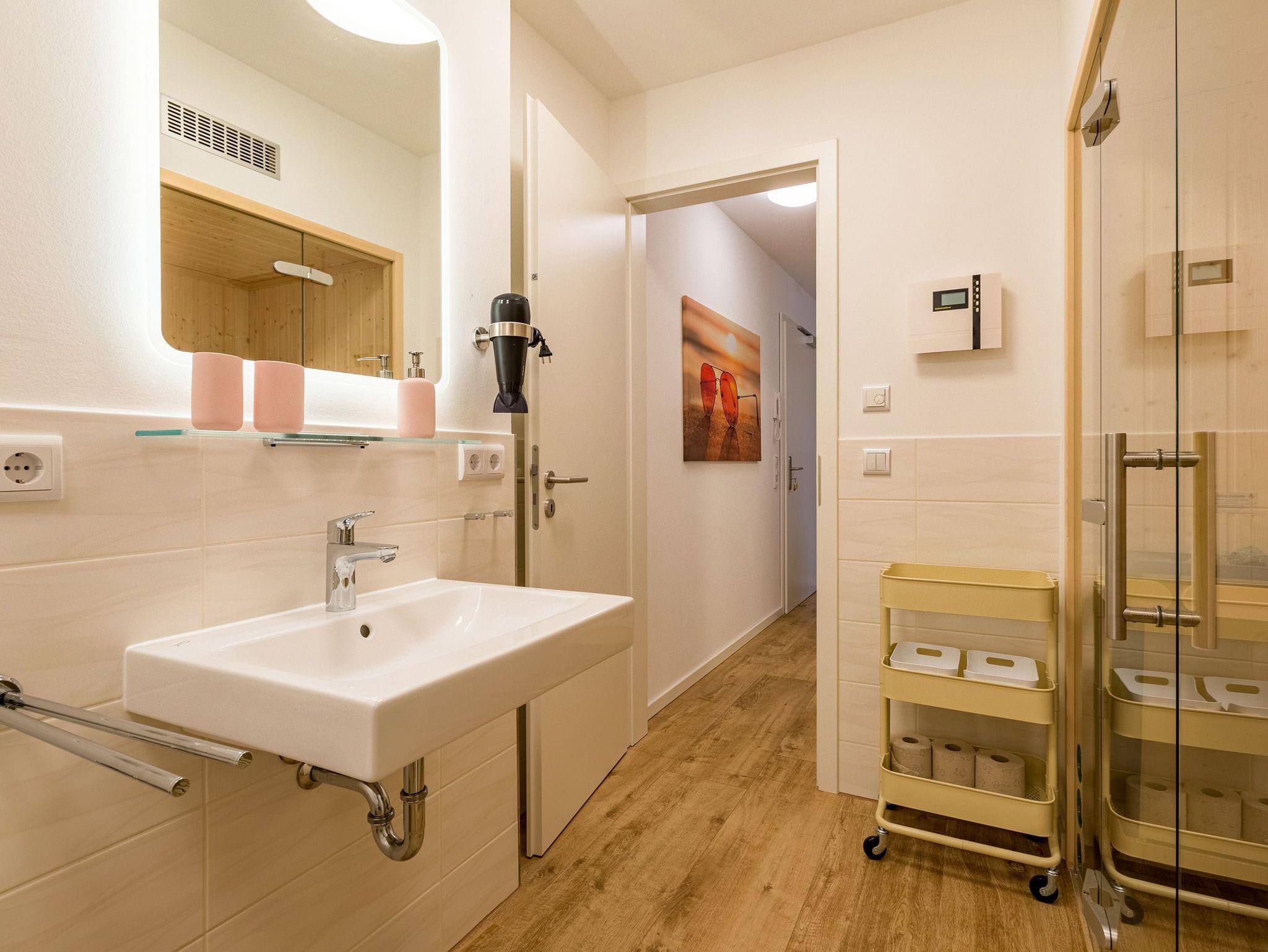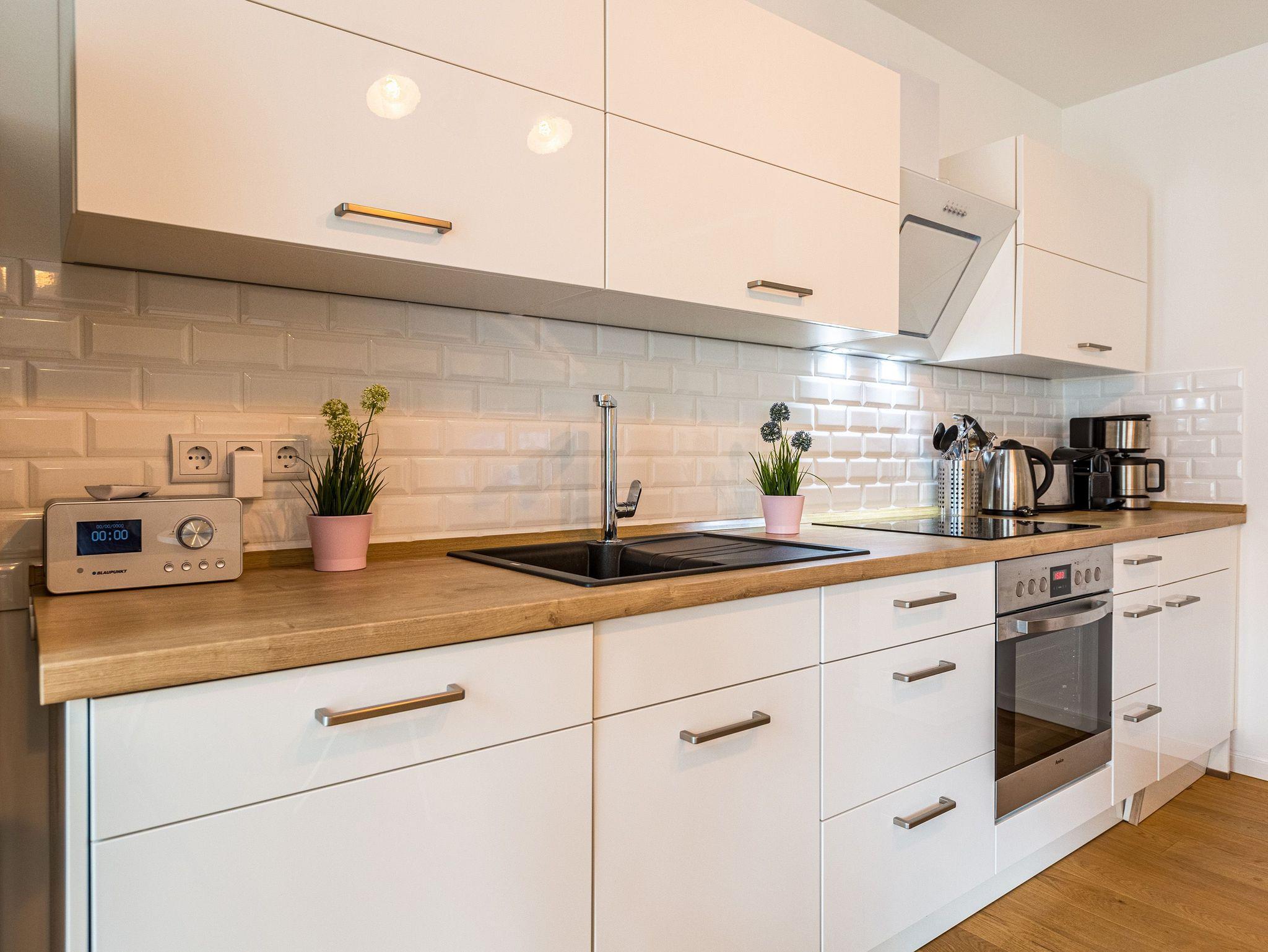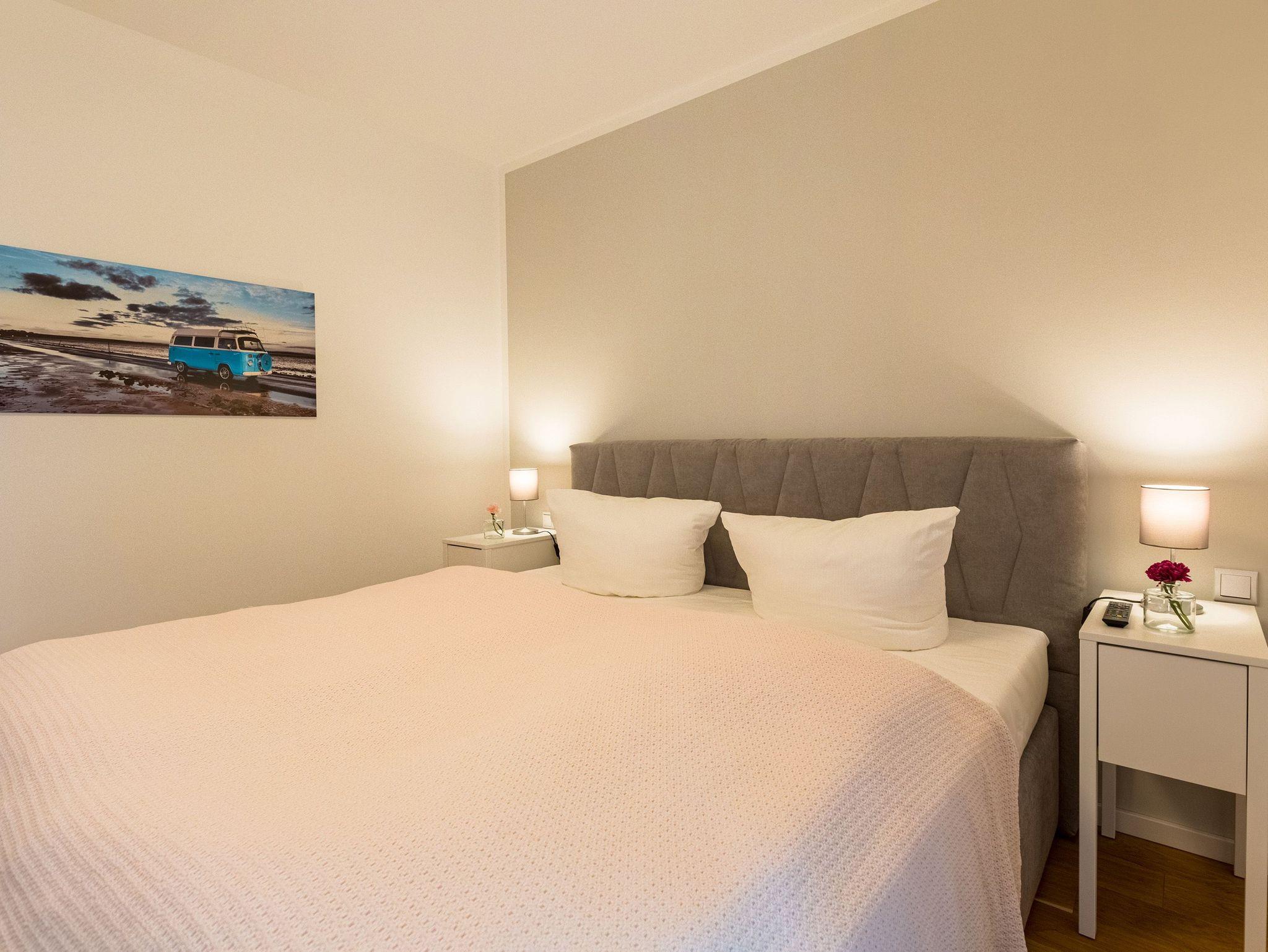 Großzügig, licht und elegant ist dieser Drei-Zimmer-Ferientraum im Erdgeschoss. Das Appartement 1 bietet auf seinen 83 Quadratmetern viel Platz für vier Personen und ein Kleinkind bis zwei Jahre (im Kinderreisebett). Die Einrichtung ist modern, stylisch und ausgewählt. Helle, lichtdurchflutete Räume sorgen für eine harmonische Atmosphäre, in der sich jeder Moment leicht anfühlt. Geben Sie Ihrer Seele und Ihrem Körper einmal wieder Raum und tanken Sie neue Energie auf den komfortablen Nordic Design-Sofas in maritimem Blau, beim Entspannen vor dem großen Flat-TV, einem gemeinsamen Essen in den bequemen Sesseln am schönen Esstisch, beim Blick auf das Flammenspiel des Kamins oder draußen in der Sonne auf einer der beiden Terrassen (5 Quadratmeter und 6 Quadratmeter groß). Die offene Küche ist mit hochwertigen Geräten voll ausgestattet. Im amerikanischen Kühlschrank lässt sich so manche Leckerei unterbringen. Platzprobleme brauchen sie hier wie im gesamten Appartement nicht zu fürchten. Passend zum eleganten Interieur finden Sie in den Küchenschränken stilvolles Geschirr. Hier stimmt einfach alles. Auch in den beiden Schlafzimmern. Schlafvergnügen der Extra-Klasse versprechen die großen Boxspringdoppelbetten (1,80 m x 2,00 m). Flat-TV und ein geräumiger Einbauschrank fehlen natürlich in keinem der beiden Zimmer. Der Wohn- und Schlafbereich ist mit Parkettboden ausgestattet. Für eine entspannte Auszeit stehen zwei Bäder zur Verfügung. Beide haben eine Dusche, ein Waschbecken und ein WC. Eine Waschmaschine gibt es auch. Das Masterbad hält zudem noch ein ganz besonderes Highlight für Sie bereit: eine Finnische Sauna. Graue und triste Tage an der Ostsee gehören damit der Vergangenheit an. Denn was gibt es schöneres, als sich nach einem langen Strandspaziergang im Winter in die wohlige Wärme einer Sauna zu kuscheln. Handtücher liegen bereit und die Betten sind bei Anreise bezogen. Für den Tag am Meer steht Ihnen als besonderes Bonbon von Mitte Mai bis Ende September (je nach Witterung) ein Strandkorb am Strand kostenlos zur Verfügung. Sie brauchen also nur noch Ihr Auto in der Tiefgarage abstellen und loslassen.