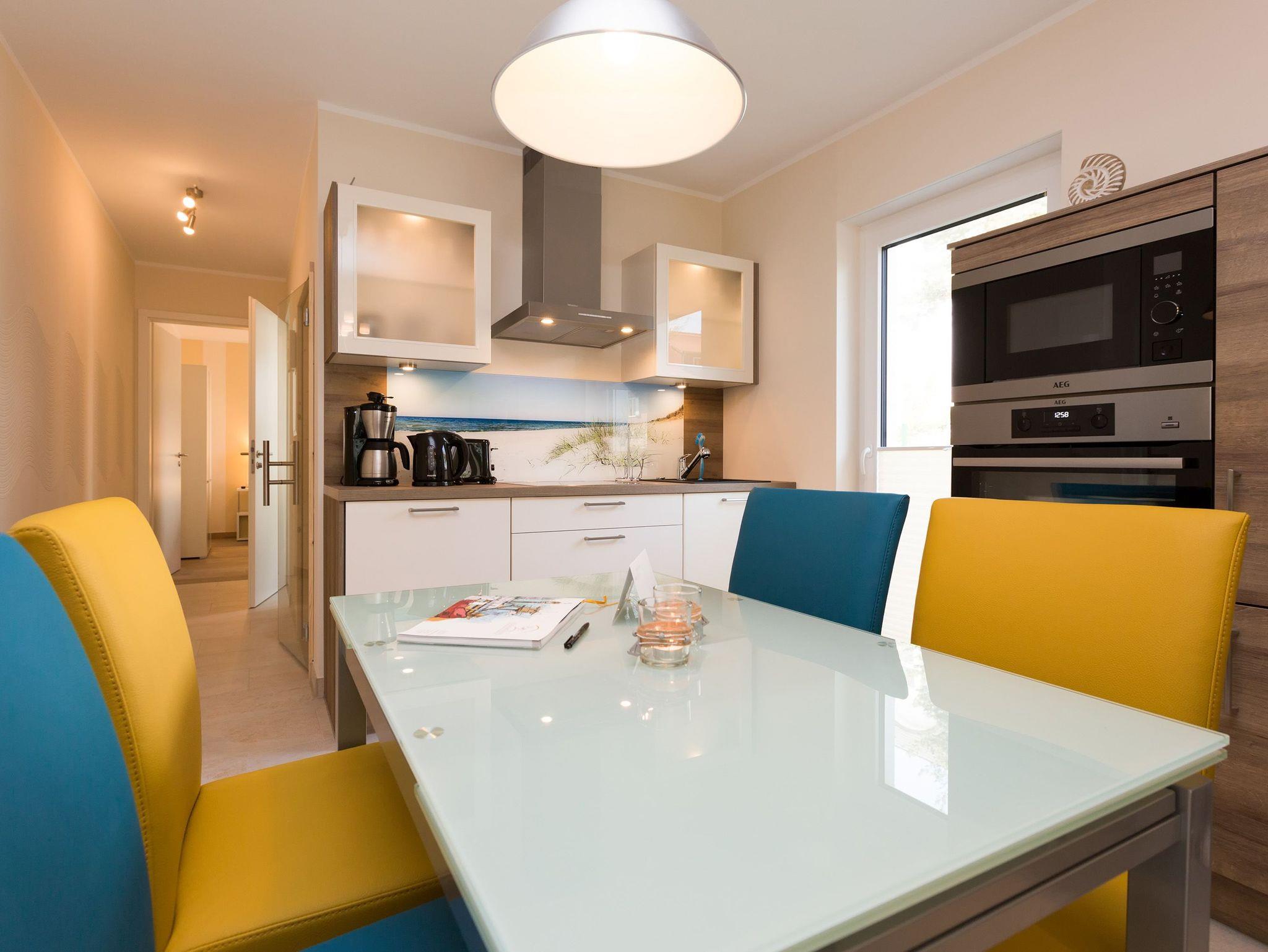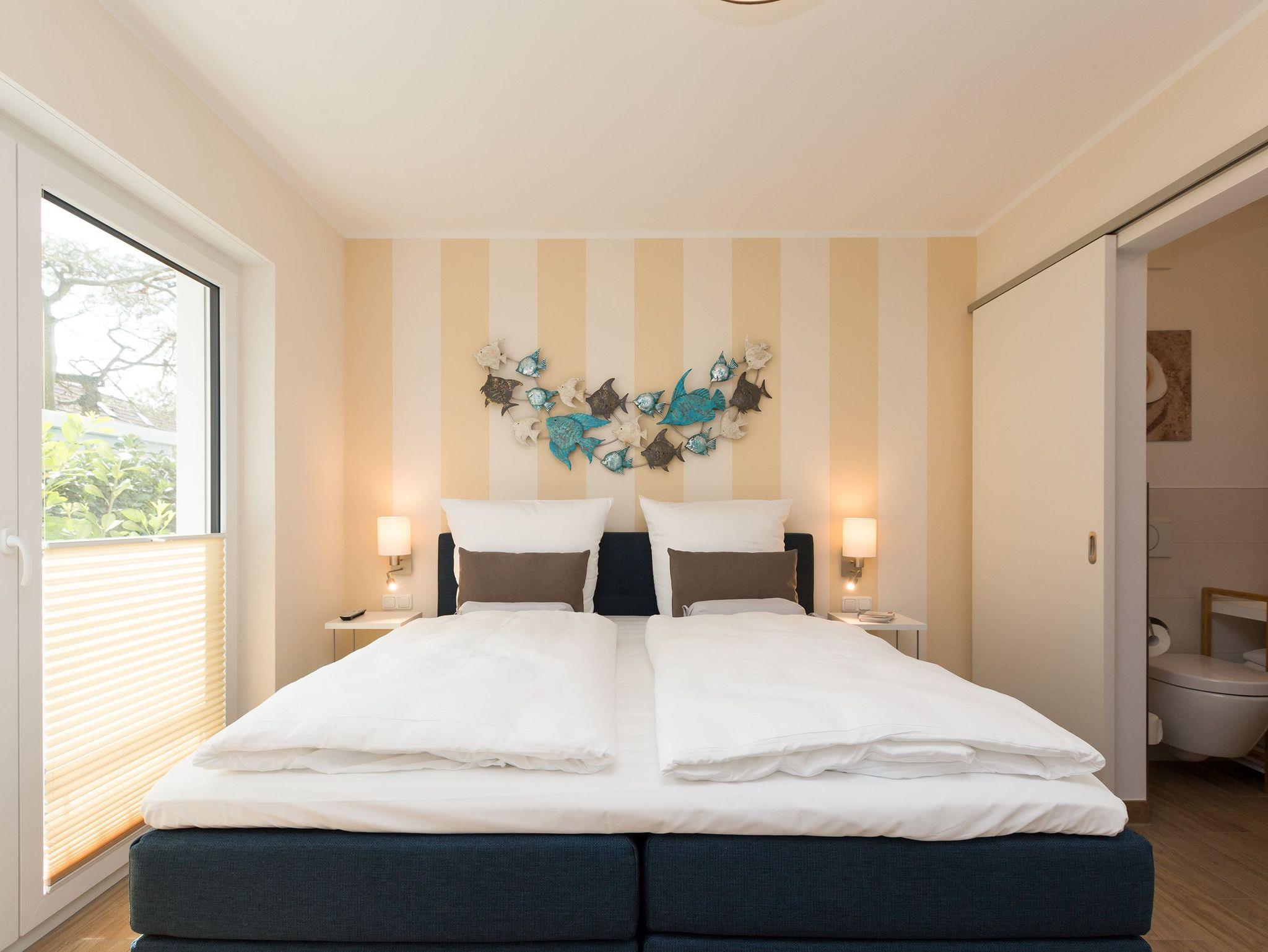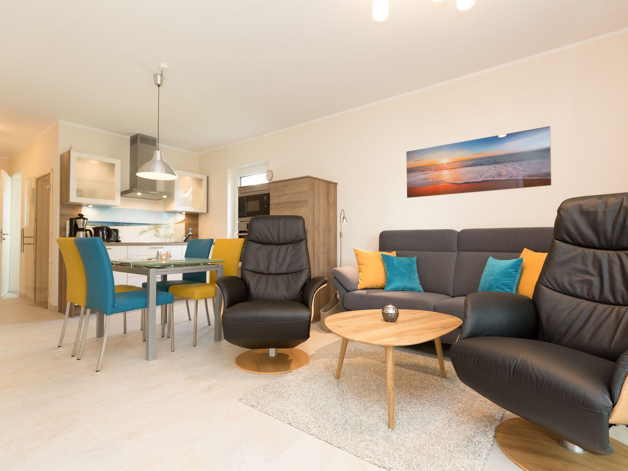 Modern wohnen - schöner Urlauben! Im neuen 3-Raum-Appartement 6 (67 qm) im Erdgeschoss der Dünenresidenz werden Sie erholsame Urlaubstage verleben. Bis zu 4 Personen und ein Kleinkind (als Aufbettung im Babyreisebett) finden hier Platz. Die geschmackvolle Einrichtung, abgestimmte Farben und Materialen und ausgesuchte Dekorationen schaffen ein wunderschönes Urlaubsdomizil. Schon beim Eintreten öffnet sich der helle Wohnbereich mit bequemer Sitzgruppe, Elektro-Kamin mit Fernbedienung und Flat-TV, die komplett ausgestattete Küchenzeile und der Essbereich schließen sich an. Zwei Schlafzimmer mit komfortablen Doppelboxspringbetten (1,80 m x 2,00 m und 1,60 m x 2,00 m) und eigenem Flat-TV sowie zwei Bäder mit Dusche und WC und einer Waschmaschine ergänzen die Wohnung. Selbstverständlich darf die wohnungseigene Sauna nicht fehlen! Ein weiteres Highlight des Appartements ist die großzügige Nord-Ost-Terrasse mit Gartenmöbeln (Zugang vom Wohnbereich und von einem Schlafzimmer). Bevor der Strand lockt, genießt man bei Meeresrauschen hier sein Frühstück in der Morgensonne. Für Ihren Komfort sind bei der Anreise die Betten bezogen und die Erstausstattung Handtücher liegt bereit. Das kostenfreie WLAN steht Ihnen zur Verfügung. Ein Pkw-Stellplatz befindet sich in der Tiefgarage (max. Einfahrtshöhe 1,93 m) und für Fahrräder gibt es einen separaten Abstellraum im Keller.