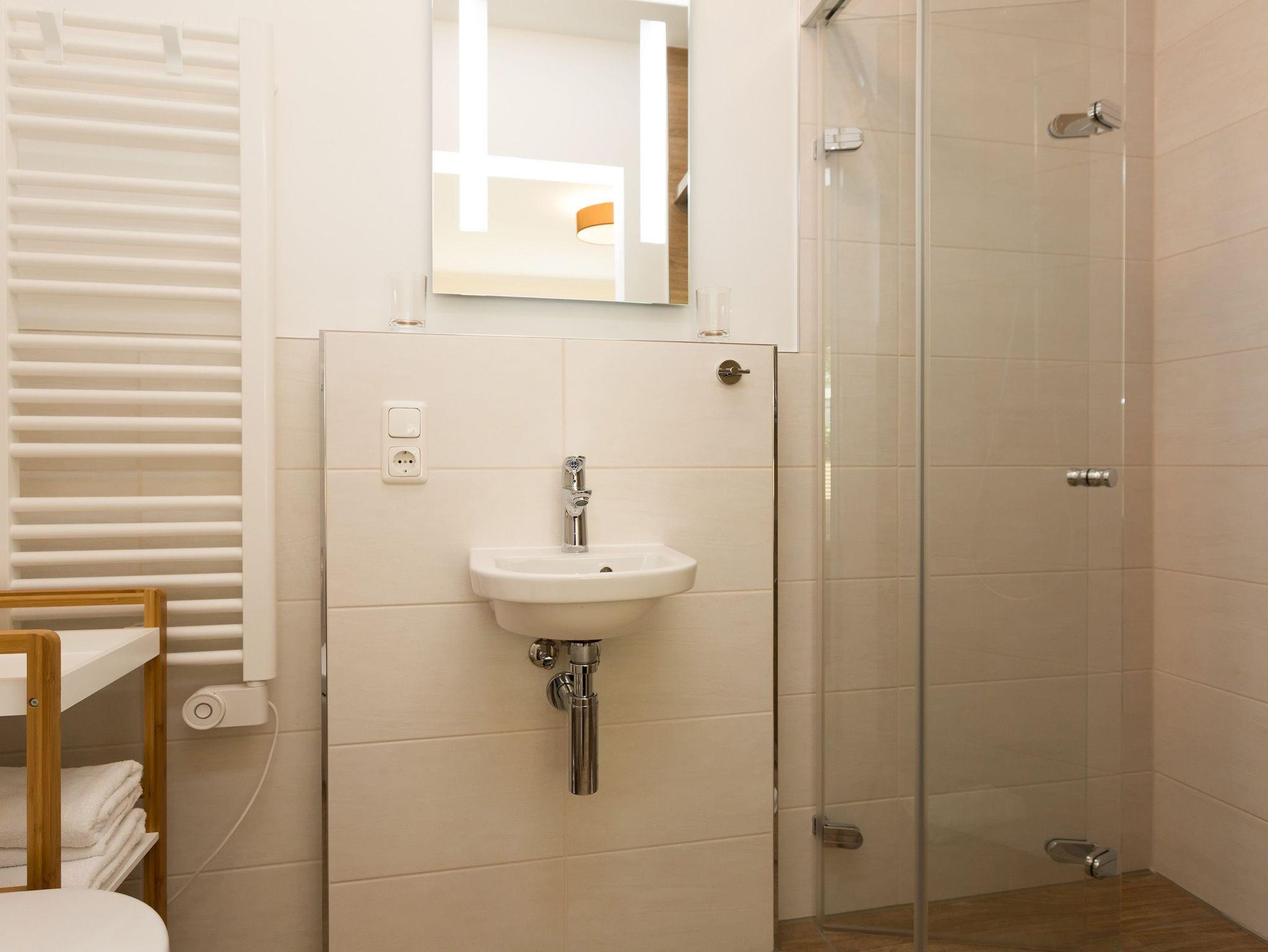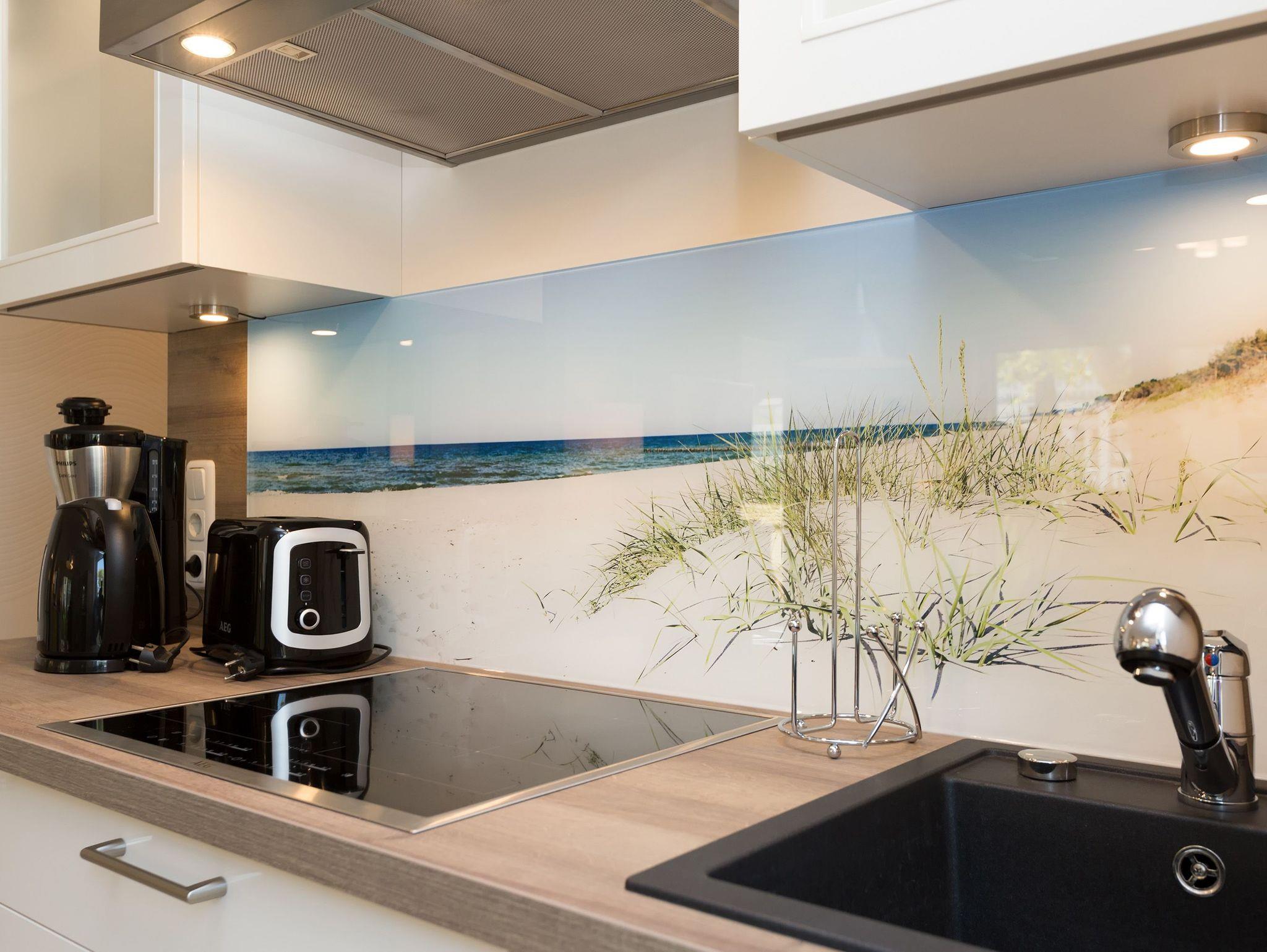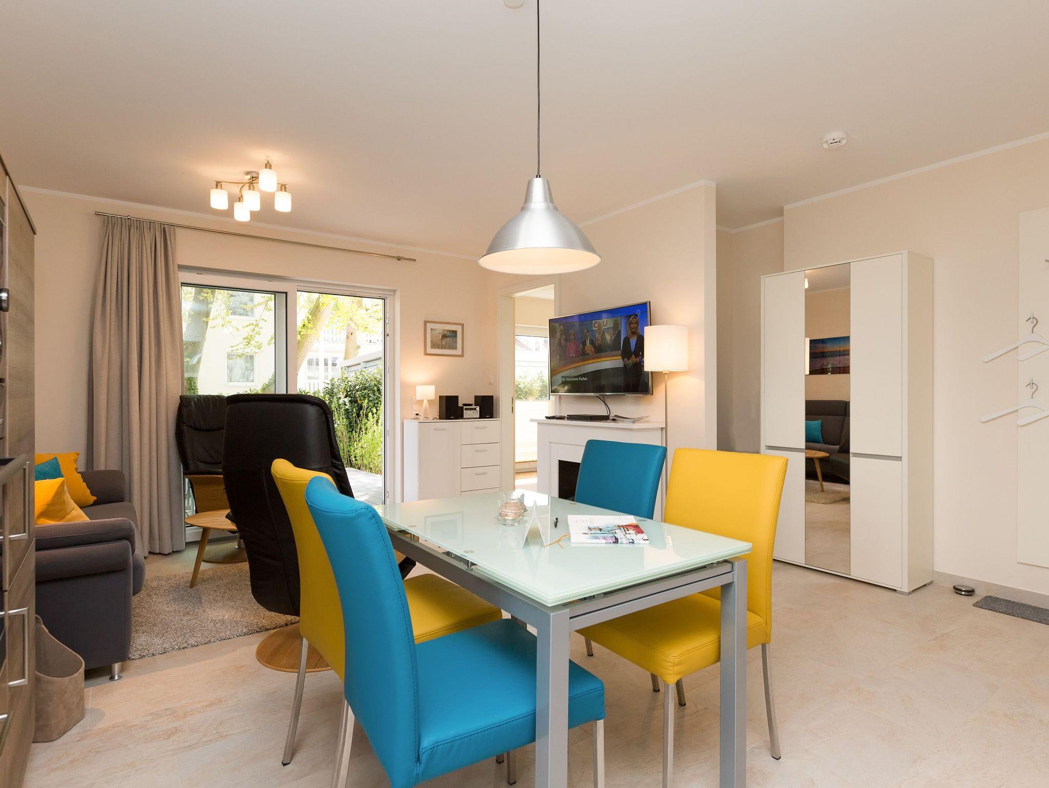 Modern wohnen - schöner Urlauben! Im neuen 3-Raum-Appartement 6 (67 qm) im Erdgeschoss der Dünenresidenz werden Sie erholsame Urlaubstage verleben. Bis zu 4 Personen und ein Kleinkind (als Aufbettung im Babyreisebett) finden hier Platz. Die geschmackvolle Einrichtung, abgestimmte Farben und Materialen und ausgesuchte Dekorationen schaffen ein wunderschönes Urlaubsdomizil. Schon beim Eintreten öffnet sich der helle Wohnbereich mit bequemer Sitzgruppe, Elektro-Kamin mit Fernbedienung und Flat-TV, die komplett ausgestattete Küchenzeile und der Essbereich schließen sich an. Zwei Schlafzimmer mit komfortablen Doppelboxspringbetten (1,80 m x 2,00 m und 1,60 m x 2,00 m) und eigenem Flat-TV sowie zwei Bäder mit Dusche und WC und einer Waschmaschine ergänzen die Wohnung. Selbstverständlich darf die wohnungseigene Sauna nicht fehlen! Ein weiteres Highlight des Appartements ist die großzügige Nord-Ost-Terrasse mit Gartenmöbeln (Zugang vom Wohnbereich und von einem Schlafzimmer). Bevor der Strand lockt, genießt man bei Meeresrauschen hier sein Frühstück in der Morgensonne. Für Ihren Komfort sind bei der Anreise die Betten bezogen und die Erstausstattung Handtücher liegt bereit. Das kostenfreie WLAN steht Ihnen zur Verfügung. Ein Pkw-Stellplatz befindet sich in der Tiefgarage (max. Einfahrtshöhe 1,93 m) und für Fahrräder gibt es einen separaten Abstellraum im Keller.