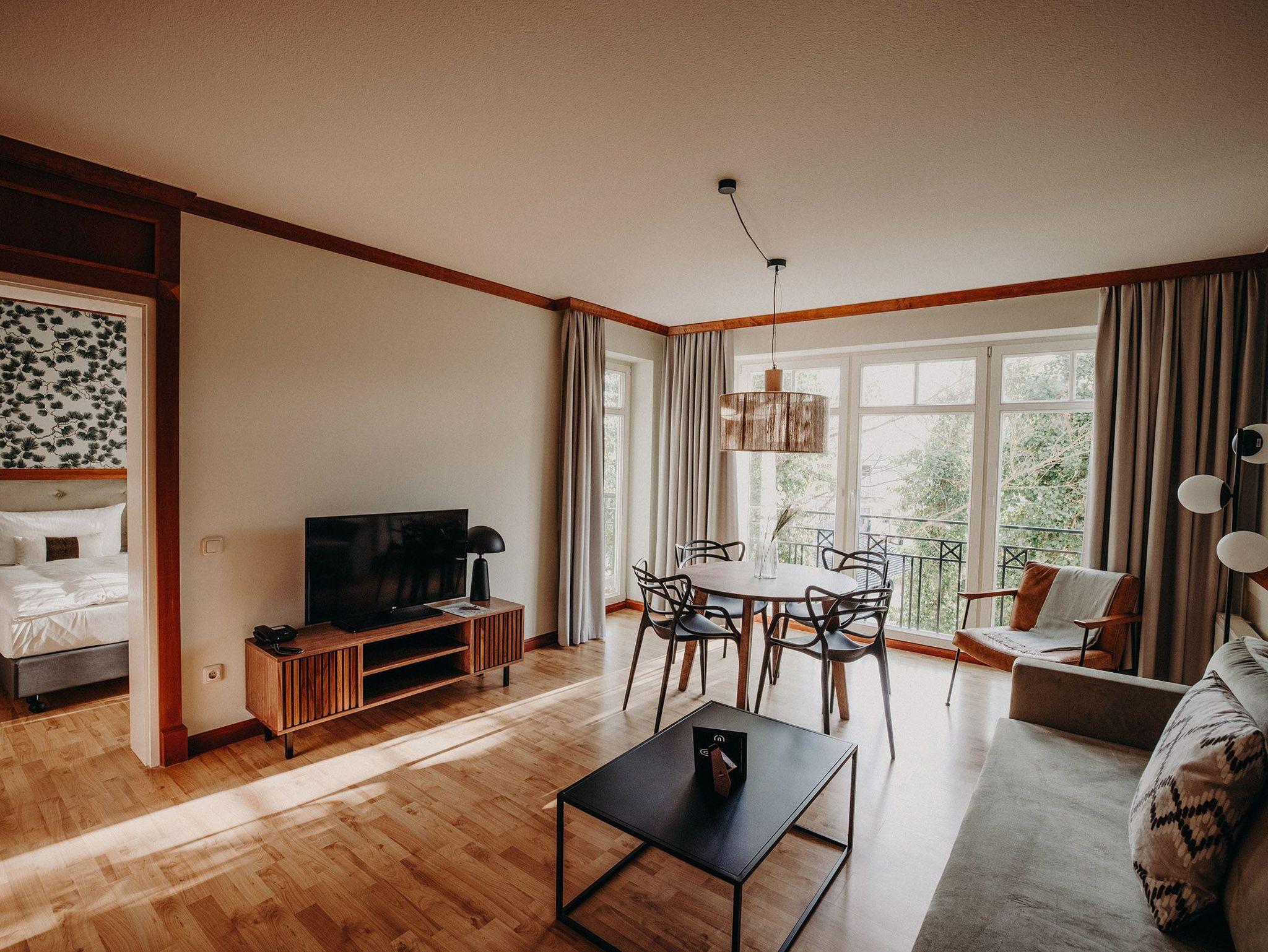 Das Einrichtungskonzept unseres Apartmenttyps Ambiente (ca. 40 m²) im Neubau der Villa Usedom ist harmonisch abgestimmt und hat einen individuellen Innenausbau mit Echtholz. Die Inneneinrichtung zeichnet sich durch eine dezente Farbgebung aus, die in jeder Jahreszeit ein Höchstmaß an Wohlgefühl vermittelt. Das exklusive 2-Raum-Domizil eignet sich für maximal 3 Personen, wenn die Schlafcouch im Wohnzimmer mit genutzt wird. Ein Babybett kann jederzeit untergebracht werden. Viel Platz zum Entspannen bietet der offene Wohn-Essbereich mit Couch und Sessel.