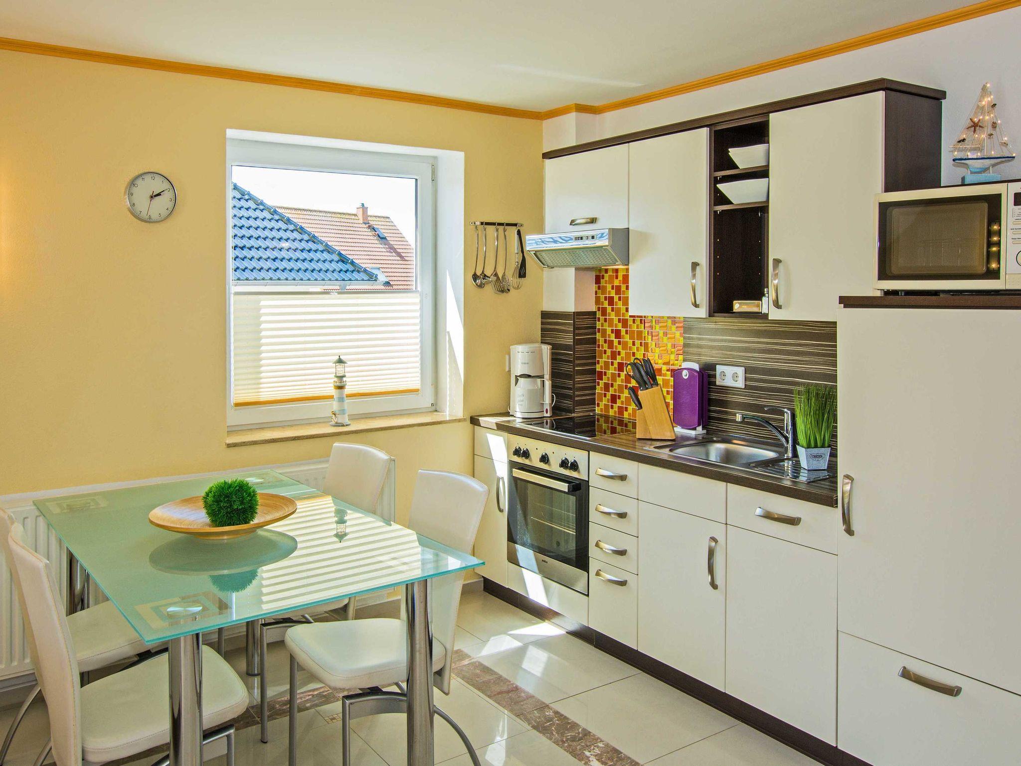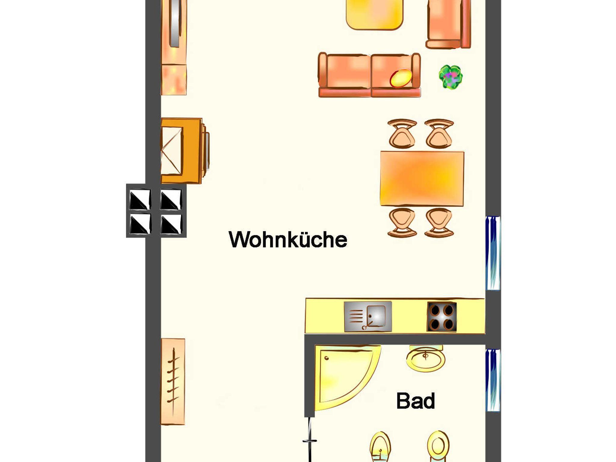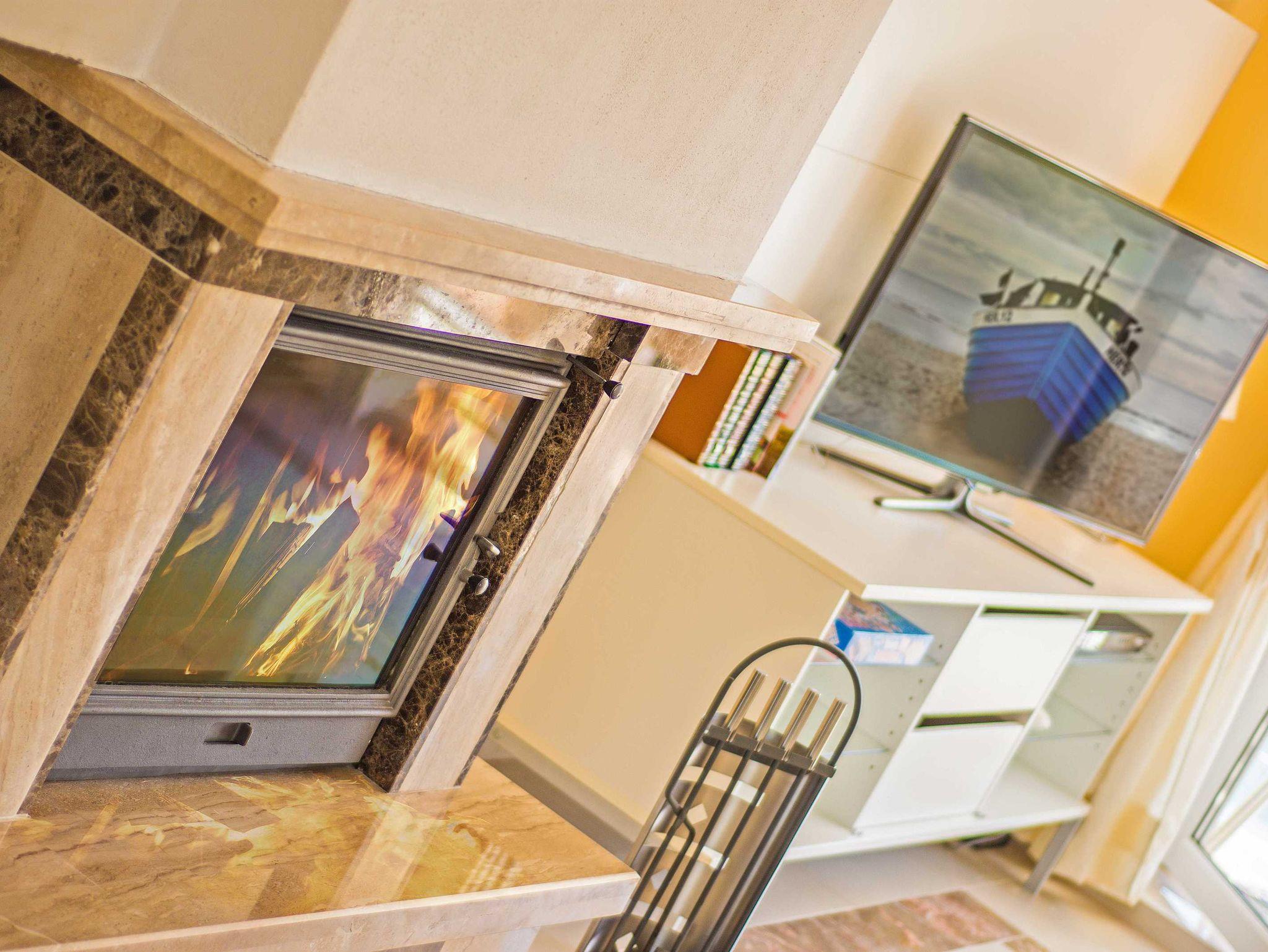 Nehmen Sie Platz auf den beiden gemütlichen Sofas im offenen Wohnbereich, die Ihnen die Sicht auf den Fernseher und hinaus durch die bodentiefen Fenster auf den Balkon. Eines der beiden Sofas lässt sich als Schlafbett für eine weitere Personen ausziehen. Die Küchenzeile, bestehend aus Backofen, Herd mit Ceranfeld, Kühlschrank mit Gefrierfach, Geschirrspülmaschine, sowie Kleinelektrogeräten wie einer Mikrowelle, Kaffeemaschine, Toaster und Wasserkocher steht vor dem großen Esstisch mit vier Stühlen. Zu Ihrer Unterhaltung stehen Ihnen ein 3D 40“Flat TV mit Blue-Ray HiFi-Anlage zur Verfügung. Der Kamin schafft in den Wintermonaten eine wohlige Atmosphäre. Das maritime Badezimmer stellt Ihnen eine gläserne Duschkabine, ein unterbautes Waschbecken mit Spiegel und Kosmetikspiegel, Haartrockner, Bidet und WC bereit.