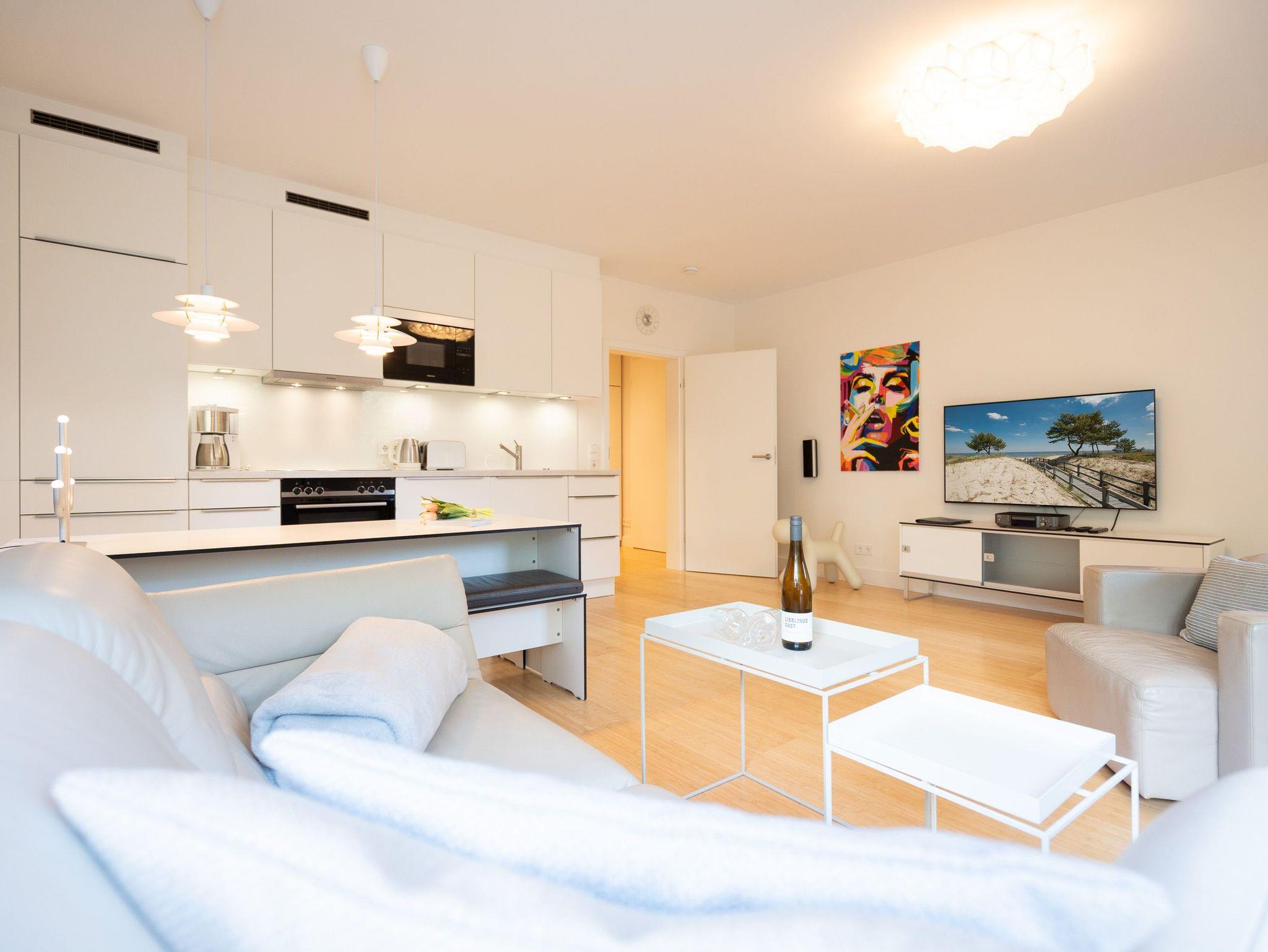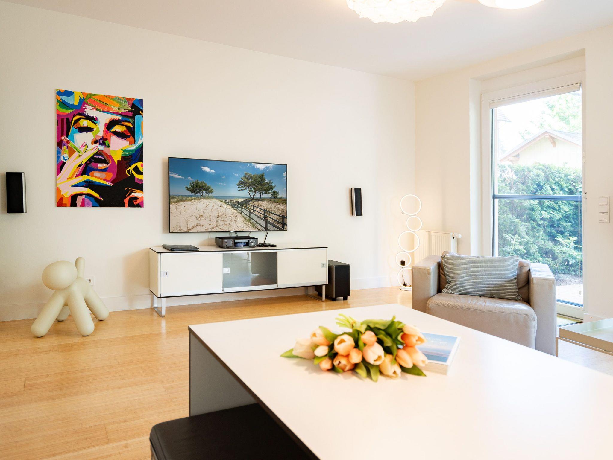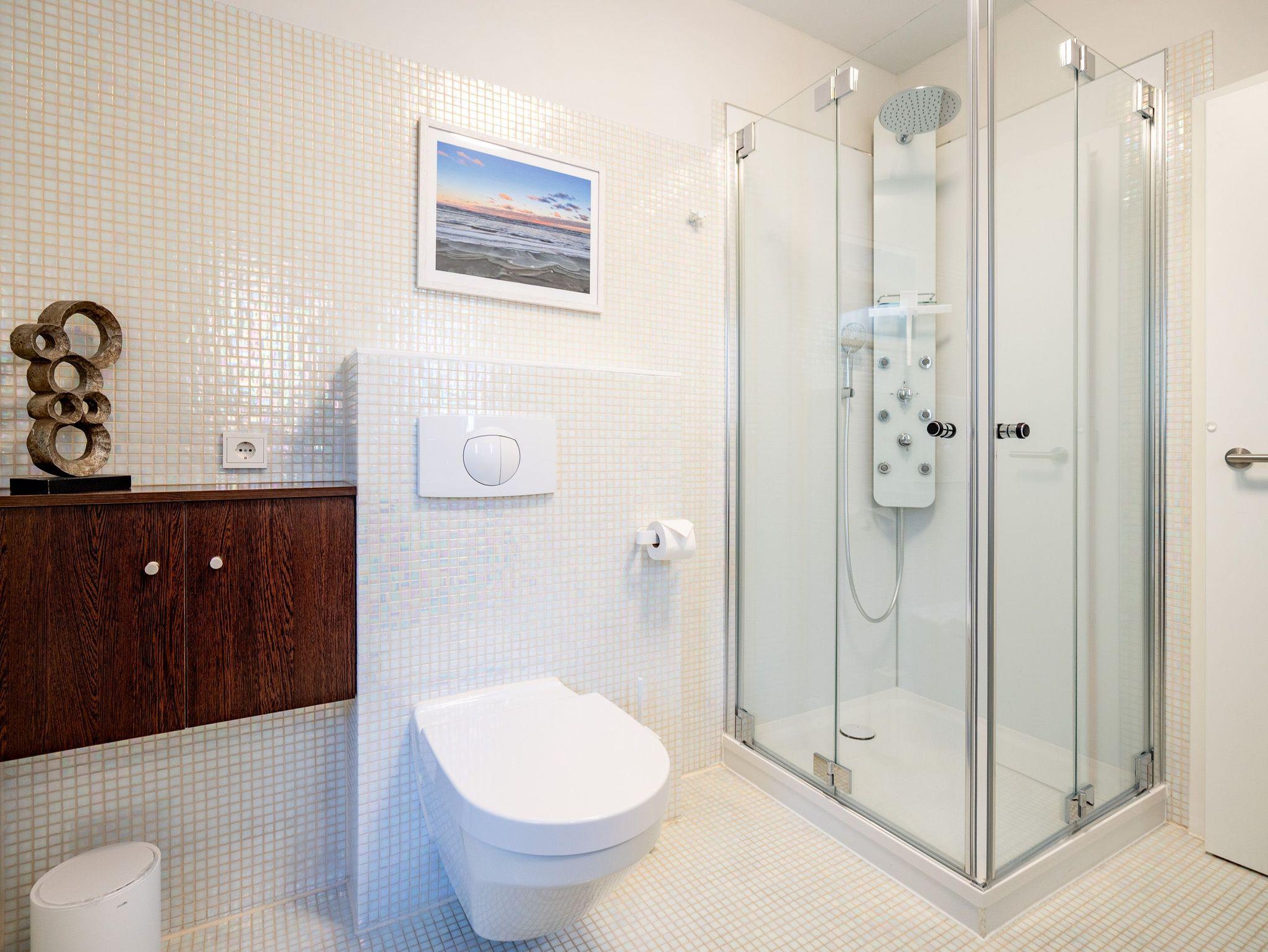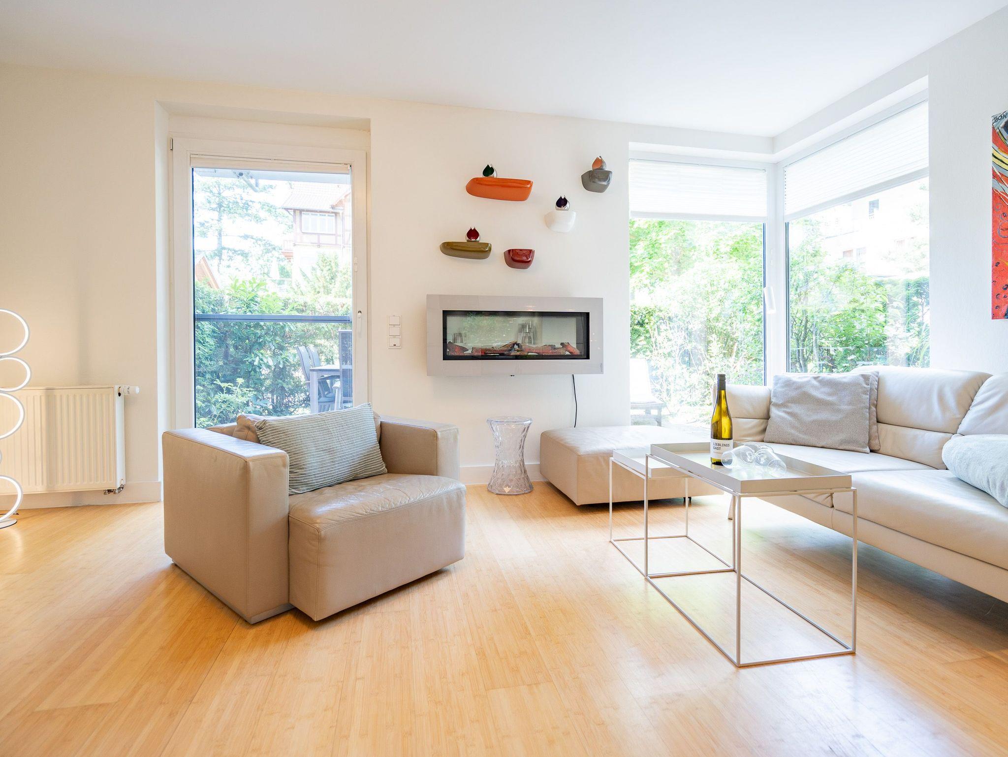 Wellness, Entspannung und die unmittelbare Nähe zum Meer machen die Erdgeschoss-Ferienwohnung 10 zu einem ganz besonderen Urlaubserlebnis. Die helle und modern eingerichtete Wohnung bietet drei stilvolle Zimmer, eine perfekt ausgestattete Küchenzeile mit großem Esstisch und gemütlichen Sitzbänken sowie einen Designer-Elektrokamin, der für eine behagliche Atmosphäre sorgt. Das luxuriöse Badezimmer verwöhnt mit hochwertigen Markenmöbeln, einem Doppelwaschtisch und einem Duschpaneel mit Fitness- und Massagefunktion. Ein besonderes Highlight ist die integrierte Tylö Infrarotsauna mit Farblicht, Touch-Bedienfeld, Bluetooth und Carbonstrahlern, die nach ausgedehnten Spaziergängen am Wasser oder an warmen Sommertagen wie auch in der kalten Jahreszeit für pure Entspannung sorgt. Das erste Schlafzimmer lädt mit einem komfortablen 1,80 m x 2,00 m Boxspringbett aus Leder, einem Smart-TV, einem geräumigen Schrank sowie einem angenehmen Blick in den angrenzenden Gartenbereich zum Träumen ein. Das zweite Schlafzimmer präsentiert sich in modernem Industrial-Design und bietet ein 1,40 m x 2,00 m Doppelbett sowie einen weiteren Smart-TV. Besonderen Komfort bieten die beiden großzügigen Terrassen: Während die hintere Terrasse zum sonnigen Frühstück einlädt, bietet die vordere den perfekten Platz für entspannte Nachmittage und gemütliche Abendstunden. Zwei Liegen, komfortables Außenmobiliar und ein Strandkorb sorgen für zusätzlichen Genuss. Alle Räume sind mit Insektenschutz ausgestattet, sodass ungestörte Erholung garantiert ist. Für Familien mit kleinen Kindern stehen auf Wunsch ein Kinderreisebett (ohne zusätzliche Matratze [&] Bettzeug) sowie ein Hochstuhl zur Verfügung. Damit der Urlaub von Anfang an entspannt beginnt, sind die Betten bei Anreise bereits bezogen und frische Handtücher liegen bereit. Genießen Sie einen erholsamen Urlaub in erster Reihe zum Strand ? ankommen, abschalten und wohlfühlen.