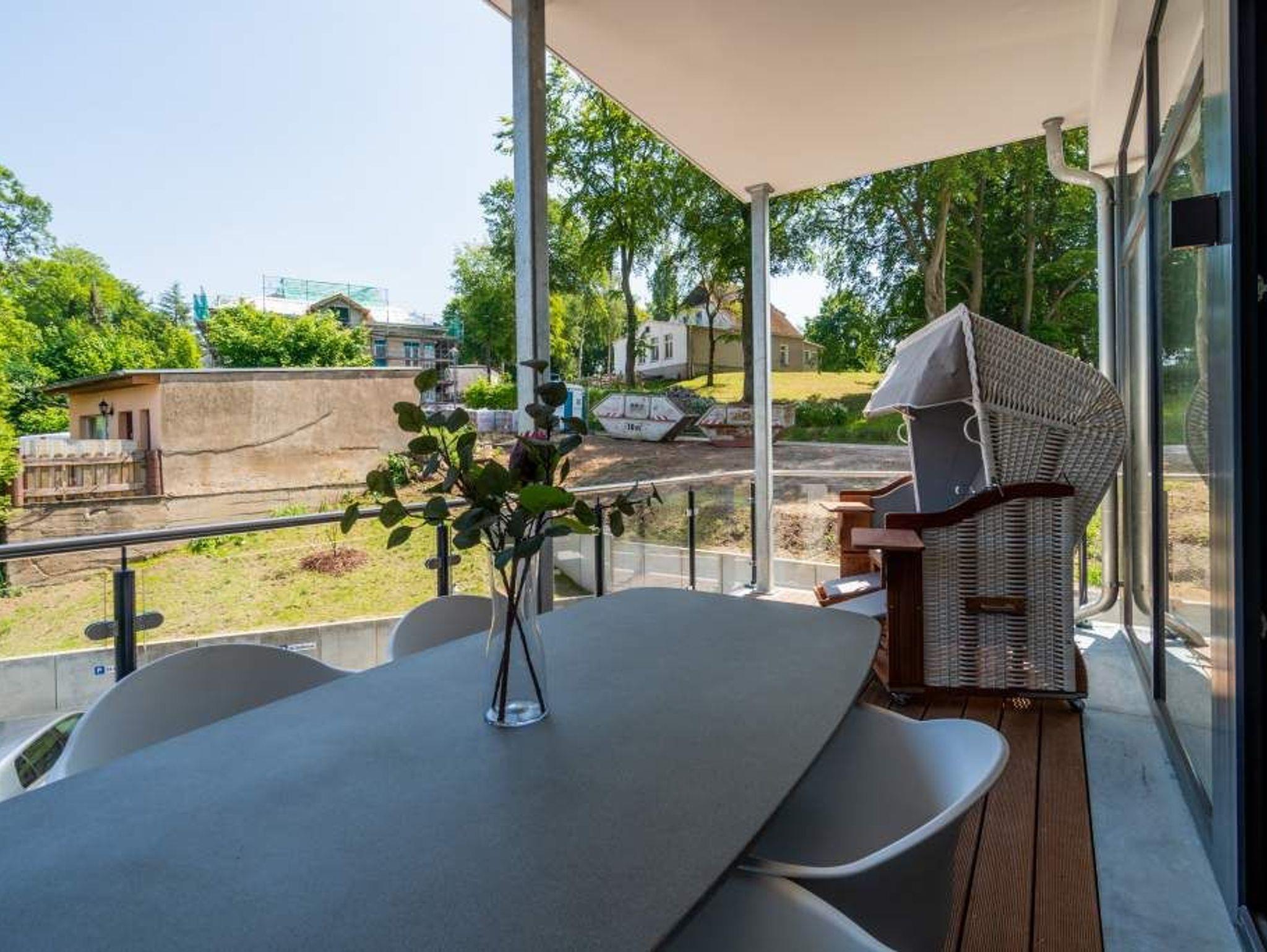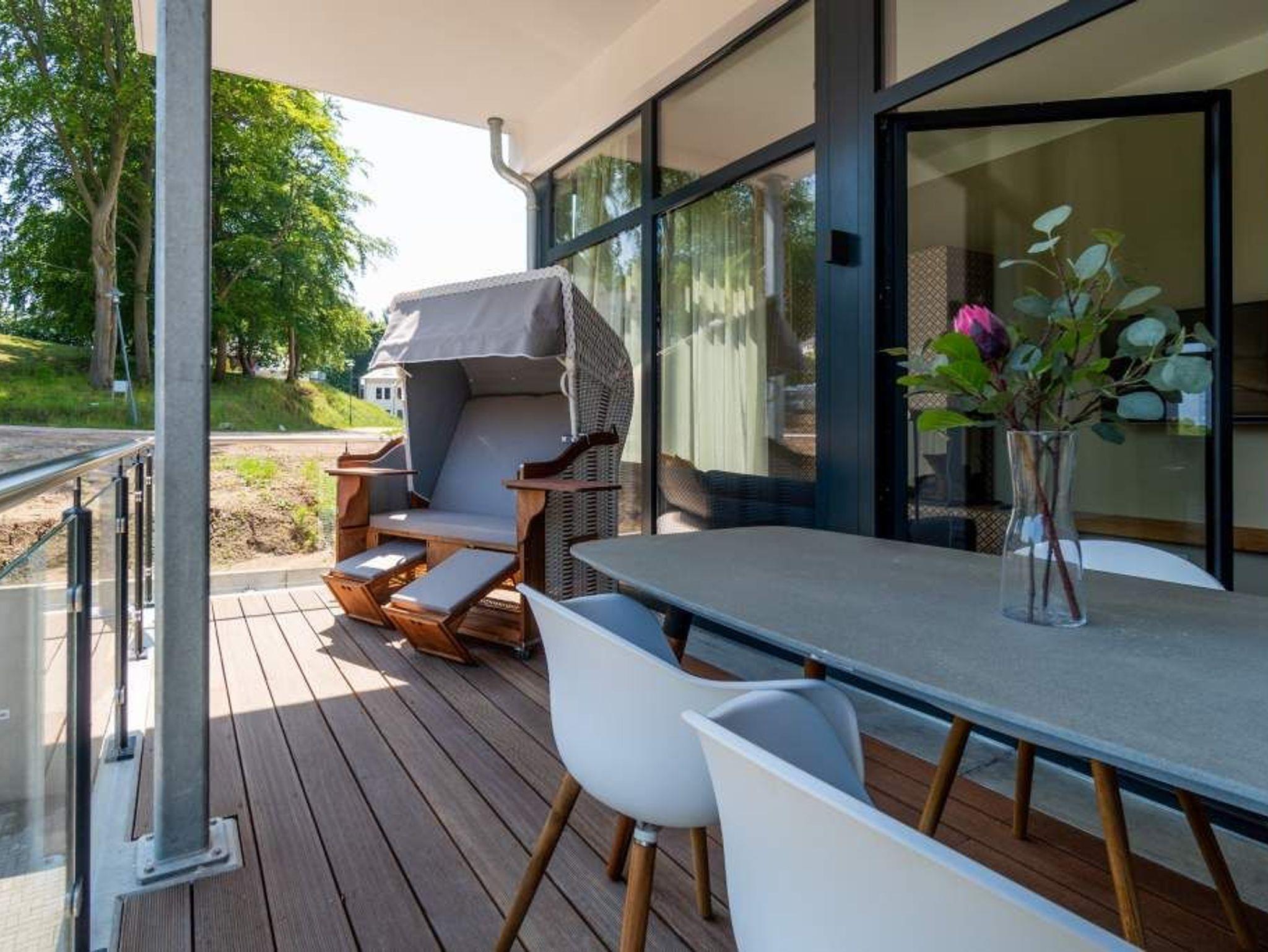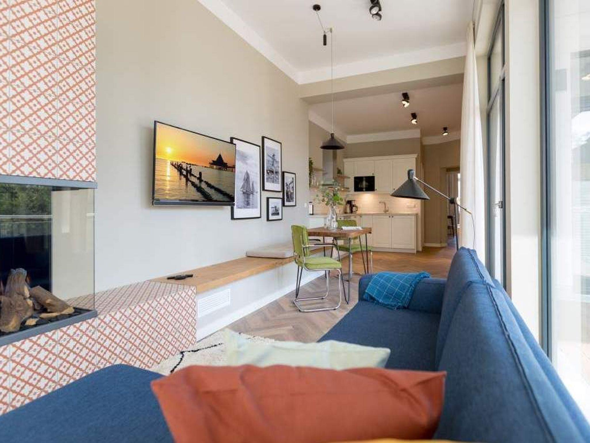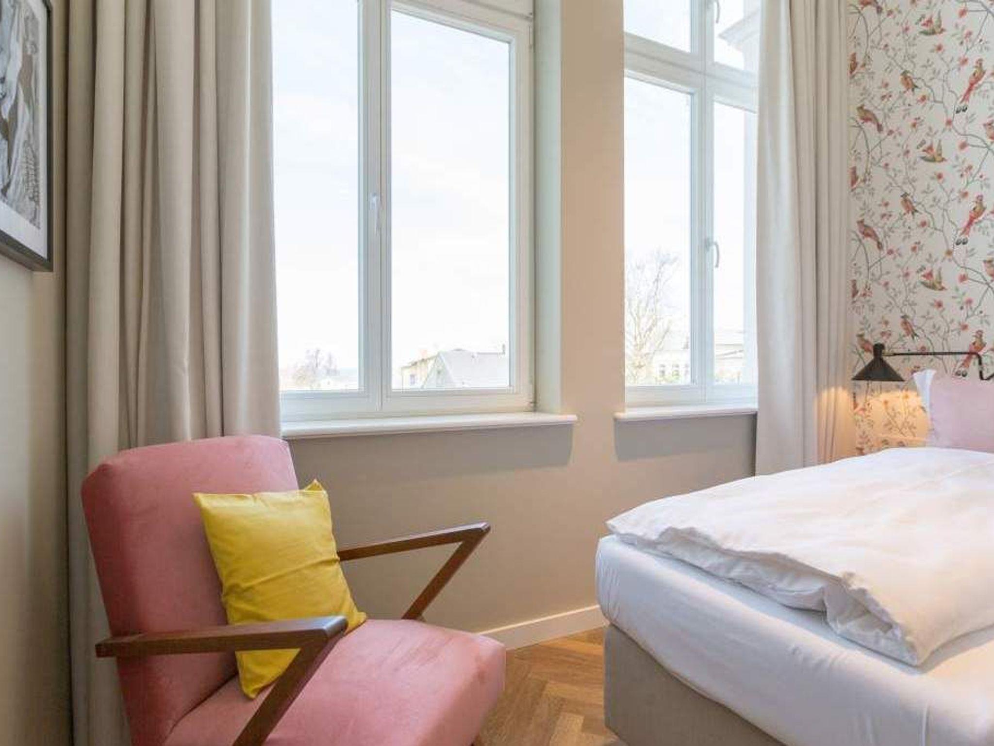 Ein gemütliches und in skandinavischem Design konzipiertes Urlaubsdomizil erwartet Auszeitfreudige im Appartement 4 im Obergeschoss der Villa Bellevue. Zweieinhalb stilvoll eingerichtete Zimmer bietet die 72 Quadratmeter große Wohnung. Hochwertige Materialien wie das edle Fischgrät-Parkett oder die stylischen Design-Möbel, der wunderschöne Gas-Kamin oder die edlen Tapeten geben Ihrem Urlaub einen exklusiven Rahmen. Bis zu drei Personen und ein Kleinkind bis drei Jahre (im Kinderreisebett) können es sich hier gut gehen lassen, am schönen Esstisch mit den Retro-Freischwingern dinieren oder auf der Sofalandschaft vor dem Kamin entspannen. Im Wohnzimmer sowie dem großen Schlafzimmer befinden sich Flat-TVs. Die Küche ist modern und voll ausgestattet. Markengeräte und erlesenes Geschirr machen das Kochen zum Erlebnis. Das Hauptschlafzimmer verfügt über ein komfortables Boxspringdoppelbett (1,60 m x 2,00 m) und einen großen, geräumigen Schrank. Zum Schlafzimmer gehört eine Veranda, in der ein zweites Boxspringbett (0,90 m x 2,00 m) in erholsame Urlaubsträume entführt. Das wahrhaft großzügige Badzimmer ? mit einer traumhaften Kombination aus Vintage- und Metrofliesen gestaltet ? bietet eine Regendusche, einen Waschtisch und ein WC. Tageslicht lässt diesen Raum schon morgens hell und freundlich erscheinen. Als kleines Schmankerl können Sie von hier aus genauso wie auch aus dem Wohnzimmer auf den Balkon treten. Atmen Sie hier die Morgensonne und die frische Brise, die von der nur 400 Meter entfernten Ostsee herüberweht, tief in sich ein. Damit Sie sich in Ihrem Urlaub um nichts kümmern müssen, sind die Betten für Sie bereits bezogen und Handtücher liegen bereit. Zu der Wohnung gehört ein Pkw-Stellplatz.