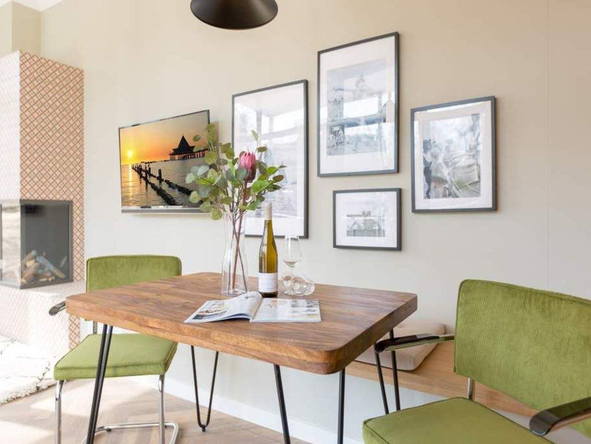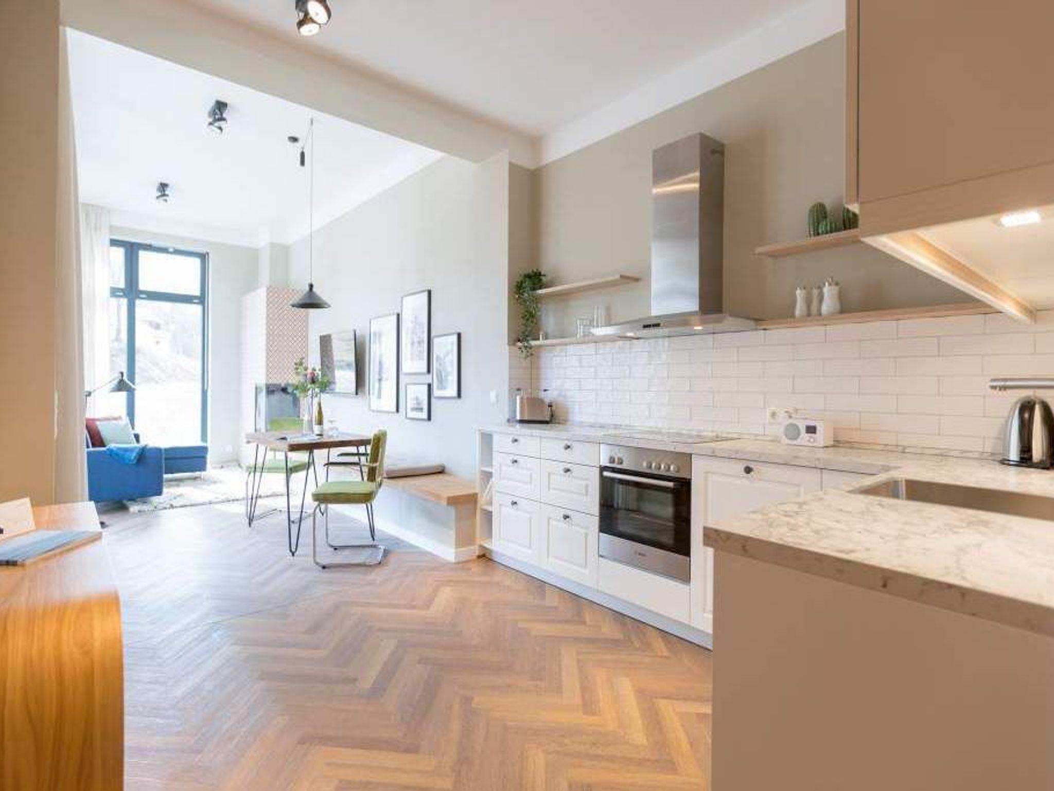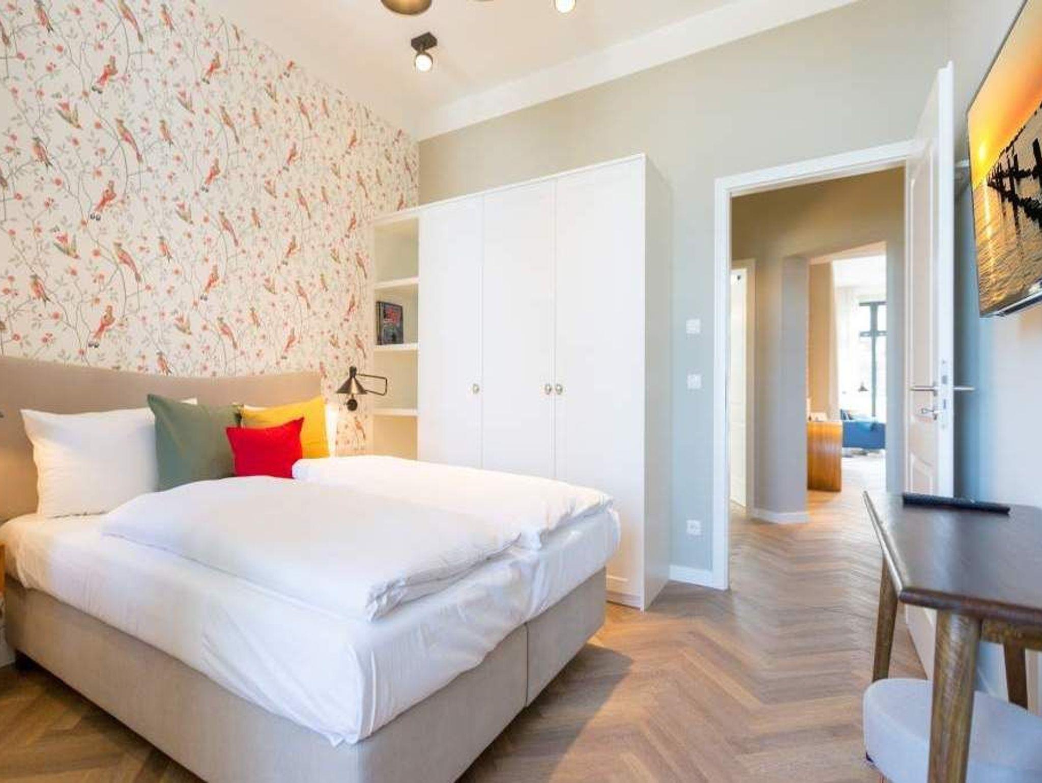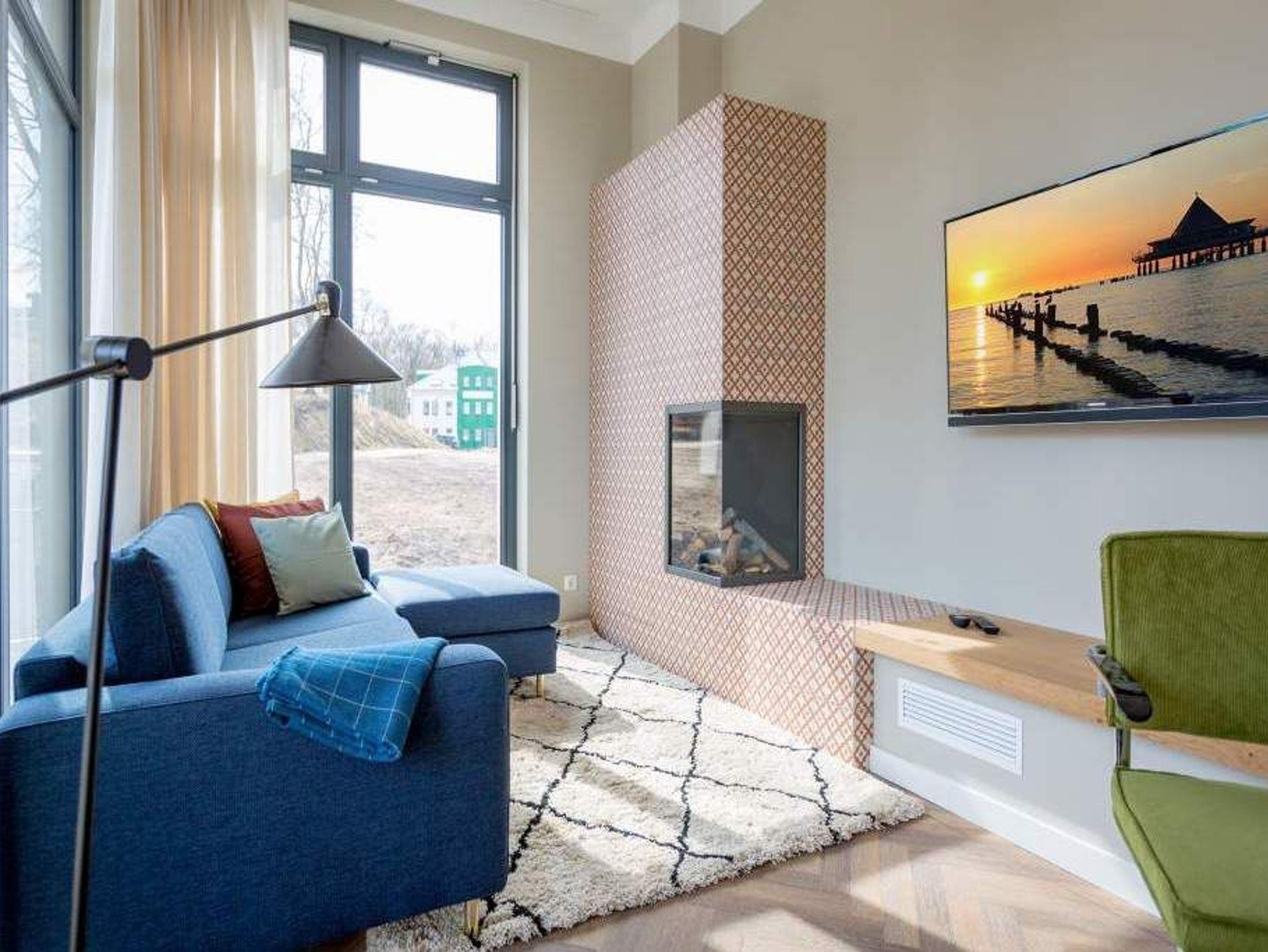 Ein gemütliches und in skandinavischem Design konzipiertes Urlaubsdomizil erwartet Auszeitfreudige im Appartement 4 im Obergeschoss der Villa Bellevue. Zweieinhalb stilvoll eingerichtete Zimmer bietet die 72 Quadratmeter große Wohnung. Hochwertige Materialien wie das edle Fischgrät-Parkett oder die stylischen Design-Möbel, der wunderschöne Gas-Kamin oder die edlen Tapeten geben Ihrem Urlaub einen exklusiven Rahmen. Bis zu drei Personen und ein Kleinkind bis drei Jahre (im Kinderreisebett) können es sich hier gut gehen lassen, am schönen Esstisch mit den Retro-Freischwingern dinieren oder auf der Sofalandschaft vor dem Kamin entspannen. Im Wohnzimmer sowie dem großen Schlafzimmer befinden sich Flat-TVs. Die Küche ist modern und voll ausgestattet. Markengeräte und erlesenes Geschirr machen das Kochen zum Erlebnis. Das Hauptschlafzimmer verfügt über ein komfortables Boxspringdoppelbett (1,60 m x 2,00 m) und einen großen, geräumigen Schrank. Zum Schlafzimmer gehört eine Veranda, in der ein zweites Boxspringbett (0,90 m x 2,00 m) in erholsame Urlaubsträume entführt. Das wahrhaft großzügige Badzimmer ? mit einer traumhaften Kombination aus Vintage- und Metrofliesen gestaltet ? bietet eine Regendusche, einen Waschtisch und ein WC. Tageslicht lässt diesen Raum schon morgens hell und freundlich erscheinen. Als kleines Schmankerl können Sie von hier aus genauso wie auch aus dem Wohnzimmer auf den Balkon treten. Atmen Sie hier die Morgensonne und die frische Brise, die von der nur 400 Meter entfernten Ostsee herüberweht, tief in sich ein. Damit Sie sich in Ihrem Urlaub um nichts kümmern müssen, sind die Betten für Sie bereits bezogen und Handtücher liegen bereit. Zu der Wohnung gehört ein Pkw-Stellplatz.