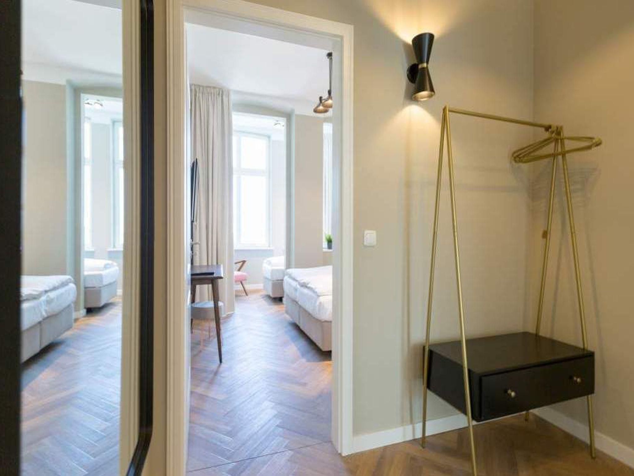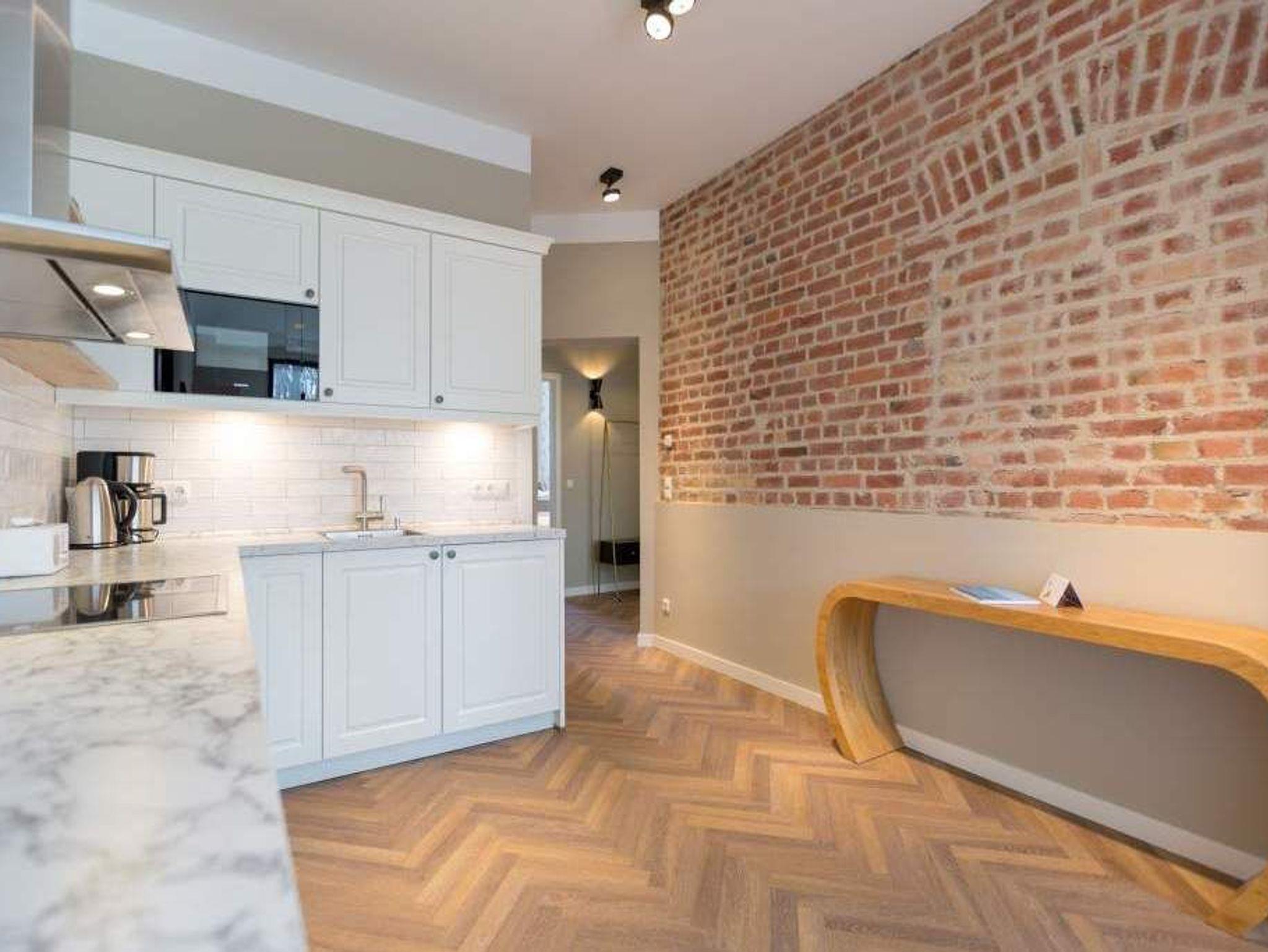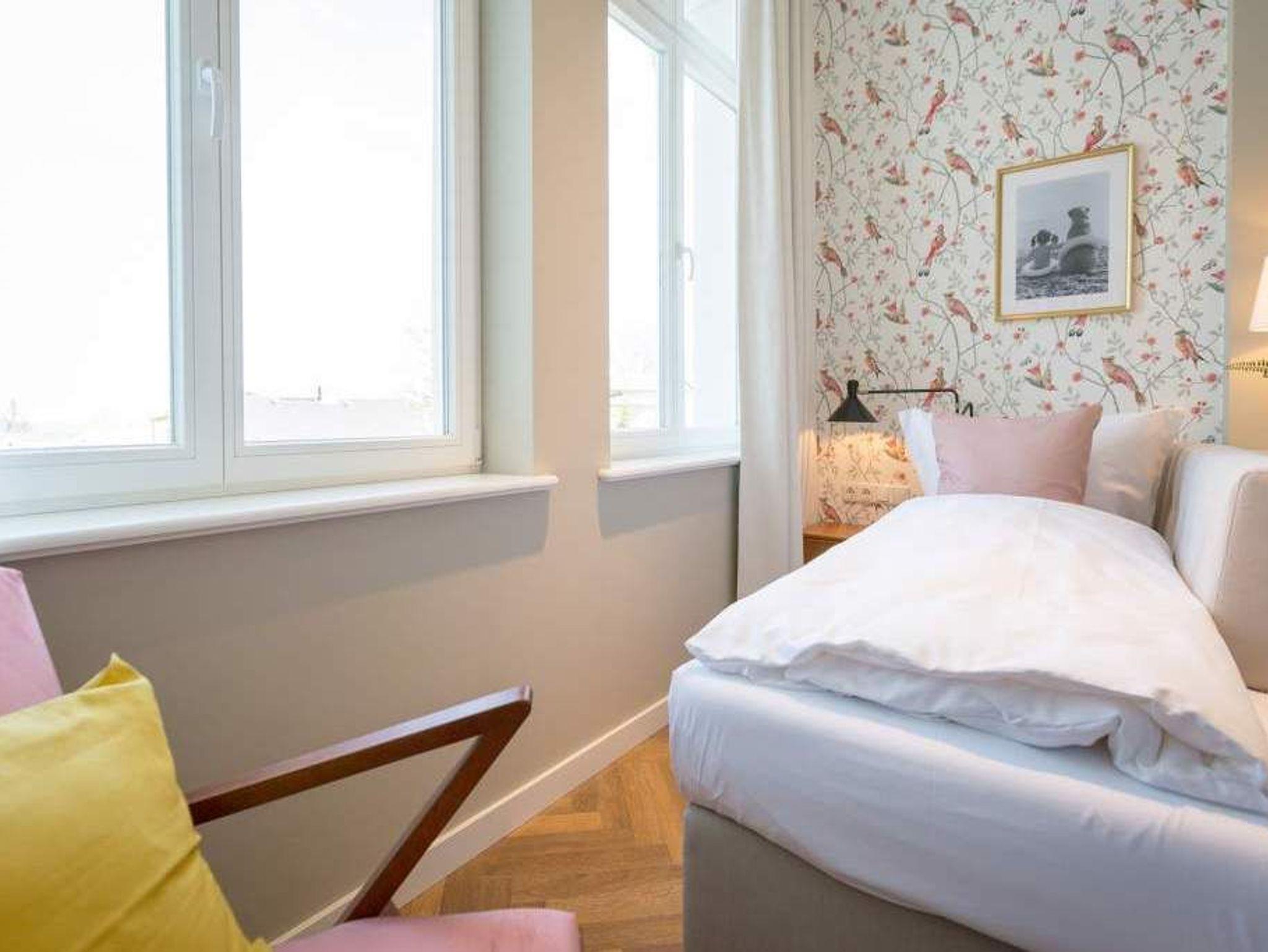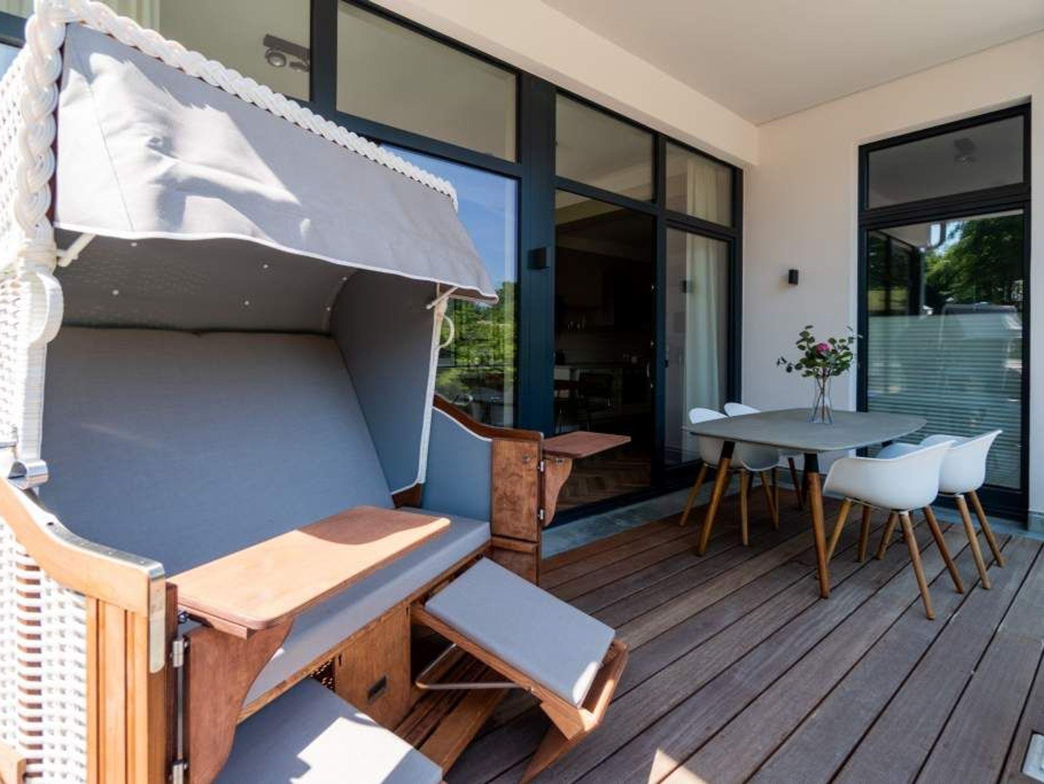 Ein gemütliches und in skandinavischem Design konzipiertes Urlaubsdomizil erwartet Auszeitfreudige im Appartement 4 im Obergeschoss der Villa Bellevue. Zweieinhalb stilvoll eingerichtete Zimmer bietet die 72 Quadratmeter große Wohnung. Hochwertige Materialien wie das edle Fischgrät-Parkett oder die stylischen Design-Möbel, der wunderschöne Gas-Kamin oder die edlen Tapeten geben Ihrem Urlaub einen exklusiven Rahmen. Bis zu drei Personen und ein Kleinkind bis drei Jahre (im Kinderreisebett) können es sich hier gut gehen lassen, am schönen Esstisch mit den Retro-Freischwingern dinieren oder auf der Sofalandschaft vor dem Kamin entspannen. Im Wohnzimmer sowie dem großen Schlafzimmer befinden sich Flat-TVs. Die Küche ist modern und voll ausgestattet. Markengeräte und erlesenes Geschirr machen das Kochen zum Erlebnis. Das Hauptschlafzimmer verfügt über ein komfortables Boxspringdoppelbett (1,60 m x 2,00 m) und einen großen, geräumigen Schrank. Zum Schlafzimmer gehört eine Veranda, in der ein zweites Boxspringbett (0,90 m x 2,00 m) in erholsame Urlaubsträume entführt. Das wahrhaft großzügige Badzimmer ? mit einer traumhaften Kombination aus Vintage- und Metrofliesen gestaltet ? bietet eine Regendusche, einen Waschtisch und ein WC. Tageslicht lässt diesen Raum schon morgens hell und freundlich erscheinen. Als kleines Schmankerl können Sie von hier aus genauso wie auch aus dem Wohnzimmer auf den Balkon treten. Atmen Sie hier die Morgensonne und die frische Brise, die von der nur 400 Meter entfernten Ostsee herüberweht, tief in sich ein. Damit Sie sich in Ihrem Urlaub um nichts kümmern müssen, sind die Betten für Sie bereits bezogen und Handtücher liegen bereit. Zu der Wohnung gehört ein Pkw-Stellplatz.