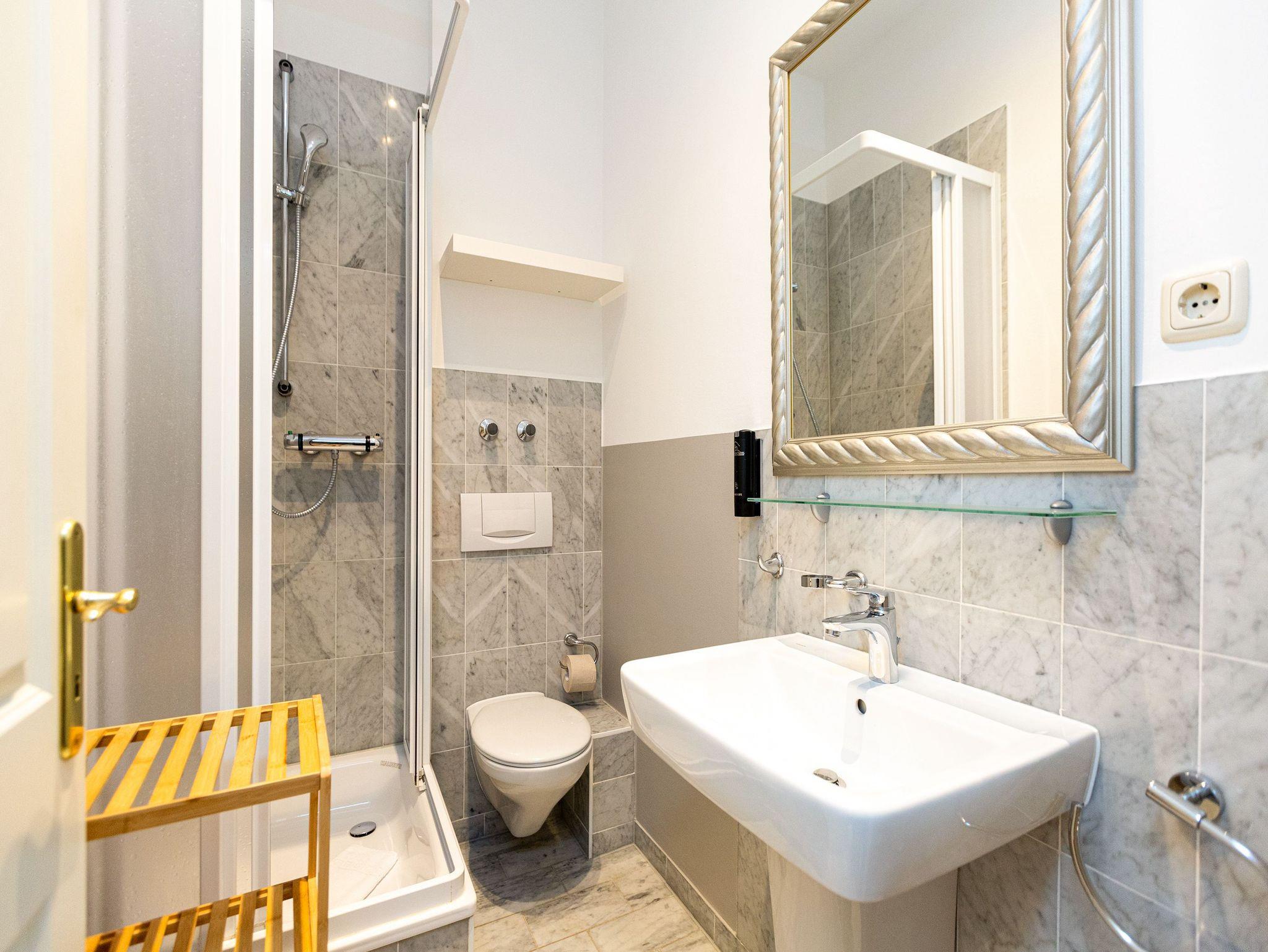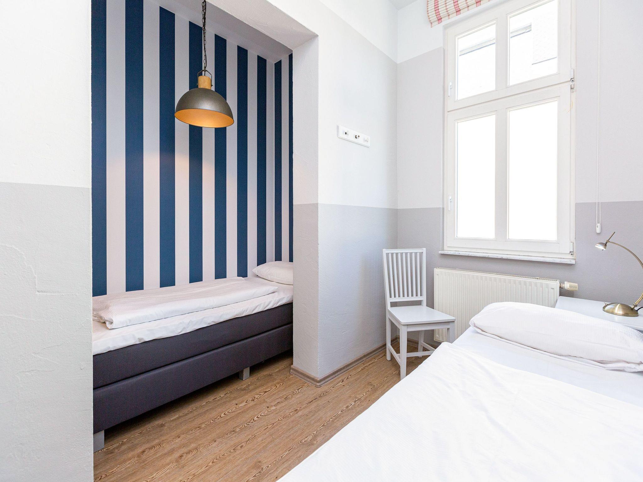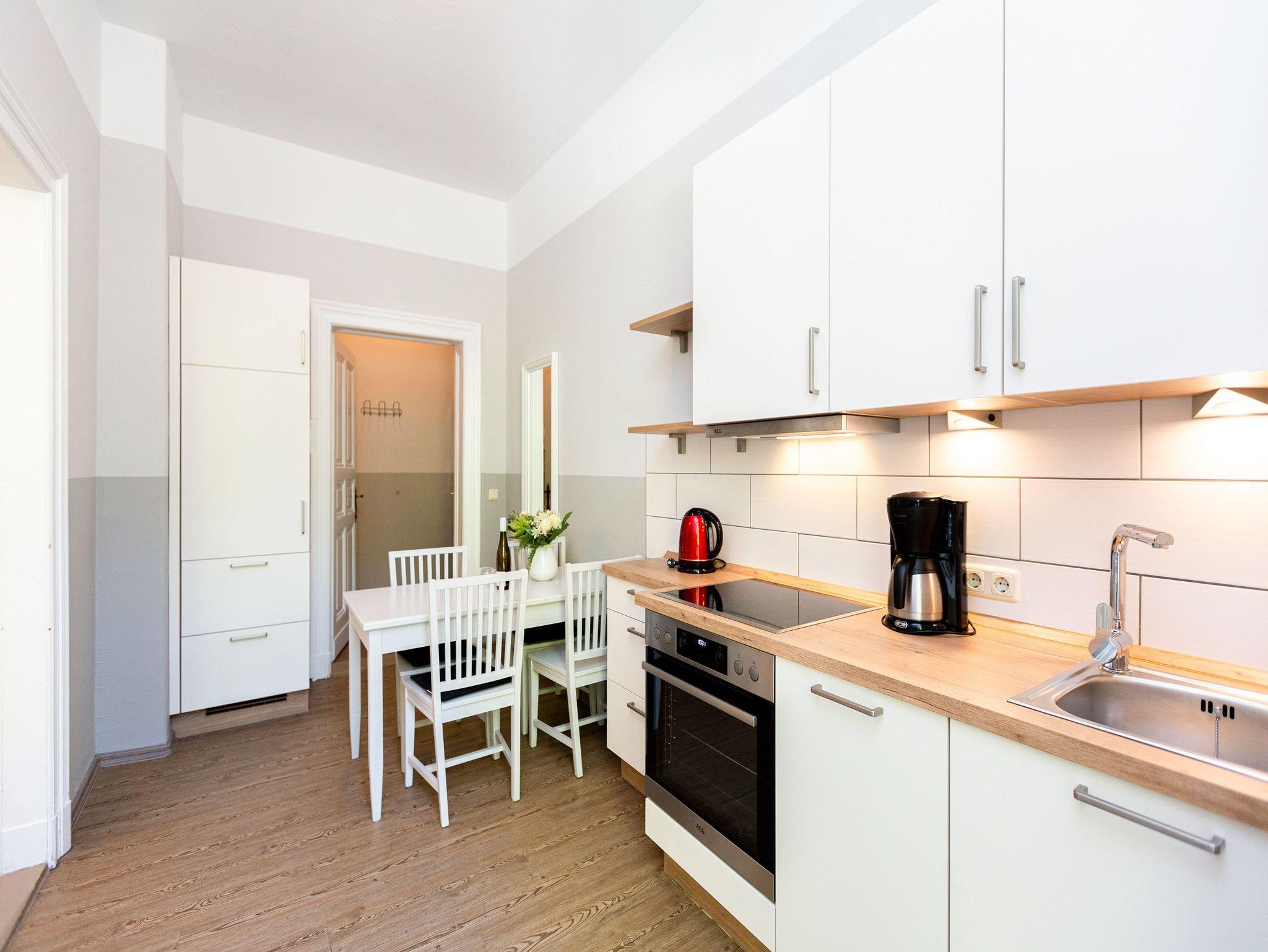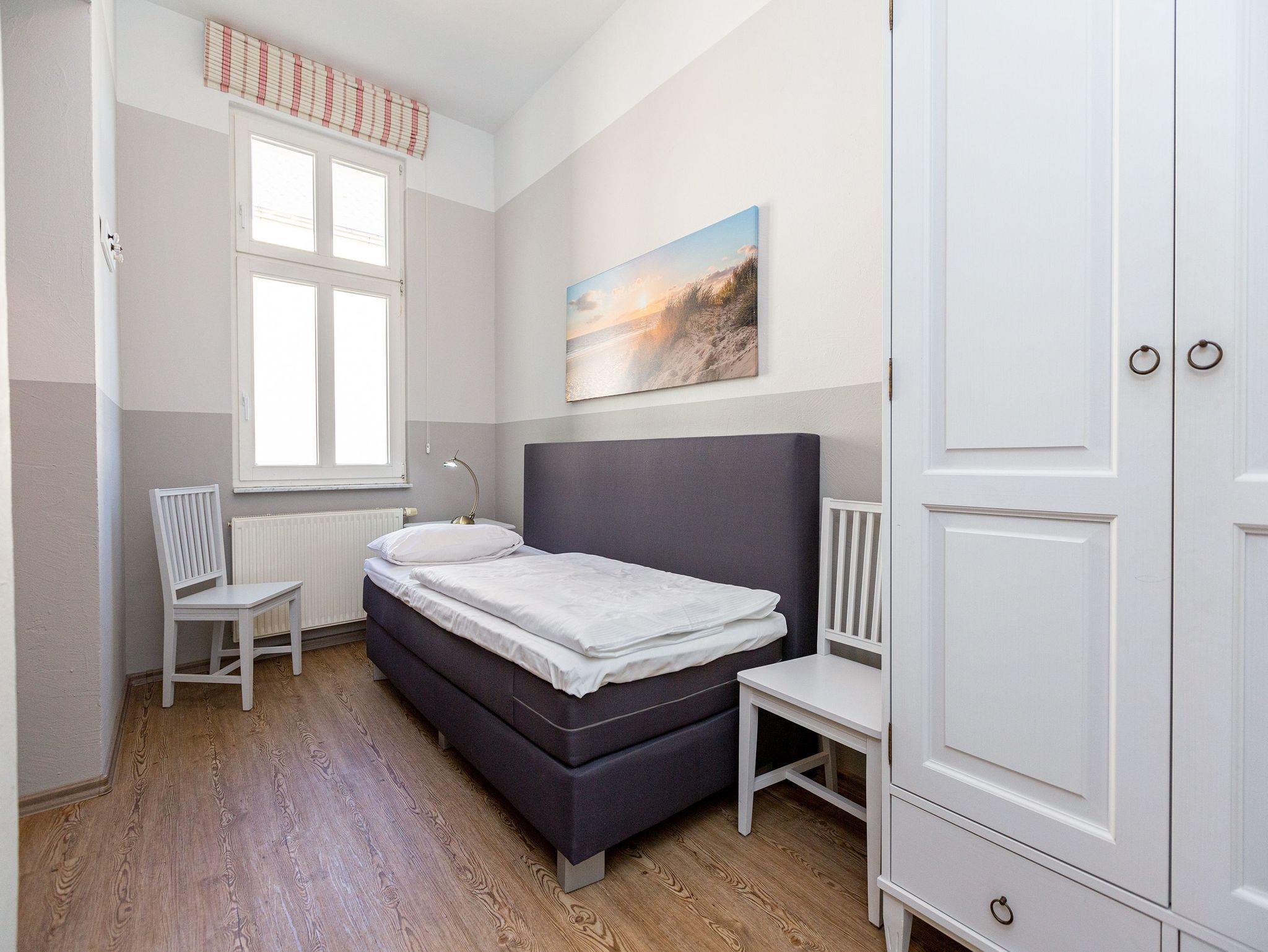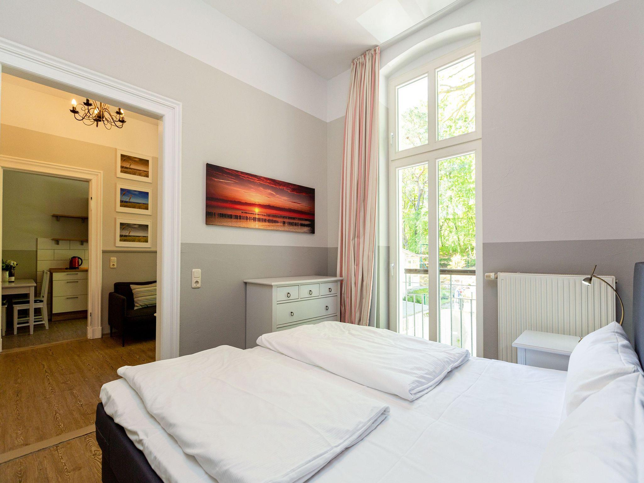 Von der Sonne verwöhnt wird dieses wunderschöne 3-Zimmer-Appartement Nummer 5 im 1. Stock der Villa Amelia. Zur Südseite hinaus gelegen können Sie sich auf eine helle, lichtdurchflutete Urlaubszeit auf 50 Quadratmetern freuen. Ob allein, zu zweit oder mit der ganzen Familie ? in den elegant eingerichteten Zimmern können Sie wunderbar abschalten. Drei Erwachsene oder zwei Erwachsene und zwei Kinder haben in diesem Urlaubsdomizil Platz. Die hohen Räume der alten Villa spenden im Sommer angenehme Kühle. Viel Platz zum Kuscheln und Relaxen bieten das schicke Vintage-Sofa und die dazu gehörige Sitzgruppe. Ein großer Flat-TV sorgt für Unterhaltung. In der separaten, doch zum Wohnzimmer hin offenen Küche befindet sich auch ein schöner Essplatz. Sie ist mit Geräten und Geschirr ausgestattet. Sonne pur tanken, können Sie auf dem Balkon vor dem Wohnzimmer und der Küche. Eines der beiden Schlafzimmer besitzt ein komfortables Boxspringdoppelbett. Im zweiten Schlafzimmer stehen zwei Boxspringeinzelbetten ? eines davon in einem gemütlichen Alkoven. In den Zimmern gibt es ausreichend Ablagefläche für die Urlaubsgarderobe. Das Bad verfügt über eine Dusche, WC und einen Waschtisch. Für Ihren Komfort liegen Handtücher bereit und die Betten sind bezogen. Das WLAN Netz im Haus kann kostenfrei genutzt werden. Auf Wunsch stellen wir für unsere kleinen Gäste ein Kinderreisebett (ohne zusätzliche Matratze [&] Bettzeug) und einen Kinderhochstuhl (gegen einen Aufpreis) zur Verfügung.