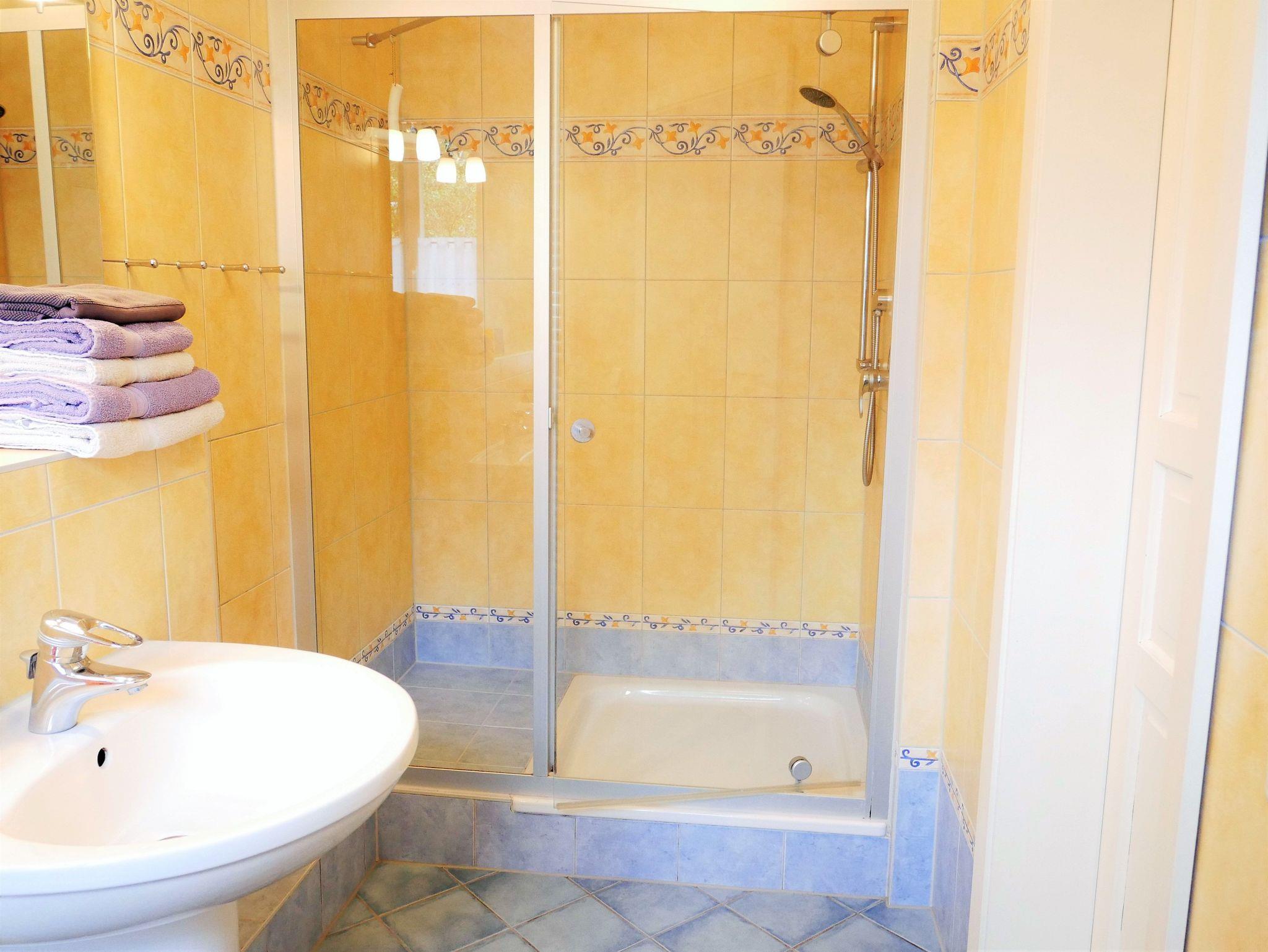 Im Bad befinden sich eine Dusche und WC in den Farben Gelb/Blau. Zu dieser Wohnung gehört eine Terrasse (zur Südseite) mit Sitzmöbeln.