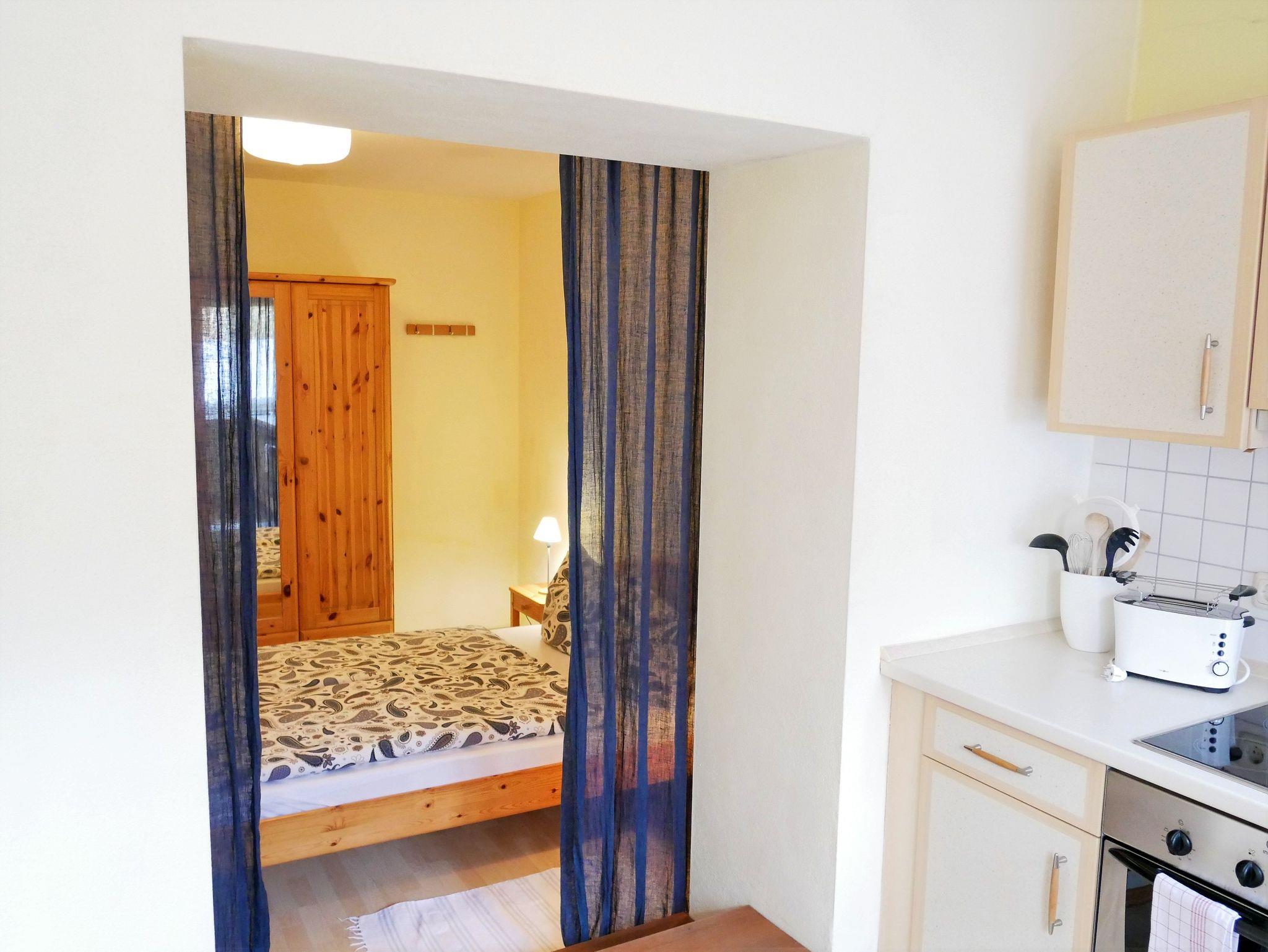 Das Schlafzimmer verfügt über ein Doppelbett 1,40m x 2,00m, einen Kleiderschrank (Raum ohne Fenster, aber zur einen Seite mit einer verglasten Tür und zur anderen Seite mit einem Vorhang).