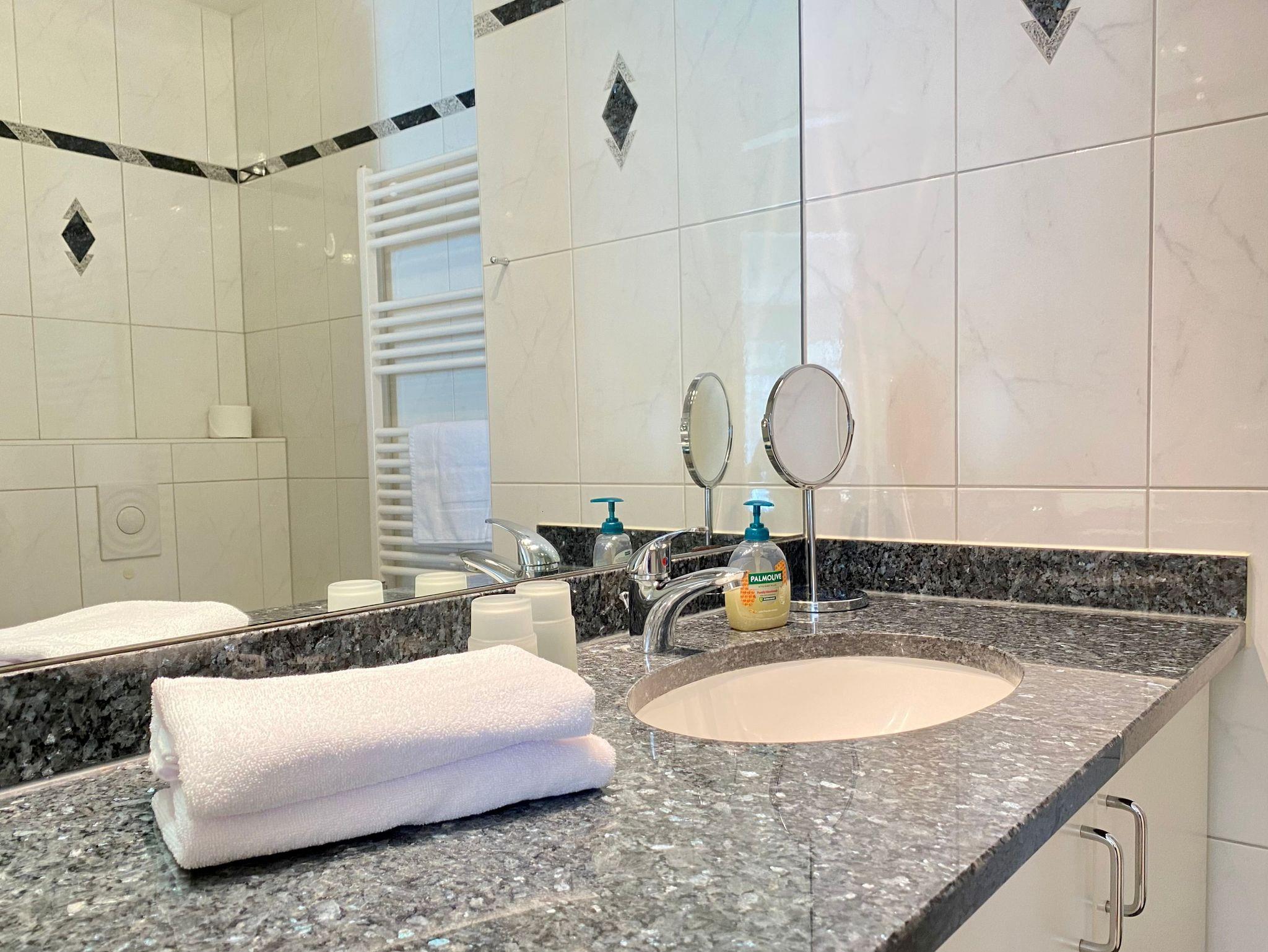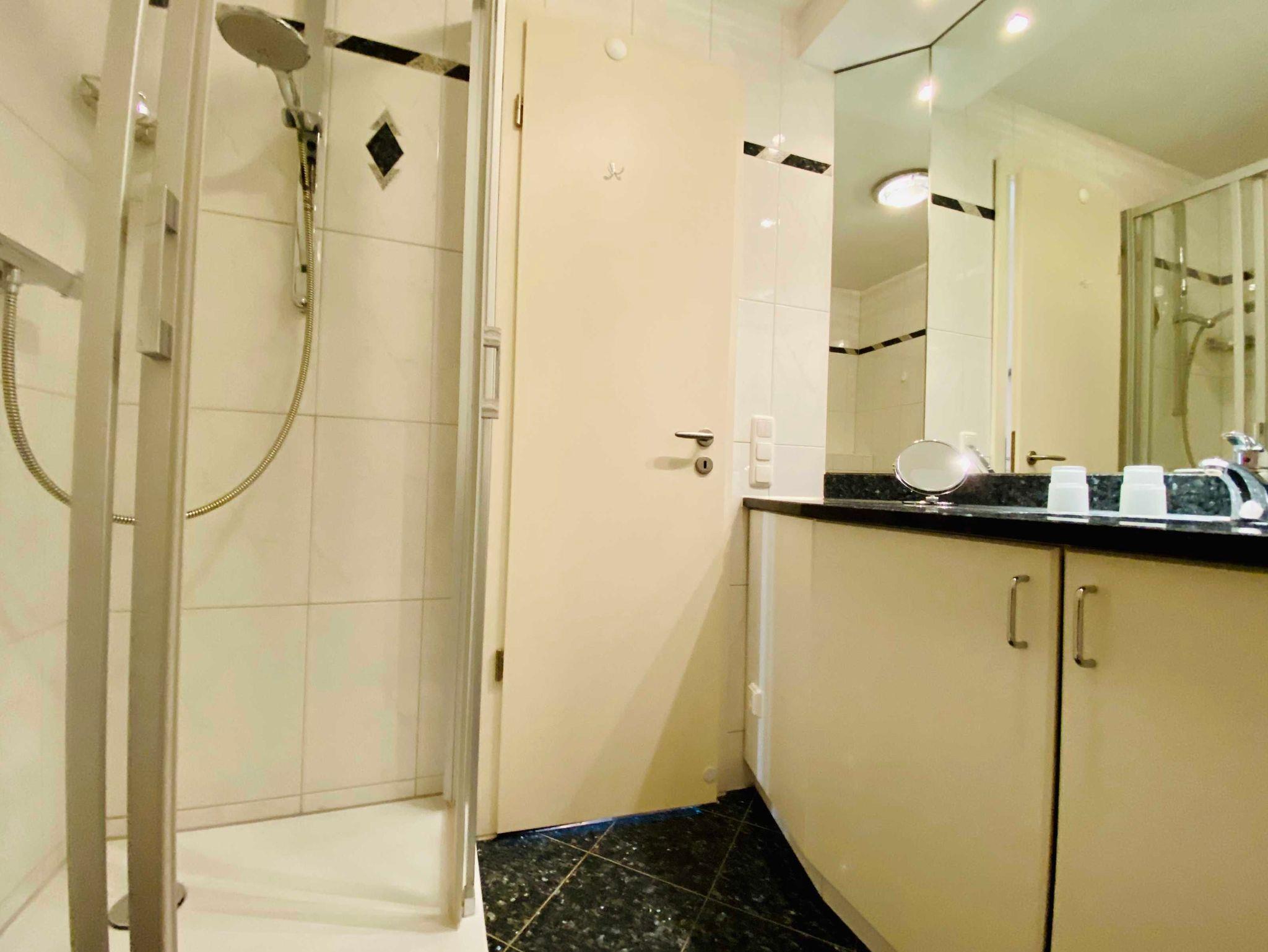 Das Badezimmer ist mit einer Dusche ausgestattet. Ein überdachter Balkon Richtung Park lädt zum entspannen ein.