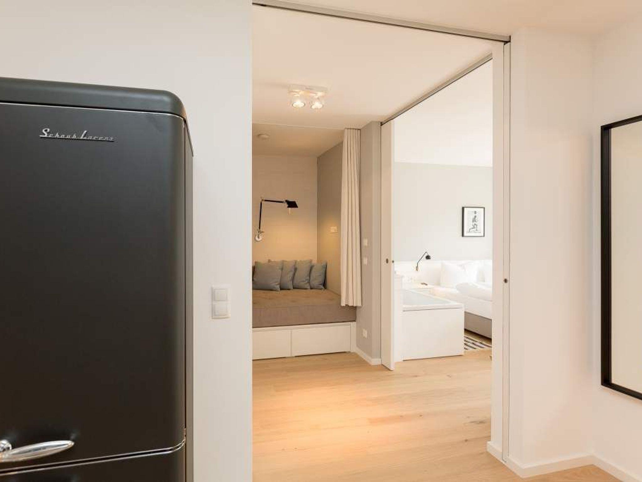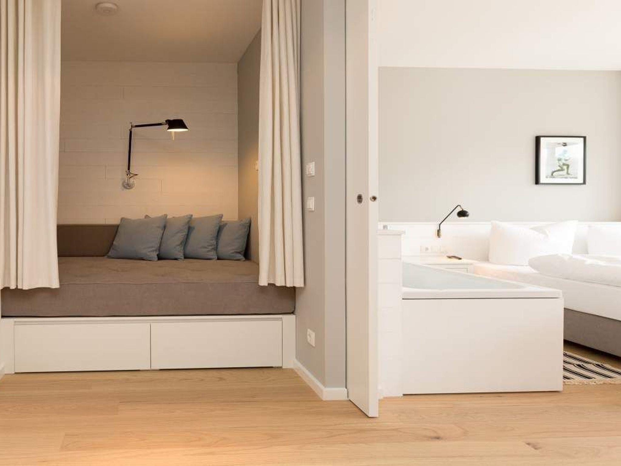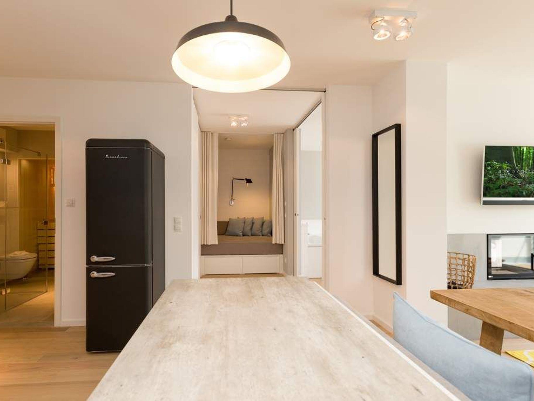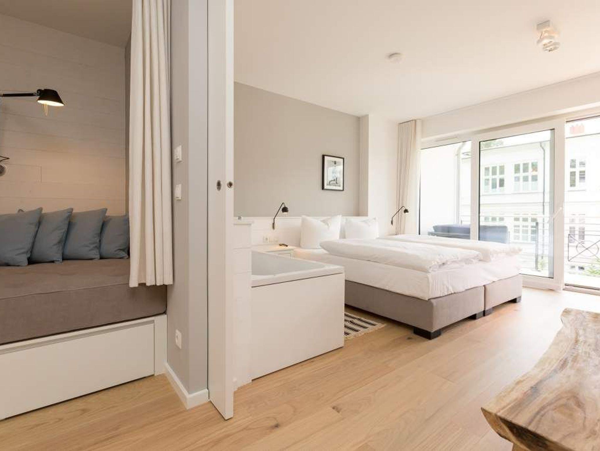 Dieses Appartement ist außergewöhnlich. Die Nummer 08 im zweiten Obergeschoss der Villa Strandgrün in Heringsdorf bietet auf 68 Quadratmetern stylisches Understatement und modernes Wohndesign. Platz ist hier für drei bis vier Personen. Design- und Echtholzmöbel gehen hier eine wunderbar harmonische Liaison mit Industrial Chic ein. Die offene und hochwertig ausgestattete Küche mit großem Vintage-Kühlschrank gibt den Blick auf einen modern und komfortabel eingerichteten Wohnraum frei. An dem großen Echtholztisch lässt es sich wunderbar dinieren. Vom bequemen Sofa aus schauen Sie auf den Flat-TV oder den extravaganten Röhrenkamin, der auch vom Schlafzimmer aus seine romantische Atmosphäre verbreitet. Der Süd-Westbalkon, mit gemütlichen Loungemöbeln ausgestattet, lädt zum Entspannen und Sonne-tanken ein. Im Schlafzimmer wartet ein 1,80 m x 2,00 m großes Doppelboxspringbett nur darauf, Ihnen wunderbare Träume zu schenken. Baden im Schlafzimmer oder schlafen im Bad? Dieses Appartement bietet Ihnen ein ganz besonderes Schmankerl. Denn mit der freistehenden Badewanne direkt im Schlafzimmer können Sie sich herrlich entspannen und gleich danach ins Bett schlüpfen. Für eine dritte und vierte Person gibt es eine gemütliche Schlafkoje (Doppelbett 1,47 m x 1,97 m), die auf Wunsch mit Schiebetüren verschlossen werde kann. Im geräumigen Bad mit Dusche, Waschtisch und WC ist eine Panorama-Sauna eingebaut. Außerdem verfügt die Wohnung über ein Gäste-WC. Das WLAN ist für Sie kostenfrei. Für Ihr uneingeschränktes Urlaubsgefühl sind die Betten bezogen und Handtücher liegen bereit. In der Tiefgarage gibt es einen Pkw-Stellplatz.