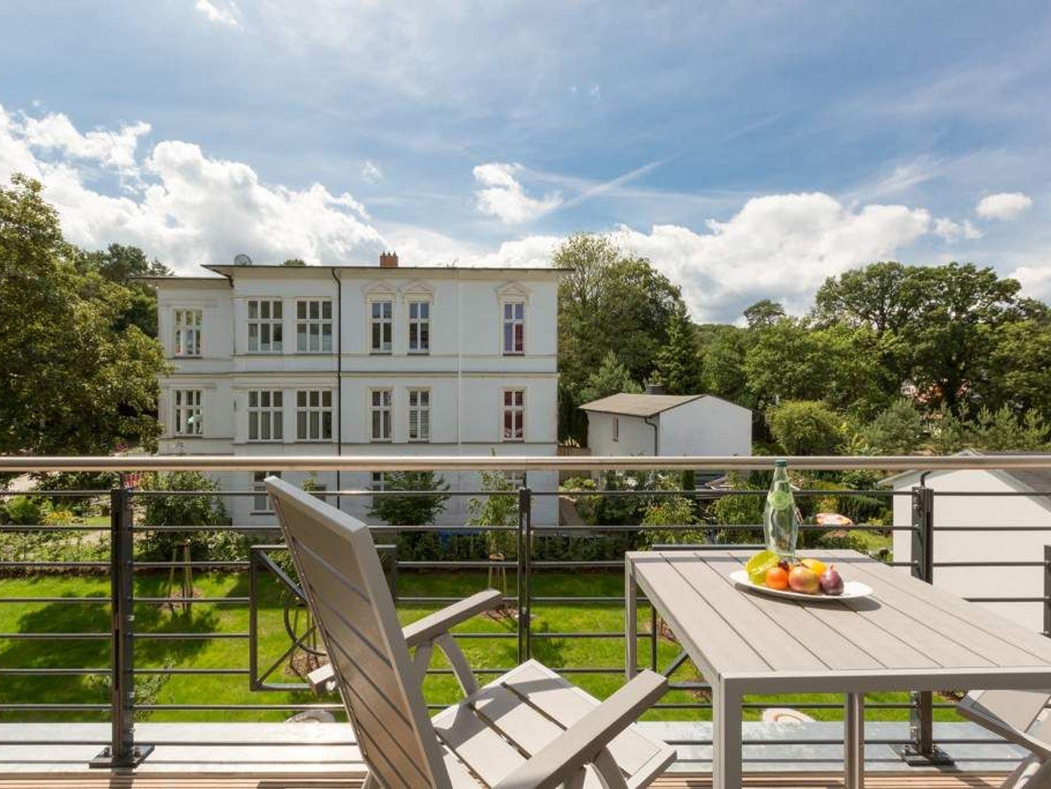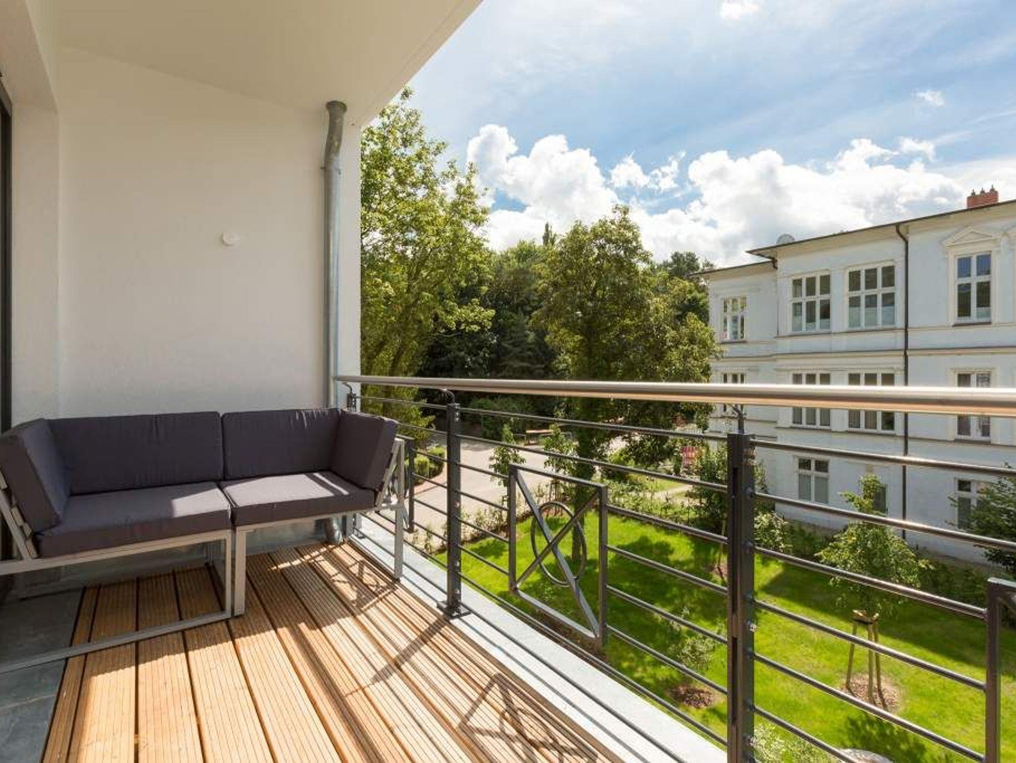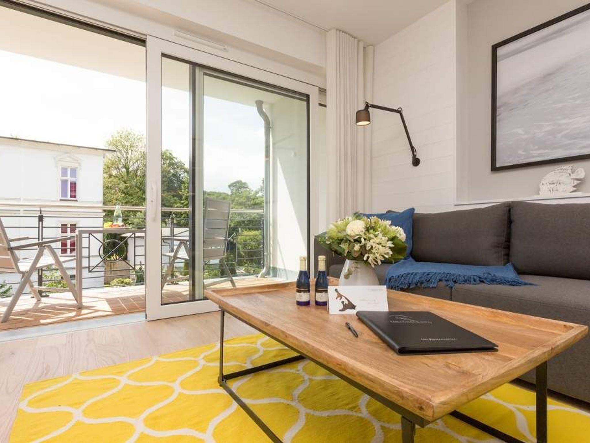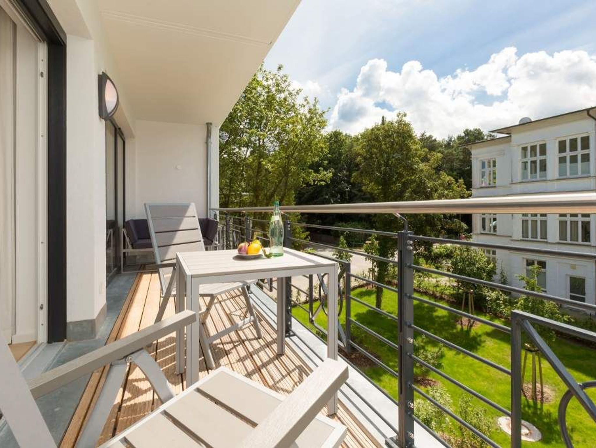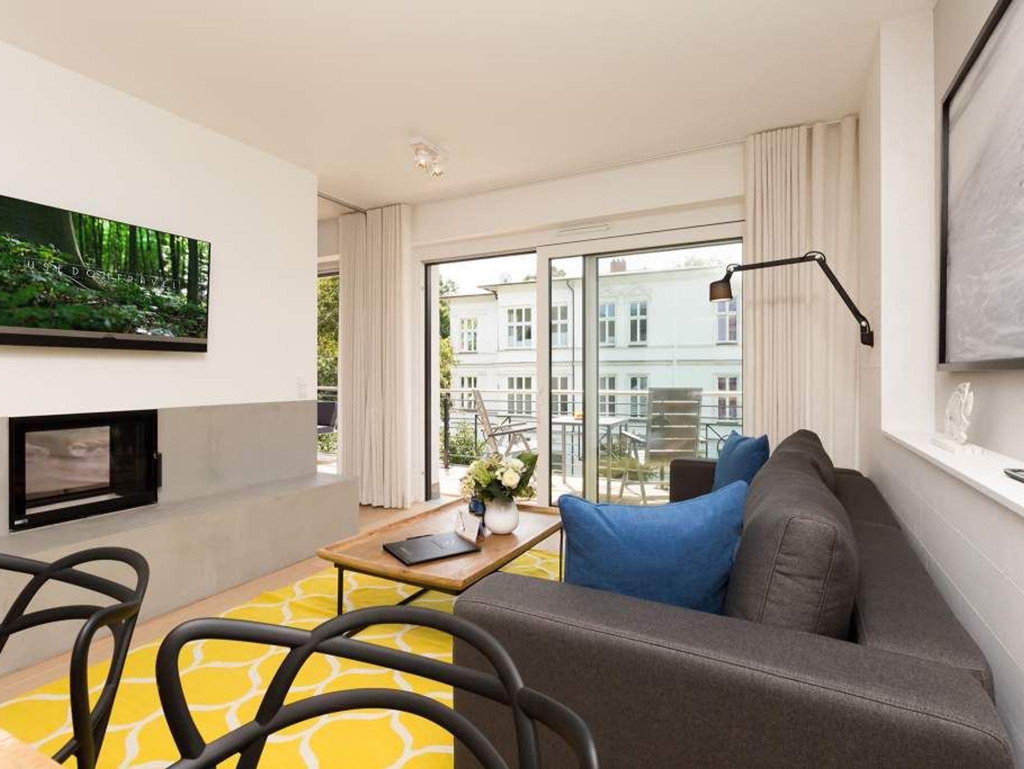 Vogelzwitschern und das sanfte Rauschen der Ostsee: Umgeben von wunderschönen, alten Bäumen atmet die 2017 fertig gestellte Villa Strandgrün das Flair der sie umgebenden Bädervillen. Mit seinen Balkonen und Erkern, die die Fassade untergliedern und auflockern, passt sich das strandnahe (100 Meter) Urlaubsdomizil angenehm in das Bild der aufwendig sanierten Villen um sie herum ein und wirkt selbst wie eine Weiterführung der einst mondänen Architektur des 19. Jahrhunderts. Das stilvolle Äußere setzt sich im exklusiven und eleganten Wohndesign im Inneren fort. Jede Ferienwohnung verfügt über eine Sonnenterrasse oder mehrere Balkone. Besondere Highlights eines jeden Appartements sind der Kamin, eine Sauna und je zwei Bäder bzw. ein zusätzliches Gäste WC. Die großzügigen 3- und 4-Raum-Suiten wurden mit allem Komfort konzipiert und ausgestattet. Vom ASA-Geschirr bis zu den hochwertigen Designmöbeln steht das Wohlfühlen an erster Stelle. In der Tiefgarage gibt es für jedes Appartement einen Stellplatz. Außerdem steht für jede Wohnung ein Briefkasten am Haus zur Verfügung.