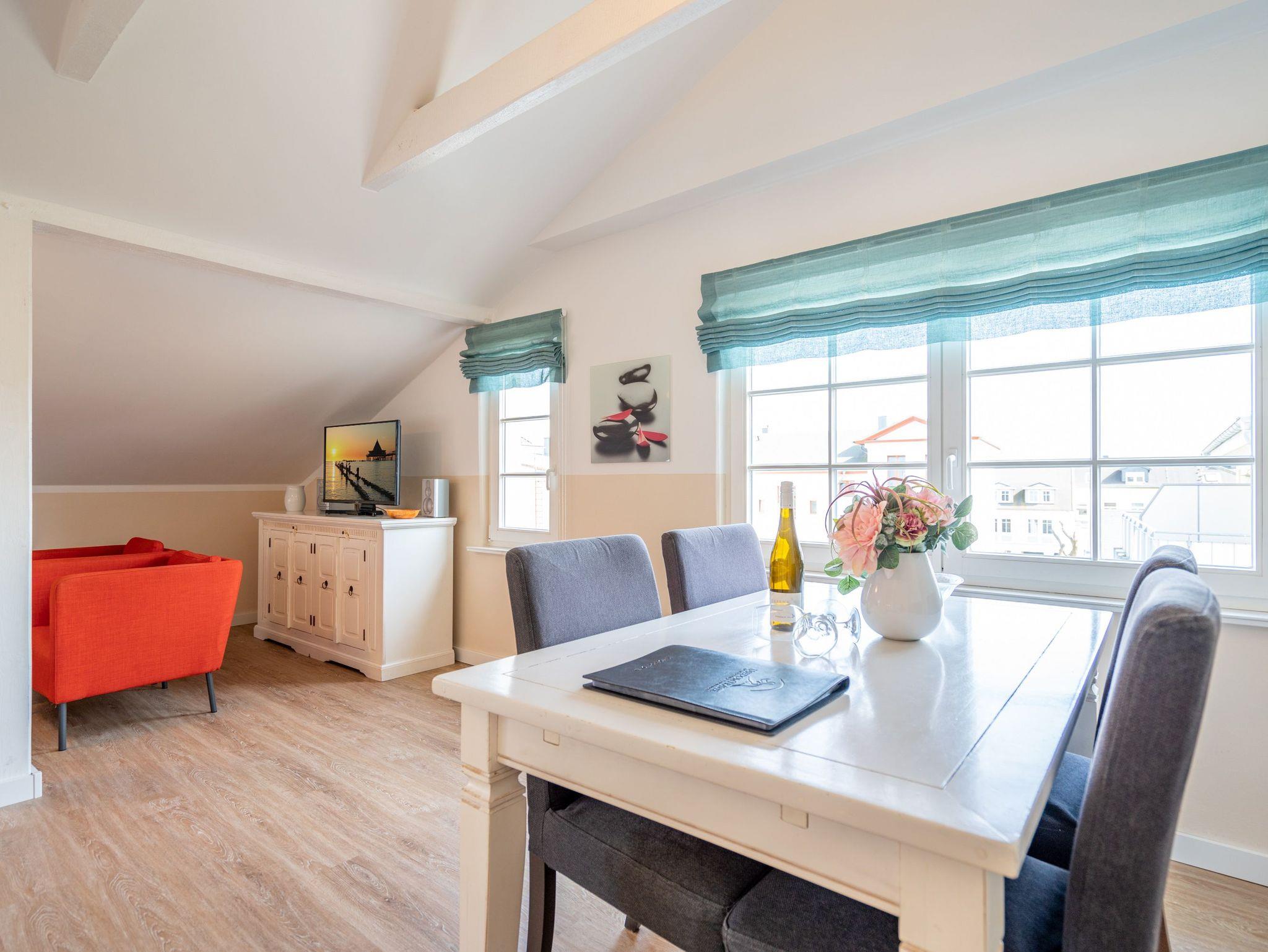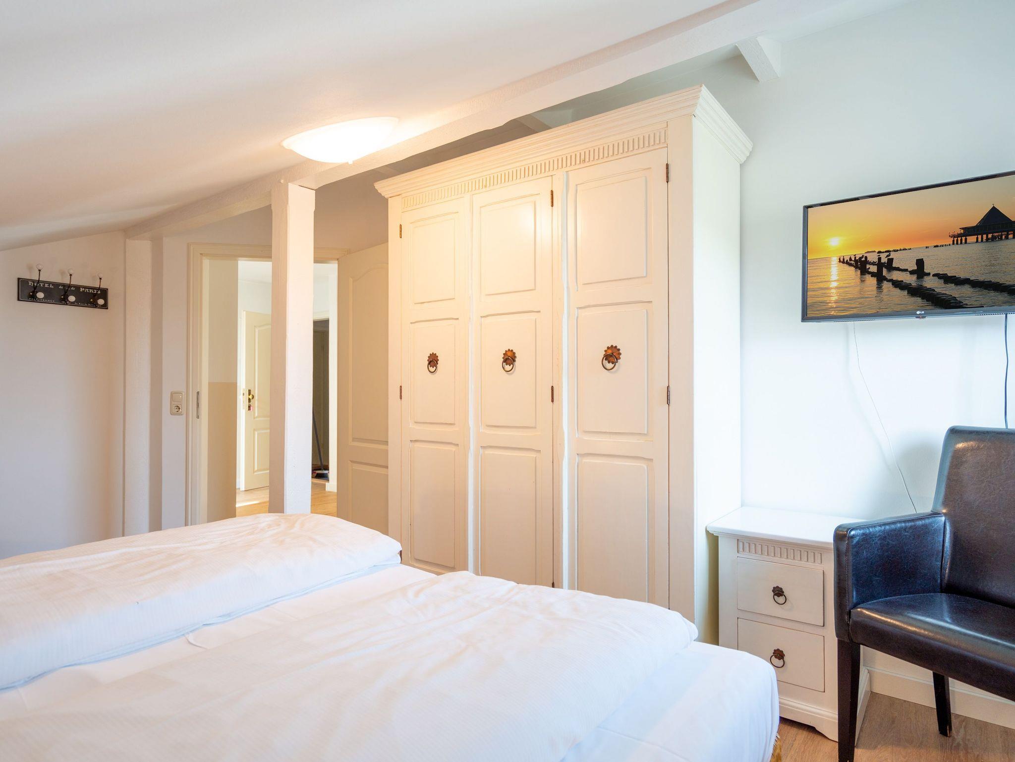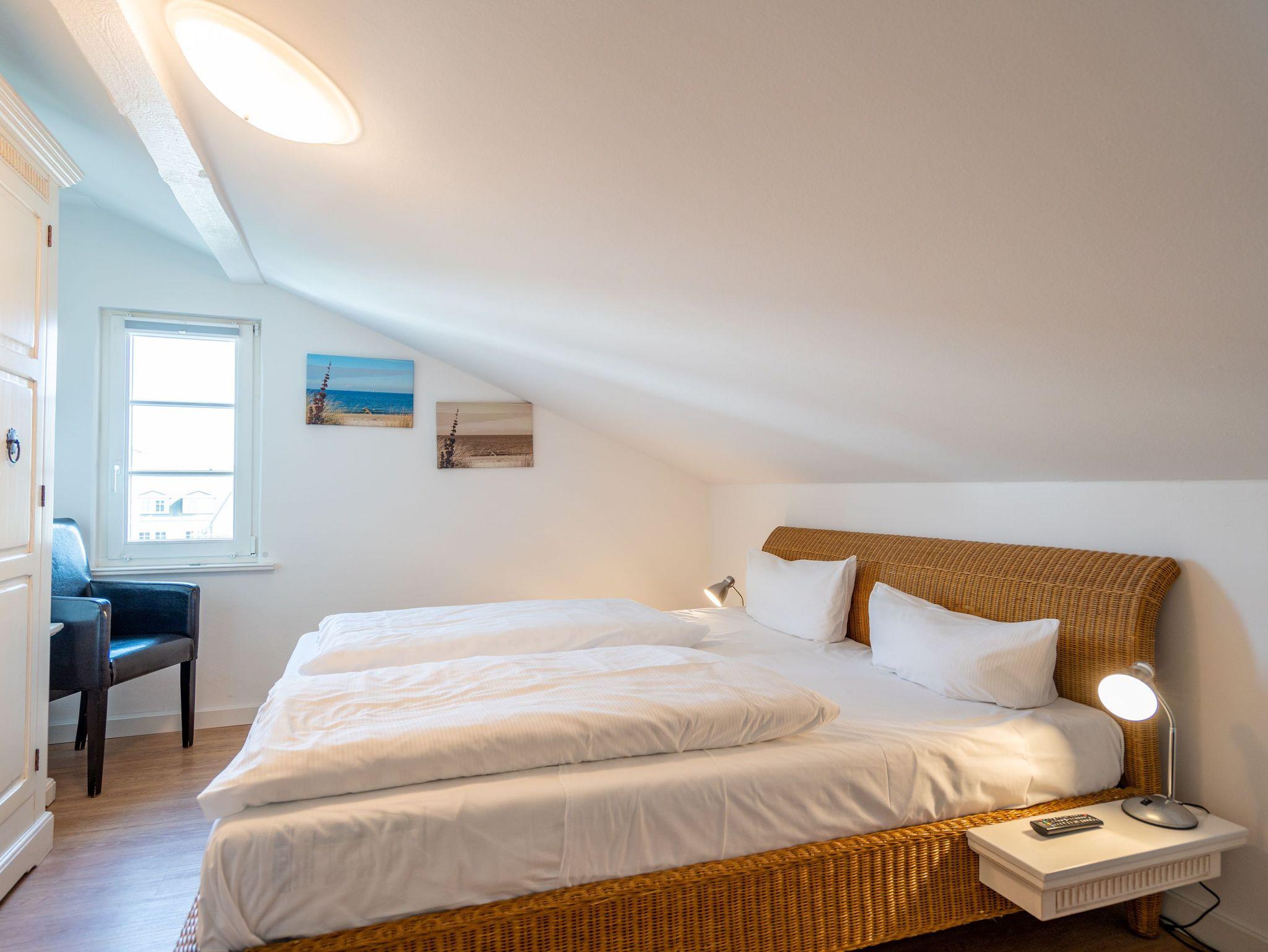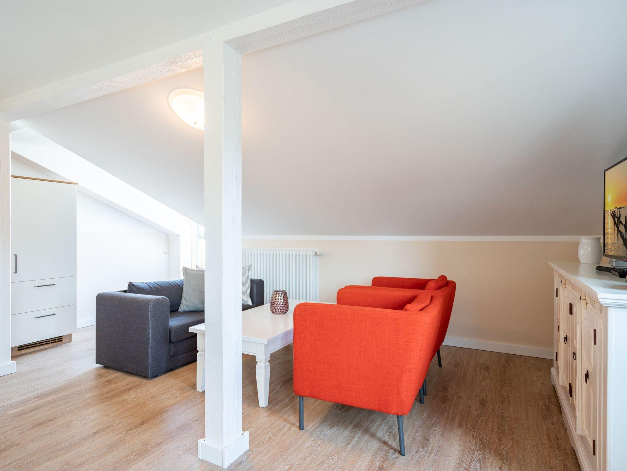 Diese 56 m² große Dachgeschosswohnung ist ideal für 2 Erwachsene und ein Kleinkind. Der Wohnbereich mit Sitzgruppe, TV, Küchenzeile und Essplatz ist hell und einladend. Von hier gelangen Sie direkt auf den schönen Balkon, wo Sie die Sonne genießen können. Das Schlafzimmer mit Doppelbett und das Bad mit Dusche und WC sorgen für erholsame Urlaubstage. Ein Pkw-Stellplatz am Haus steht zur Verfügung.
