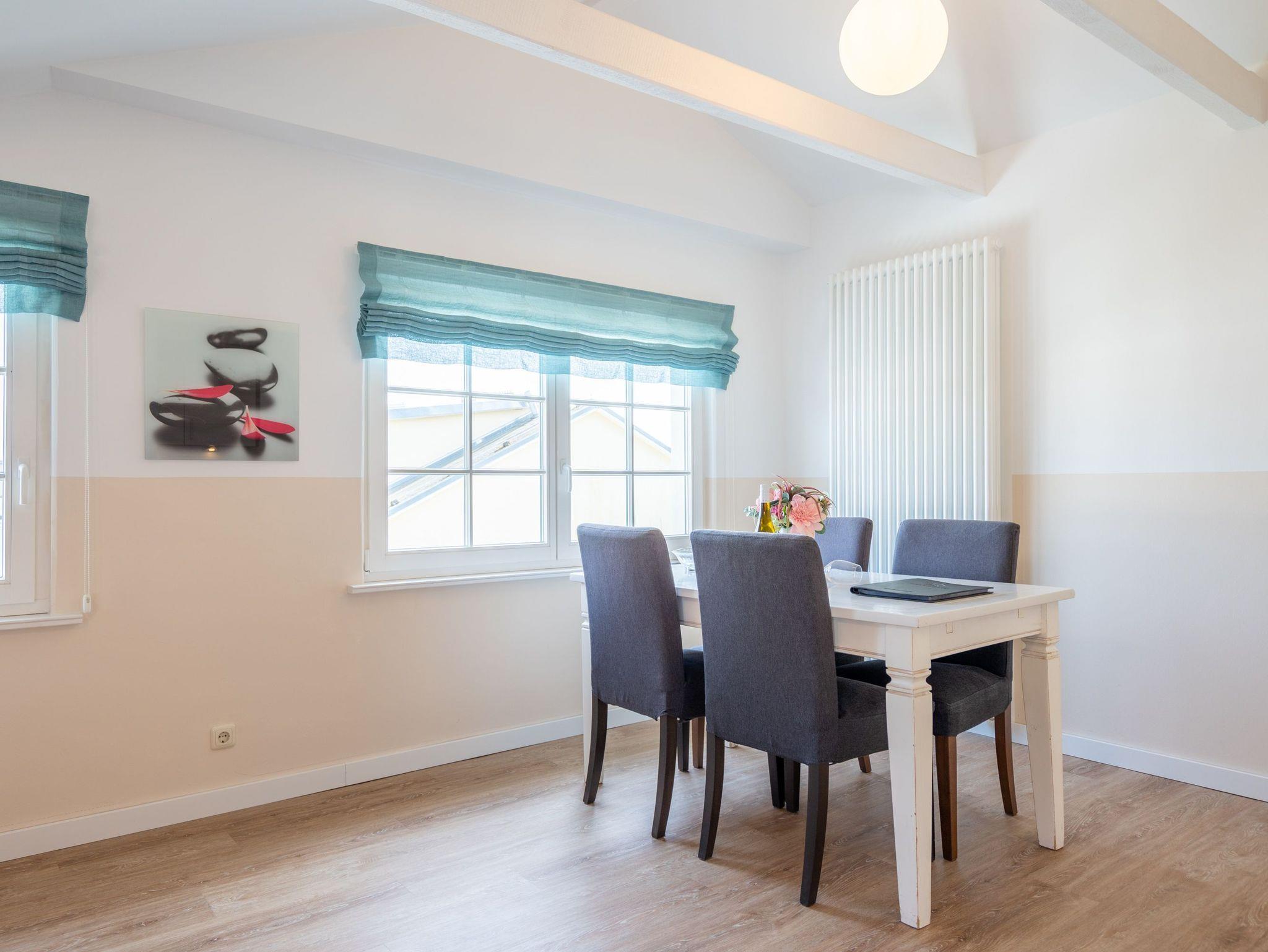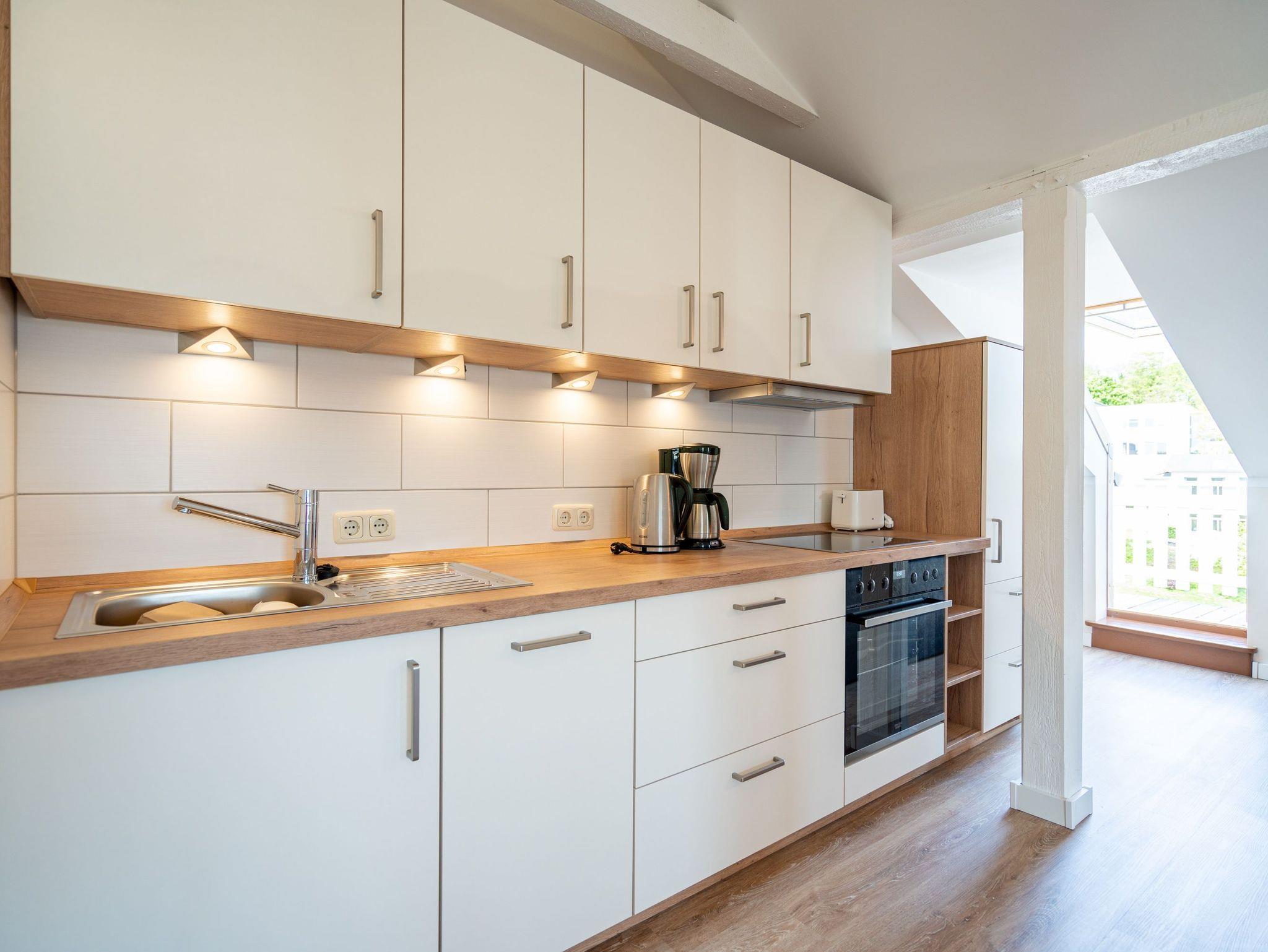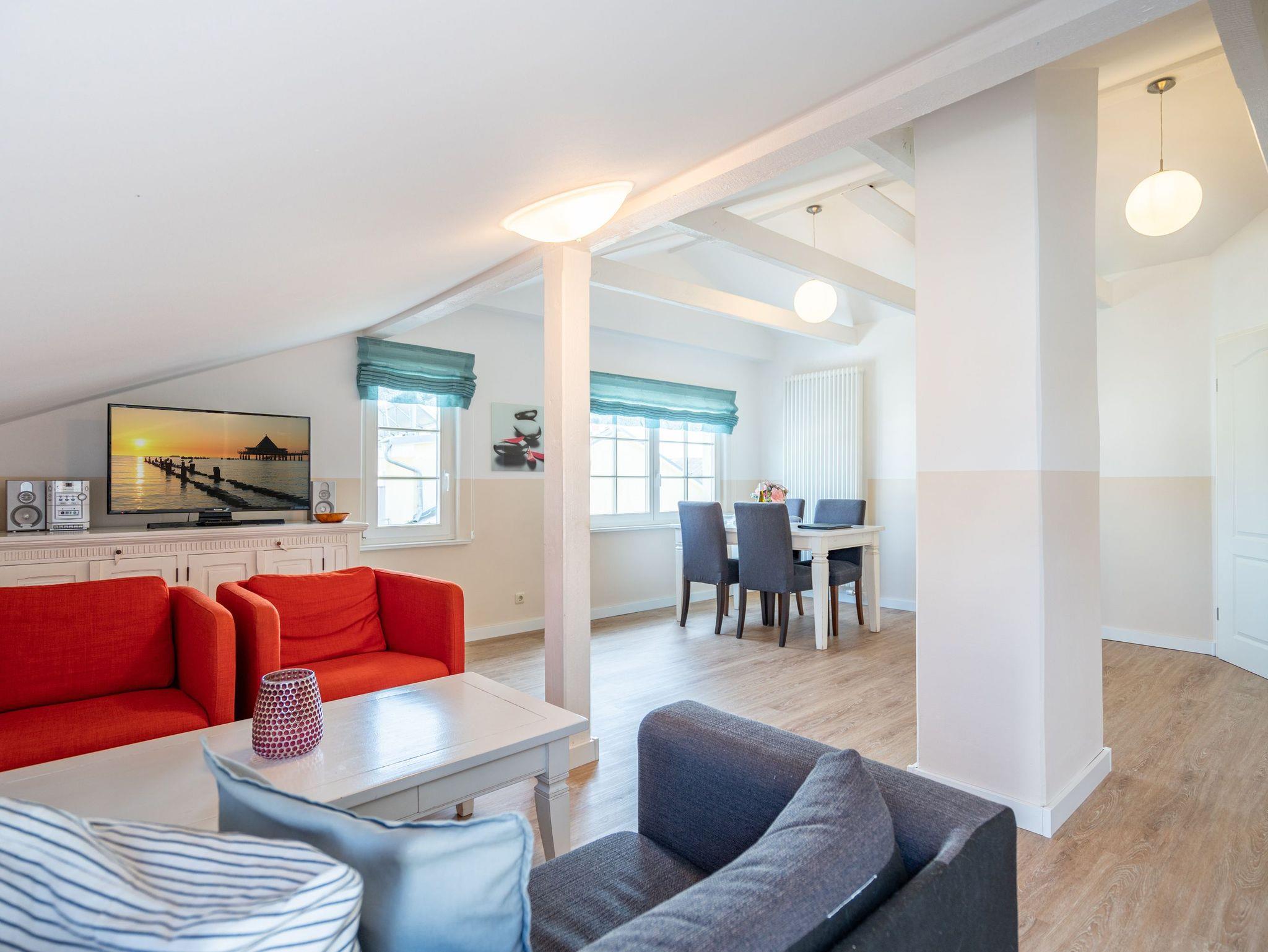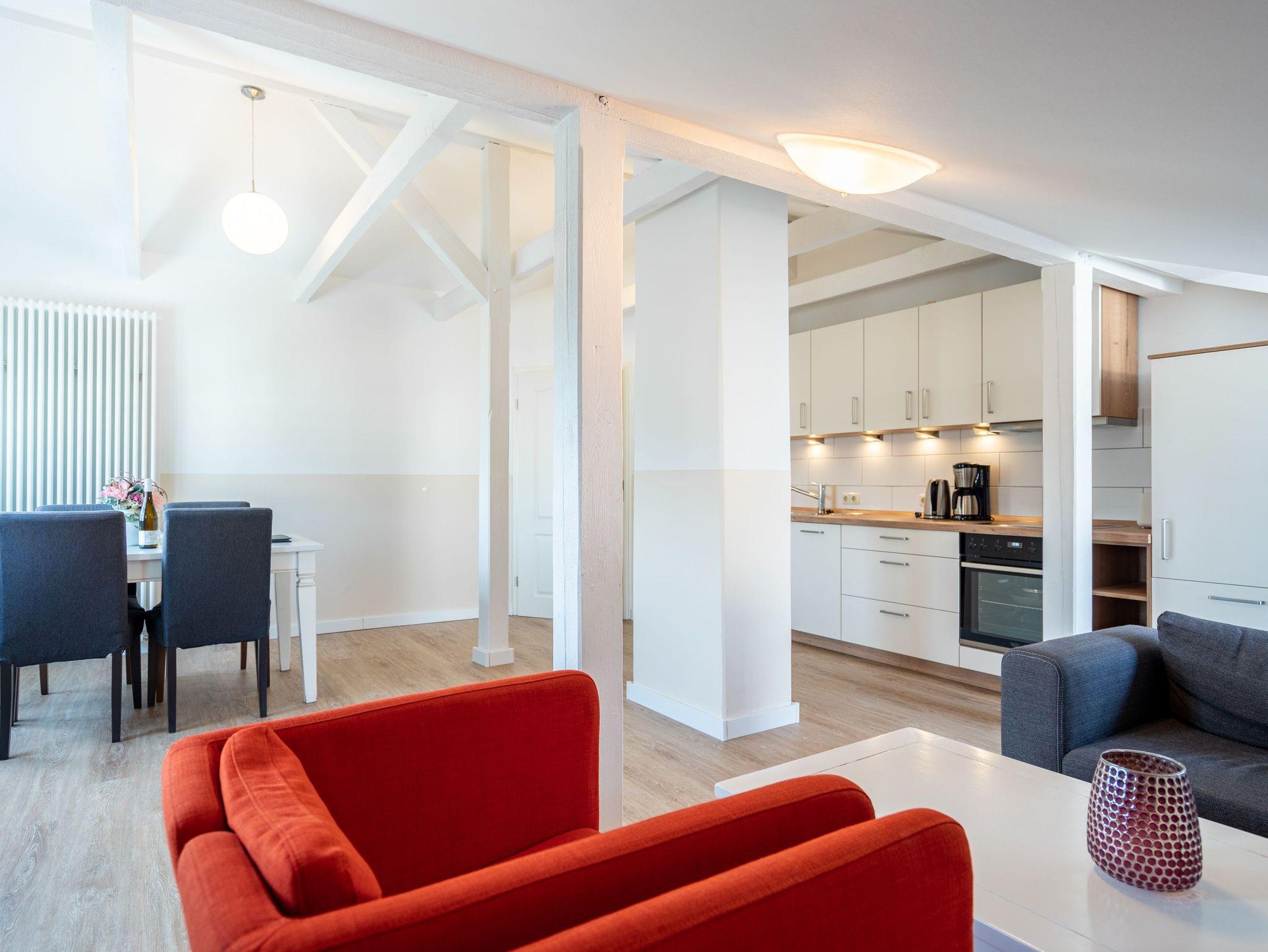 Diese 56 m² große Dachgeschosswohnung ist ideal für 2 Erwachsene und ein Kleinkind. Der Wohnbereich mit Sitzgruppe, TV, Küchenzeile und Essplatz ist hell und einladend. Von hier gelangen Sie direkt auf den schönen Balkon, wo Sie die Sonne genießen können. Das Schlafzimmer mit Doppelbett und das Bad mit Dusche und WC sorgen für erholsame Urlaubstage. Ein Pkw-Stellplatz am Haus steht zur Verfügung.