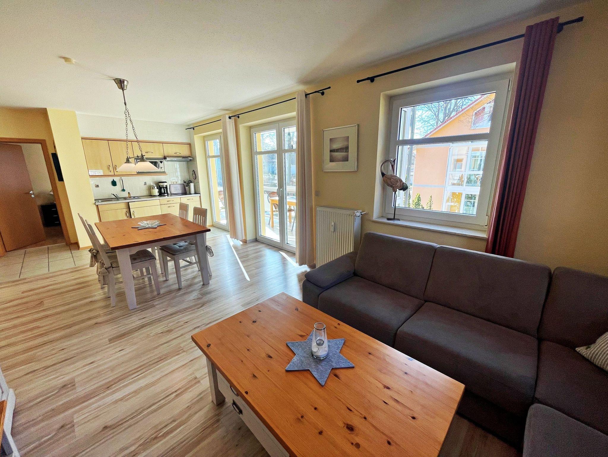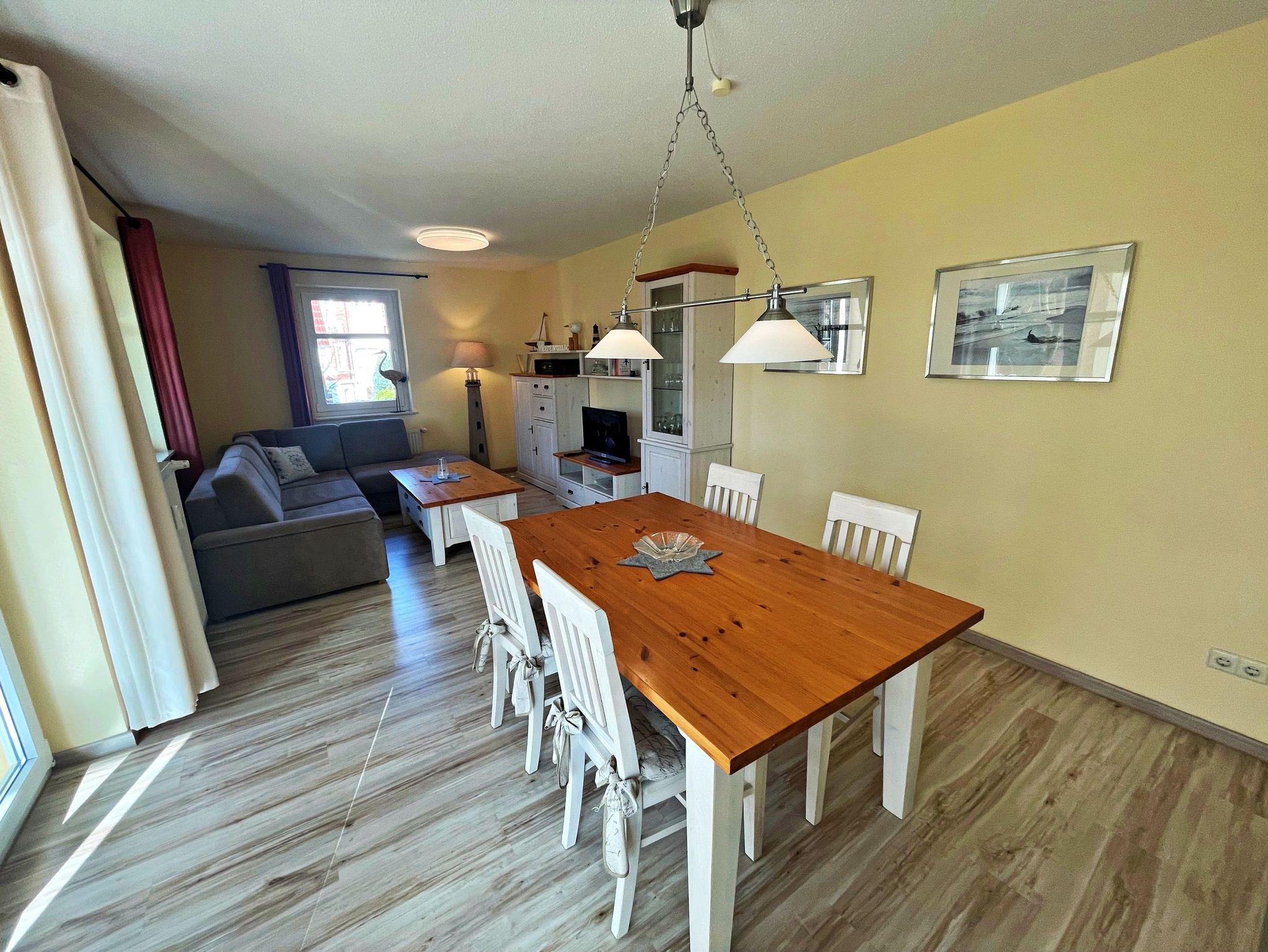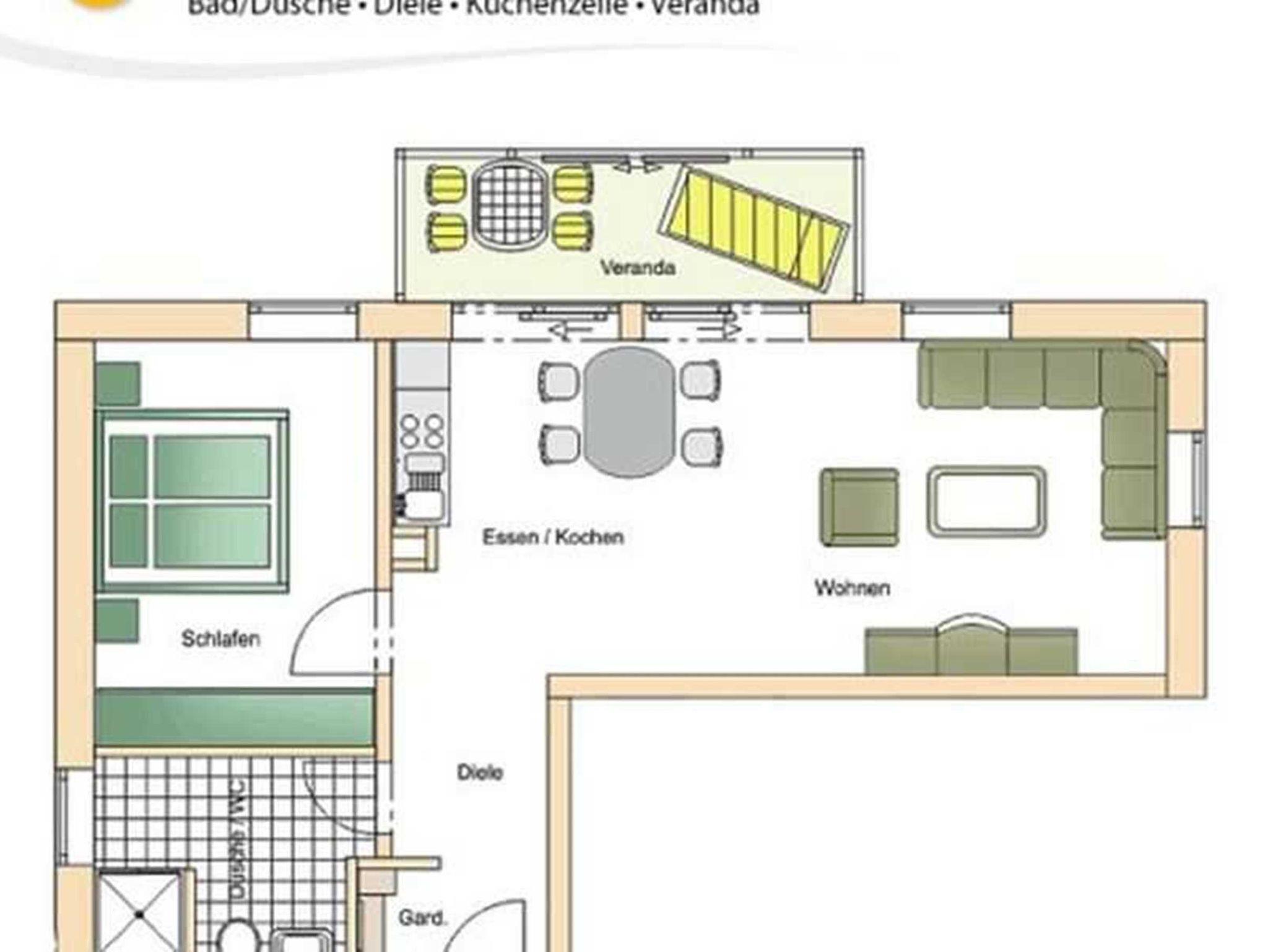 Herzlich willkommen in der komfortablen 2-Raum-Ferienwohnung im Haus Karavelle! Diese einladende Unterkunft befindet sich im 1. Obergeschoss und bietet Ihnen alles, was Sie für einen entspannten Aufenthalt benötigen. Von der Diele aus gelangen Sie in den großzügigen Wohnbereich, der mit einer modernen Küchenzeile und einem Esstisch für vier Personen ausgestattet ist. Hier finden Sie einen 2-Platten-Herd, einen Kühlschrank, eine Mikrowelle, eine Spüle und Geschirr - ideal für Ihre kulinarischen Kreationen. Das hell möblierte Wohnzimmer lädt mit einer gemütlichen Eckcouch, die Platz für zwei weitere Personen bietet, sowie einem Flachbild-TV und CD-Player zum Verweilen ein. Genießen Sie Ihr Frühstück im angrenzenden Wintergarten oder lassen Sie den Abend bei einem Glas Wein in entspannter Atmosphäre ausklingen. Im Schlafzimmer erwartet Sie ein bequemes Doppelbett und auf Anfrage wird gerne ein Kinderbett und ein Hochstuhl für die kleinen Gäste bereitgestellt. Das Tageslicht-Bad ist mit einer Dusche und WC ausgestattet und sorgt für zusätzlichen Komfort. Ein Pkw-Stellplatz steht Ihnen auf dem umzäunten Grundstück zur Verfügung. Für Ihre Wäsche können Sie gegen Entgelt eine Waschmaschine sowie einen Wäschetrockner im Objekt nutzen. Die Erstausstattung Bettwäsche und Handtücher kann für nur 17,50 € pro Person bei der Buchung hinzugebucht werden. WLAN Zugang ist für ein Gerät kostenfrei, für jedes weitere Gerät werden 10 € pro Woche berechnet.