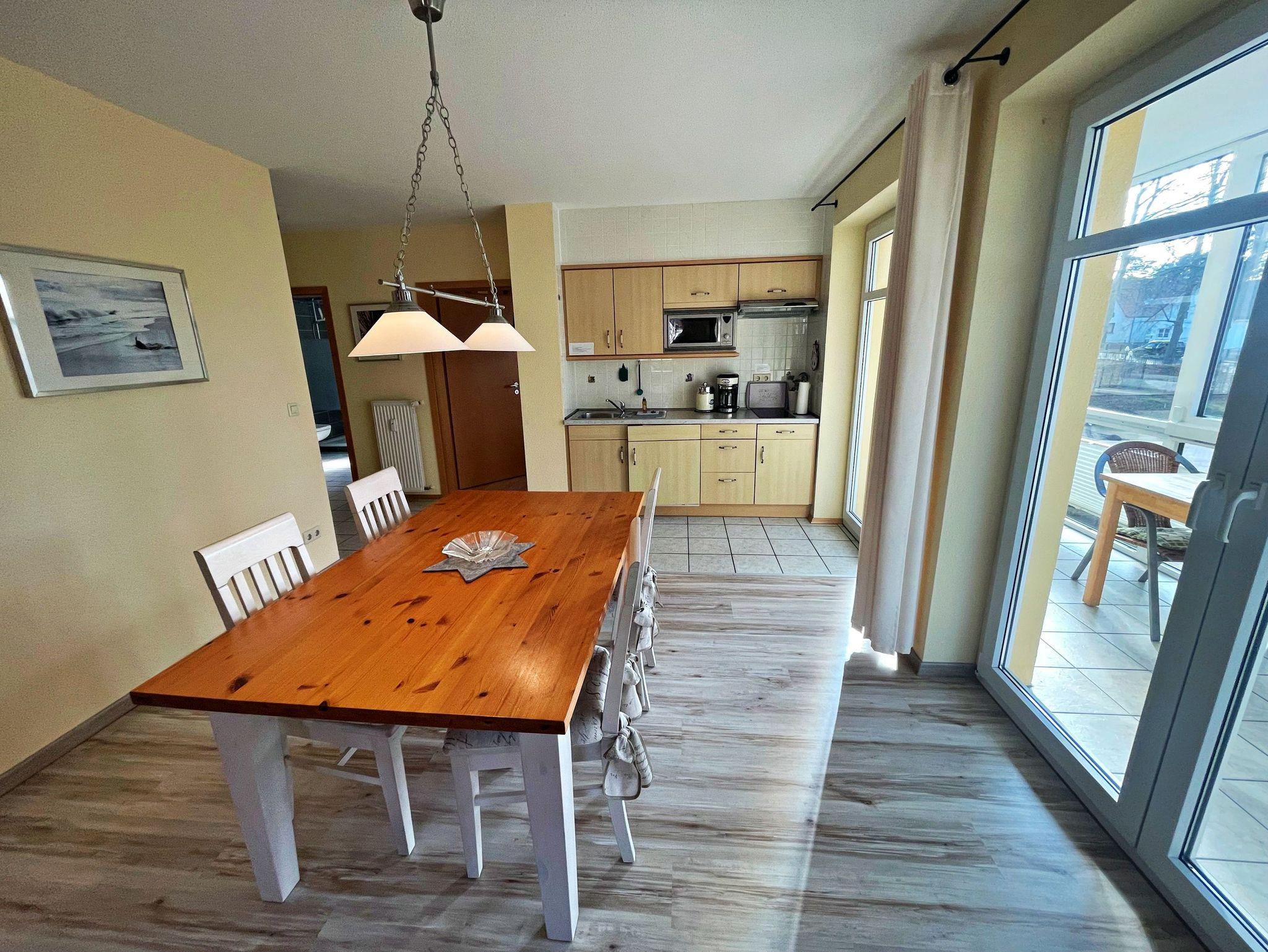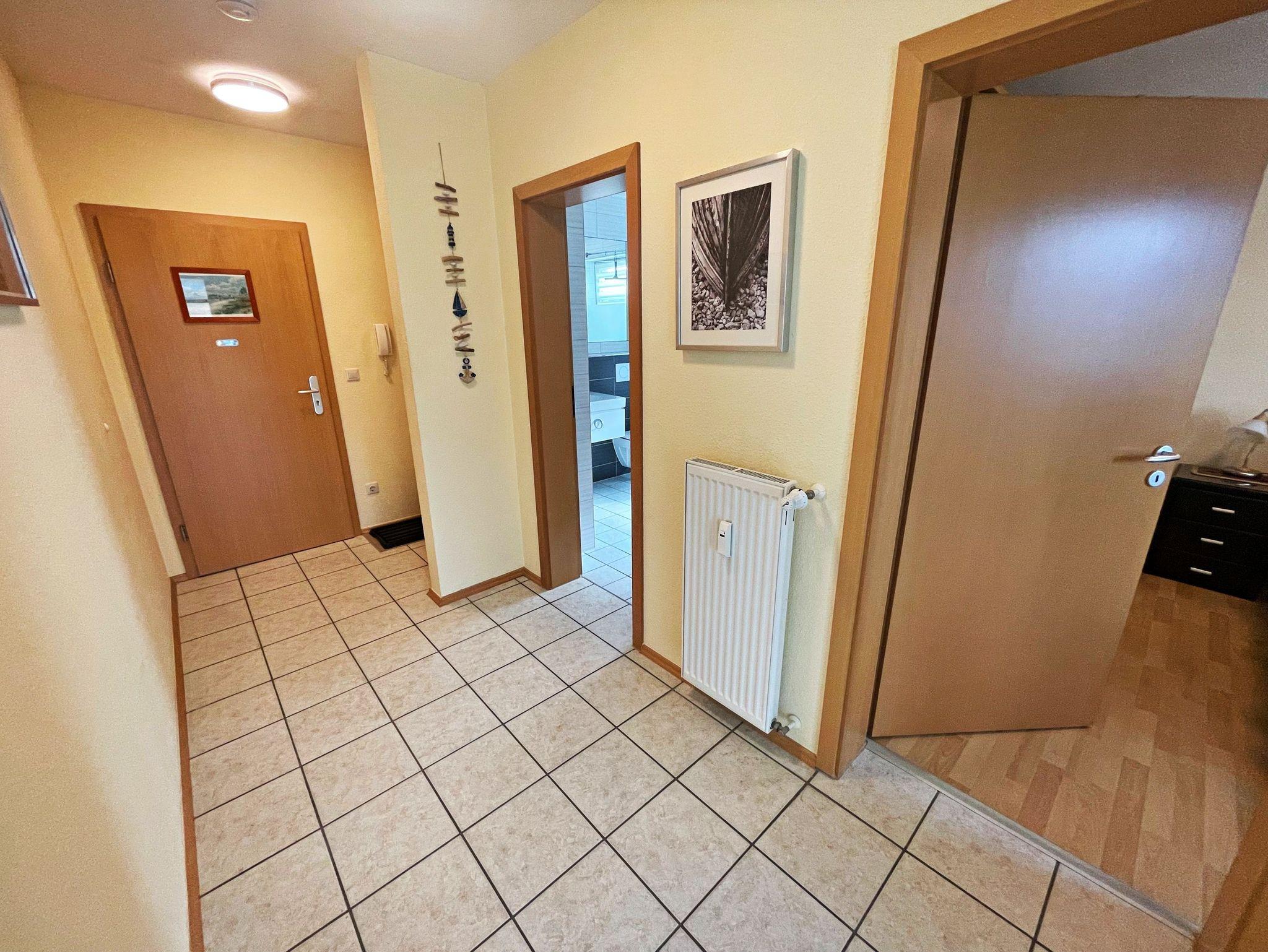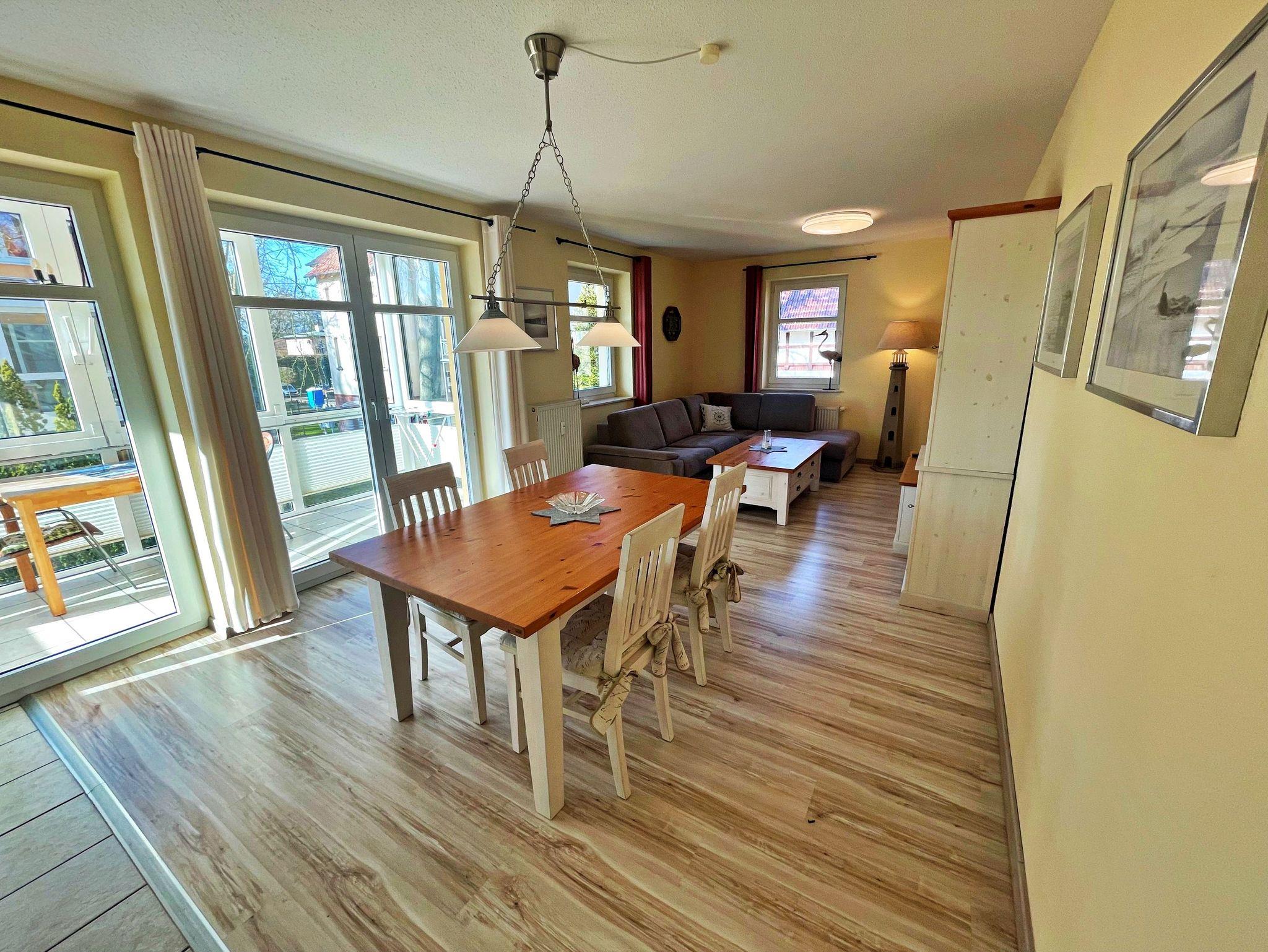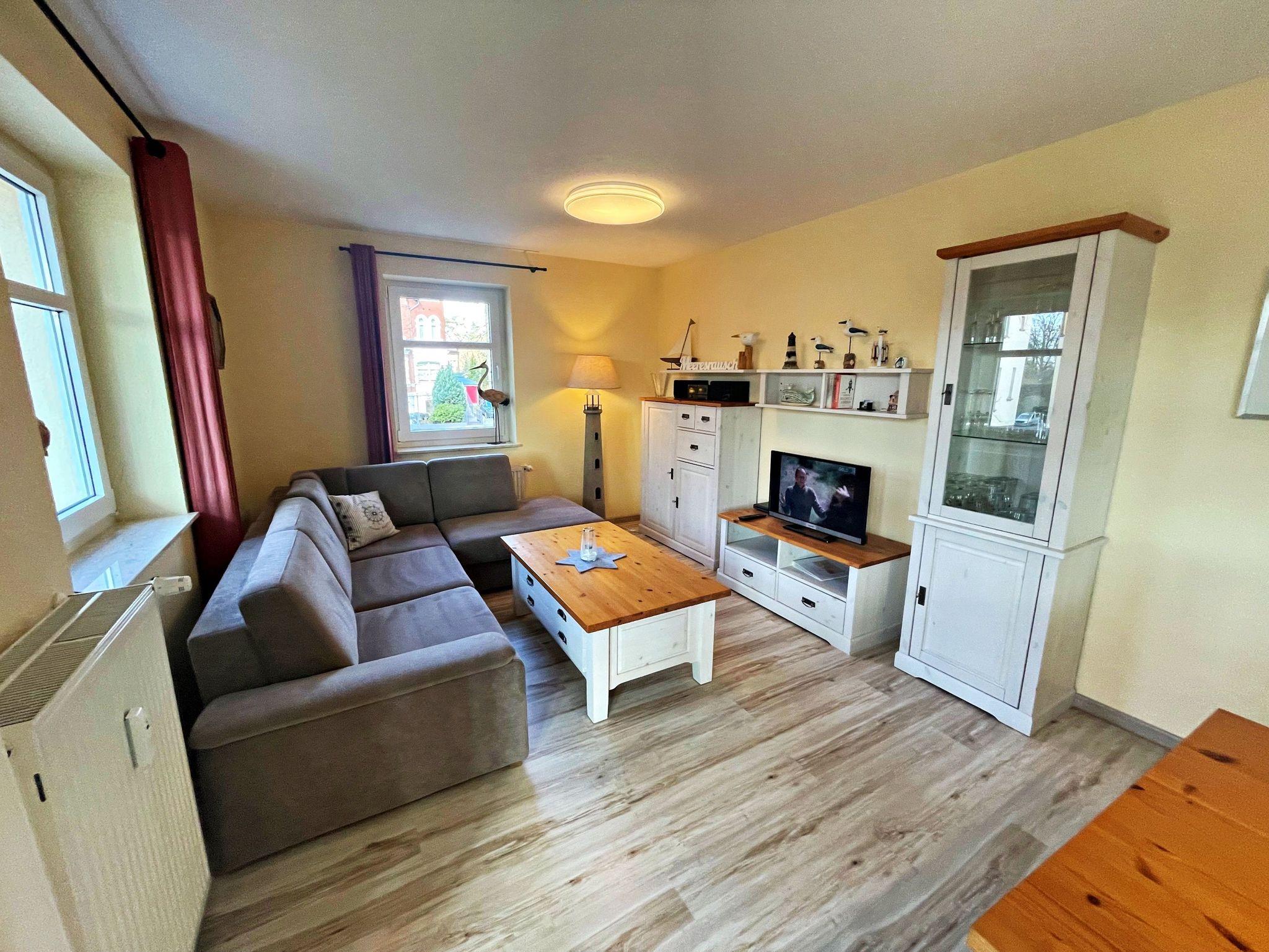 Herzlich willkommen in der komfortablen 2-Raum-Ferienwohnung im Haus Karavelle! Diese einladende Unterkunft befindet sich im 1. Obergeschoss und bietet Ihnen alles, was Sie für einen entspannten Aufenthalt benötigen. Von der Diele aus gelangen Sie in den großzügigen Wohnbereich, der mit einer modernen Küchenzeile und einem Esstisch für vier Personen ausgestattet ist. Hier finden Sie einen 2-Platten-Herd, einen Kühlschrank, eine Mikrowelle, eine Spüle und Geschirr - ideal für Ihre kulinarischen Kreationen. Das hell möblierte Wohnzimmer lädt mit einer gemütlichen Eckcouch, die Platz für zwei weitere Personen bietet, sowie einem Flachbild-TV und CD-Player zum Verweilen ein. Genießen Sie Ihr Frühstück im angrenzenden Wintergarten oder lassen Sie den Abend bei einem Glas Wein in entspannter Atmosphäre ausklingen. Im Schlafzimmer erwartet Sie ein bequemes Doppelbett und auf Anfrage wird gerne ein Kinderbett und ein Hochstuhl für die kleinen Gäste bereitgestellt. Das Tageslicht-Bad ist mit einer Dusche und WC ausgestattet und sorgt für zusätzlichen Komfort. Ein Pkw-Stellplatz steht Ihnen auf dem umzäunten Grundstück zur Verfügung. Für Ihre Wäsche können Sie gegen Entgelt eine Waschmaschine sowie einen Wäschetrockner im Objekt nutzen. Die Erstausstattung Bettwäsche und Handtücher kann für nur 17,50 € pro Person bei der Buchung hinzugebucht werden. WLAN Zugang ist für ein Gerät kostenfrei, für jedes weitere Gerät werden 10 € pro Woche berechnet.