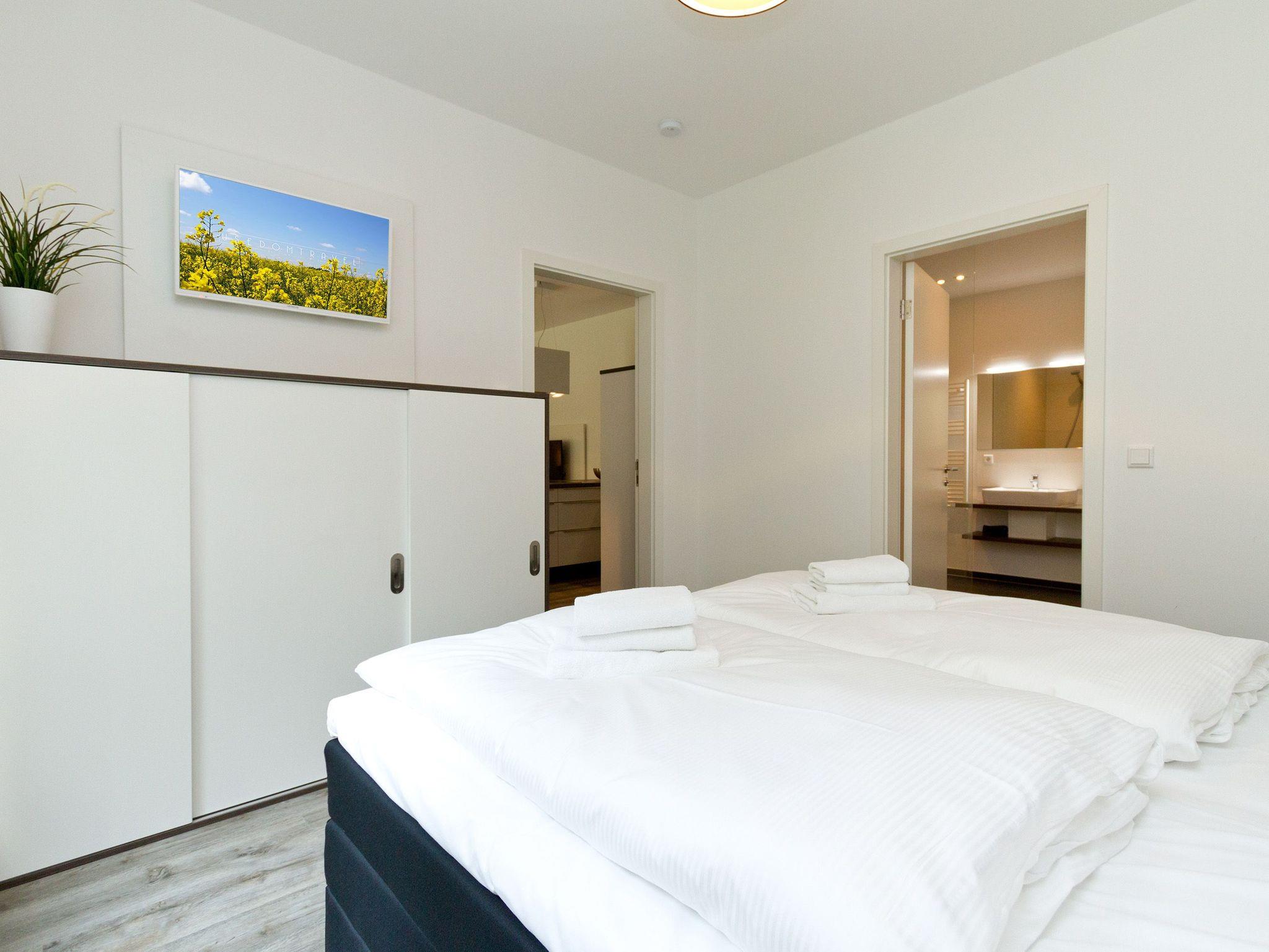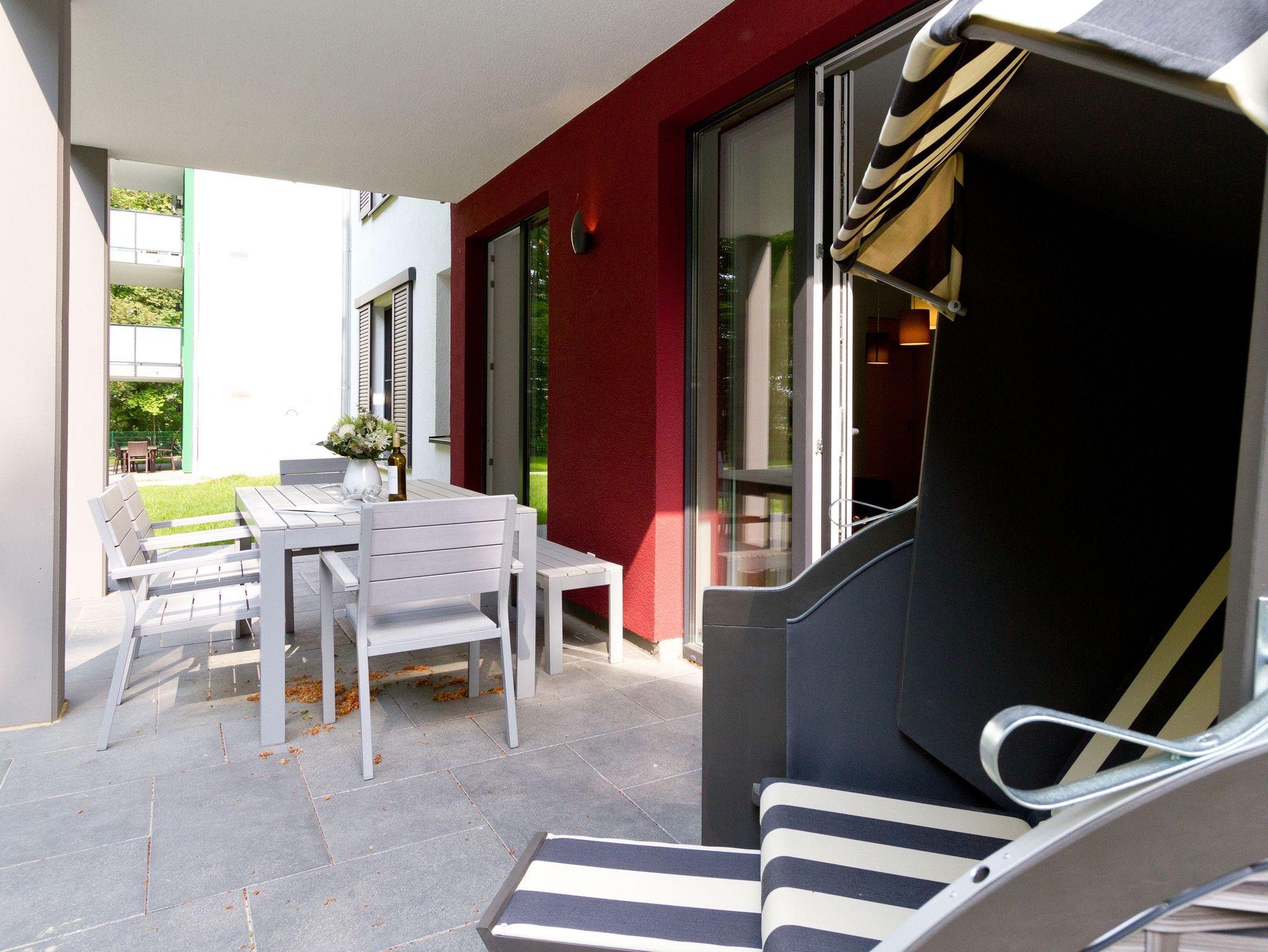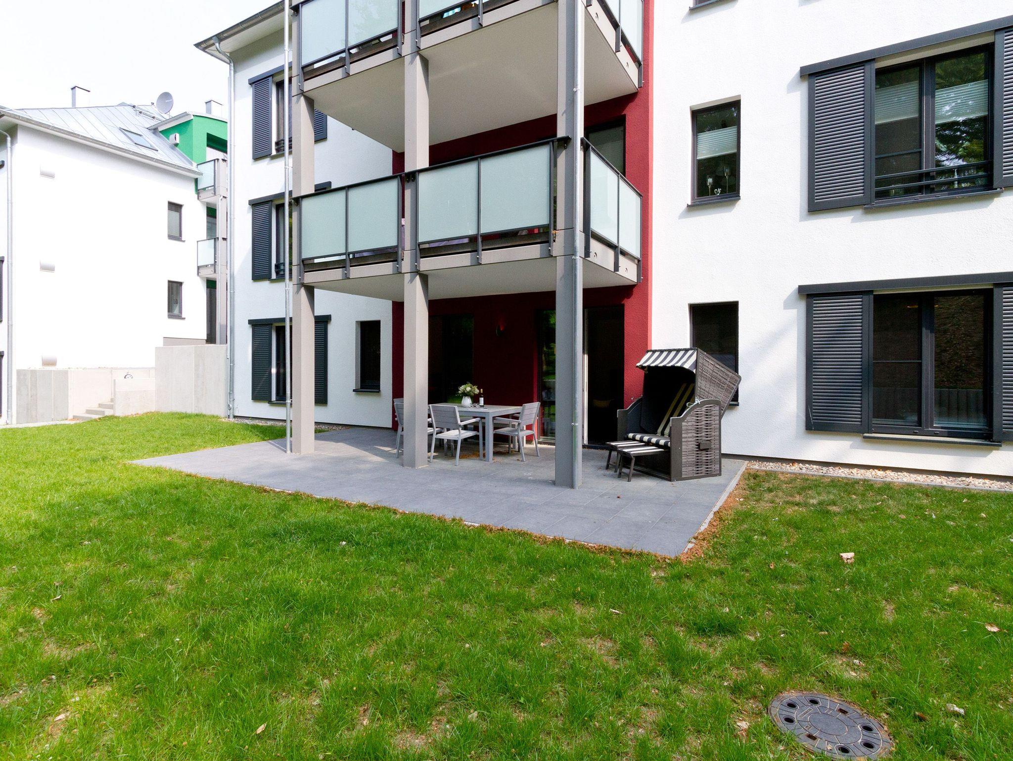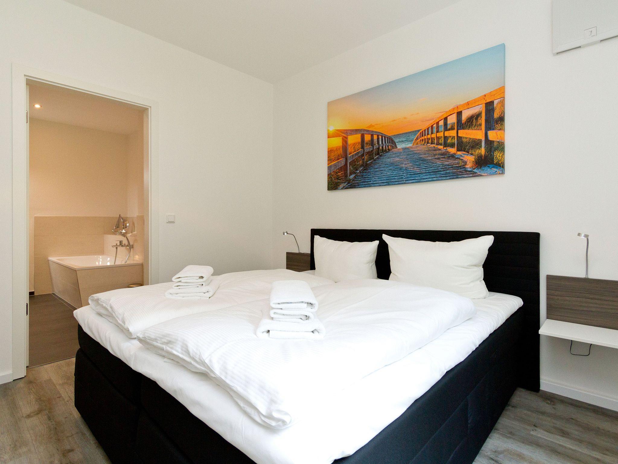Ausreichend Platz für 4 Erwachsene und 2 Kleinkinder (bis 3 Jahre im Kinderreisebett) erwartet Sie im großzügigen 104 Quadratmeter großen Erd- bzw. Gartengeschoss-Appartement in der Villa Evi. Der helle Wohn-Essbereich empfängt Sie mit einer offenen Gestaltung und ist neben einer gemütlichen Sitzgruppe mit Flat-TV und Kamin ausgestattet. Eine voll ausgestattete Küche samt Essplatz lädt zum gemeinsamen Kochen und Verweilen ein. Eine separate Leseecke lädt zudem zum Lesen ein. Vom Wohnbereich haben Sie außerdem Zugang zur etwa 20 Quadratmeter großen Süd-Terrasse mit Gartenmöbeln und Strandkorb, von dem aus Sie den Blick in den Park genießen können. Das Appartement verfügt außerdem über zwei Schlafzimmer, die beide mit komfortablen Boxspringbetten ausgestattet sind. Das erste Schlafzimmer bietet zudem Zugang zum Masterbad, das mit einer Infrarotsaune (kostenfrei), einer Dusche, einer Badewanne und einem WC ausgestattet ist. Das zweite Schlafzimmer verfügt ebenfalls über ein eigenes Badezimmer mit WC, Dusche und Waschtisch. Ein PKW-Stellplatz direkt am Haus steht Ihnen ebenso kostenfrei zur Verfügung wie das hauseigene W-Lan. Für Ihren Komfort sind die Betten bei Ihrer Ankunft bereits bezogen und Handtücher liegen als Erstausstattung bereit.