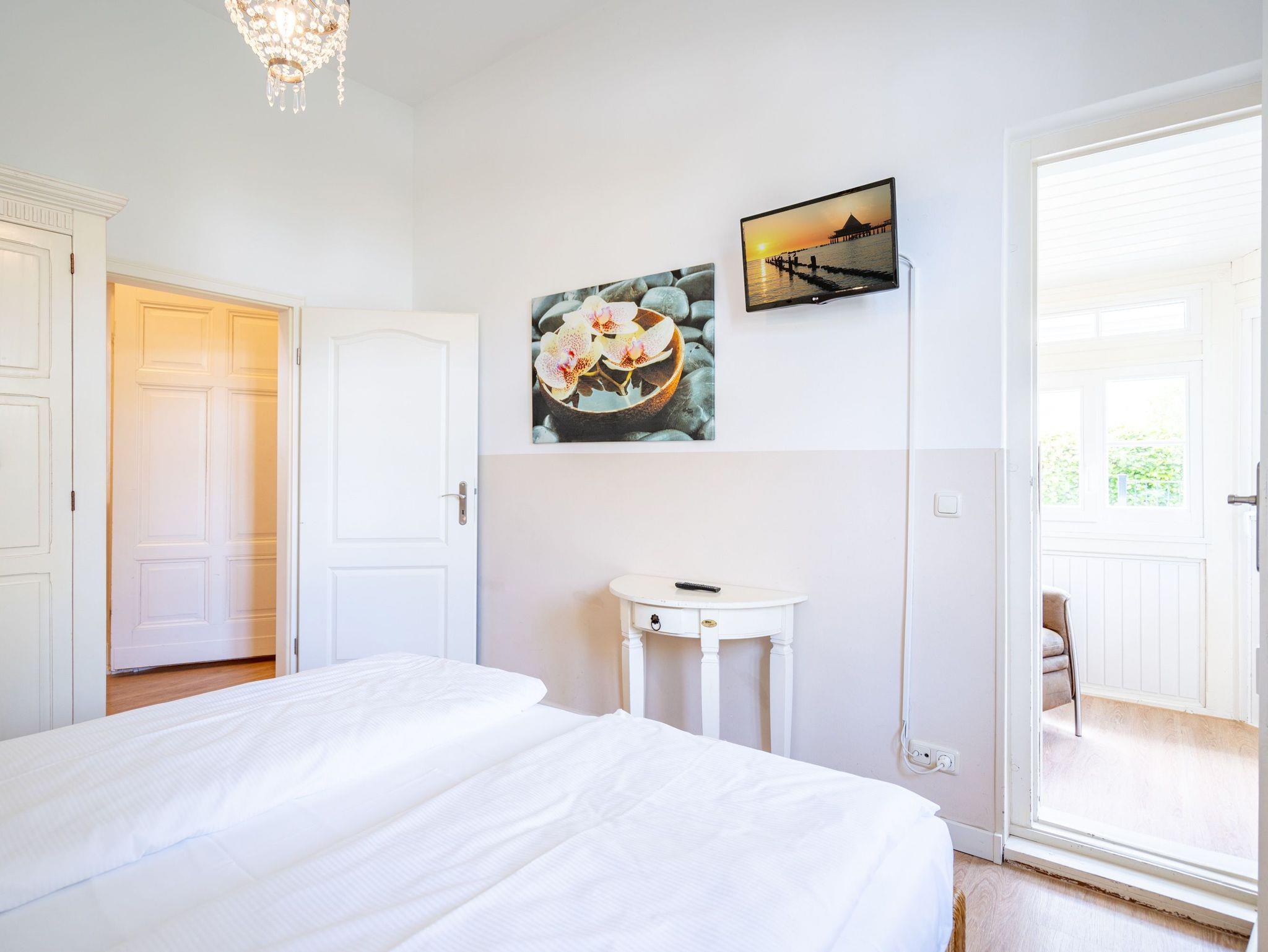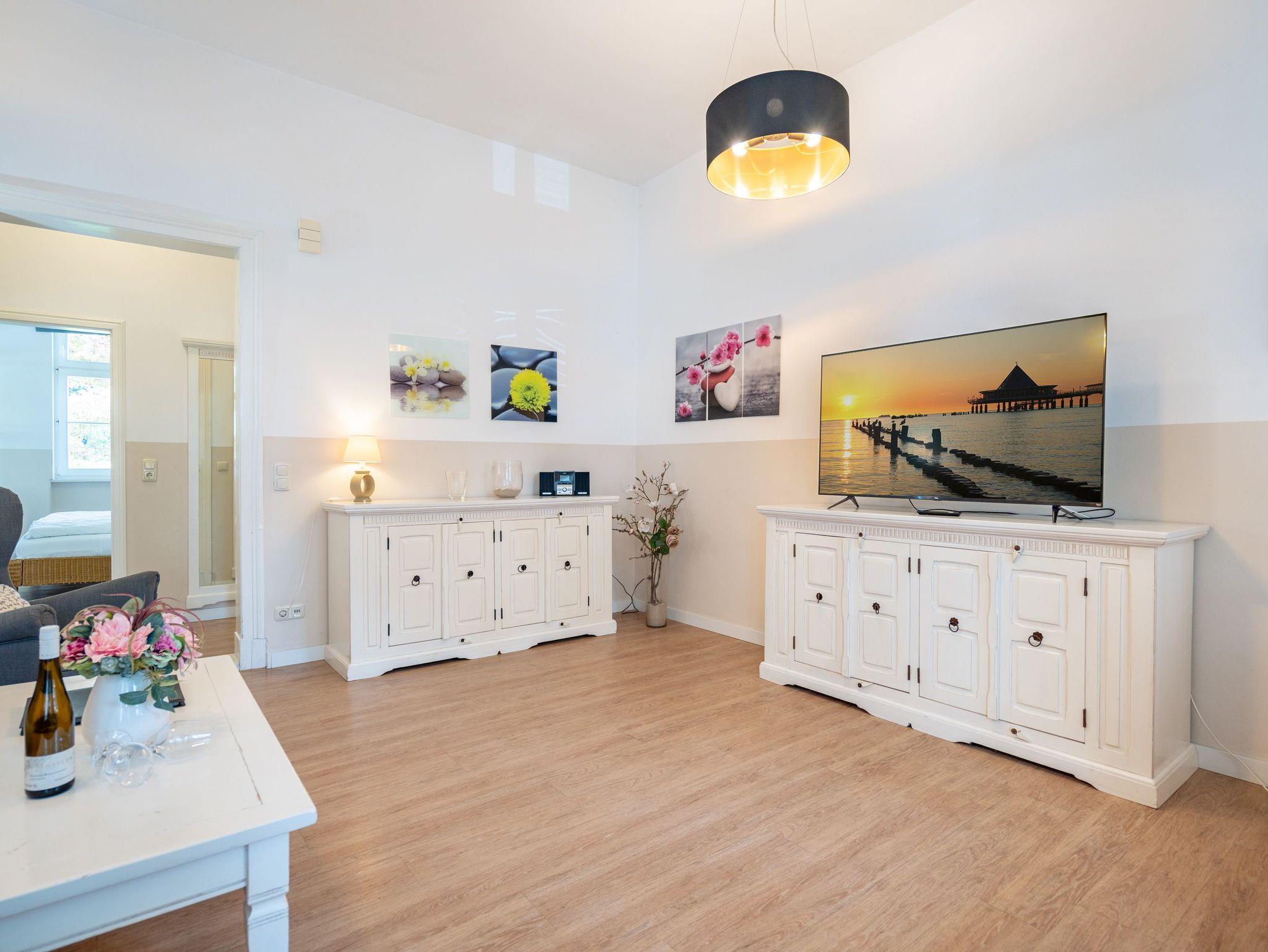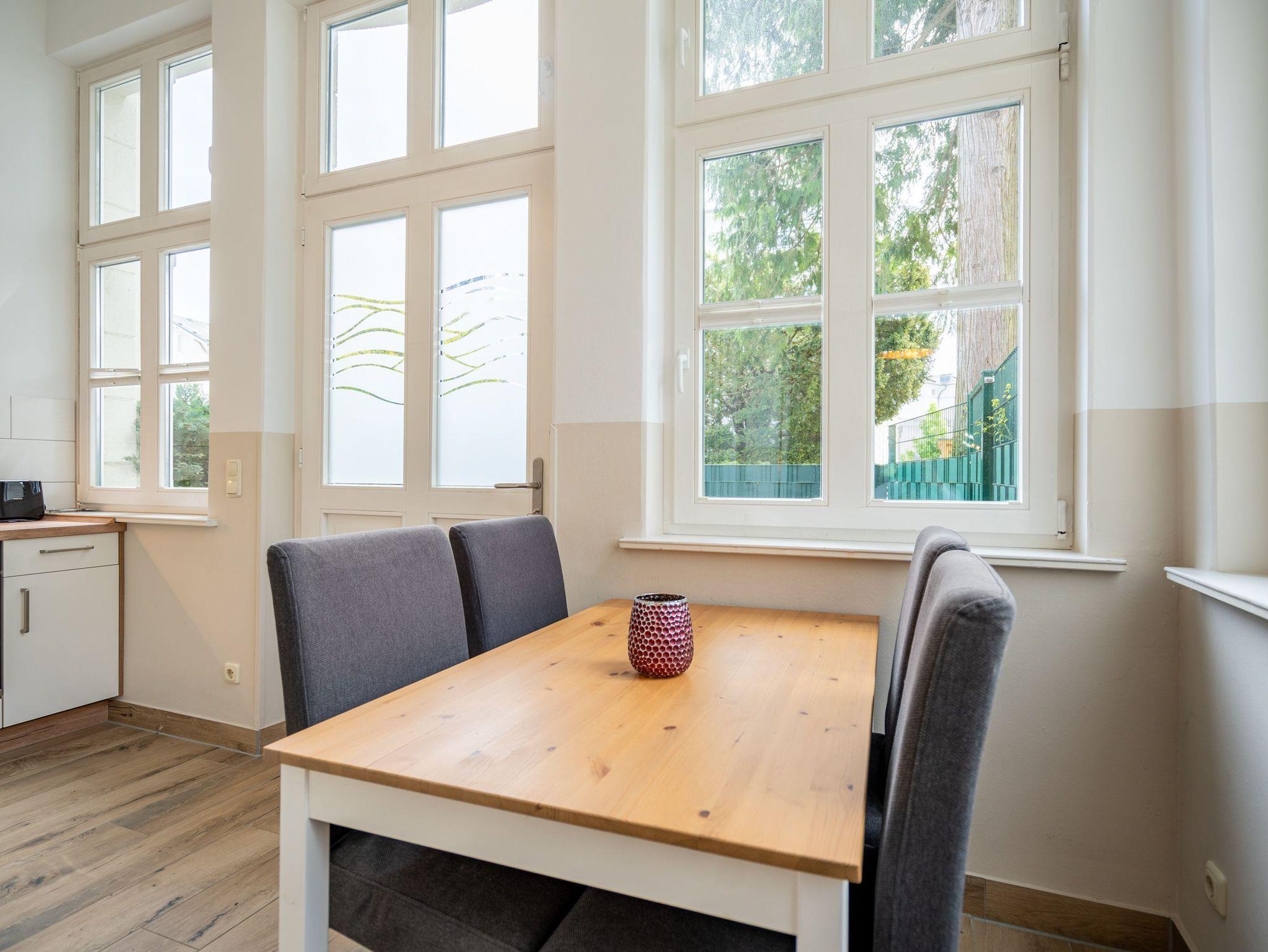 Willkommen in Ihrer 63 m² großen Ferienwohnung im Erdgeschoss der Villa Hartmann-Drewitz. Hier finden bis zu 4 Personen ein charmantes Zuhause auf Zeit. Das große Schlafzimmer mit Doppelbett und TV sowie ein zweites Schlafzimmer mit zwei Einzelbetten bieten komfortable Schlafmöglichkeiten. Im einladenden Wohnbereich können Sie entspannen, während die verglaste Veranda mit Küchenzeile und Essplatz viel Licht hereinlässt. Von hier aus treten Sie direkt auf die Terrasse, die gleichzeitig als Wohnungseingang dient. Das Bad mit Dusche und WC rundet den Komfort ab. Ein Pkw-Stellplatz steht Ihnen direkt am Haus zur Verfügung.